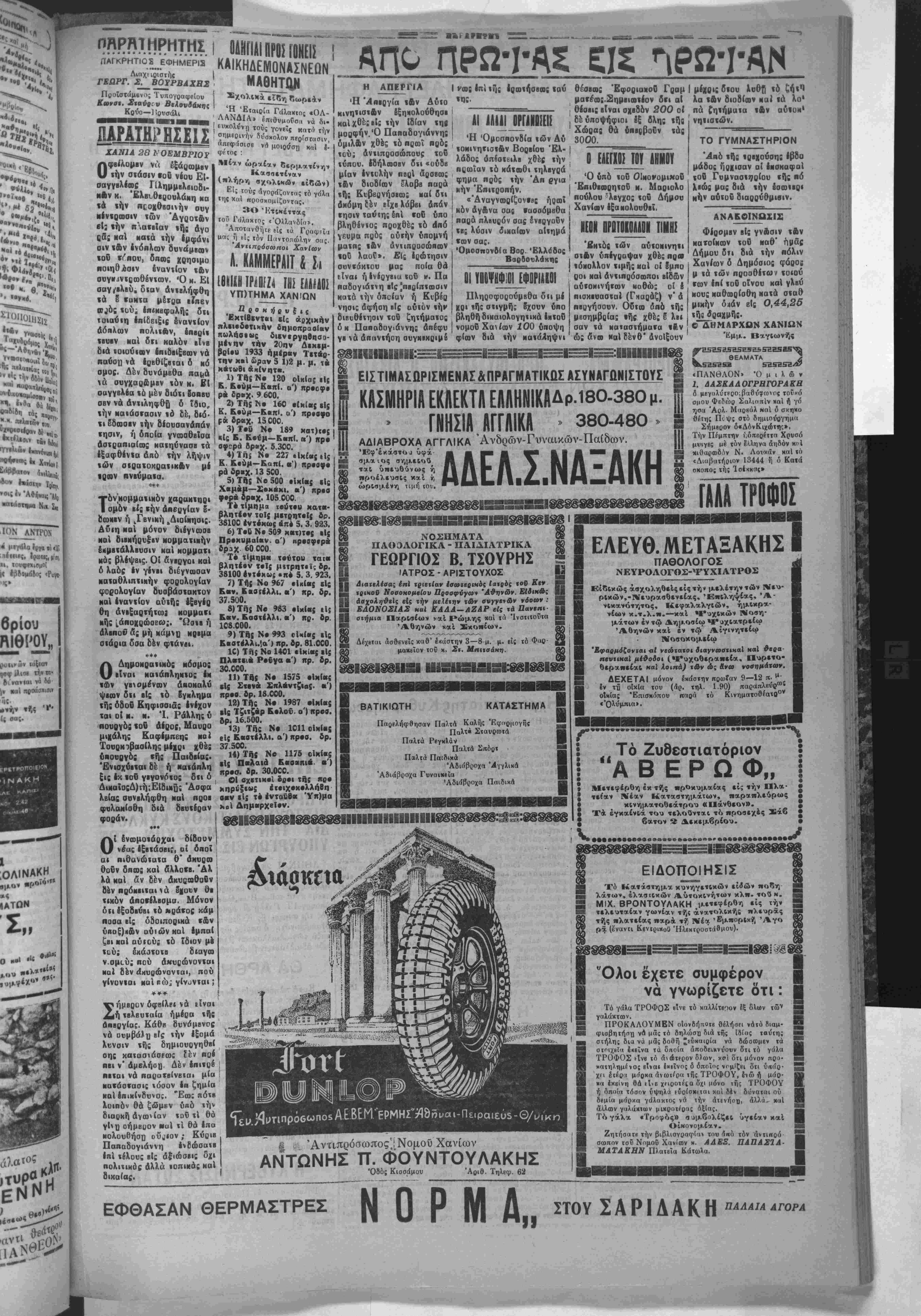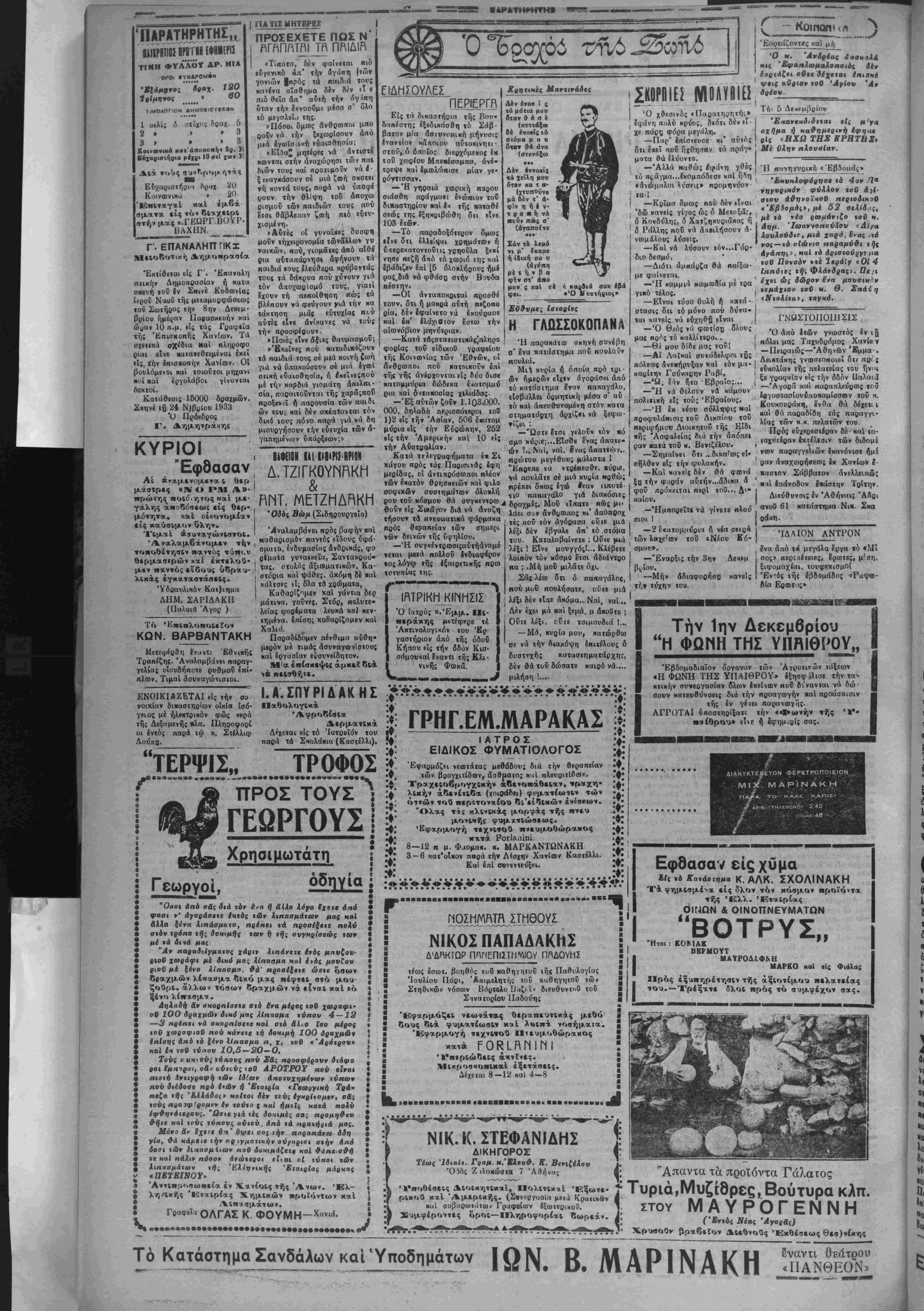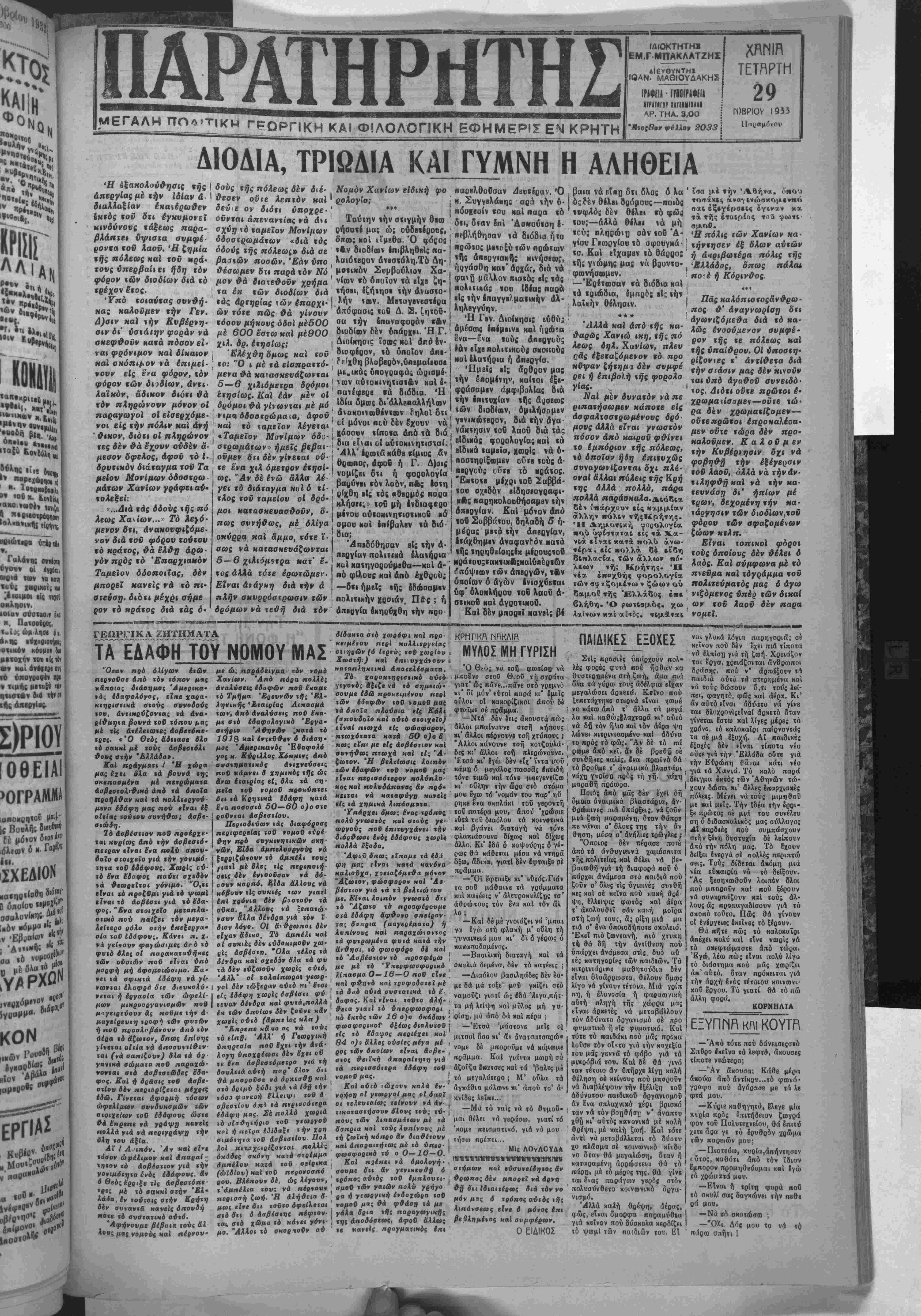 ς βοβλί). 8'ι0<7 ίέ μό»ον διαν'* ,όλ,ω» δ ». ϊΦ ΪΧΕΑΙΟΝ ΡπΊΉΖ ΓΡΟΡΠΚΗ ΚΑΙ ΦΙΛΟΛΟΠΚΗ ΕΦΗΜΕΡΙΣ ΕΜ ΚΡΗΤΗ ΙΔΙΟΚΤΗΤΗΙ ΕΜ.ΓΜΠΑΚΛΑΤΖΗΣ ΑΐΕΥΘΥΝΤΗΙ ΙΟΑΝ. ΜΑΘΙΟΥΔΑΚΗΣ (γ.ΦιΊΙ · ί,ΙΟίΡΐΙίΙΙ ΗΜΤΙΓίϊ ΗΠΙΜΙ1Α1Ι ΑΡ. ΤΗΛ. 3,00 'Κιοςβοτ ψύΐίοψ 2033 ΧΗΜΙΒ ΤΕΤλΡΤΗ 29 Μ)ΒΡΙθν 1935 Ποραμόνου ΔΙΟΔΙΑ, ΤΡΙΩΔΙΑ ΚΑΙ ΓΥΜΝΗ Η ΑΛΗΘΕΙΑ Ή εξακολουθήση «ής | άπεργΐαςμέ την Ιδίαν ά- Ι διαλλαξίαν Ικαέρω$εν ίκτός τοΰ ότι έγχνμονεϊ πινδύνους τάξεως παρα· βλάπτει ΰψιοχα αυμφέ- ροντα τοϋ λαοΰ. Ή ζημία κης πόλεως καί τοΰ κρά· τσνς ύπερβαίι εί ηδη τόν φόρον χών διοδίων διά τό τρέχον §τος. "Υπό τοιαύτας συνθή¬ κας καλούμεν «ην Γεν. Δ)σιν χαΐ «ην Κυβέρνη¬ σιν δι ύσιάίην φοράν νά ακεφϋονν κανά πόσον εϊ· »αι φρόνιμον καϊ δίκαιον καΐ σχόπιμον νά έπιμεί · νούν είς έ'ια φόρον, χον φόρον των διοδίων, άννι· λαϊκόν, άδικον διότι ι?ά τόν πληρώνουν μόνον οί ηαραγωγοΐ οί εισ ερχόμε¬ νοι είς την πόλιν χα άνή 'θικον, διότι οί πληρώνον τες δέν θά εχουν ουδέν ά¬ μεσον δφελος, άφοΰ «ό ί- όρυπκόν διά τα γμα τοΰ Τα μεΐου Μονίμων όδοατρω- μάχων Χανίων γράφει αύ· «σλεξεί: «..._ιά «άς δδού( τής πό λεως Χανίων...» Τό λεγό¬ μενον δτι, άναχονφιζόμε* νόν διά τοϋ φόρον τούτου τό κράνος, θά έλθη άρω- γόν πρός νό 'Επαρχιακόν Ταμείον όδοποιΐας, δέν μπορεϊ κανείς νά νό πι¬ στεύση, διότι μέχρι σήμε ρον νό κράνος διά τάς ο· δούς »ης πόλεως δέν δ.έ- θεσεν ού'ίε λεπτόν καϊ' δεύε όν διότι ύποχρε- ' οϋνται άπενανιίας νά άί σχύη ι ο χαμειον ΜονΙμων όδοστρωμάχων «διά ιβς όδούς κης πόλεως» διά σε βααχών ηυσ&ν. Εάν υπο , θέσωμεν ότι παρά «όν Νό ( μόν θά ίιαιεθούν χρήμα ' τα εκ «ών διοδίων διά «άς άρχηρίας ών έπαρχι· { ών «ότε πώς θά γίνουν χόοου μήηους δδο μέδΟΟ μέ 600 έστω καϊ μέθΟΟ χιλ. δρ. έχηαίως; | Ελέχθη όμως καϊ «ου «ο: "Ο ι μέ «ά εϊσπραϊτό- , μενά θά κα;ασκενάξων«αι 5—6 χιλιόμετρα δρόμοι; ετησίως. ΚαΙ εάν μέν οί δρόμοι θά γί,ωνται μέ μό : νιμα όδοοτρώμαχα, άφοΰ , καΐ «ό ταμείον λέγεΐαι, «Ταμείον ΜανΙμων όδα-; σ»ρω/ιάτων > ημείς βεβαι· >
