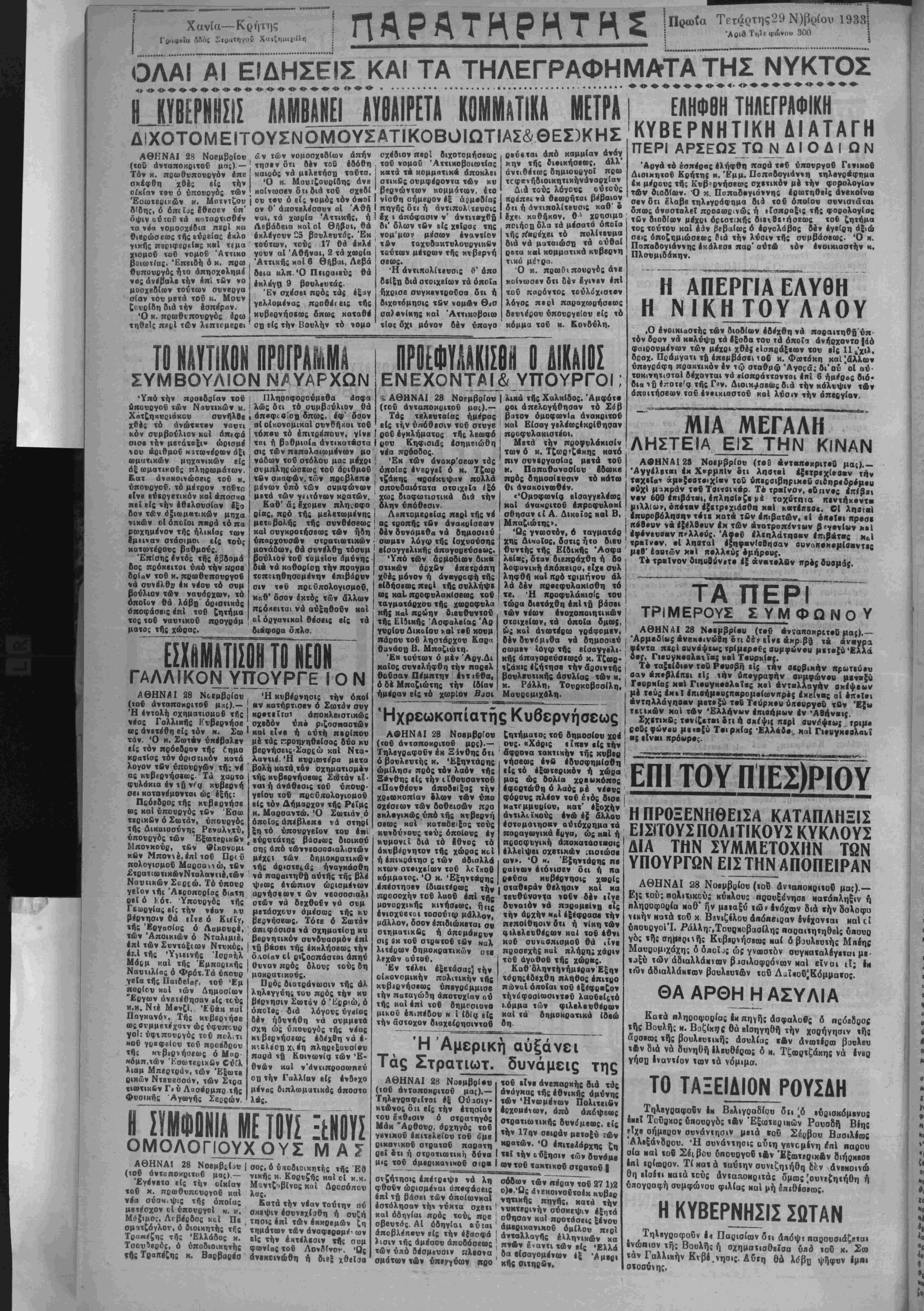 νίκην Μοτά <οΟ κ Βϋνιζέλου αηόηβιραν δνίχονιαι «αί εί ΰπουογοΓΙ. ΡάλληΓ,Τουρχοβΐϊσίλης παραιτηιηθβΐς ΰηουρ γός «ής σημβροϊ,ς Κυββονήσβαος Μαί δ βαυλβυνής Μπέης Μαυρομιχάχη; δ ΟΛο^ς ώς γνοαστόν συγΝαΐαλέγετσι μβ· «αζύ «ών άοιαλλάκϊοον βασιλοφρόνοον καΐ είναι ιΐ; Ιν ιων αδιαλλακναν βουλευι&ν «οθ Λαϊ«οΟ||Κόμμα*σς. ΘΑ ΑΡΘΐΗΗ ΑΣΥΛΙΑ Κατά ηληοοφορίας έκ πηγή; ασφαλο0ς δ πςόβδοοί Βουλής μ. Βοζίκης θά εΐσηγηθτ) την χορήγησιν «ής εα)ς τής βουλευιική1; άσυλίιΐς «Αν ανωιΐρσ) βαυλβυ »*ν διά νά δυνηθή έλβυθέρως δ μ. Τζωρτζάχης νά ίνβρ γήσα Ιναντίον των «ά νόμιμα. ΤΟ ΤΑΞΕΙΔΙΟΝ ΡΟΥΣΔΗ Τηλέγραφον1 ν ·κ Ββλιγραδίου διι [δ ιύοισκόμενοβ Τοϋρχος ΰπουργός «Αν ΈξαΐϊΒοικών Ρουσδή Βέης «Ιχε σήμερον συνάντησιν μβιά *οδ Σέοβου Βιισιλίως Άλιξάνδρου. Ή συνάννησις αυΐη γβνεμίνΐ) επί παρου σία καί «οθ Σέιβθυ βπουογοθ «Αν 'ΕζωτΐοικΑν 8ιήρκβσβ ΙπΙ ΐρίωρον. Τί παν ά ταύΐην συνιζηιήθη δέν ανβΝθΐνώ θη βΐσίιι Μαιά «ούς ιΧνϊαποκριτάς δμως [ουνΐζηΐήθη ή ύπογρααή συμφώνου φιλίας καί ή έθί Η ΚΥΒΕΡΝΗΣΙΣ ΣΩΤΑΝ Τηλβγραφοθν εί Παρισίων διι αηόψΐ παοουσιάζκΐαι ■νώπισν «ής Βουλής ή σχημαΐισθβίσα υπό »οΟ κ. Σω «άν Γαλλικήν Κνβί.νησίς, Αΰίη θά λύβτ] ψήψυν Ιμπι σΐοούνης.
