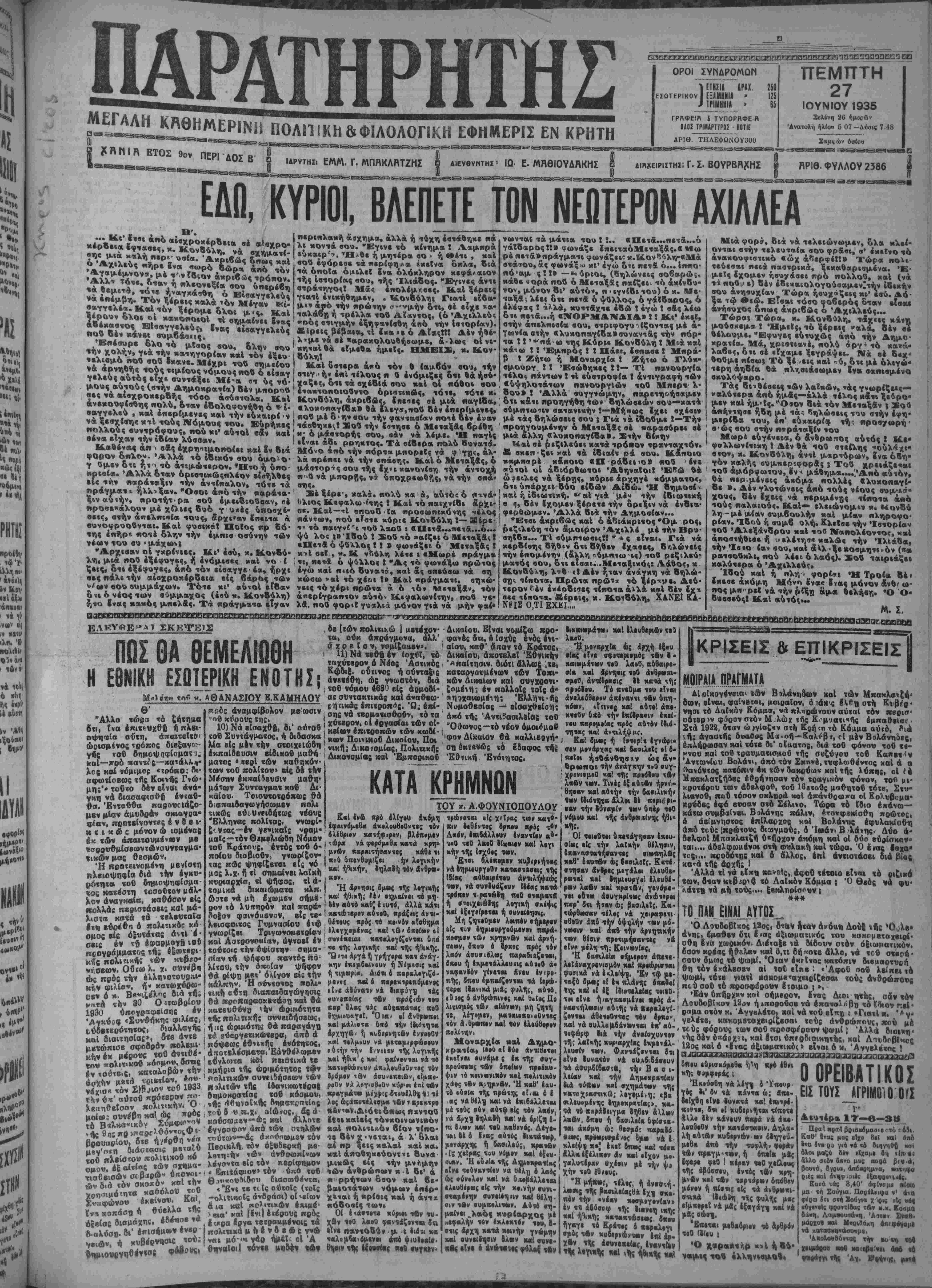 ' Γ< ΜπηΚΛητ*ΗΣ β διευθυγιτηι · ΙΩ. Ε. ΜΗΘΙΟΥΔηΚΗΣ ΟΡΟΙ ΣΥίΙΔΡΟΜΟΐΊ 1 ΠΗ» ■■·.. εσοτερικου ΙΕΞΑΜΗΝΙΛ » ^ΜΡΙΜΙΠΙΙΑ » ΓΡΛΦΕΙΛ ■ ΤΥΠΟΡΗΦΕ Β ΟΛΟΣ ΤΡΙΗΑΡΤΪΡΟΣ · ΠΟΤΙΕ 250 125 65 ΑΡΙΘ. ΤΙΙΛΕΦΩΝΟΥ300 ΠΕΜΓΓΤΗ 27 ΙΟΥΝΙΟΥ 1935 Σβλίνη 26 Λμβςώ» Ανατολή ήλίοο 5 07 ~Δ«ο.ς 7.48 ΑΐηχΕΐΡΐΣΤΗΐ; Γ. Σ. ΒΟΥΡΒΑ£ΗΣ όσιον ΑΡΙΘ. ΦΥΛΛΟΥ 2386 ΕΜ. ΚΥΡΙΟΙ, ΒΛΕΠΕΤΕ ΤΟΝ ΝΕΩΤΕΡΟΝ ΑΧΙΛΛΕΑ Η μ./ς. δλο «ού σοΰ ηεριηλαχή άσχημ,α, άλλα ή τύχη έατάθηχε ηά λι χοντά βου. «Έγινε τό χίνημα ! Λαμπρά εύκαιρ'-.. Ήλθε ήμητέρα σο · ή Θετι , χβΐ σούεφόρεαε τά«ερίφη>α έχεΕνα δπλα, δια