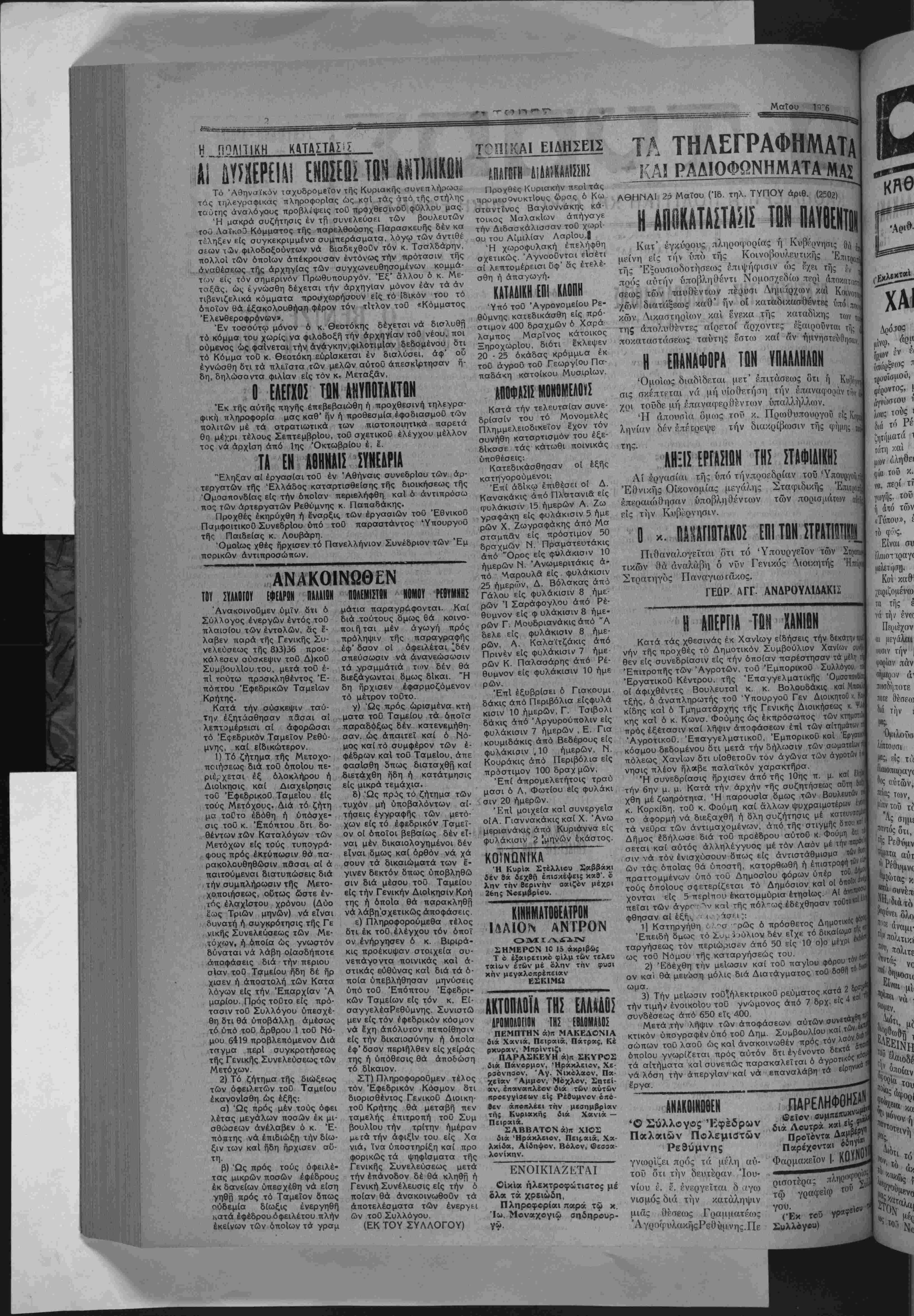 ΑΘΗΝΑΙ 25 Μαΐου (Ίδ. τηλ. ΤΥΠΟΥ αριθ. (2502)