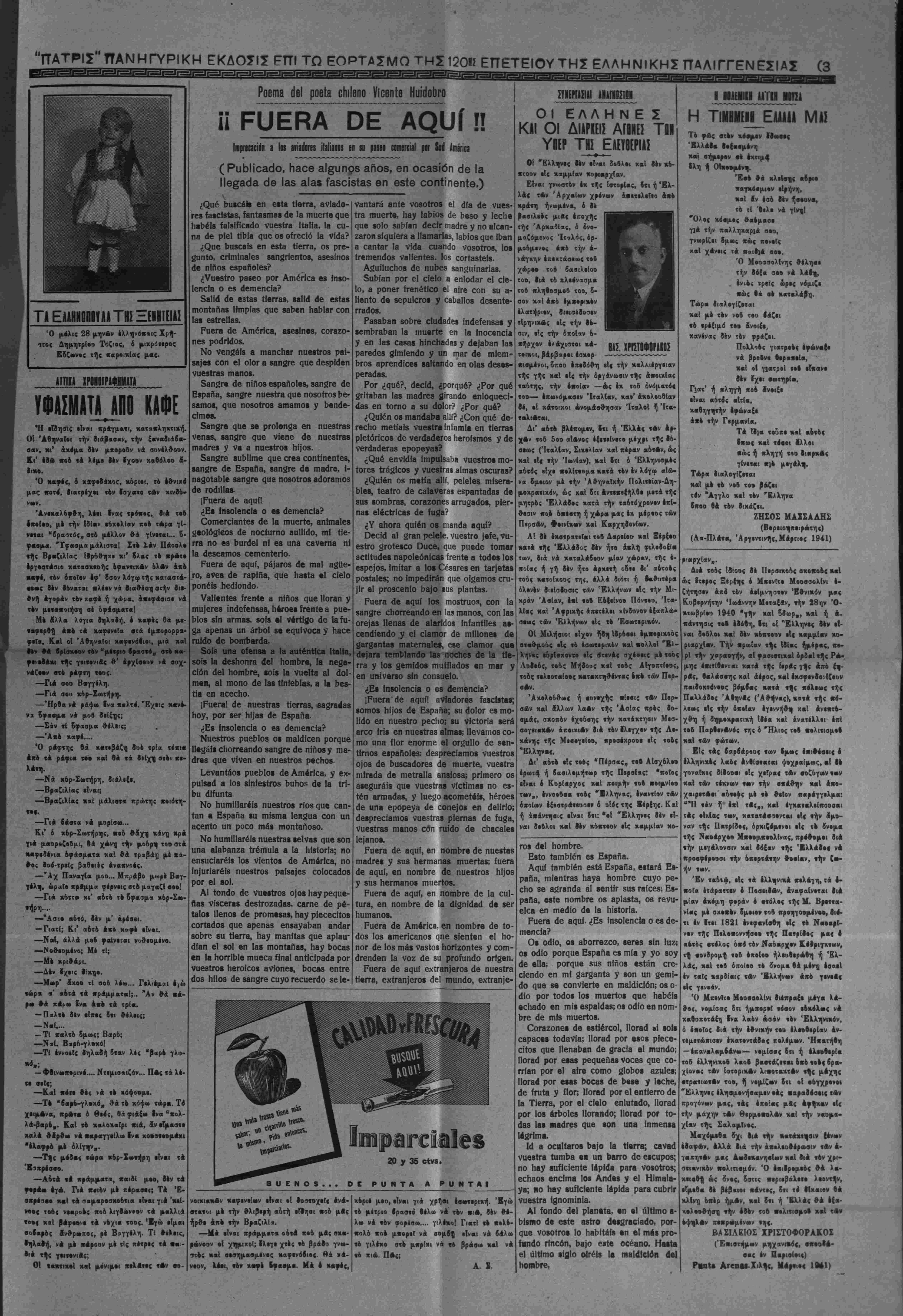 προηγουμένης μ«ς έχ|<σε«ς).— Τοπιχαί Α- «άπειραι ««ν Ίταλών είς «ο Αλβανιχίν μ*««- «ον οον.τρίδηο.ν χ«1 ,βλ,ν &,β τ#ν ^μ,τέ_ ρ·ν. Ή έχθριχή ΑεροποβορΙαΙβομβάρβ,αε την Κοπ.ρισσί,ν βποο εφόνευσαν τέσσ«Μς γο. ναΙχε< χαΐ έτραβματΙα1Η|βαν Η 1 ή Αγιοτιχήν «ερι ΪΥΝΤΟΜΑ -"- —Η ΠΑΡΟΓΣΑ πανηγοοιχή ΙχΙοσις, μ·. λονότι ΙχΚδεται με ήμεοομηνίαν 25ης Μαρ- τίοο, χοκλοφορεΓ είς «ήν π<λιν μας 16ο ημέ¬ ρας ένηρίτερον. (ΔΙν είναι πολοσέλιδοε. ή Ιχ· δοσι< αοτ/), άς αί τ·ν προηγοομένον έτ·ν. Είναι Ανάλογος τ*ν αημερινΑν σβνθηχΑν). —Ο ΕΡΑΝΟΧ 6περ τοΒ Έλ. ΈροΙρ. Σταο* ροβ μοταξο «Αν έν Β. 'Αμεριχή παροιχιΑν μ«ς ΑνήλΙεν είς 86ο έχατομμορια τετρβκοοΐετς ί- την 20ήν παρελθ^ντος Φ·Ιρ·οβρίοβ. —Η ΠΡΟΣΕΧΗ! Ι«»οσ<« τής "Πατρ(8ο<, *β είναι ή τοδ έρχομένεο Χϋββάτο», 29ης τρέχοντος. —ΜΗ ΑΗΣΜΟΝΗΤΒ το σημαιοατολιαμέν τ«ν οΙκιΛν χαί τ·ν χετ«αα«ημά««ν σας χατΑ την ημέραν <ή< έθνιχής μας εορτής. —Η ΣΓΝΕΙΕΙΑ τοδ ΑναγνΑσματός μ«ς Ζέρλοχ Χ«λμς Αναβάλλεται ΙιΑ «ήν προσέ¬ χη μ«ς Ιχδοσιν. ΚΟΙΝΩΝΙΚΗ ΖΩΗ *Ονομασπκσϊ 'ΕορταΙ Επί «ή μεγάλτο θρησχεοτιχή έορτή τβδ Εοαγγελισμοδ τής θεοτσχοο ή ΡΑΤΡΜ εοχεται είς πάντας τοος ϊγβντβς τΑ ονομ«- βτήριά τ«εν, Ιτη πβλλά χ*1 εοτβ/ή, εοημερίαν, ογείαν χαΐ πρόοδον, Καί πάντα "χαλή πατρί· «α». έρρΕφλνηβαν ΙταλιχαΙ βσμβαι. Τετάρτη, 19 Μ.ρτίοβ.— Ό Δήμος Ά»η- ναΐων άνεχήροί· Έπΐτημον Πολίτην 'ΑΟηνΛν τδν Πρόεδρον τΑν Ένε·μέν«ν ΠολιτειΑν τής 'Αμερχής χ. φραγχλΓνον Ντελάνο ΡοΙζβελτ χαί πρός τιμήν τοο, μετωνόμασε την ·αψ6- ρον Άχαδημίας εί< Αεειφόρον Ροδζβελτ. Πέμπ«η, 20 Μσρτίοο.— Νέοο< αΐχμαλώ- τοος σονέλαβον ό στρατός μας χαΐ νέα λΑ· βορα ΙχορΙεοσε. Με«α£έ* τ·ν αΐχμαλώταεν χ«- ταλέγεται χαΐ ο πρδτος έ(ά·ελφος τοδ Μουσ¬ σολίνι, σονταγματάβχης, «όν οποίον οί "Ελ· ληνες έπίστρεψαν μέβερ Γιοογχοβλαοΐας έπει- 8ή ήτο βιρέιβς τραοματισμένος. Σήμερον εί "Βλληνες έπέατρεψαν 289 αΐχμαλώτοος τρ·*- ματ(α<, «αί οί Ιταλοί επέστρεψεν ΙνΙεκβ (δι- Χβ6ς μας τραοματίας, σομφ·ν·*ς μέ «ήν επι- χρατοδβαν βιεθ-νή σομβααιν. Παρβσχεοή, 21 Μαρ«(οο.-ΚαΙ ίλλην ή"«- («ν οπέστησαν ο{ Ιταλοί έν ΆλΙανία, 8«« ι στρατόν μας Απεδεχάτισε νέας Ιχ*ρ»*β< •βνΑμεις. Ή έχθρική άερο·ορ(α Ι·ριφ· Ρ·^ βας ε!< την Πρέβεζαν χαί «{< «Ας νήσβος XI·» χαί Μοτιλήνην. 2άββα«ον, 22 Μαρ«(οβ.— Παραλλήλ-ς μ» ς «οχαρία«οβς ε18ήσει« έ£ 'Αλβσνίβ<, ■«· .ς διαρχοΐς νΙ»ης τ Αν 'Βλλήν·»», έ«ον(*#«1 *«1 πΑλιν 6χσ «ής Τοορχίαε ή Αμετάτρ·**·* «•οφασίς της, δπ«κ μή προσχολληβή ·ΐ€ «4< ιεν.μικ Τ0( "Α|ονβς. Το Ισιβν ζή*ημ« *ν Ίο·γχββλαβία χρ.τΐί έν διχασμφ «ην χ*·· IV.