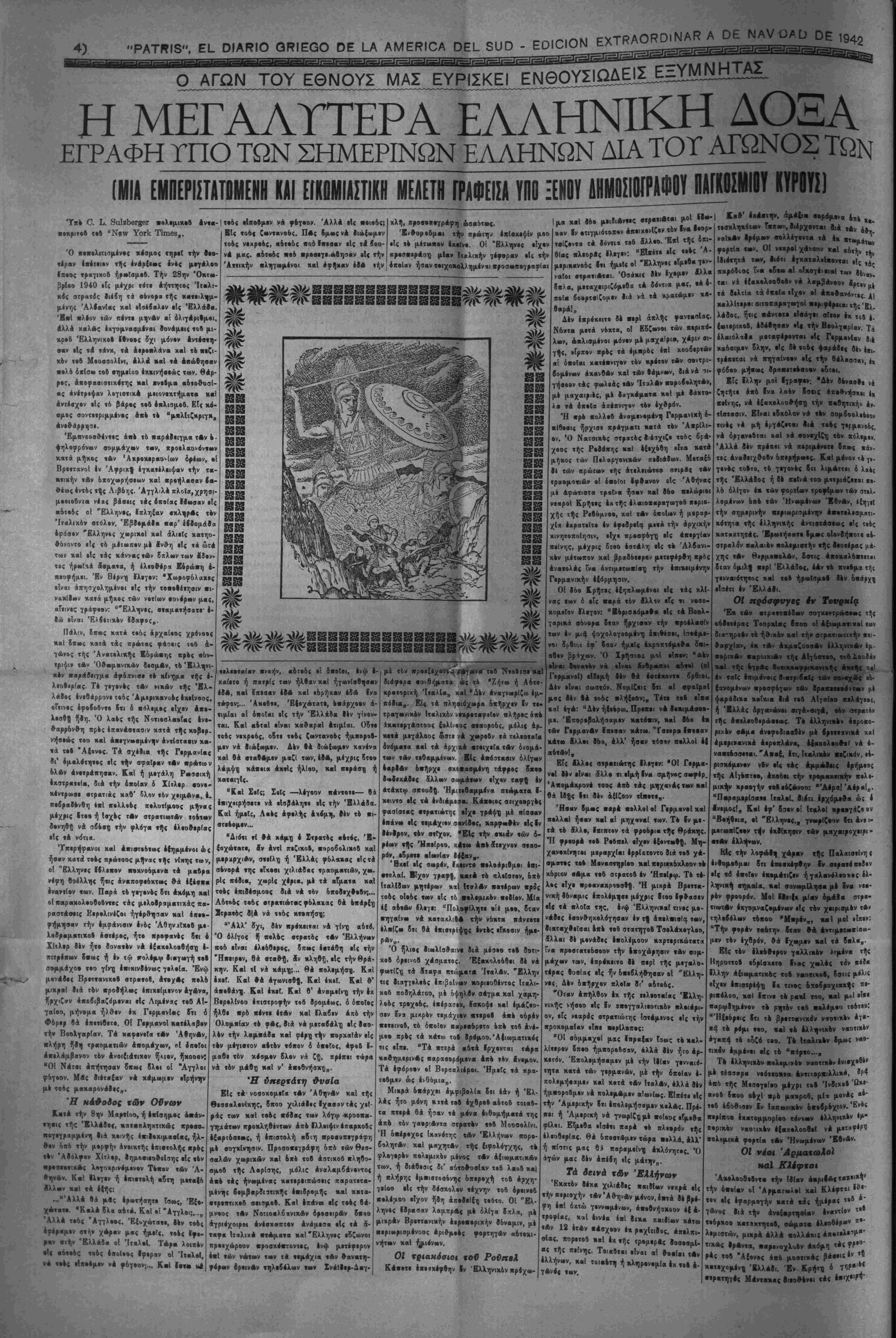 δ ή"λιβς της 22ετ< Ζ·«τ·μ|ρί·ο <·6 480 πρό Χρισΐοβ άνέτειλεν, 3οο στολοι ήβαν άντιμετωΐτοι αλλήλων ·1ς χά Στιν* τής Ζετ- λβμΓνος, ό μικράς βτολος τής Ελλάδος, ά- ηετελβ6μενος Ι» 378 πλοίων, έφ' ών έ«έ?αι· νόν 80 000 μ,αχηταΐ καί ί μέγ«« σ«$λβςτής Περσίβς ά*βτελο»μενβς έκ 1200 «λοίων, έφ' ών έπέβαινον 200.000 μβχηταΐ. Έπάλαυν ιίτε ή μικρά καί «ιε»χή Ελλάς κεττό. της μεγάλης κ*ί Χροβοβόροο Περαικής Α6τοκρ*- «ορίεΚ. Καί εξήλθεν Νικήτρι*!... "Οταν ό η"λιος τής 28ης ΌχτωδρΙβο 1940 ένέιειλεν, 8οο ατρατοΐ ήσαν άντΐμέΐΜΚοι αλ¬ λήλων είς «ήν "Ελληνβαλδανιχήν μεθόριον. *Ένχς μιχρός στρατος τ1)ς Έλλά8·ς άτοτε· λοβμενος μόλις έκ τριΑν μεραρχιΑν κειί το6- τ»ν άτελώς ώαλιβμένων, όχοστηριζομειος 2έ άπο έλ«χ(ατην 5ν δ*χι μηδαμινήν άεροπορι- κήν Ι&ναμιν, καί Ινας ίσχορδς οτρατος τής Ιταλίας ά*·οτελο6μενβς έκ τής IX καΐ Χ Ιιαλιχής ατρατιβς βονολικής δοιάμεβς 300.000 άνβρών, έχ ίό· Σονταγμάτων Ηερ- σαλλιβρων, έ{ ίνβς Τάγμ«το~ Μβλανοχιτώνων, ϋ ενός Τάγματος ίπιλίκτων, έχ μι*ς άλδχ- νιχ1)ς λεγεώνας, όκοατήριζόμενος οέ άκδ I- σχορδν τμήμ-χ ιί)ς ίταλιχής «εροπορίετς καί άπ· άπειρά&ι9-μ»ν ποροδολιχόν Έπάλαιιν *·»>« ή |>(κρά κ»ί άν(βχτ>ρ>ος Ελλάς κατ