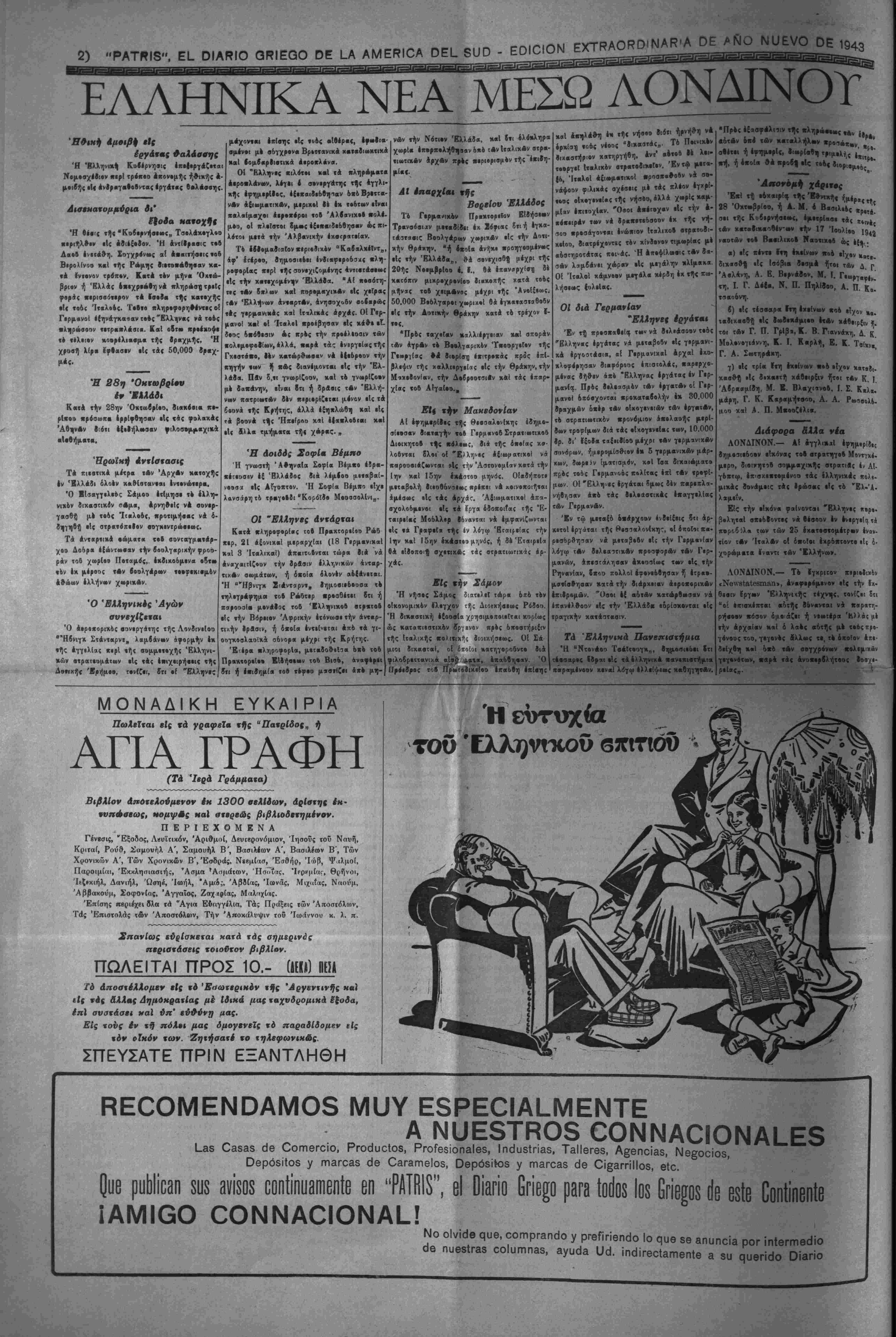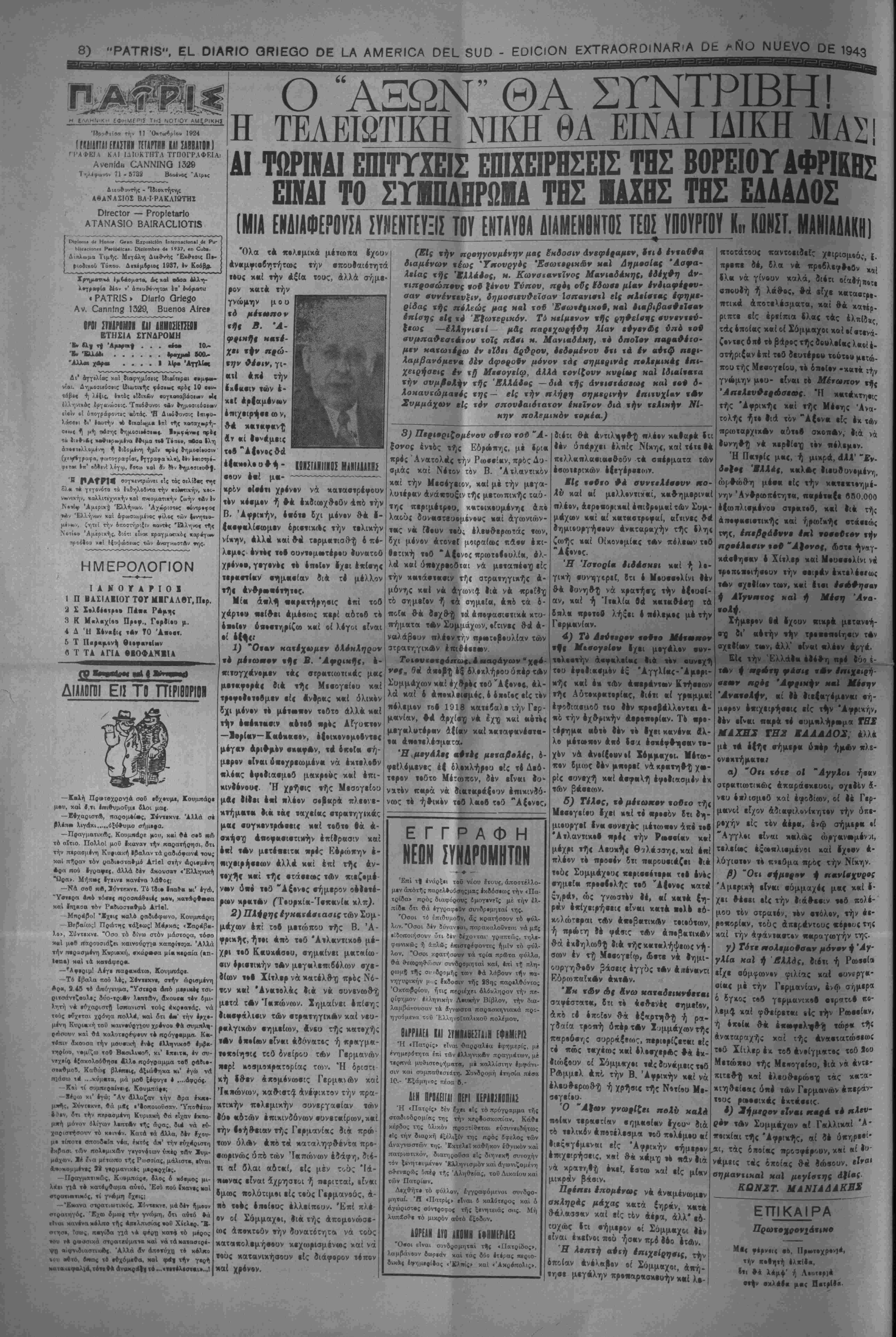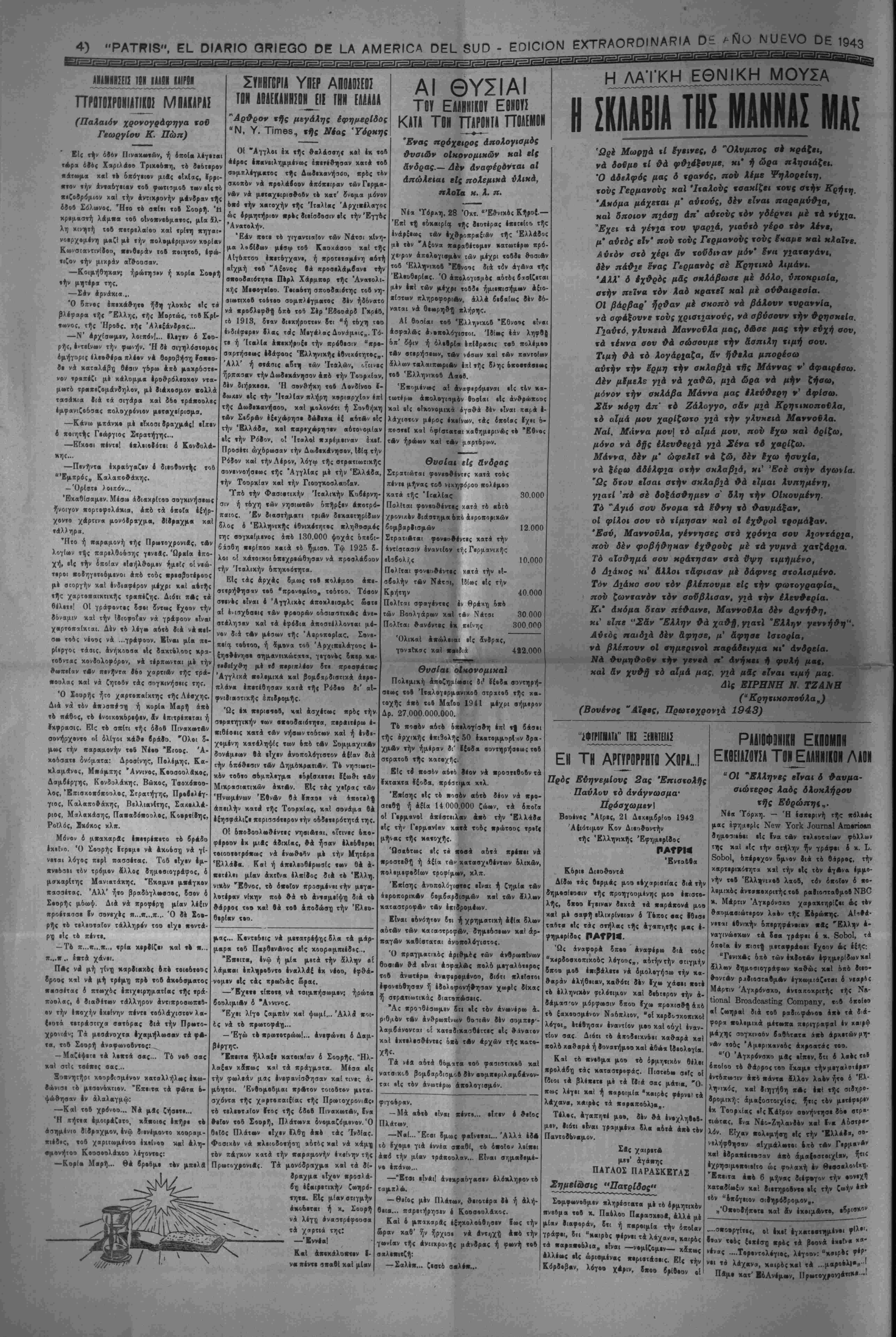 την χ««ά·««·ιν τή< ατρα«ηγιχί)( Α¬ μύνης κ«Ι νά Αγωνι^. Ιια νά «ρ·ΐ$ΐ τό σημ«Γ·ν ή «ά οημεία, έιιο τα δ- ηοΓ« θά θ·χθ·γ^ ιά ««ογαβιντιχά χτ,ο «Αν Σαμμάχων, ·Γαν·< ΦβΙ 4- ναλάββυν πλέον τη ν ηρ*οΓ·|Ιουλίαν των ν έπι&έεεειν. *α6ηω%, Λ εβαοβγων θά ϊυμμΑχων χκί έχ)ϊ·ρ·< «δ νΑ|ον·4, Αλ¬ λά χαί ο Αηοχλ·ι·μο(, 4 4μο^ είς χον πόλεμον τβΙ 1918 χαιεία)· ιήν Γερ¬ μανίαν, 4>ε1 Λρχί·*Ο νά Ιχ-ς χαί «*·τ·< μ·γ«Χ»τ4ρειν «Μ ·Φτέζ μεταβολές, 6- έ| 6λ·κλήρ·υ ·ίζ «4Δ·6- τ·ρ·ν ΐβθτο Μέτωπον, ίέν «Γνκι Ιο- π«ρά νά βι«««ρΑ|«υν 4τ»κιν9ό· νως «· ηθικόν τ·0 Χ«·β ζ·ύ "Α|·νοο Ε Γ Γ Ρ Α Φ Η ΝΕΟΝ ΣΥΝΑΡΟΜΗΤΟΝ —*- — "Επί τ| ενάρξει τού νέου έτους, άποοτέλλο- μεν άπόττ)ς καρελΐούσηςμας εκδόσεως την «Πα- τρίδα» ίΐρός διαφόρους ίμογενίϊς μέ την έλ- πίΛει δτι θά ίγγραφ·0ν συνδρεμηταί της. Όσοι το έπιθυμοθν, άς κρατήσουν τό ·ύλ- λον. Όσοι δέν δύνανται, παρακαλοθνται νά μ4ς εΐδθίτοι.ήσουν ότι δέν δέχονται· γραπτώς, τηλ*- φωνικώς ή απλώς Επιστρέφοντες ημίν τό φύλ¬ λον. "Οσοι κςατήσουν τα τρ(α πρ©τα φύλλα, θά θ·εοβρηθ·ο)σιν συνδρομηταί καί, Ιπί τί πλη- ρωμζ τής συβρομής των Ι-ά λιΐβουν την πα¬ νηγυρικήν μ·.ς Ιχοοσιν τής 88ης «αρελθόντος ΌκτωΡρίου, ήτις ιτβριέχβι ολόκληρον την πε¬ ρίφημον ελληνικήν Λευκήν Βίβλον, την δια- λαμβάνουσαν τα ίγνωστα παοαοκηνιακά προ- ηγοΰμενα τού ■Ελληνοϊταλικοΰ πολέμου. ΒΑΡΡΑΑΕΑ ΚΑΙ _ΥΜΠΑΘ£-ΙΑ^Η ΕΦΗΜ£ΡΙ- Ή «Πατρίς» είναι θαρραλία εφημερίς, μέ «νημβρίτητα επί τδ)ν ίλληνικΛν πραγμ«των, μέ τιρκνά μυθ-ιστο^ήμβτβ, μέ καλλίστην εμφάνι¬ σιν και συμπαθεστίτη. ϊυνδρομή έτησία πέσα 10.- Έξάμηος πέσο Β.- ΔΙΝ ΗΡΗΕΙΤΑΙ ΪΕΠ ΙΕΡ1Ι2Ι0ΠΙΑ2 Ή «Πατρίς» δέν ίχβι είς τό πρόγραμμα τής σταβιοδρομίβις της την κερβοσκοπίαν. Κσθε κέρδος της δλικόν προ3τίθ«ται βύσυνειδήτως είς την βιαρκή έζέλιξίν της ποός ϊφελος των αναγνωστών της. 'ϊκτελίϊ καθήκον εθνικόν καί πατριωτικόν, διατηρούσα βΐς Λιηνεκΐ} συνοχήν τόν (βνητευμένον "Ελληνισμόν κα'ι άγωνιζομένη σθεναρώς υπέρ ττ]ς Αληθείας, τού Δικαίου καί των Πατρίων. Δεχθήτ· τό φύλλον, έγγραφόμενοι συνδρο¬ μηταί. Ή «Πατρίς» είναι 4 καλύτίρος καί ό άχώριστβς ούντροφος ττ)ς ξενητειάς σας. Μή λυπίσθ-· τό μικρόν αΰτό δξοδον. 40ΡΕΑΚ Ιϊθ ΑΙΟΗΗ ΙΐΗΜίΡιίΠ "Ο·οι είναι ουνδρ,ομητα'ι τ!|ς «Πατρίδος», λαμβάνβυν βιορεάν καϊ τάς 8<5ο ετέρας «ριο- δΐΗΛ< ίφημερίδας «Έληίς» καί <Ά>ιρ·πολις>,