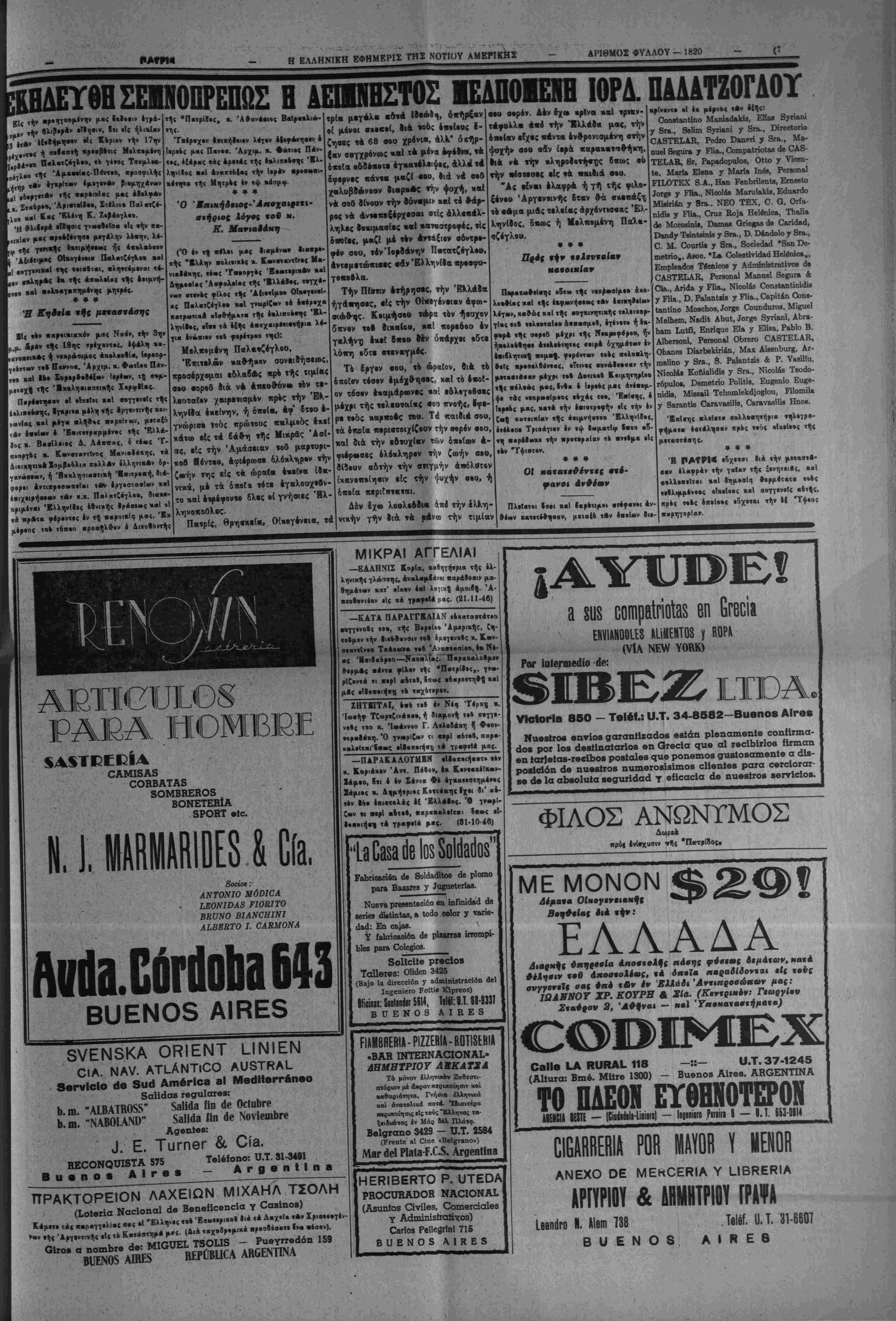 ληνιχήν σημαίαν, ίβρον «ής χολε«< ««ν Ά- ♦ηνέεν. • · * —*Ανεχβινώ#η Ιτι «ήν ημέραν «·ς ·«,. βήμο· «ροοαρτήαεεες «Αν Δ«8·χανι)α«ν ιΐζ «ο Ίλληνιχέν Βασίλειον 0ά λναμνηβ«ιχ·ν γραμμα«οσημόν. * * * —Τ«6«·β'Γχοβργε(βο 'Ε»ν. ΟΙχονομΙ·« χβτηρτΙβ*η σχέΐιον νέμοο, ίι' οό έχι^ρέι·- «αι ή ίβρπβις άνβ»ν6με.ν έ«αιρει«ν μέ κι·ί· λετΐα έχχεφραβμΐνα είς ξένον νομιομα, «ο6ς «6ν αχοχ6ν 5κε»ς *ροσελχοσ6·αι ξένα χεε!· λαια. Τό μέτρον ·ά Ισχοσ^ μόνον αρβκιι»!- νβο —αρΐ ν*ο«ιλιαχ·ν, • * * Επιστολαί ΗαΙ τηλβγραφήματα Μάρ ίέλ Πλά«α-Άργον«ινή<, 9 'ϋχτ. 1946 Κόριον Άβανάοιον ΒαΙραχλιεέτην Δι«ο·οντήν·Ί9ιοχ«ή«ην τής Εφημερίδος ϋΑΤΡΜ Βεοενος 'Αΐρες 'Αγαχητέ μοο Κ· ΒιΤρακλιΑτη ΈλΙ τή νέα 'Μχετείφ τής φιλ«ά«ης μ εκ Εφημερίδος ΡΑΤΡΜ ·5χομαι χ όγεΐιν χαΐ Οάρρος κρός συνέχισιν τοβ μεγα- λοο έ«>νιχο6 Ιργοβ «ής.