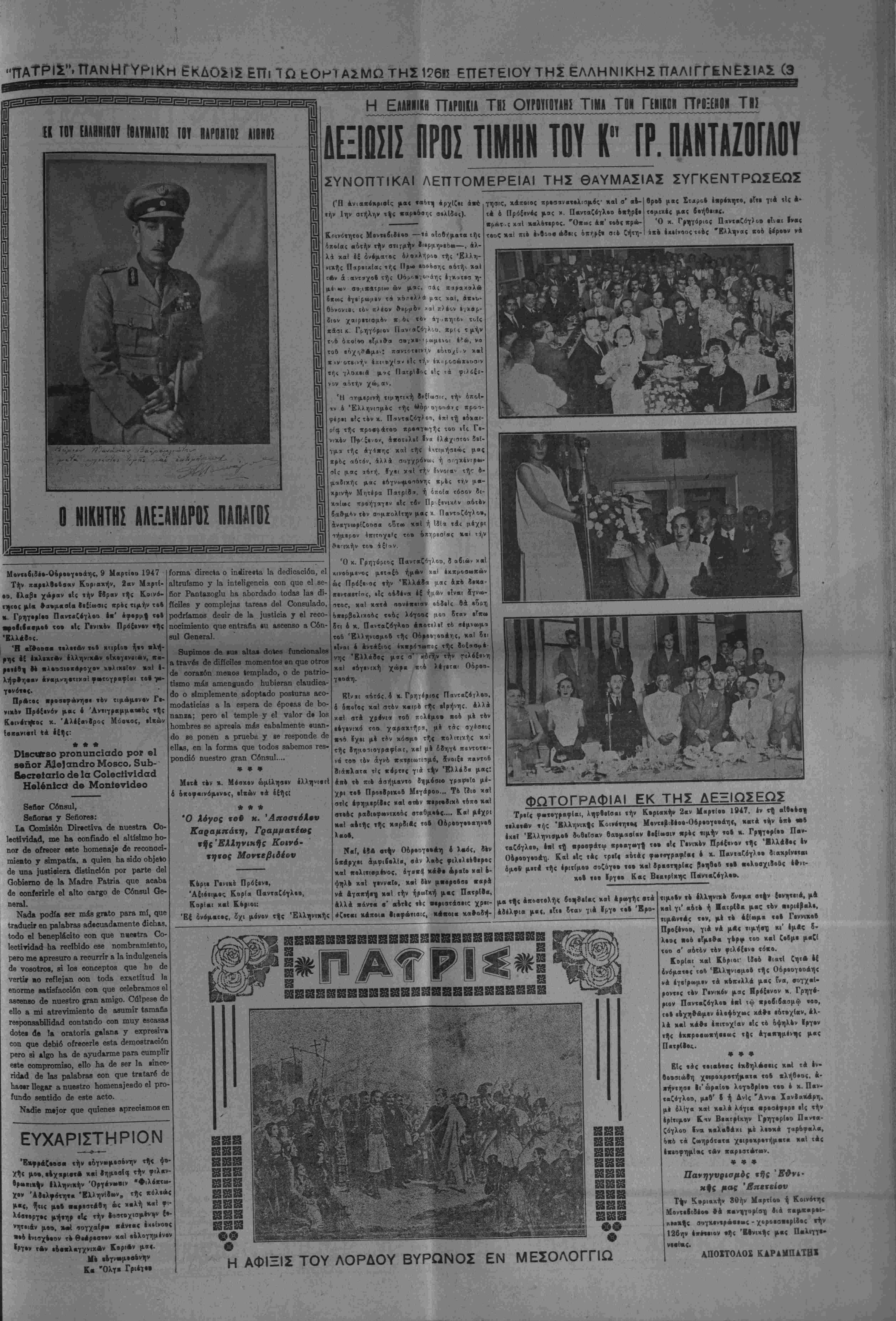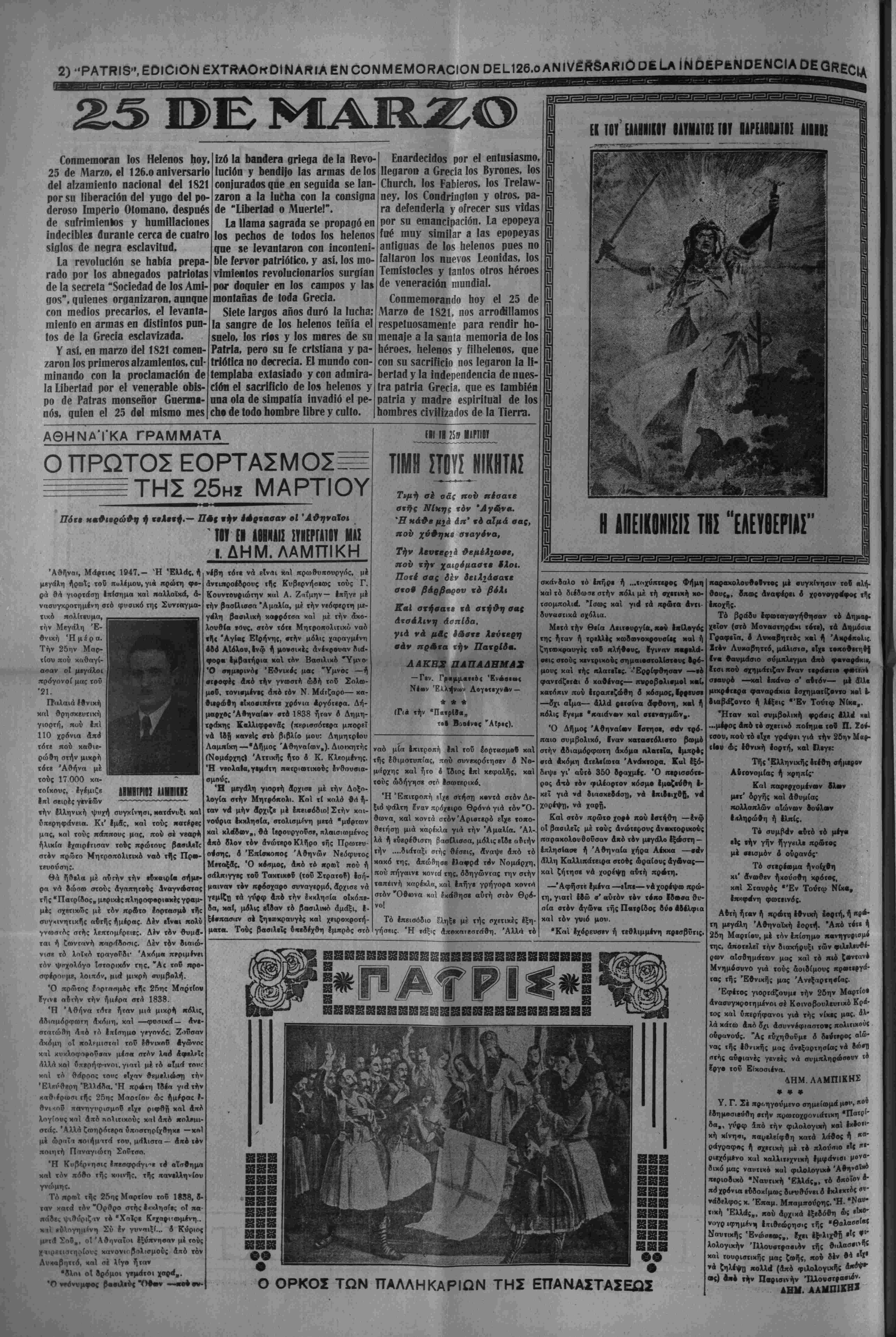 ΐΊα, ρβΓΟ 8υ (β <τΙ$ιΊ3Π3 γ ρ3- ίτ.όιΊθ3 ηο (ΙβθΓβοί3. ΕΙ πΐϋΠ(1ο εοη- βηιρΐ3ΐ)3 βχ(38ία(1ο γ εοη α(1ιτιΐΓίΐ- είόιι βΐ 53ετίίίε1ο άβ 1ο» ηβ!βηο8 γ υπ3 οΐα άβ 8ίπιρ3ΐί3 ίηναοΊ'ό βΐ ρβ- εη· άβ Ιοιΐο ηοηΐϋΓβ ΙΐΊϊτβ γ ειιΐΐο. ρογ βΐ βη1η$ί38ηιο, 11β03Γθη 3 6Γβεί3 Ιθ8 ΒγΓ0Π68, 108 ΟηπΓεη, 1ο$ ΡβϋβΓΟβ, Ιοδ Ίϊβΐ3ν- ηβγ, Ιθ8 Γοηάπΐκτΐοπ γ ο!γο8, Ρ3- Γ3 άθίβηΐΙβΓΐβ γ θίΓβεβΓ 8ϋ8 νί(ΐ38 ρογ 8Μ βηΐ3ηπρίιΐΊΟη. Ια βρορβγ ίαέ ιηυγ χΐπιϊΙαΓ 3 138 βρορβγβ ύβ 1ο8 Π6ΐβηθ8 ρυβ8 ηο Ιθ8 ηυβνοβ Ιβοηί(ΐ38, 1θ8 Τβηιί8ΐοε1β5 γ ΐαπΐοδ ο!γο8 άβ νβηβΓ3είόη ι:ιιπιι1ΐ3ΐ. €οππΐθπιθΓ3πιΙι· ηογ βΐ 25 άβ Μ3ΓΖ0 (Ιβ 1821, ΙΊ05 3ΓΓ0(ϋΙΐ3ηΐ08 ΓΡ8ρΡΐυθ83ΙΠΘΙΐ[ο Ρ3Γ3 ΓΘΙΚΙΐΎ ΠΟ- ηΐβΠ3]*β 3 13 8311(3 Π1βΐηθΠ3 (1θ 1θ8 ηβΓ0β5, ηβ!βηο8 γ Πΐηβΐβηοδ, εοη 8ΐι 83ει*Ηίείο ηο8 Ιβ[ΐ3Γοη 13 Ιί- 1)0Γΐ3(1 γ 1β ίη(ΐ6ρθη(1βηεί3 άβ ηηβδ- ΙΓ3 Ρ8(ΓΪ3 θΓβθία. (Π16 68 ΐ3Π1ιΐίθΠ γ πι3ο!γρ .^ρίπΙιΐ3ΐ 4β Ιθ8 Π0ΠΐΙ)Γ08 είνί1ίζ3(1θ5 άβ 13 ΤίβΓΡΒ. ΑΘΗΝΑΊ'ΚΑ ΓΡΑΜΜΑΤΑ Ο ΤΤΡΩΤΌΣ ΕΟΡΤΑΣΜΟΣ ΤΗΣ 25ης ΜΑΡΤΙΟΥ «βθιερώθη ή χ$Αβ*ή.— Πάς «ε)ν έώρτασαν οί Αθηναϊοι ^ II! Μ 1Ι1ΗΙ! ΙΤΝΕΡΓΑ10Τ ΜΗ Ι.ΔΗΜ.ΛΑΜΠΙΚΗ Αθηναι, Μόβτιβς 1947.- Ή Ελλάς, ή μεγάλη ήρωΐς τού πκλέμου, γιβ πρώτη φ·- ρά θά γιορτάστ) Ιπίσημα χαί παλλαΐχά, ά- νασυγκροτημένη στό φυσιχό της Συνι«γμα- τικό πολΕτβυμα, την Μβγάλη Έ- θνιχή Ήμέρα. Την 25ην Μαρ- τίου πού καθαγί- αααν οί μβγάλοι πρό"γονοί μ«ς ιιιιτριι! λχηιιπ Ιϊ(»λαιά Ι9νική χαί θρησκβυτική γιορτή", «ού Ιπί 110 χρονια Λπβ1 ιότβ ποί) χαθιε- ρώθη στήν μικρή «ότε Άθήνα μέ «ούς 17 000 κα- τοίχους, εγέμιζβ Ιπί σειρές γενεών «ήν έλληνική ψνχή συγκίνησι, Νατάνυξι χαί δπερηφάνεια. Κι' Ιμίς, καί «ούς πβτέρες μας, καΐ «ούς χαππους μας, πον αί νεαρ*ι ήλιχία ΙχαιρΙτισαν τολς πβώΐους βββιλβΤο στό ν πρώτο Μητροπθλιτιχό ναό «ής Πρ·- «ευούοη;. Θά ήθελα μέ αυτήν «ήν ευχαιοία βήμε- ρα νΛ 8ώσα> στούς Λγαπητβύς Ιναγνώστας
