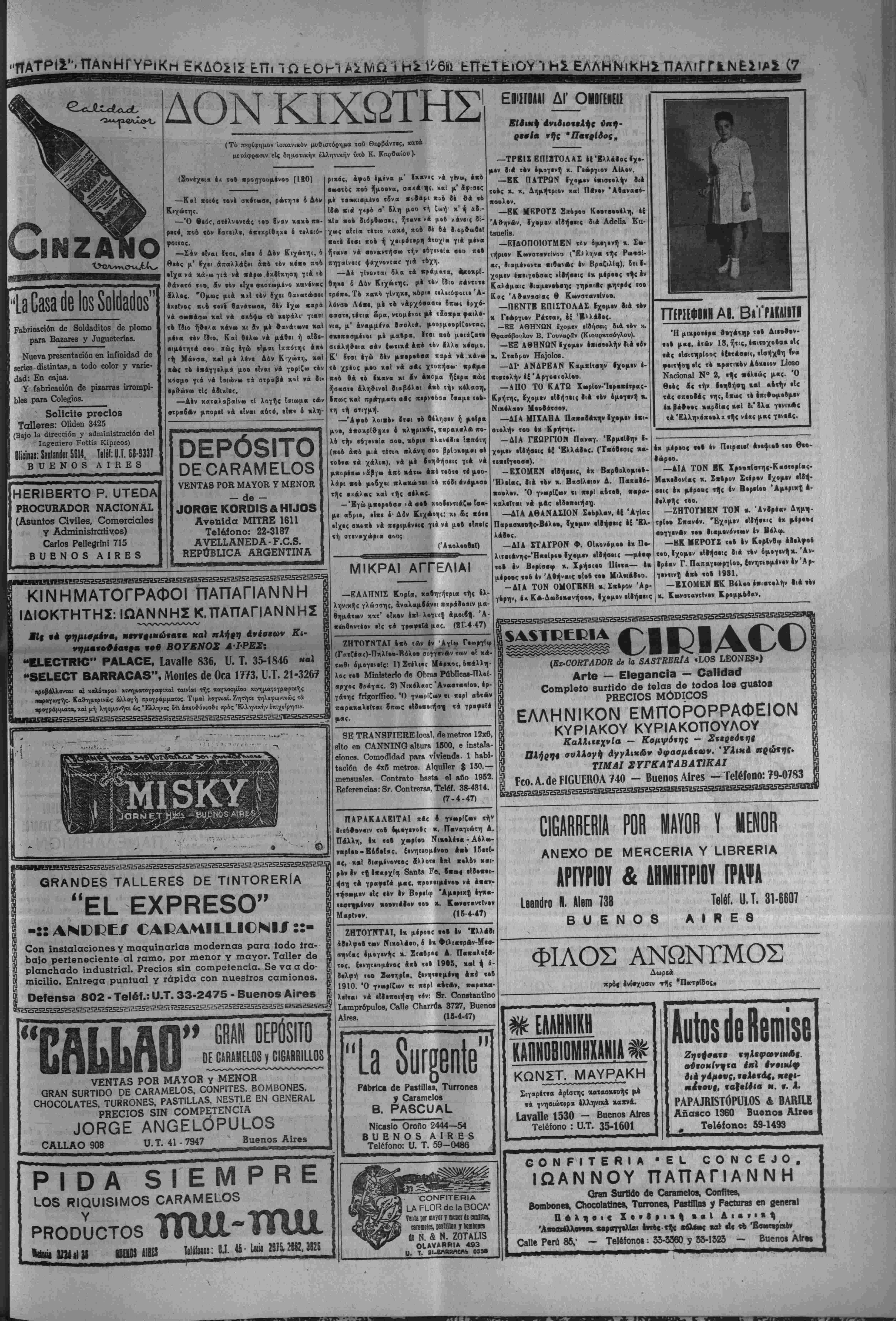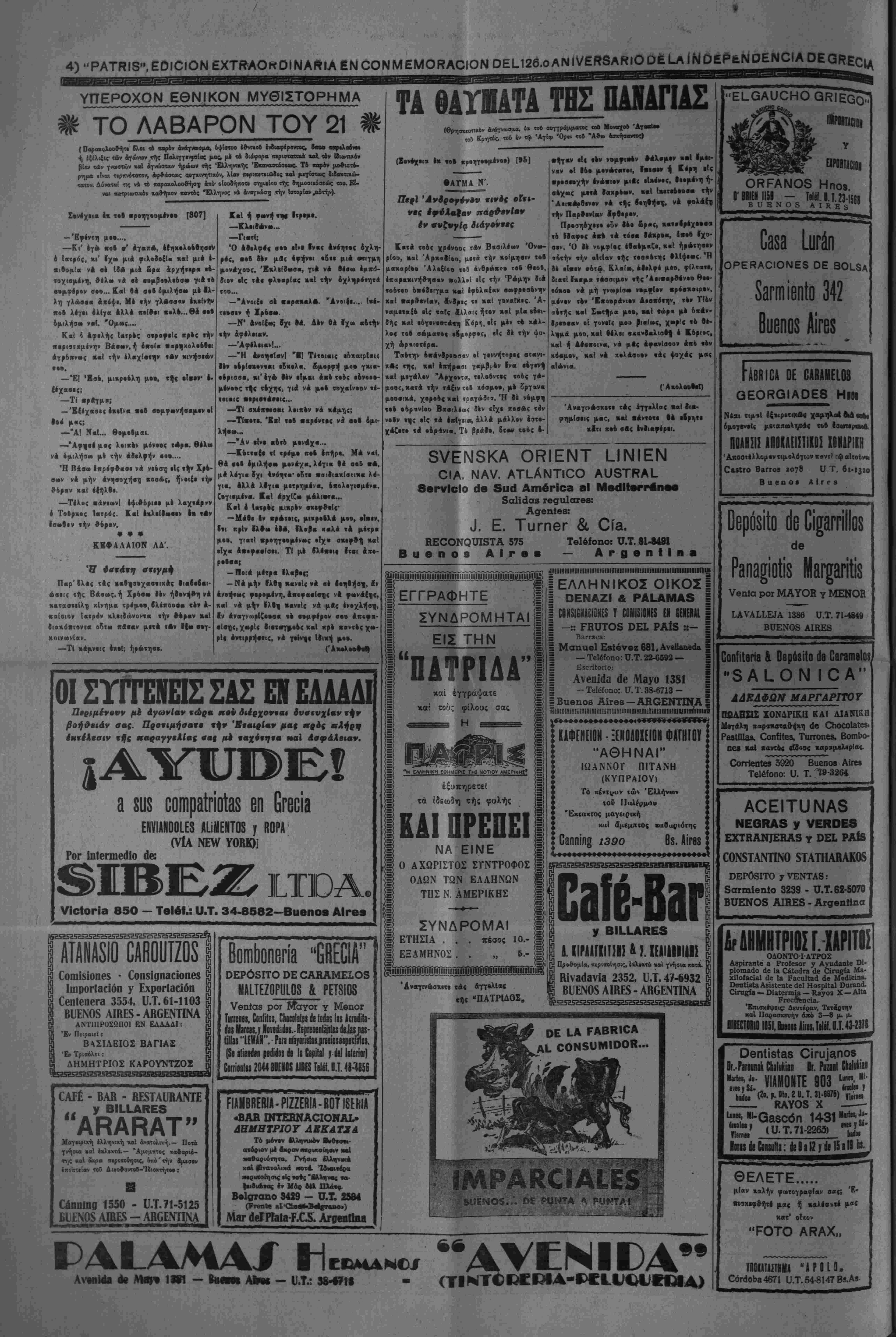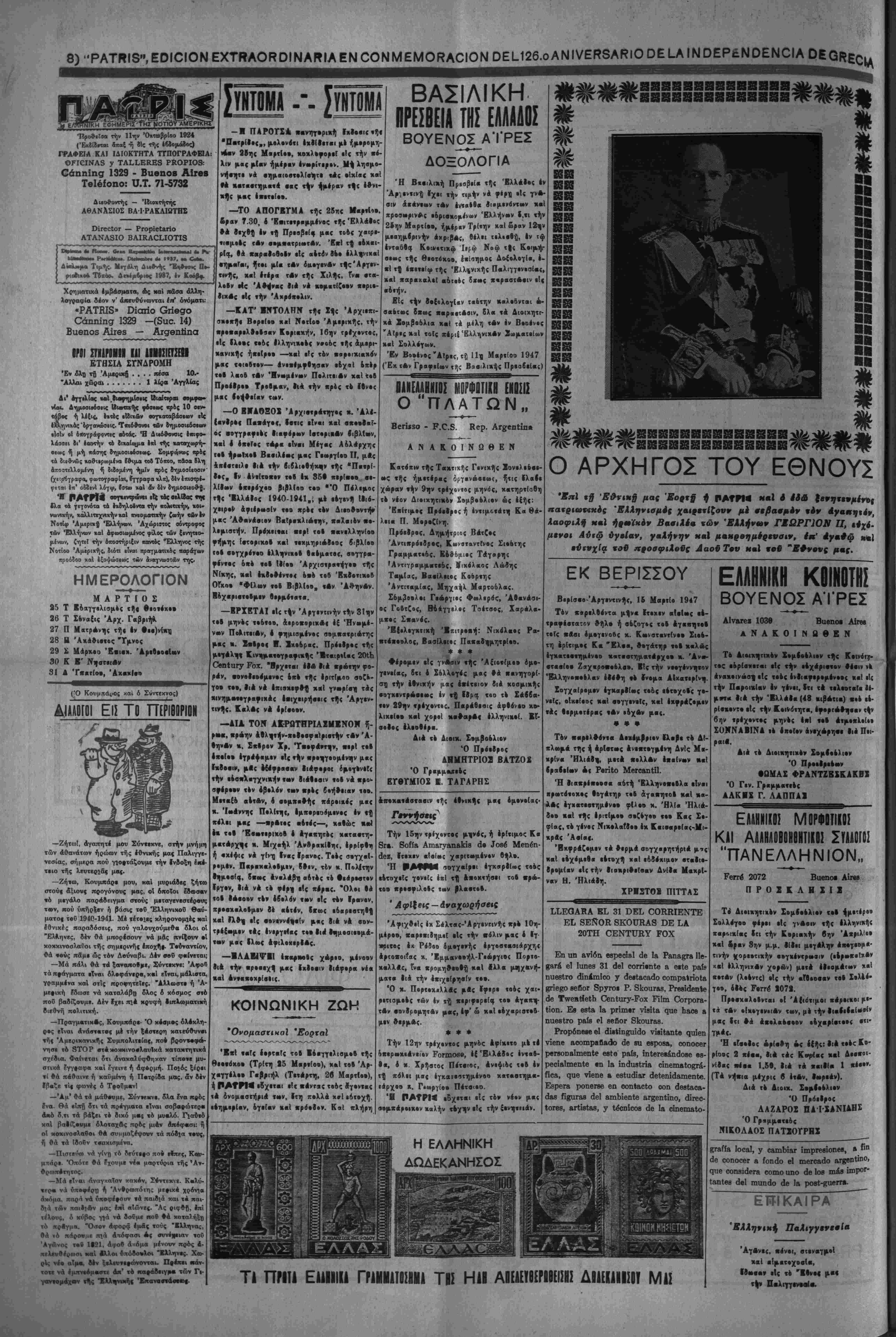 Αφιχθείς Ιχ Σ«λ«α<-Άργεντινής κρο 10η- μέροβ, «αρ·*(Ιημ.«Γ είς «ήν «όλιν μας 4 Ιγ »ρι«ος έχ Ρέδοο ίμογενής έργβσ«ααιαρχηί *ρτο«οιίας χ. Ίμμανε»ήλ-Γεε»ργι·ί Πορτβ- χαλλαο, Τνα «ρομη»εβ·ΐ) καί <λλα μβ"χανή- μα«α Ιιά την έκιχε(·ησ(ν «··. Ό ν. Π«ρτ·Χίλλ*ς μας Ιφιρε «βές χαι- ρετισμ·4ς «ών έν τ) κεριφερεΐα το» Αγακη- τΑν σονίρομητΑν μας, έφ' ώ χ«1 ·4χετριο«·6- μεν ♦ * * Την 12ην τρέχ·ν«ος μηνός 4·ίχ·«ο μ» τί Ροπηοββ, 1ν«ετ§- »«, 4 χ Χρήβτος Πέτβιβί, ανεψιός τ·6 έν τή πόλει μ«< έγχαΐεστημένοο χαταστημα- ιαρχοο χ. Γειβργίο» Πέτβοο. '■ ΠΑΤΡ1»Ι εδχεται είς τον νέον μας β·μ«άρ·ιχον καλήν «*χην είς την £ενη«ιιάν. ^^λΙ^ Ο ΑΡΧΗΓΟΣ ΤΟΥ ΕΘΝΟΥΣ Έπ *§ Ε&νΐΜ§ μας Έο§τ§ ή ΡΑΤΠ·! **1 Λ Βΐωννχός ΈΙληνιβμές χαίςβχίζουψ μέ βββαβμίν λαοφΐλη $$*1 ήι»ΪΗΟν Βαβ,Αέ* χ ών Έίλήνων ΓΕΩΡΓΙΟΝ II, μβνοί Αύτω ννβ/αν, γΜΐήψην ν αί μΛΜρφημέόΐνσΐψ, 4η' Λγ*Φφ βύινχΐα %οϋ αιοσφιΧθϋς Λαοϋ Τ·υ μλΧ ιφΦ "ΕΦνβνς μ*ς. ΕΚ ΒΕΡΙΣΣΟΥ » » · Βερίσ·ο-'Αρ7·ντινή<, 16 ΜαρτΙο 1947 Τέν ««ρελβόντα μήνα Ιτεχεν «(ο(ε*ς εέ- «εαφέσΐατον #ήλ» ή σ»ζογ·ς «οί ίγακητο! «είς «Λβι 4μβγ·νο6ς χ. Κ«νσ«αν«(νο· Σιο4- τη έρ(τιμ·« Κα Έλσα, Λογάτηρ «·λ χαλΑς έγχατεανημένβο χειταατηματΑοχο· κ. 'Ανβ- οτααίεο Ζαχ«ρο*ο»λσ·. Β(ς «ήν νεογέννητον Βλληνβεΐβελαν έΙέ4>η «ο ϊνομα Αίκατερίνη