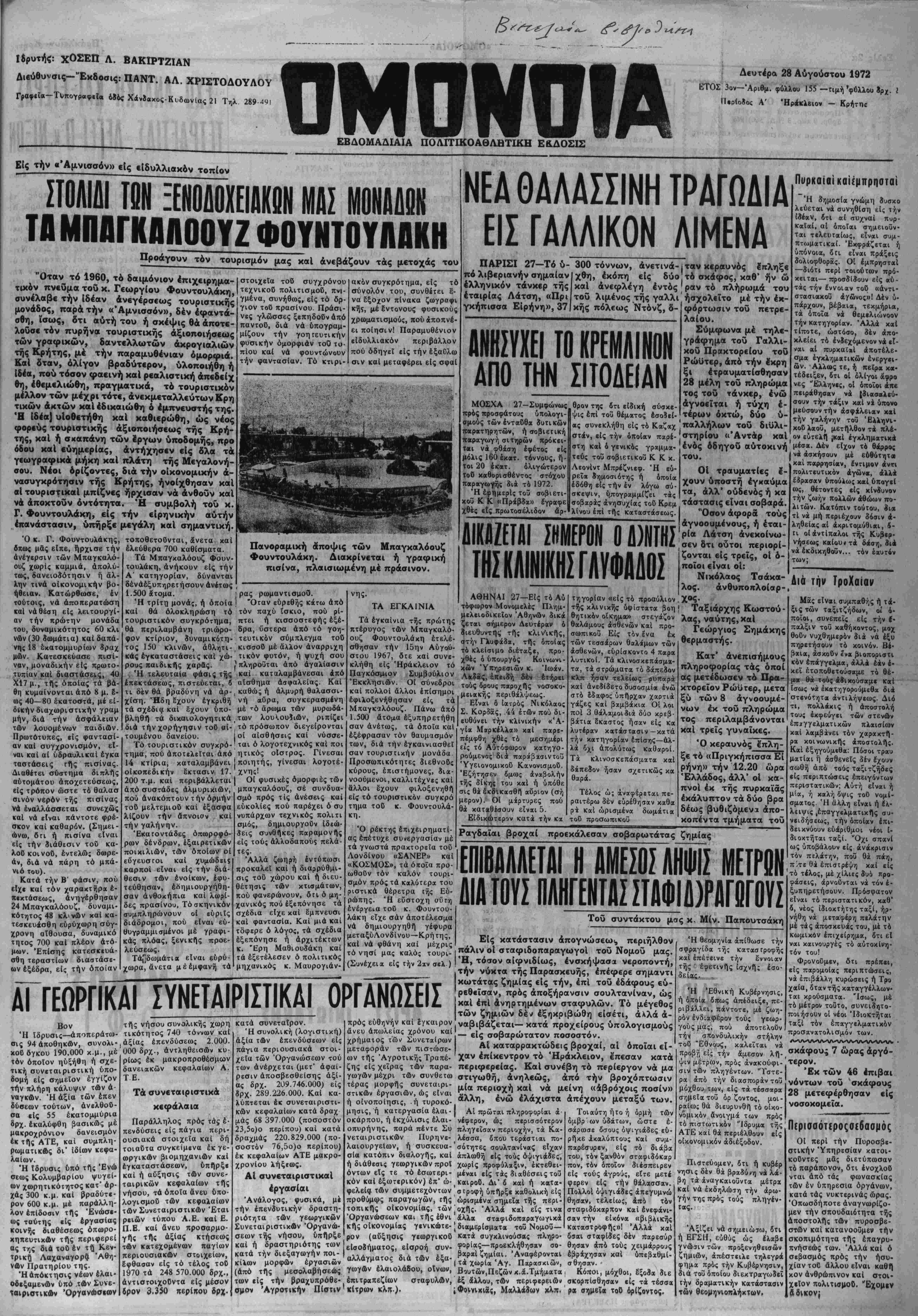 Γραφ«ΐ«-Τΐ»πογρβ<ρίϊβ 68* Χάνί,χος-Κυδωνίας 21 Τηλ 289-40, ΟΜΠΜϋΙΑ • Δευτέρα 26 Αύγούστου 1972 ΕΤΟΣ 3ον—'Αριθμ. φύλλου 155 — τιμή 'φΟλλοϋ ίρχ. Ι Περίοδος Α' Ηράκλειον — Κρήτην ΕΒΔΟΜΑΔΙΑΙΑ ΠΟΛΓΓΙΚΟΑΘΛΒΤΙΚΗ Ε&ΔΟΣΙΣ Είς την «'Αμνισσόν» 6ίς «ίδυλλιακόν τοπίον ΣΤΟΛΙΔΙΤΟΝ ΞΕΝΟΔΟΧΕΙΑΚΙΐΗ ΜΑΙ ΜΟΝΑΑΟΚ ΤΠΜΠΟΓΚΑΑΟΟΥΖ ΦΟΥΝΤΟΥΑΒΚΗ Προάγουν τόν τουρισμόν μβς κ α Ι άνεβάζουν τάς μετοχάς τού "Οταν τό 1960, τό δαιμόνιον έπιχειρημα- τικόν πν€θμα τοΰ κ. Γεωργίου Φουντουλάκη, συνέλαβε την ιδέαν ανεγέρσεως τουριστικής μονάδος, παρά την «Άμνισσόν», δέν έφαντά- σθη, ϊσως, ότι αυτή τού ή σκέψις θά άποτο λοΰσε τόν πυρήνα τουριστικής άξιοποιήσεως των γραφικών, δαντελλωτών άκρογιαλιών τής Κρήτης, μέ την παραμυθένιαν όμορφιά. Καί δταν, ολίγον βραδύτερον, ύλοποιήθη ή Ιδία, ττού τόσον φαεινή καί ρεαλιστική άπεδείχ θη, έθεμελιώθη, πραγματικάς τό τουριστικόν μέλλον των μέχρι τότε, άνεκμεταλλεύτων Κρη τικών άκτών καί έδικαιώθη ό έμπνευστής της. Έ Ιδία] υίοθετήθη καί καθιερώθη, ώς νέος φορβύς τουριστικής άξιοποιήσεως τής Κρή¬ της, καί ή σχαπάνη των ϊργων ύποδομής, προ όδου καί βύημερίας, άντήχησεν είς δλα τα γεωγραφικά μήκη καί πλατή τής Μεγαλονή- σου. Νέοι Αρίζοντες, διά την οικονομικήν ά- νασυγκρότησιν τής Κρήτης, ήνοίχθησαν καί αί τουριστικαί μπΐζνες ήρχισαν νά άνθοθν καί νά άποκτοΰν όντότητα. Ή συμβολή τού κ. Γ. Φουντουλάκη, είς την ειρηνικήν αυτήν επανάστασιν, υπήρξε μεγάλη χαί σημαντική. στοιχεΐα τού συγχρόνου τεχνικοϋ πολιτισμοθ, πνΐ- γμένα, συνήθως, είς τό δρ- γΐον τοθ πρασίνου Πράσι- νες γλώσσες ξιπηδοθν άπό παντοθ, διά μίζουν την νά ΰπογραμ γοητευτικήν φυσικήν όμορφιάν τοθ τυ πίου καί νά φουντώνουν την φαντασίαν. Τό κτιρι- ακόν συγκρότημα, είς τό σύνολον τού, συνθετει 8- να έξοχον πίνακα ζωγραφι κης, μέ Εντόνους φυσικούς χρωματισμού;, πού άποπνέ- εί ποίησιν! Παραμυθένιον «Ιδυλλιακόν περιβάλλον πού όδηγεϊ είς την έξαθλω σιν καί μεταφέρει είς βφαί Ό κ. Γ. Φουντουλάκης, βπως μας είπε, ήρχισε την ανέγερσιν των Μπαγκαλό¬ ουζ χωρΐς καμμιά, απολύ¬ τως, δανειοδ*ότησιν ή άλ¬ λην τινά οικονομικήν βο¬ ήθειαν. Κατώρθωσε, έν τούτοις, νά αποπερατώθη καΐ νάθέση είς λειτουργί¬ αν την πρώτην μονάδα τού, δυναμικότητος 60 κλι νών(30 δωμάτια) καίδαπά- νης 18 έκατομμυρίων δραχ μών. Κατεσκεύασε πισί- ναν, μοναδιχήν είς πρωτο- αΛυπίαν καί διαστάσε.ς, 40 Χΐ7μ.,*τής οποίας τα βά- θη κυμαίνονται άπό 8 μ. ε- ως 40—80 έκατοστά, μέ ει¬ δικήν δναχωριστιχήν γραμ μην, διά την ασφάλειαν των λουομένων παιδιών. Πρωτότυπες, είς φαντασί¬ αν καΐ συγχρονισμόν, εί¬ ναι καί αί ΰδραυλικαΐ έγκα ταστάσεις τής πισίνας. Διαθέτει σύστημα διπλής αύτομάτου άποχετεύσεως, είς τρόπον ώστε τό θαλασ σινόν νερόν της πισίνας νά έναλλάσσεται συνεχώς καί νά είναι πάντοτε φρέ- σκον καί καθαρόν. (Σημει- ώνω, δτι ή πισίνα είναι είς την διάθεσιν τοϋ κα- λοθ κοινοϋ, εντελώς δωρε- άν, διά νά πάρη τό μπά- νιό τού). Κατά την Β' φάσιν, πού είχε καί τόν χαρακτηρα ε¬ πεκτάσεως, άνηγέρθησαν 24 Μπαγκαλόουζ, δυναμι¬ κότητος 48 κλινών καί κα- τεακευάσθη εύρύχωρη σύγ- χρονη αίθουσα, δυναμικό τητος 700 καί πλέον άτό- μων. Έπίσης κατεσκευά· σθη τεραστίων διαστάσΐ- ων έξέδρα, είς την όποιαν τοποθετοθνται, άνετα καί ελευθέρα 700 καθίσματα. Τα Μπαγκαλόουζ Φουν¬ τουλάκη, άνήκουν είς την Α' κατηγορίαν, δύνανται δένάέξυπηρετήσουν ανέτως 1.500 άτομα. ΝΕΑ ΘΑΛΑΠΙΝΗ ΤΡΔΓΩΔΙΔ ΕΙΣ ΓΑΛΛΙΚΟΝ ΛΙΜΕΝΑ ΠΑΡΙΣΙ 27—Τό υ- 300 τόννων, άνετινά-. ταν κεραυνός ίπληξε πό λιβεριανήν σημαίαν ελληνικόν τάνκερ 