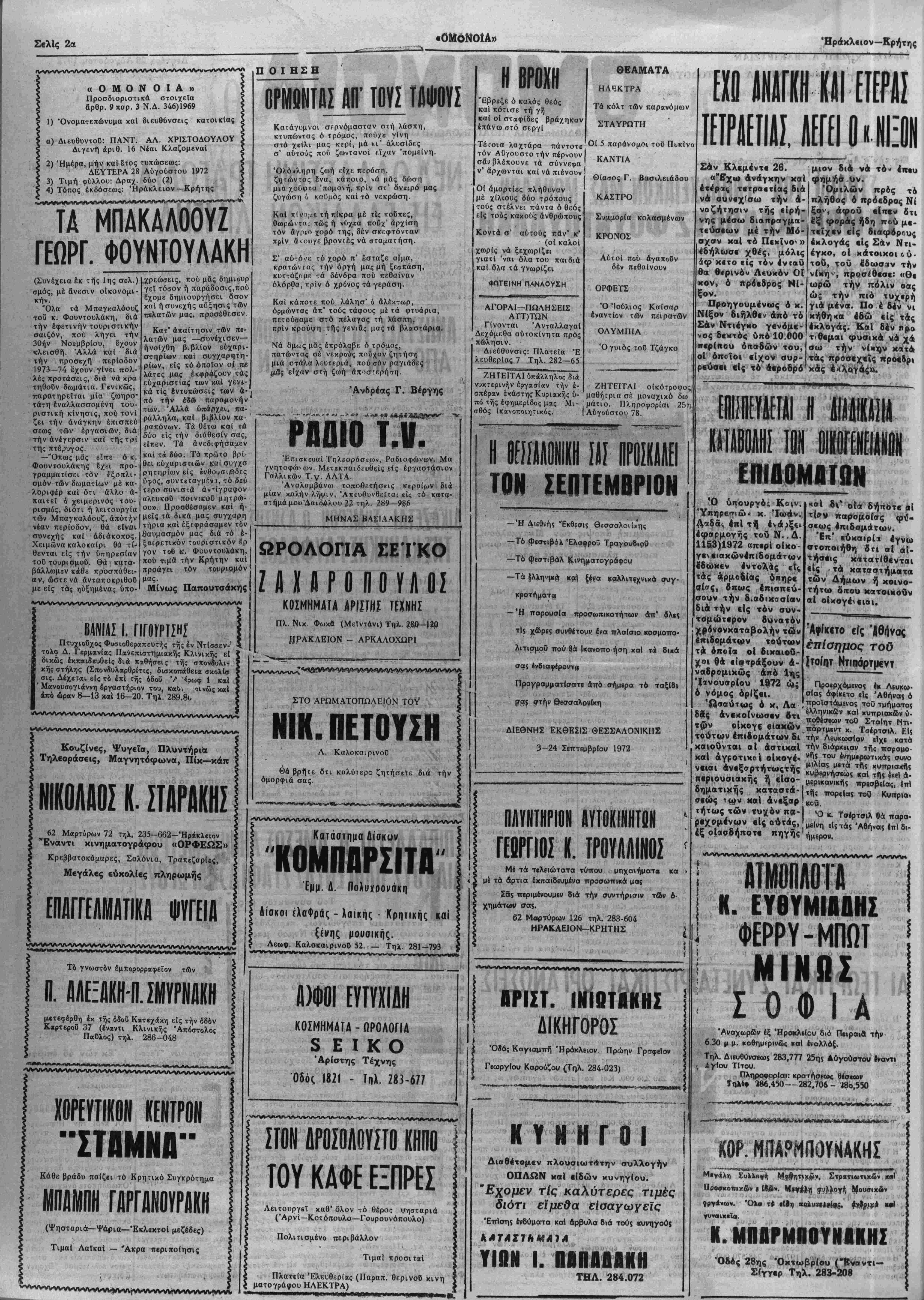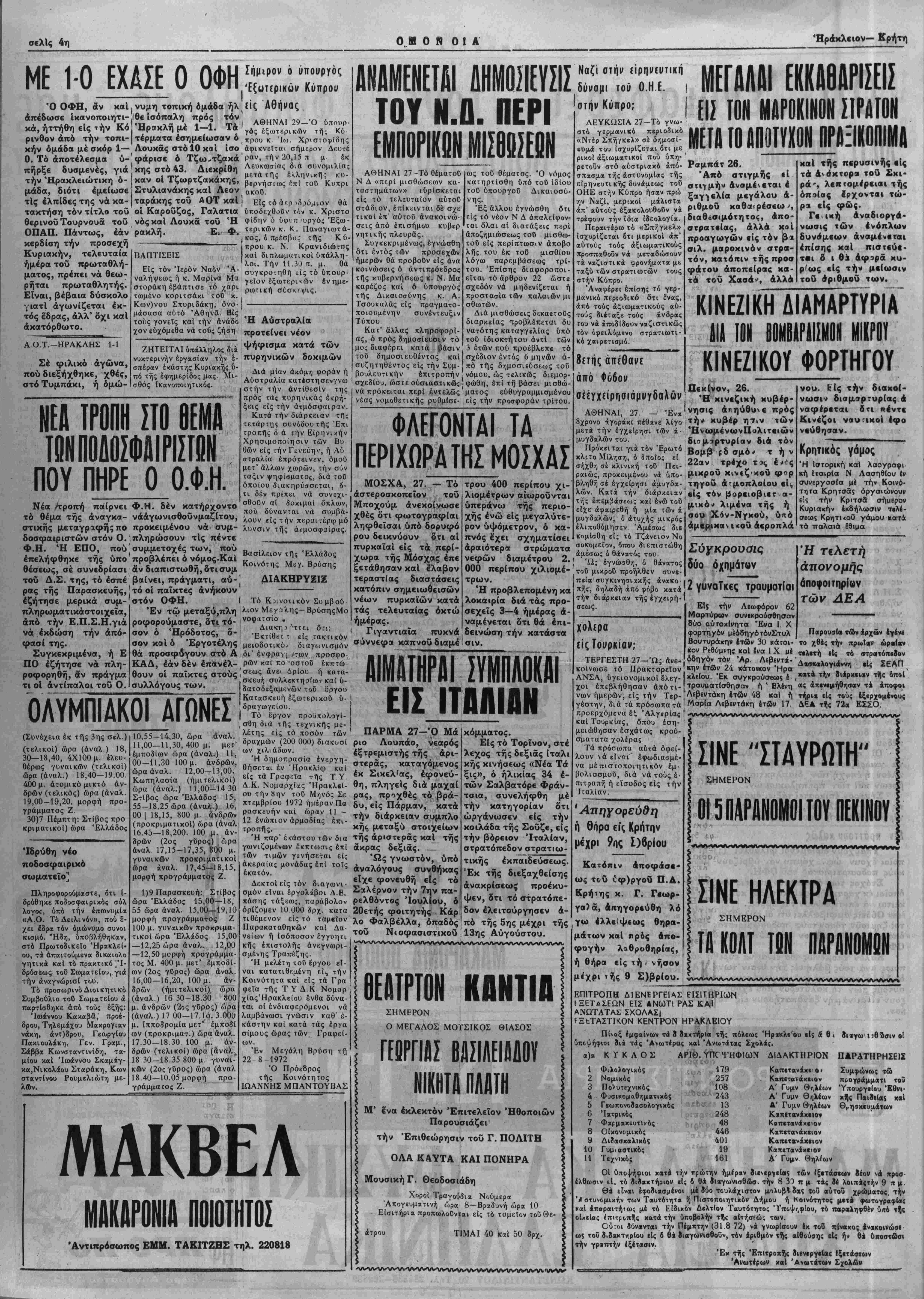 ραι «ίς <ρώς. Γ· ική άναδιοργά- νωσις των ένόπλων δυνσμεων άναμενβται 4πίσης καί πισυεύε- τ·ι δ ι Θ-» άφαρά κυ- ρ'ως «ίς την μείωσιν τοΰ άριθμοό των. ΚΙΝΕΖΙΚΗ ΔΙΑΜΑΡΤΥΡΙΑ Υ ΚΙΝΕΖΙΚΟΥ ΦΟΡΤΗΓΟΥ Πεκίνον, 26. Ή κινεζική κυβέρ¬ νησις απηύθυνε πρός την κυβέρ ηΐιν «ών ΉνωμένωνΠολιτειών διαμαρτυρίαν διά τόν Βομβ ρδ σμό^ την 22αν τρέχο τις έ^^ς μικρου κινεζκοθ φορ τηγοΰ ατμοπλοίου εί ι, |«ίς τόν βορειοβιετα- μικόν λιμένα τής ή σου Χόν-Νγκού, υπό άμ«β*κανΐκοϋ ά«ροπλά νού. 6ΐς την διακοί¬ νωσιν διαμαρτυρίας & ναφίρβται δτι ηέντ« Κΐνεζοι ναυηκοί 4<ρο νβύθησαν. Κρητικός γάμος Ή Ιστορική καί λαογραφι· κή έταιρία Ν Λασηθίου έν συνερ/ασΐα μέ την Κοινό· τη τα Κρητσάς όργαιώνοι/ν είς την Κριτσα σήαβρον Κυριακήν εκδήλωσιν τελέ- σεως ΚρητκοΟ γάμου κατά τα παλαιά εθιμα Σύγκρουοις δύο όχπμάτων ΕΙΣ ΙΤΒΑΙΠΝ ΠΑΡΜΑ 27-Ό Μά ριο Λουπάο, νεαρός έξτρεμιστής τής άρι- στερας, καταγόμενος έκ Σικελ'ας, εφονεύ¬ θη, πληγεΐς διά μαχαι ρας, προχθές τό βρά- δυ, είς Πάρμαν, κατά την διάρκειαν συμπλο κης μεταξύ στοιχείων τής άριστβρας καί τής άκρας δεξιάς. 'Ως γνωστόν, υπό άναλόγους συνθήκας εϊχε φονευθή είς τό Σαλέρνον την 7ην πα- ρελθόντος Ιουλίου, 6 2Οετής φοιτητής Κάρ λο Φαλβέλλα, όπαδός τοΰ Ν(οφασιστικοΰ κόμματος. Είς τό Τορϊνον, στέ λεχος τής δεξιας ίταλι κης κινήσεως «Νέα Τα ξις», ό ήλικίας 34 έ¬ τών Σαλβατόρε Φράν- τσια, συνελήφθη μέ την κατηγορίαν δτι ώργάνωσεν είς την κοιλάδα τής Σοΰζε, είς την βόρειον Ιταλίαν, στρατόπεδόν στρατιω- τικής έκπαιδεύσεως. Έκ τής διεξαχθείσης άνακρίσεως προέκυ¬ ψεν, δτι τό στρατόπε¬ δόν έλειτούργησεν ά¬ πό τής 5ης μέχρι τής 13ης Αύγούστου. ΜΑΚΒΕΛ Άντιπρόσωπος ΕΜΜ. ΤΑΚΙΤΖΗΣ τηλ. 220818 ΘΕΑΤΡΤΟΗ ΚΠΝΤΙΙΙ ΣΗΜΕΡΟΝ Ο ΜΕΓΑΛΟΣ ΜΟΤΣΙΚΟΣ ΘΙΑΣΟΣ ΓίΩΡΠΑΣ ΒΑΣΙΛΕΙΑΔΟΥ ΝΙΚΗΤΔ ΠΛΑΤΗ Μ' ίνα εκλεκτόν Επιτελείον Ήθοποιών Παρουσιάζει την Επιθεώρησιν τοΰ Γ. ΠΟΛΙΤΗ ΟΛΑ ΚΑΥΤΑ ΚΑΙ ΠΟΝΗΡΑ Μουσική Γ. Θεοδοσιάδη ΧοροΙ Τραγούδια Νούμερ* Άπογευματινή ώρα 8-Βραδυνή ώρα 10 • Είσιτήρια προπωλοθνται είς τό ταμείον τοϋΘε- άτρου ΤΙΜΑΙ 40 καί 50 8ρχ. χολερα ίίς Τουρκίαν; ΤΕΡΓΕΣΤΗ 27—Ώ; ανε¬ κοίνωσε τό Πρακτορείον ΑΝΣΑ, ύγειονομικοί 6λεγ- χοι επεβλήθησαν άπότί¬ νων ημερών, είς την Τερ¬ γέστην, διά τα πρόσωπατά προερχόμενα έξ Άλγερίας καί Τουρκίας, δπθυ εση¬ μειώθησαν εσχάτως κροό- σματατα χολέρας Τα πρόσωπα αύτά όφεί- λουν ά είναι" έφωδιασμέ- να μέπιστοποιητικόν έμ- βολιασμοϋ, διά νά τούς ε¬ πιτραπή ή εϊσοδος είς την Ιταλίαν. Άπηγορεύ&η ή θόρα είς Κρητην μέχρι 9ος 1)6ρίου Κατόπιν αποφάσε¬ ως τοΰ £φ)ργοϋ Π.Δ. Κρήτης κ. Γ. Γσωρ- γα?ά, Απηγορεύθη λό γω ελλείψεως θηρα- μάτων καί κρός απο¬ φυγήν λιθροθηρίας, ή θήρα είς τή* νήσον ής 9 Σ)βρ(ου. Ε1$ την Λεωφόρον 62 Μαρτύρων συνΐκρούσθησαν 60ο ούτοκίνητα Ένα Ι. Χ φορτηχόν μέδδηγό τόνΣτυλ Βουτυράκην έτώι» 3ϋ κάτοι¬ κον Ρεθύμνης καί ίνα Ι Χ μέ 'κην ίτβν 24 κάτοικον Ήρα Ιχλείου. Έκ συγκρούσεως έ- , τρουαατίσθησαν ή ' Ελένη Λίβίντάκη έτών 48 καί ή Μαρία ΛΗβευτάκη δτ»ν 17. Ή άπονομής άποφοιτηρίων των ΔΕ Α ΠατρουσΙα των άρχών έγένε το χθές την πρωΐαν ώρα(«ν τελετή είς τό Δασκαλογιάννη κατά την δι< άς άπενεμήθηβοιν τα άποφοι τήριβ ιίς τού; έξερχομένους Δ6Α τής 72» ΕΣΣΟ. ΣΙΝΕ "ΣΤΔΥΡΟΤΗ" ΣΗΜΕΡΟΝ ΟΙ 5ΠΛΡΑΝ0Μ0Ι ΤΟΥ ΠΕΚΙΝΟΥ ΣΙΝΕ ΗΛΕΚΤΡΑ ΣΗΜΕΡΟΝ ΤΑ ΚΟΛΤ ΤΩΝ ΠΑΡΑΝΟΜΟΝ ΕΠΙΤΡΟΠΗ ΔΙΕΝΕΡΓΕΙΑΣ ΕΙΣΙΤΗΡΐωΝ γΞΕΤδΙΕΩΝ ΕΙΣ ΑΝωΤ! ΡΑΣ ΚΑΙ ΑΝΩΤΑΤΑΣ ΣΧΟΛΑΣί ίΞτ:ΤΑΣΤΚΟΝ ΚΕΝΤΡΟΝ ΗΡΑΚΛΕΙΟΥ Πίναξ έμφαίνων χά ο ίακτήρι* τής πόλεως Ήρχκλε'ου ε($ & θ< διιγω ΐιθΊ&αιν οί ΰποψήφιοι σιά τάς Ανωτέρας καί Άνωτάτας Σχολάς. >)> ΚΥΚ