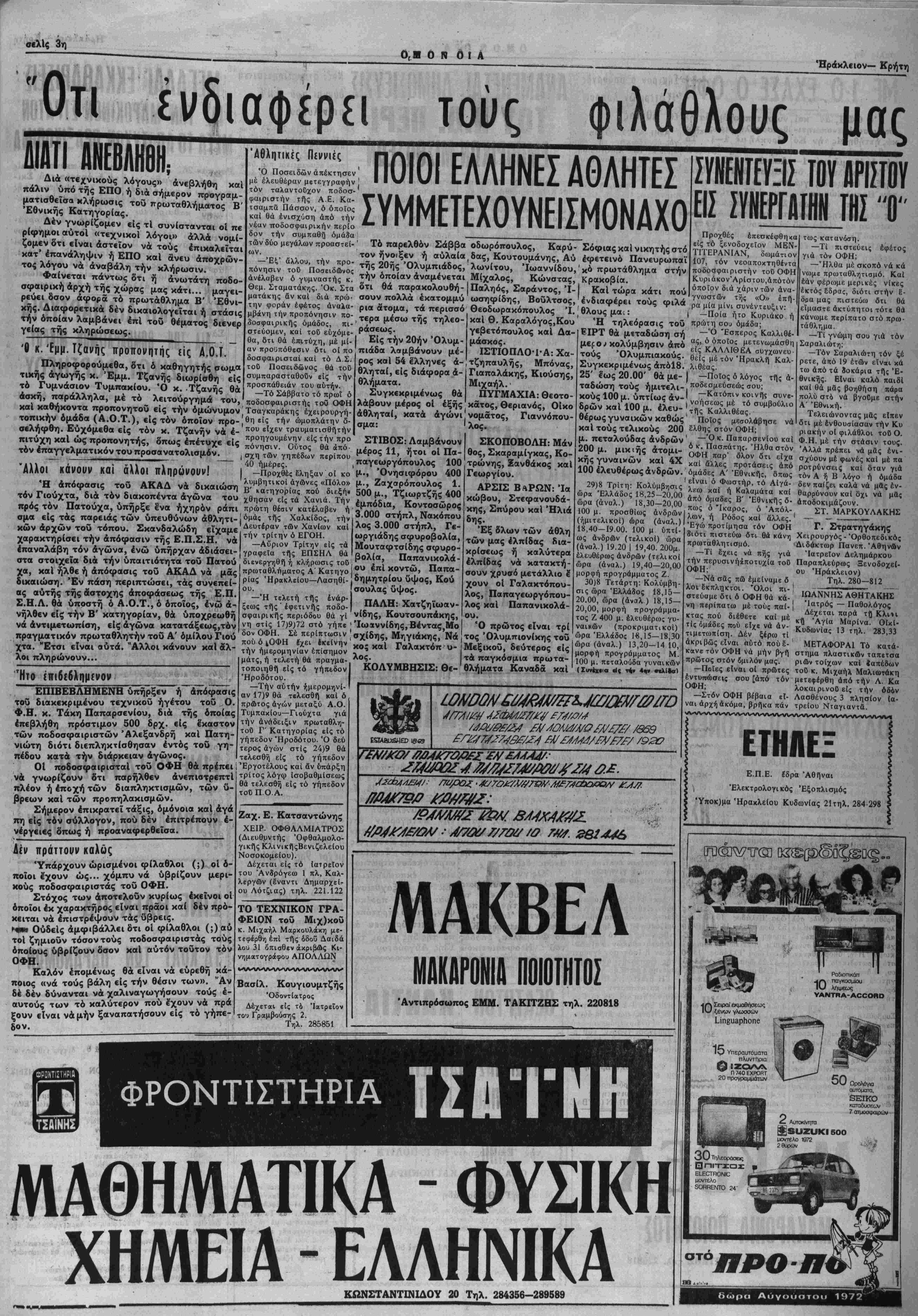 σπέραν έ<άστηςΚυριακής υ¬ πό τής εφημερίδος μας. Μι- σθός Ικανοποιητικός. ΝΕΑ ΤΡΟΠΗ ίΙΟ 6ΕΜΑ ΤΟΗΠΟΔΟΣΦΑΙΡΙΣΪΟΗ ΠΟΥ ΠΗΡΕ Ο Ο.Φ.Η. Νέα /τροπή παίρνει Φ.Η. δέν κατήρχοντο τό θέμα τής άναγκα- νάάγωνισθοθνμαζίτου, στικής μεταγραφήςπο προκειμένου νά< συμ- δοσφαιριστών στόν Ο. πληρωσουν τίς πεντε Φ.Η. Ή ΕΠΟ, πού συμμετοχές των, πού έπελήφθηκε τής υπο προβλέπει ό νόμος.ΚαΙ θέσεως, σέ συνεδρίασι ά* ν διαπιστωθη, οτ ι συμ τοΰ Δ.Σ. της, τό έσπέ βαίνει, πράγματι, αύ- ρας τής Παρασκευής, | τό οί παϊκτες άνήκουν εζήτησε μερικά συμ- στόν ΟΦΗ. Ή Αύστραλία προτείνει νέον ψήφισμα κατά των πυρηνικών δοκιμών Διά μίαν άκόμη φοράν ή Αΰστραλία κατέστησενγνω στήν την άντίθεσίν της πρός τάς πυρηνικάς έκρή- ξεις είς την ατμόσφαιραν. Κατά την διάρκειαν τής τετάρττις συνόδουτής Επι τροπής δα ΐήν Ειρηνικήν Χρησιμοποίησιν των Βυ θών είς την Γενεύην, ή Αύ βτραλία επρότεινεν, όμοϋ μετ' άλλων χωρών, την συν τάξιν ψηφίσματος, διά τοθ όποίου διακηρύσσεται, 6· τι δέν πρέπει νά συνεχι- σθοΰν αί δοκιμαί δπλων, πού δύνανται νά συμβά- λουν είς την περαιτέρω μό λυνσιν τής άίμοσφαίρας. Βασίλειον τής Ελλάδος Κοινότης Μεγ. Βρύσης ΔΙΑΚΗΡΥΖΙΖ πληρωματικάστοιχεΐα, την Ε.Π.Σ.Η.γιά δώ η άό η γ νά εκδώση την άπό- φασί της. Συγκεκριμένα, ή Ε ΠΟ εζήτησε νά πλη- ροφορηθή, α"ν πράγμα τι οί άντίπαλοι τοΰ Ο. Έν τώ μεταξύ,πλη Τό Κοινοτικόν Συμβού λιον Μεγάλης— ΒρύσηςΜο ροφορούμαστε, δτι τό- νΟφαΛτσ^ σον ο Ήρόδοτος, δ- σονκαίό Έργοτέλης θά προσφύγουν στό Α δι' ένφραγ ΚΑΔ, εάν δέν έ ττα ν έλ¬ θουν οί παϊκτες στούς συλλόγους των. ΑΘΗΝΑΙ 27-ΤόθέματοΟ Ν Δ «περί μισθώσεων κα- ταστημάτων» ίύρίσκεται είς τό τελευταίον αυτού στάδιον, έπίκεινται δέ σχε τικοΐ έπ' αύτοϋ άνακοινώ- σεις άπό επισήμου κυβερ νητικής πλευρδς. Συγκεκριμένως, εγνώσθη δτι έντός των προσεχών ημερών θά προβούν είς άνα κοινώσεις ό άντιπρόεδρος τής κυβερνήσεως κ. Ν. Μα καρέζος καί 6 ύπουργός τής Δικαιοσύνης κ. Α. Τσουκαλδς είς πραγματο- ποιουμένην συνέντευξιν Τύπου. Και' άλλας πληροφορί¬ ας, ό πρός δημοσίευσιν τό μος διαφέρει κατά βάσιν τοθ δημοσιευθέντος καί συζητηθέντος είς την Συμ- βουλευτικήν επιτροπήν' σχεδίου, ώστε ούσιαστικώς νά πρόκειται περί εντελώς" νέας νομοθετικής ρυθμίσε- ως τοϋ θέματος. Ό νόμος κατηρτίσθη υπό τοθ ίδίου τοϋ δπουργοθ Δικαιοσό· ν ής. Έξ 6λλου εγνώσθη δτι είς τό νέον Ν Δ άπαλείφον- ται δλαι αί διατάξεις περί άποζημιώσεως τοθ μισθω- τοϋ είς περίπτωσιν άποβο λής τού έκ τοθ μισθίου λόγω παρεμβάσεως τρί- του. Έπίσης διαφοροποι- εΐται τό άρθρον 22 ώστε σχεδόν νά μηδενίζεται ή προστασία των παλαιών μι σθωτών. Διά μισθώσεις δεκαετοθς διαρκείας προβλέπεται δυ νατότης καταγγελίας υπό τοθ ίδιοκτήτου άντί των 3 έτών πού προέβλεπε τό σχέδιον έντός 6 μηνών ά¬ πό τής δημοσιεύσεως τοθ νόμου, ώς τελικως διεμορ- φώθη, επί τή βάσει μισθώ- ματος εθθυγραμμισμένου είς την προσφοράν τρίτου. ΦΛΕΓΟΝΤΑΙ ΤΑ ΠΕΡΙΧΩΡΔ ΤΗΣ ΜΟΣΧΑΣ ΟΛΥΜΠΙΛΚΟΙ ΔΓΩΝΕΣ (Συνέχεια έκ τής 3ης σελ.) (τελικοί) ώρα (άναλ.) 18, 30—18,40, 4X100 μ. έλευ- θέρως γυναικών (τελικοί) ώρα (άναλ.) 18,40-19.00. 400μ. άτομικόμικτό άν- δρών (τελικός) ώρα (άναλ. 19,00-19,20, μορφή προ- γράμματος Ζ. 30)7 Πέμπτη: Στίβος προ κριματικοί) ώρα Ελλάδος Ιδρύθη νέο ποδοσφαιρικό σωματεϊο] Πληροφορούμαστε, δτι ί- δρύθηκε ποδοσφαιρικός σύλ λογοο, υπό την έπωνυμία «Α.Ο. ΤόΔειλινόν», πού £- χει έδρα τόν όμώνυμο συνοι κισμό. "Ηδη, ύποβλήθηκαν, στό Πρωτοδικεϊο ΉρακλΓ.ί- ου, τα άπαιτούμενα δικαιολο γητικά καί τό πρακτικό /Ι¬ δρύσεως τοθ Σωματείου, γιά την ά