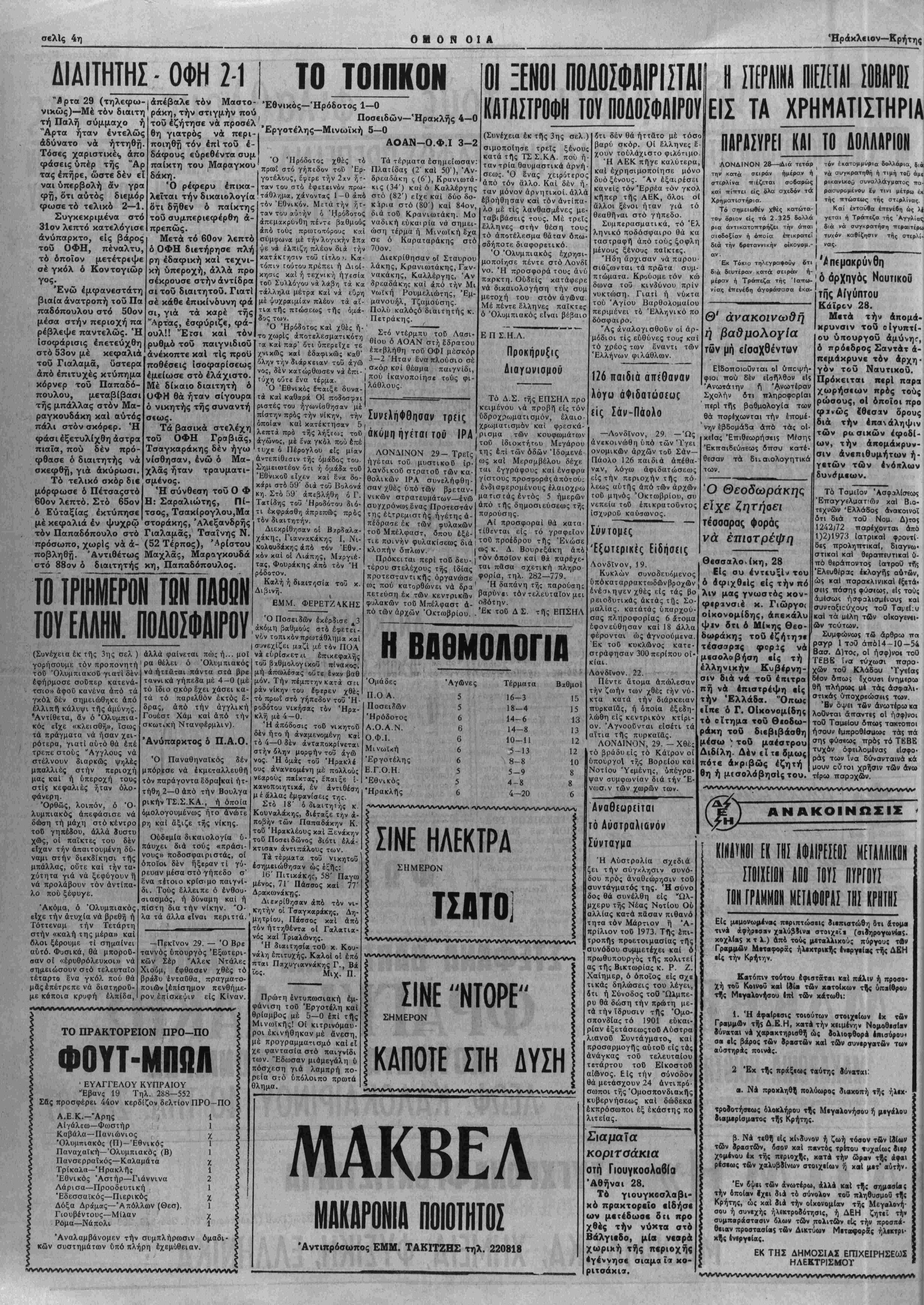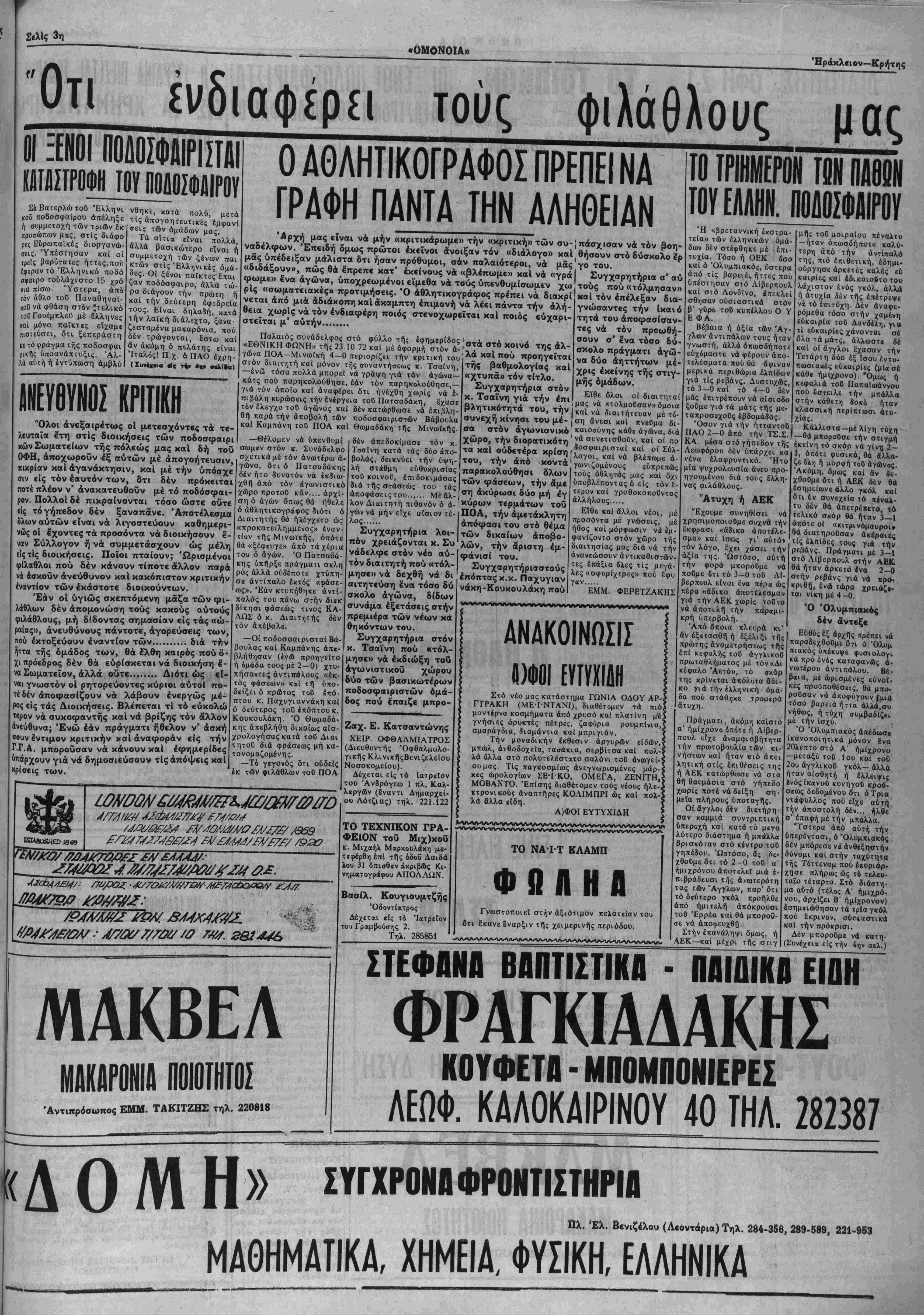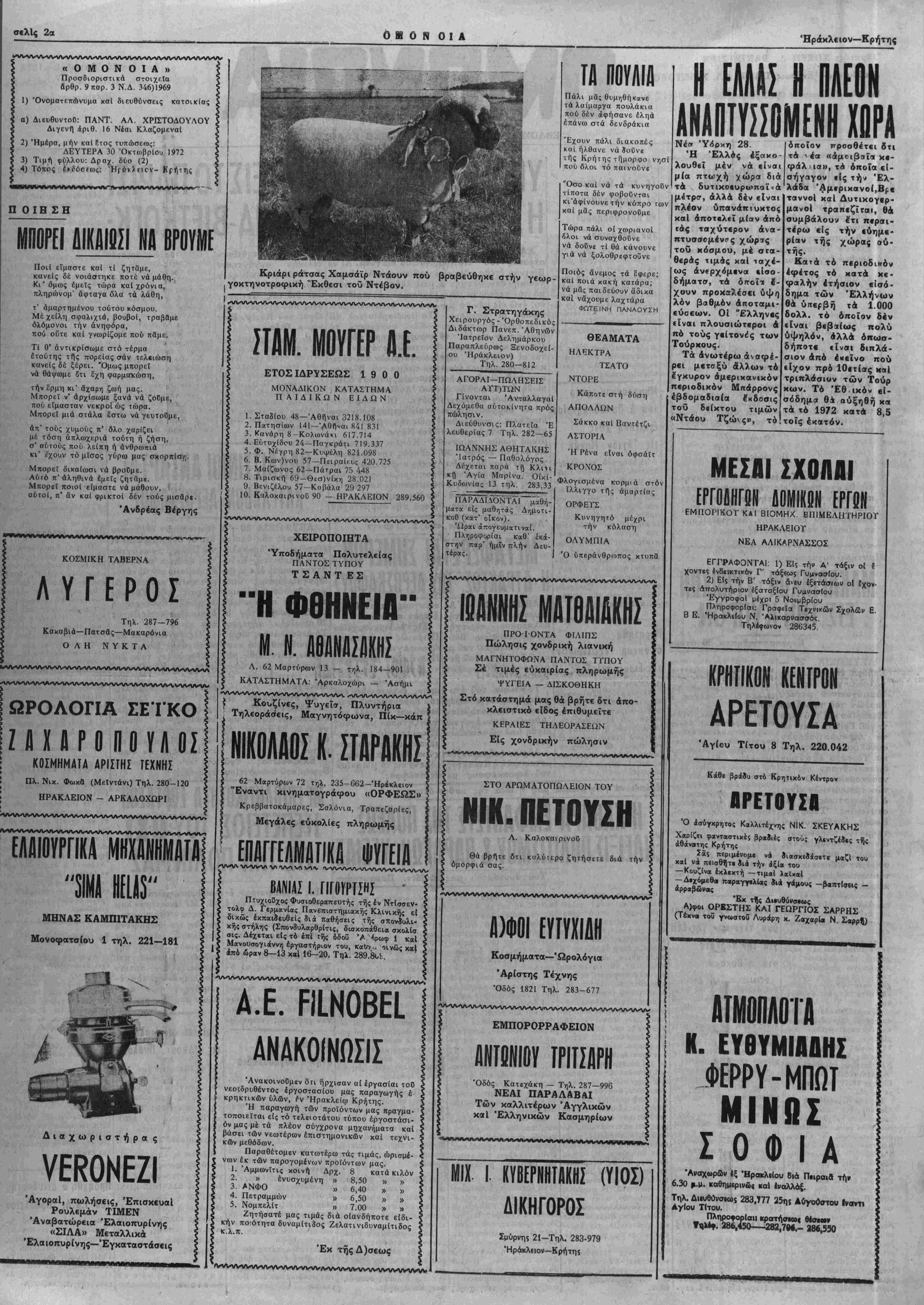 φ χ. Γιώργο< οίκονομίδης, άπβκάλυ ψΐν δτι ό _(ί«ης Θεο- δωράκη; τοθ Λναθίορπται τό Λύστραλιανόν Σύνταγμα Ή Αύστραλία σχεδιά ζει την σύγκλησιν συνό- δου πρός αναθεώρησιν τοθ συντάγματός της. Ή σύνο δος θά συνέλθη είς "Ωλ- μχερυ τής Νέας Νοτίου Ού αλλίας κατά πασάν πιθανό τητα τόν Μάρτιον ή Α¬ πρίλιον τοϋ 1973. Τής επι¬ τροπήν προετοιμασίας τής συνόδου συμμετέχει καί 6 πρωθυπουργός τής πολιτεί άς τής Βικτωρίας κ. Ρ. Ζ. Χαίημερ, ό οποίος είς σχε τικάς δηλώσεις τού λέγει, 6τι ή Σύνοδος τοθ Ώλμπε- ρυ θά δώση την πρώτη με¬ τά την ίδρυσιν τής Όμο- σπονδίας τό 1901 ευκαι¬ ρίαν έςετάσεωςτοϋ Αυστρα λιανοΰ Συντάγματο^ καί προσαρμογής αύΐοϋ είς τάς ανάγκας τοϋ τελευταίου τετάρτου τοθ ΕίκοστοΟ αίΛνος. Είς την σύνοδον θά μετάσχουν 24 άντιπρό· σωποι τής Όμοσπονδιακής κυβερνήσεως καί δώδεκα έκπρόσωποι έξ έκάστης πό λιτείας. ΓιαμαΤα κοριτοάκια στή Γιουγκοσλαβία Αθήναι 28. Τό γιουγκοσλαβι- κό πρακτορβϊο ·1δήσ· ών μ«τέδωο« δα προ χθ*ς την νύκτα στό Βάλγι·δο, μ(α νιαρά χωρική τής πίριοχής άγέννησβ σιαμα ϊοι κο- ριτσάκιβ. τέσσαρας <ρορ!ς νά μβσολοβήση αίς τή ελληνικήν Κυβέρνη¬ σιν διά νά τοθ £κιτρα πή νά επιστρέψη ·1ς την Έλλάδα. Όπως • ΪΚ6 δ Γ. Οίκονομίδης τό ο ι τη μοί τοθ θεοδω- ράκη τοθ δΐ€βιβάσθη μέσω ^ τοθ μαέστρου Διδίλη. Δέν €Ϊ τ· δμως πότβ ακριβώς έζητή θη ή μισολσβησίςτου. τόν έκατομμύρΐα δολλάρια, διά νά συγκρατηθή ή τιμή τοθ άμι ρικανΐκού συναλλάγματος πα- ρασυρομένου εν τινι μέτρ» έκ τής πτώσεως τής στερλίνας Καί ενταύθα έπενέβη ώς λ* γεται ή Τραπέζα τής Αγγλίας διά νά συγκροτήση περαιτέρω τυχόν καθίζησιν τής στερλί¬ νας. '/πί μακρυνθή ό άρχηγός Ναυτικοϋ της Αίγύπτου Κάϊρον 28. Μβτά την Απομά¬ κρυνσιν τοθ οίγυπτί- ου ύπουργοϋ αμύνης, ό ιτρόσδρος Σαντάτ ά- πΐμάκρυνε τόν Αρχη¬ γόν τού Ναυτικοΰ. Πρόκειται πΐρί ηαρα χωρήσεων πρός τούς ρώσους, οί όποϊοι προ φχνως είθισαν δρους διά την έποηάληψιν των ρασικών έφοδί- ων, την απομάκρυν¬ σιν άνΐηιθυμήτων ή·] γβτών των ένόπλων δυνσμβων. Τό Ταμεϊου Άσφαλίσΐως Έπαγγελματιώι; καΐ Βιθ- τεχνών Ελλάδος Ανακοινοί ότι διά τοθ Νομ. Δ)τος 1242;72 παρέχονται άπό 1)2)1973 ΙατρικαΙ φροντί- δες προληπτικαΙ, διαγνω· στικαΐ καΐ θεραπευτικαΐ υ¬ πό θεράττοντος ίατροθ ττίς Ελευθέρας έκλογής αυτών, ώς καΐ παρακλινικαί ίξετά» σε»ς πάσης φύσιω?, είς τού; άαεσως ήσφαλισμέιους καΐ /νταξιούχους τοθ Ταΐ'εΐ.υ καΐ τα υελη των οΐκογενει· ών τούτων. Συμφώνως τω άρθρω πά ραγρ 1 τοΰ απόϊ4-10-54 Βασ. Δ)το<, οί ήσφ)νοι τοθ ΤεΒΕϋ ίνα τύχωσι πσρο· χών τοθ Κλάδου 'ΤγίΙας δέον ότΐως ίχουσι ένημερω πλήρους μ4 τάς άσφαλι· στΐχάς ύποχρϊώσβις των. 'Βν όψει των ανωτέρω κα λοθνται άτταντες οί ήσφ)νοι τοθ Τσμείου όπως τακτοποι ήσουν έμπροθέσιιως τάς πά σης φύσβοος πρός τό ΤΕΒΕ τυχόν όφειλομένας είσφο- ράς των Ινα δι>νανταινά κά