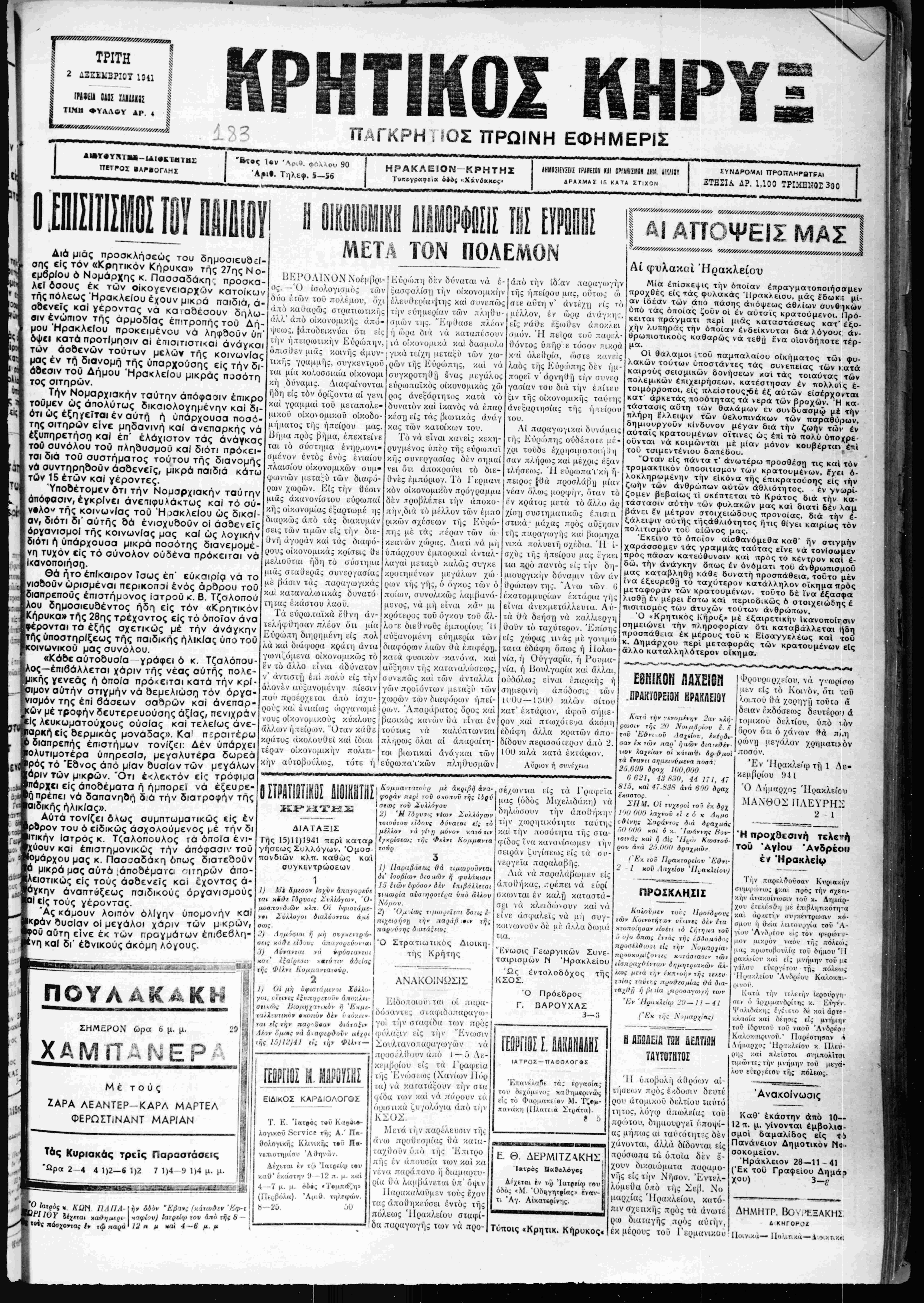 τού συνόλου τού πλησυσμοϋ καί διότι πρό<ει- ται διά τού συστήματος τούτου τής διανομής νά συντηρησούν άσδενεϊς, μικρά παιδία κάτω των 15 έτών καί γέροντες. Υποθέτομεν ότι την Νομαρχιακώ ταύτην απόφασιν, έγκρίνει άνετιφυ*ά<τως καί τό σύ- ν·λο* τής κοινωνίας τού Ή ;ακλείου ώς δικαί¬ αν, διότι δι* αυτής σά ένισχυσούν οί άσ5εεϊς όργανισμοί τής κοινωνίας μας καί ώς λογικήν διότι ή ύπάρχουσα μικρά ποσότης διανεμομέ- νη τυχόν είς τό σύνολον ουδένα πρόκειται νά ίκανοποιήση. Θά ήτο επίκαιρον ϊσως έπ' εύκαιρία νά το νισοούν ωρισμέναι περικοποί ενός άρσρου τού διαπρεπούς έπιστήμ^νος ίατρού κ. Β. Τζαλοπού λου δημοσιευθέντος ήδη είς τόν «Κρητικόν Κήρυκα» τής 28ης τρέχοντος είς τό οποίον άνα φέρονται τα εξής σχετικώς μέ την ανάγκην τής υποστηρίξεως τής παιδικής ήλικίας υπο τού οινωνικού μας συνόλου. «Κάοε αύτοδυσία γράφει ό κ. Τζαλόπου- λος—έπιβάλλεται χάριν τής νέας αυτής πολε- μικής γενεάς ή όποία πρόχειται κατά την κρί¬ σιμον αυτήν στιγμήν νά οεμελιώση τόν οργα¬ νισμόν της επί βάσεων σα^ρών καί άνεπαρ- ών μέ τροφήν δευτερευούσης άξίας, πενιχράν ίς λευκωματούχους θυσίας καί τελείως άνε- αρκήείς σερμικάς μοναδας». Κα! π-:ραιτέρω ► διαπρεπής έπιστήυων τονίζα: Δέν ύπάρχει ολυτιμοτέρα ύπηρεσίσ, μεγαλυτέρα δωρεά ρός τό "Εδνος άπό μίαν δυσίον των μεγάλων άριν των μακρών. "Οτι εκλεκτόν είς τρόφιμα πάρχει είς άποσέματα ή ημπορεί νά εξευρε¬ θή πρέπει νά δαπανηδή δ α την διατροφήν τής ^ιδικής ήλικίας». Αύτά τονίζει ΟΛως συμπτωματικώς είς έν ρ&ρον τού ό ειδικώς άσχοΛούμενος μέ την δι ιτικήν ΐατρός κ. Τζαλοπουλος τα όποϊσ ένι- χύουν καί επιστημονικώς την απόφασιν τού μάρχου μας κ. Πασααδά<η όπως διατεδοϋν μικρά μας αύτά ,άποοέματο. ·Ίτηρών άπο- ειστικώς είς τούς άσσενέϊς καΐ έχοντος ά- κην άναπτόξεως παιδικούς όργανισμοΰς €ίς τούς γεροντας. "Ας κάμουν λοιπόν όλίγην υπομονήν καΐ κράν θυσίαν οί μεγάλοι χαριν των μ κρών, ου αύτη είνε έ< των πραγμάτων έπιβεβλη- νη καί δι' έσνικούς άκόμη Λό,Όυς. ίίΐ ΜΕΤΑ ΤΟΝ ΠΟΛΕΜΟΝ ΠΟΥΛΑΚΆΚΗ ώρα 6 μ. μ. Χ. Μ έ τούς ΖΑΡΑ ΛΕΑΝΤΕΡ-ΚΑΡΛ ΜΑΡΤΕΛ ΦΕΡΩΣΤιΝΑΝΤ ΜΑΡίΑΝ Τάς Κυριακάς τρείς Παραστάσεΐς "Ωρα 2 4 4 1)2—6 1)2 7 1)4 9 1)4 μ. μ. ο;. -Ό ισολογισμόν χών δύο ι'των τοΰ πολέμου, ό/ι >ίτο καθαρώς στρατιωτική::