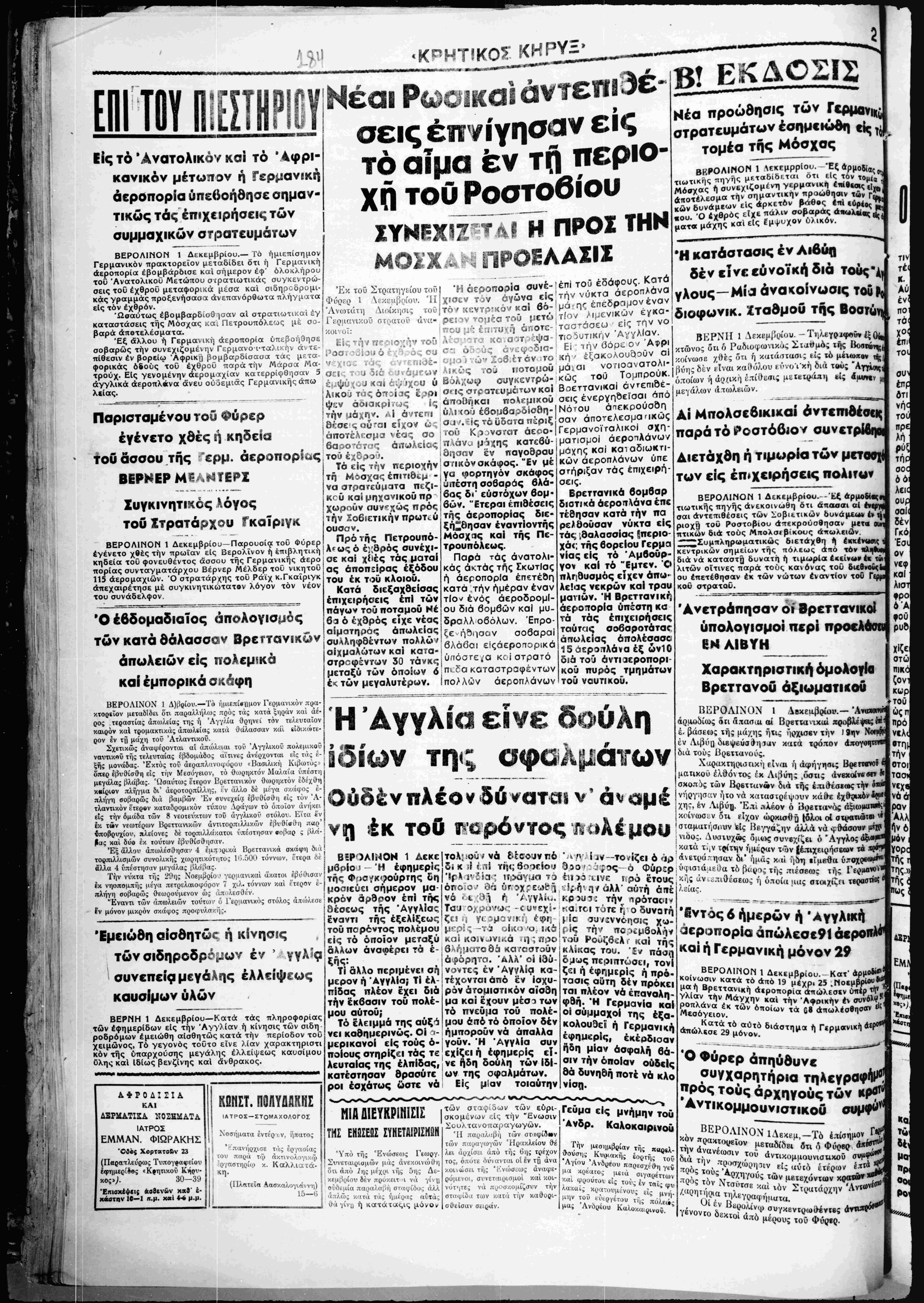 τπ Μ^σχαςέπιτιΘί,μ -(Υ<3 φορτηγόν σκάφος .ϊ^νοίατ άεο .. , ., /ι# μίχης κατεβύ- ματισμσι αερσιΑάνω/ να στρατευΜαιτα πεζι- κγιϊ καί μηχανικού πρ φρη υπέστη σοβαράς 6λά- 6ος δΓ εύστόχων 6ομ χωρούν αυν«·χώς πρός)δών. "Ετεραι έπιθέσεις την Σοβιετικήν πρωτ,ύ τής σεροπορίας *■«- ουσαν. ΒΕΡΟΛΙΝΟΝ 1 Δεκεμβρίου-Παρουσία τοθ Φύρερ 1|ΡΟ, ΤΠζ ΠετροϋΠΟ- εγένετο χθές την πρωΐαν είς Βερολινον ή έπιβλητική Α^θς Ο ε^ορος συνεχΐ- κηδεία τοϋ φονευθέντος άσσου τής Γερμανικής άερο Ι σε καί χί»ές τάς ματαί πορίας συντανματάρχου Βέρνερ Μέλδερ τού νικητοθ ος αποπείρας έξ05θΙΙ 115 άερομαχιών. Ό στρατάρ<ης τοϋ Ράϊχ κ.Γκαϊριγκ Του έκ Ίο^ κχθ1θϋ· άπεχαιρέτησε μέ συγκινητικωτατον λόγον τόν νέον ιταΤ*_ αΐεΕαν&είοαΓ τού συνάδελφον. , ινστα οιει^αχσΐίΐνας έπιχειρήσεις επ! των πόγων τού ποταμοϋ Νέ 6 εχθράς είχε νεας απωλείας Ό έβδομαδιαΐος απολογισμός των κατά θάλασσαν Βρεττονικών άπωλειώνεις ϊϊοΑεμ,κά καίέμπορικάσί< ξή^Θησαν έναντίοντής Μόσχας και τής Πε- τρουπόλεως. Παρά τάς άνατολι- κάς ακτάς τής ΣκωτΙας ή άεροπορία επετέθη κατά την ημέραν έναν τΐο^ ενός άεροδοομΙ- ου διά βομβών καΐ μυ- δρσλλ οβόλων. Έπρο- ςε ηχισαν σοβαραί βλάθαι ε'ςάερο^ορ^κά στροφέντων 30 τάνκς|ύαοσΓε·'α ««ίστρατό μετσξύ των οποίων 6 Πι ? ο καταστραφέντων έ< των μεγαλυτέραν. ίπο>λών άεροπΑάνων