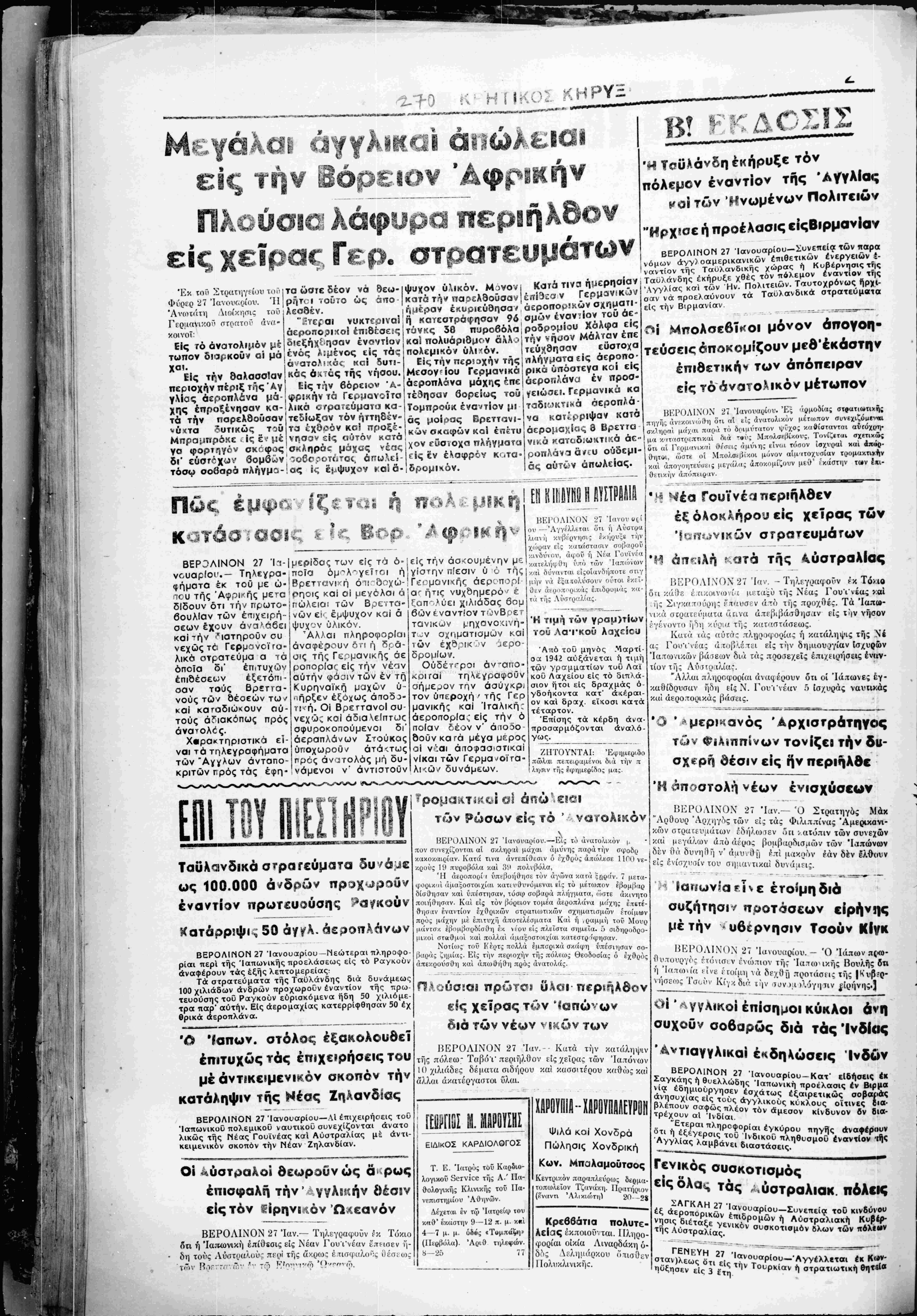καί απογο,ιτενοΗς με/<ί/ας άποκομίςουν μεθ »κάστην των έκι- Οετινην απ«'»π Ή τιμ^ι των γραμ)τίον τού Λατκοΰ ί Άιιό τού μηνός Μάρτι¬ ον 1942 αύξάνεται ή τιμη των γρ^μμ^τίων τυθ Λαι κου Λαχείου είο τό διπλά- σιον ήτοι είς δραχμάς ό γδοήκοντοκ κατ' ακέραι¬ ον και δραχ είκοσι κατά τέταρτον. 'Επίσης τα κέρδη άνα· προσαρμόζονται αναλό¬ γως. ΖΙΠΌΥΝΤΑΙ Έφηιιεριδο πώλαι τετι.ιραμέοι διά την ι ληοιΛ' της ρφημερίοο; μας Ταϋλανδικά στρατευματα ως 100.000 ά*δρών εναντίον πρωτευούσης ^ 50 ά/^λ ΒΕΡΟΛΙΓΗΟΝ 27 Ίανουαρίου—Νεώτεραι πληροφο¬ ρίαι τιερι τής Ίαπωνικής προελάσεως είς τό Ραγκυϋν άναψέρουν τάς εξής λεπτομερείας· Τα στρατευματα τής Ταυλάνδης διά δυνάμεως 100 χιλιάδων άνδρών προχωροΰν εναντίον τής πρω¬ τευούσης τού Ραγκούν ευρισκόμενα ήδη 50 χιλιόμε- τρα παρ' αύτην. Είς άερομαχίας κατερρίφθησαν 50 έχ θρικά αεροπλάνα. Ό Ιαπων, στόλος έξακολουθεΐ επιτυχώς τάς έπιχερρήσεις τού μέ αντικειμενικόν σκοπόν την κατάληψιν τής Νέσς ΖηΑανδίας ΒΕΡΟΛΙΝΟΝ 27 Ίανουαρίου—■ Μ έπιχειρήοεις τού Ίαπωνικυυ πολεμικου ναυτικου συνεχίζονται άνατο λικώς τής Νέας Γουινέας και Αύστραλίας με αντι¬ κειμενικόν σκοπόν την Νέαν Ζηλανδίαν. Οί ^ύστραλοί βεωροΰνώς ά ρως έπισφαλή την1 γγλΕ-ήν βέσβν εις τόν ^ιρηνΐΛΟν Ωκεανόν ΒΕΡΟΛΙΝΟΝ 27 Ίαν.— Τηλί,γραφούν ρκ Τόχιο ότι ή Ία^Μΰνική επίθεσις είς Νέαν Γουι'νέαν ίπασεν Γ|- δη τούς Λύστραλυύ- πιοΐ τής ά'νρω: ι' τιοφ^αλο^ν Οεσ.ω^ τί>ν ?ώσων είς τό '