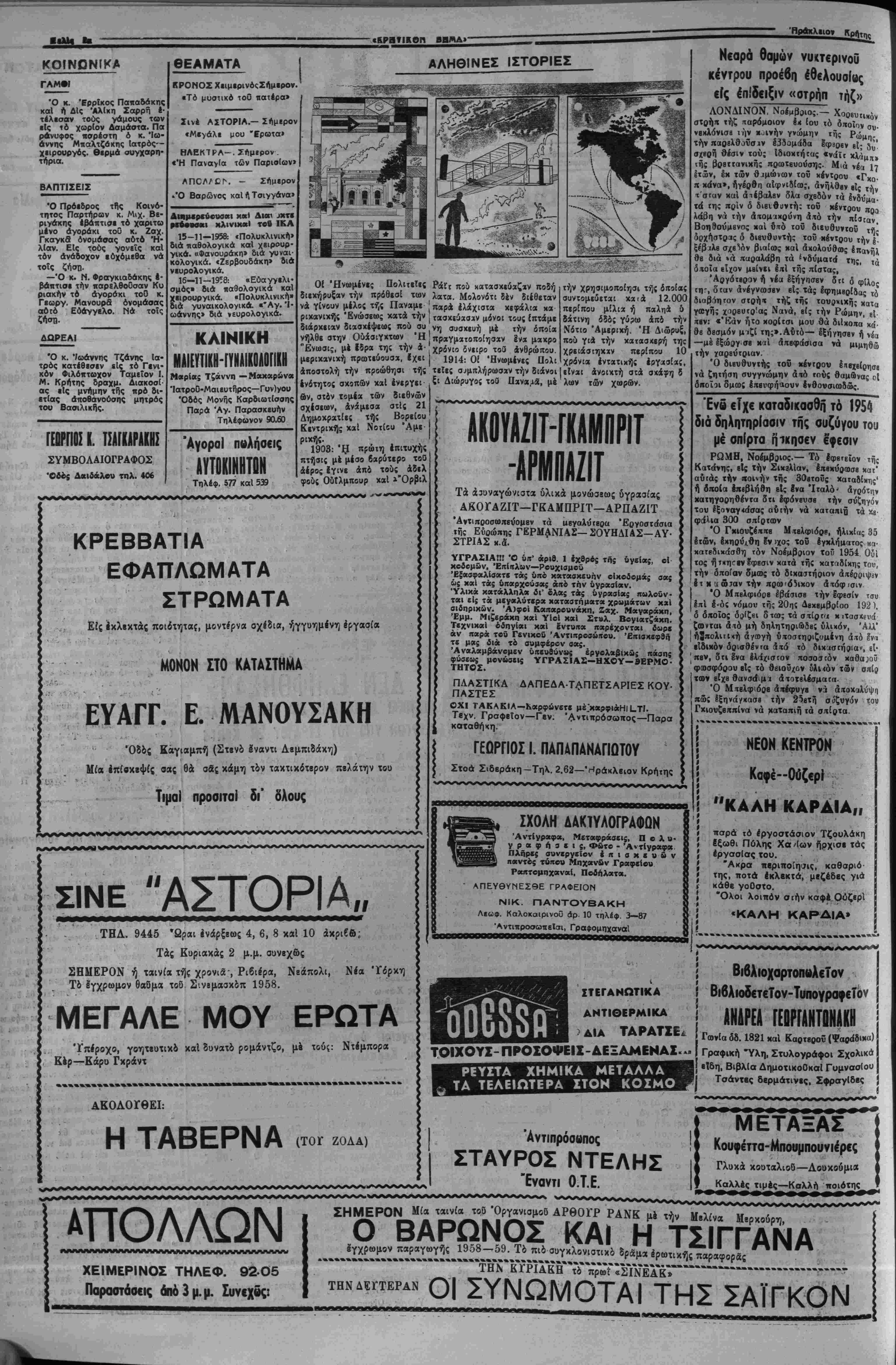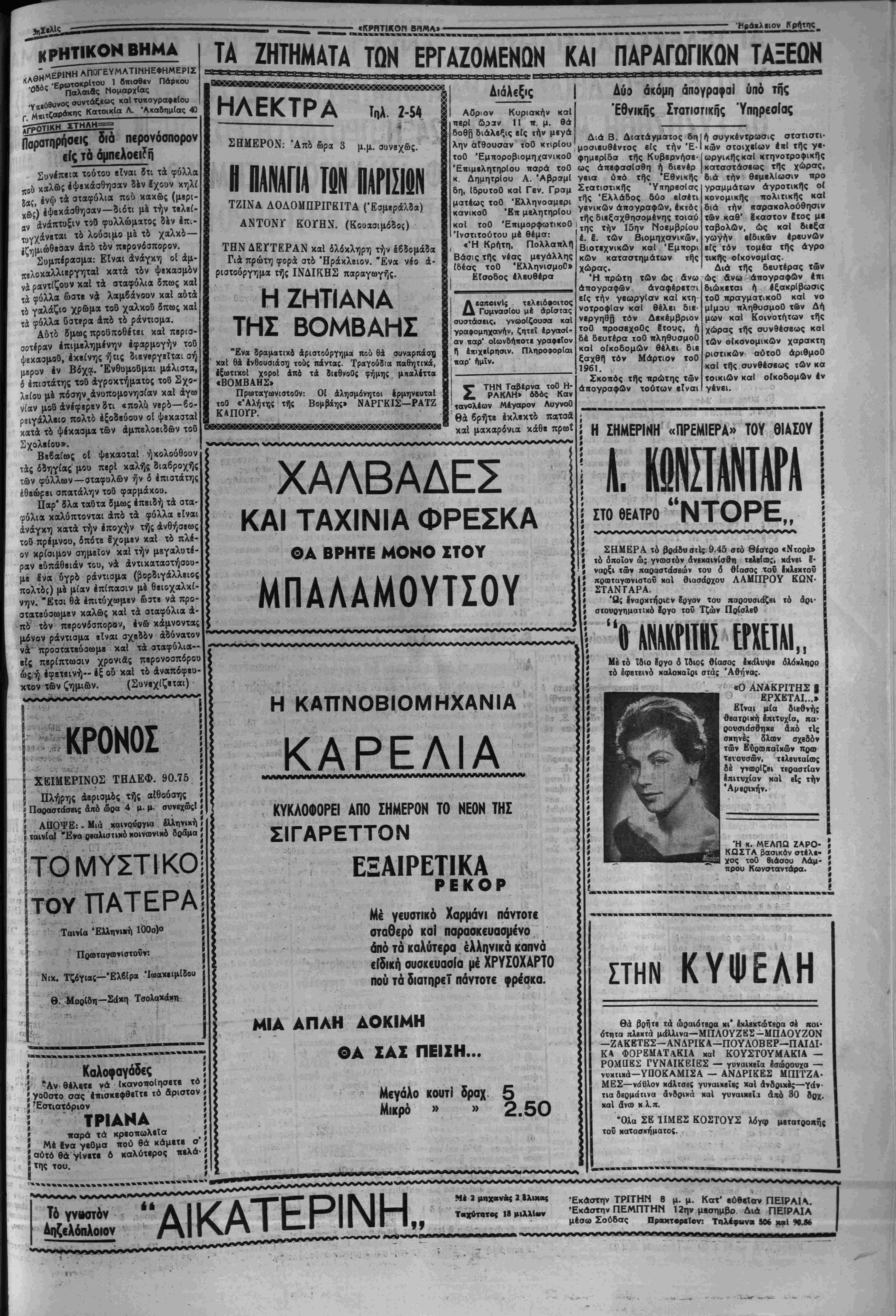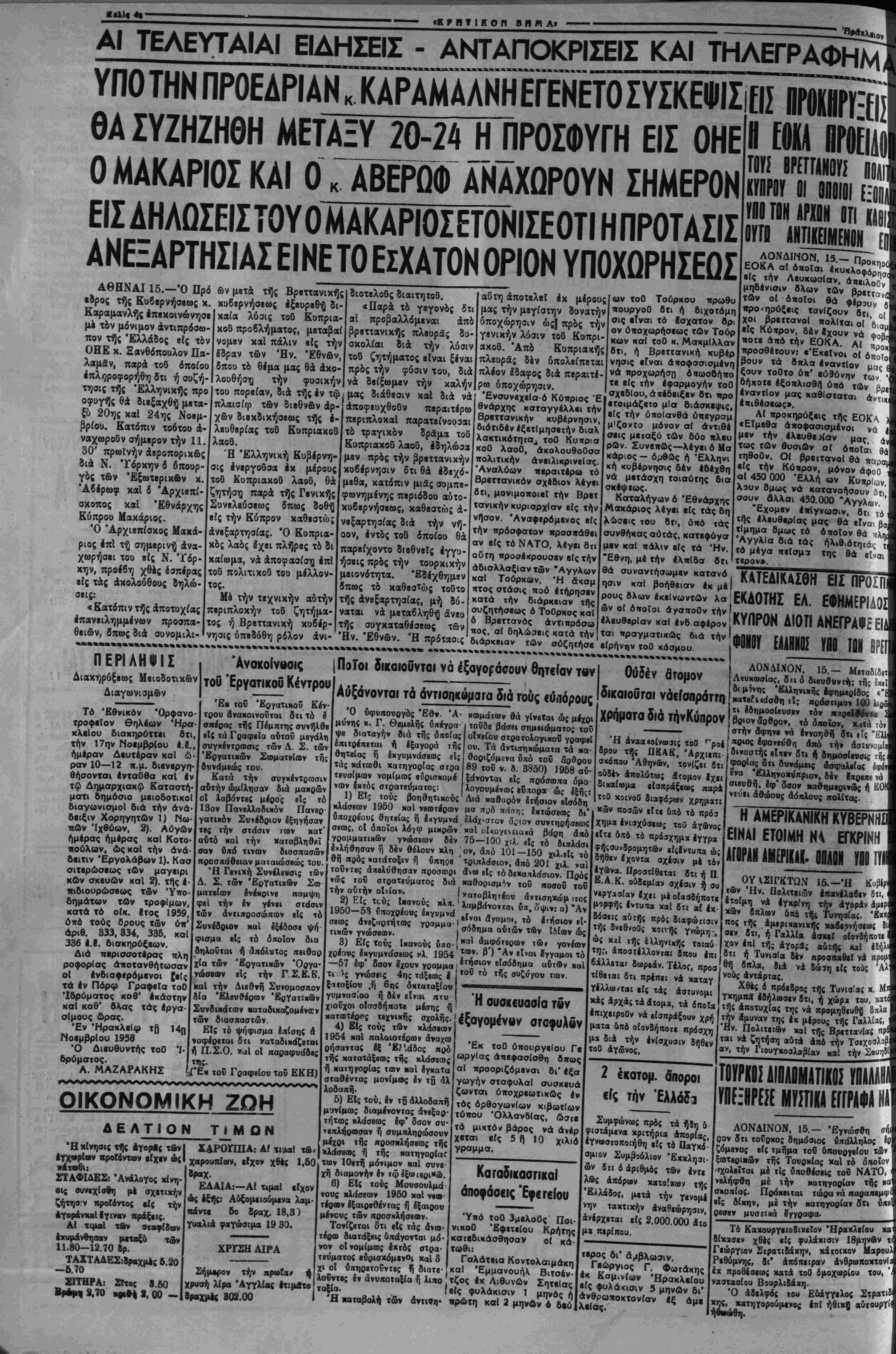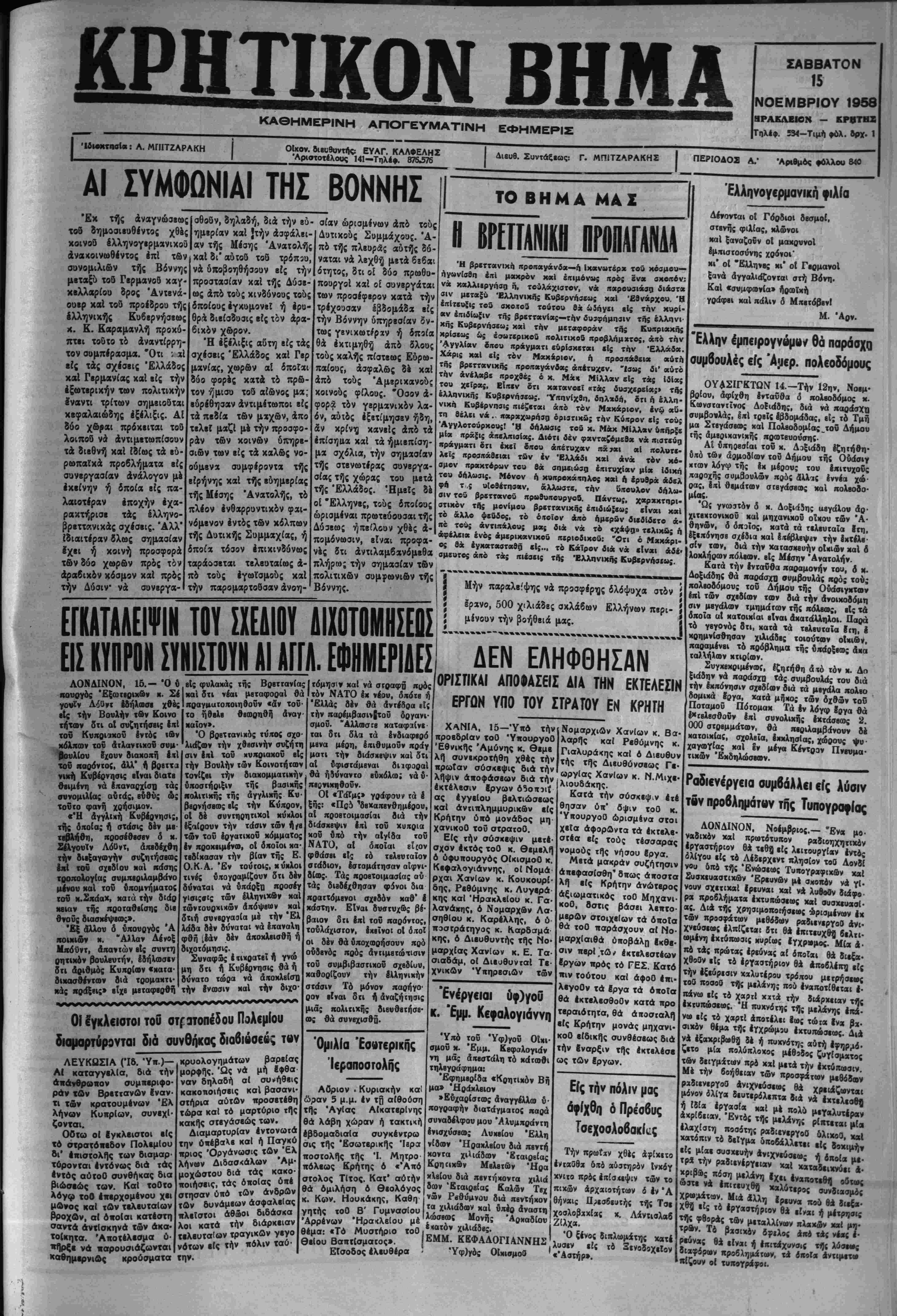 < Ό βρβττανΐχός τυπος σχο· ται δτι δλα τα Ινδιαφερό λιάζων την χθεσινήν συζήτη μβνα μέρη, Ιπιθυμουν πράγ σιν έ/ιί τοΰ κυχριακοϋ βίς ματι την διοΐσκβψιν καί ότι την Βουλήν των Κοινοτήτων α! υφιστάμεναι δηφαραί τονίζβι την διαχομματικήν | θά ηδύναντο ευκόλως νάϋ· δποστήριξιν τή; βασΐχής | πεοηχηθοΰν. "* ΟΙ «Ταΐμς» γριίφουν τα έ Μην παραλείψης νά προσφέρ^ς δλόψυχα στον Ιρανο, 500 χιλιάδες σκλάβων Ελλήνων περι- ___„.__Ι χ μένουν την βοηθεία μας. ΔΕΝ ΕΛΗΦΘΗΣΑΝ ΟΡΙΣΠΚΑΙ ΑΠΟ·ΑΣΕΙΣ ΔΙΑ ΤΗΝ ΕΚΤΕΛΕΣΙΝ ΕΡΓΟΝ ΥΠΟ ΤΟΥ ΣΤΡΑΤΟΥ ΕΝ ΚΡΗΤΗ κολιτιχης τής άγγλιχής Ευ· βερνήσεος είς την Κΰπρον, οί δέ σνντηρητιχοΐ κΰκλοι Ιξαίρουν την τάσιν των ή/β των τοΰ έργατιχοΰ χομματος έν «ροχιιμένα», οί δχοΐοι κα· τεδίκασαν την βίαν τής Ε. Ο.Κ. Α. Έν τούτοις, χύχλοι. τινές ΰΛογραμίζουν δτι δέν Ι _ » ■■«■■ __/■ ξης: ί γριίφουν τα έ δεκαπενθημέοου, ί δά η όϊ προβτοιμασίαι διά την διάσκεψιν επί χοΰ την τού χιιπρια αΐγίδα τοΰ ΝΑΤΟ, αί ό/ιοΐαΐ βϊ(ον φθάσβι είς ώ τελευταίον στάδιον, εσταμάτησαν αιφνι¬ δίως. Τάς ηροβτοιμασίας αύ δύναται νά υπάρξη προσέγ τάς διβδέχθησαν φίνοι δια γΐσιςβΐς των έλΐηνικβν καί κραττόμενοι σχεδόν καθ* έ τωντουρχικών άΐτόψβων χαί ——— »*·— ·-------«■- °* δτιή συνβργασία μέ την "Ελ λάδα δέν δύναται νά έκαναλη φθή ίέάν δέν αποκλεισθή ή διχοτόμησις. , Συναφδς έτιχρατβΐ ή γνω δτι ή Κυβέρνησις θά ή 0 «94 _# — μη δ τι ή Κυβέρησς ή δύνατο τώρα νά άποχλβίστ) την Ινωσιν χαί την διχο- ΟΙ Ιγκλειοιοι τοθ στρτοπέδου Πολ€μίου διαμαρτύρονται διά ουνθηκας διαβιόοεβς τ«ν ΛΕΥΚΩΣΙΛ (Ίδ. 'Υη.)— ΑΙ καταγγελΐα, διά την ά-άνθρο-ον συμηεριφο- ράν των Βρεττανων Εναν¬ τι των κρατουμένων Έλ λήνον Κυπρίων, συνεχί- ζονται. ΟΟτω ο( βγκλειστοι είς τό στρατόιιεδον ΠολεμΙου δι' ικιστολής των διαμσρ· τύρονται εντόνως διά τάς έντός αύτοθ συνθήκας δια βιώσεώς των. Καί τοθτο λόγω τοθ Ικερχομένου χει μ©νος καί των τελευταίον βροχων, αί ό*οίαι κατέστη ------" άντίσκηνά των άκα· α. Άκοτελισμα ύ· —,- νά -σρουσιάζωνται,. _ . καθημερνιος κροόσματα την κρυολογημάτων βαρείσς μορφής. Ώς νά μή 6?θα ναν δηλαδή αί συνήθεις κακοηοιήσεις κσί βασανι· σιήρια αυτών προσετέθη τώρα καί τό μαρτόριο τής κακτΐς στεγάσεώς των. Διαμαρτυρίαν έντονωτά την όιιέβαΧε καί ή Παγκό πριος Όργάνωσις των Έλ λήνων Διδασ<άλων Λμ· μοχώστου διά τάς κακο· ρμβνο σχεδόν καθ χάστην. Είναι δυβτυχβς βέ βαιον δτι επί τον παρόντος, τουλάχιστον, έχιϊνοΐ οί ό,τοί οί δέν θά ύποχαορήσουν πρό ουδενός πρός αντιμετώπισιν τοΰ συμβιβαστιχον σχεδίυυ, χαθορίζουν την ελληνικήν στάσιν Τό μονον παρήγο· ρον είναι δτι ή άναζήΊηοΊς μιδς πολιτικής διβνθβτήσε· ως θά συνεχισθή. ΧΑΝΙΑ, 15—Υπό την προεδρίαν τοθ 'ΥπουργοΟ 'ΕΘνίκης Αμύνης κ. θεμε λή συνεκροτήθη χθές την πρωίαν σόσκεψις διά την λήψιν άποφάσεων διά την εκτέλεσιν δργων Ο5οΐτοιΐ άς έγγείου βελτιώσεως καί άντιπλημμυρικών ε(< Κρήτην υπό μονάδος μη χανικοθ τοΰ στρατοθ. Είς την σύσκεψιν μετέ σχον έκτός τοθ κ. θεμελή ό ύφυπουργός ΟίκισμοΟ κ Κεφολογιάννης, οί Νομά ρχαι Χανίων κ. Κουκουρί δης, Ρεθύμνης κ. Λυγερά κης καί Ηρακλείου κ. Γ α λανάχης, ό Νομάρχην Λα σηθΐου κ. Καρέλλης, ό ύ ποστράτηγος κ. Καρδατμά κης, δ Διευθυντής τής Νο μαρχίας Χανίων κ. Ε. Τα σιαδάμ, ο( Διευθυνταί Τε χνικων Ύπηρεσιων των Όμιλία 'Εθτΐτερικης Ίβραποστολης ΑΟριον . Κυριακήν κα! ώραν 5 μ.μ. έν τη αίθοόση τής Άγίας Αικατερίνης θά λάβη χώραν ή τακτική έβδομαδιαία συγκέντρω σις τής Έσωτερικής Ίβρατ ποσιολής τής Ί. Μητρο πόλεως Κρήτης ό «τΆπό μοχώστου 6ΐα τας; »τ«~