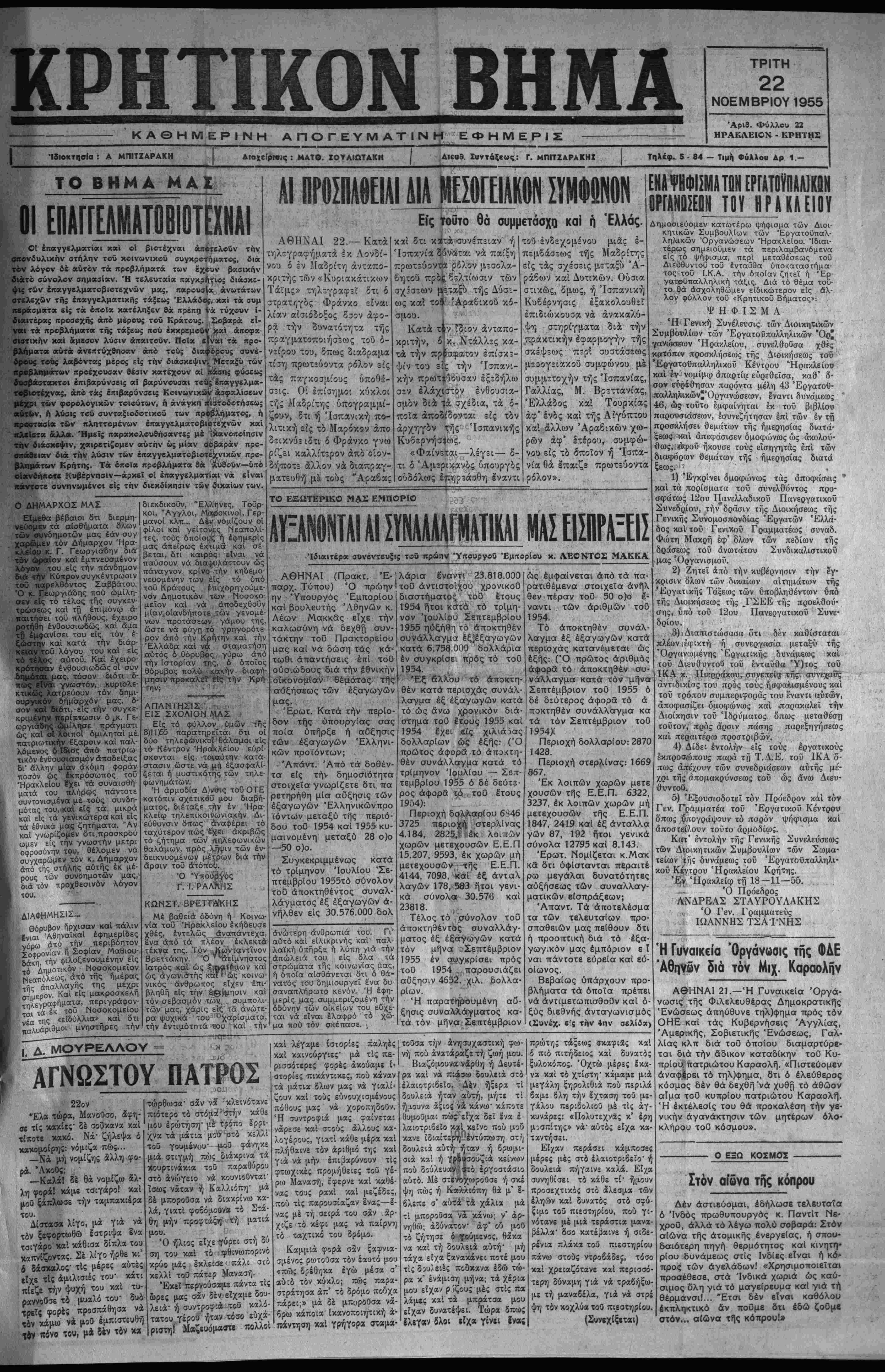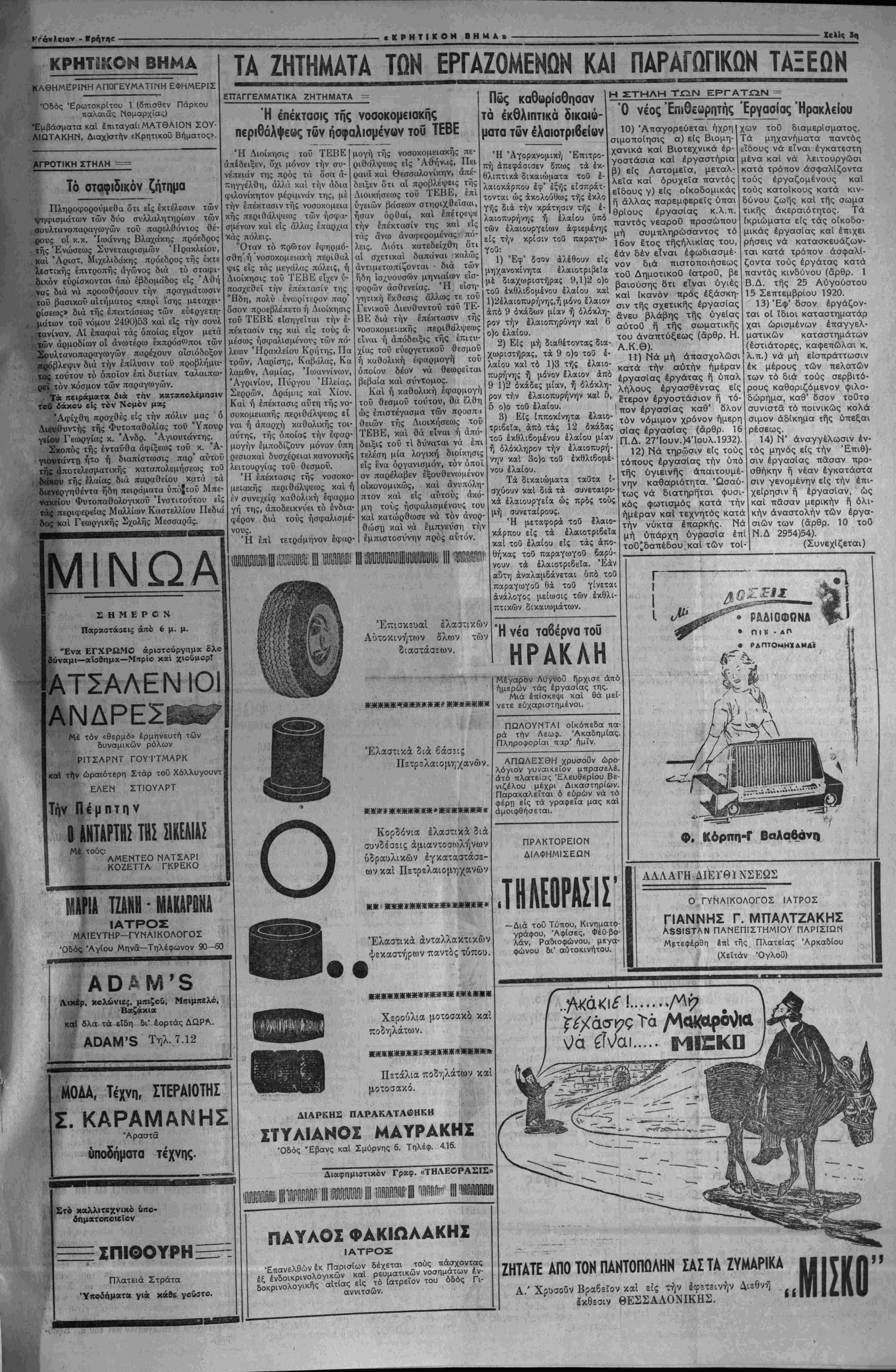 8.50 κατ' <3κάν, Νο 2 δραχμάς 8,60 Νο 1 δρ. 8,80 Ταχτάδες δρχ. 5,00. 2ΓΓΗΡΑ. — ΣΓτος 3,90, ΑΤριθή 3,10 Βρώμη 3.1ΟΣυνεχί σόη άνάλογος άγοραστική κί- ΧΑΡ0ΓΠΙΑ.—Δρχ. 1,70 1.75. ΕΛΑΙΑ.— Επί των έλαι- ολάδων συνεχισθή σχετική ζήτησις Ινώ ή προσφορά ήτο μικρά. Αί τιμαί των δέ είχον ώς έξΐ$ς: Πεντάβαθμα λαμπάντε ορχ. 19.00, τετρά- βαθμα δρχ. 19.20. Τρφαθμα δρχ. 19.40. ΧΡΓΣΉ ΛΙΡΑ Σημερον την πρωΐαν ή χρυσή λίρα Αγγλίας ετιμά¬ το δρχ. 316,50. Ό παραμερισμός μεσιτών άγοραπωλησίας καπνών εσοδείας 1955 ΑΘΗΝΑΙ 22.-Πληροφο¬ ρούμεθα εκ τοϋ ΰπουργείου Έμπορίου ότι άντιμετωπίζε- ται υπό των αρμοδίων ύπη- ρεσιδν τού τό θέμα τοϋ πα- ραμερισμοί5 των μεσιτών κα¬ τά τάς άγοραπωλησία κα¬ πνών εσοδείας 1955. Δέον νά σημειωθή δτι επί χον θέματος τούτου, είχεν εκδοθή πέρυσιν απόφασις τοϋ Ύπουργείου Εμπόριον διά τής οποίας άπαγορεύεται ή καταβολή μεσιτικών δικαιω- μάτων επί άγαραπωλησιών καπνών εσοδείας 1954. χθεσινή Ίερά πανήγυρις Χθές εορτήν των Εϊσοδίων τής Θεοτόκου έπανηγΰρισε δ είς τό προάστιον Άμπελοκή- πους φερώνυμος ίερός Ναός. Την θείαν Λειτουργίαν προ¬ σήλθον καί παρηκολούθησαν πλήθη πιστών καί Ικ τής πό¬ λεως Ηρακλείου εξυπηρετη- θέντες διά των άστικων λεω- φορείων τα δποΐα έπύκνωσαν πρός τοθτο τα δρομολόγιά των. Πνιγμός Την 5.30' απογευματινήν τής προχθές Κυριακής καί ένφ το πετρελαιοκίνητον «Ά- γιος Γεώργιος» επλεε διά ν εξέλθη τοΰ λιμένος μας, έπε¬ σεν είς την θάλασσαν καί έ- πνίγη ό κυβερνήτης αύτοϋ Άντ. Κεφαλοΰκος ή Κατσαν- τώνης. Ένεργοϋνΐαι άνακρί- σεις. υπό των Λιμενικών άρ- χών, δπως εξακριβωθή εάν πρόκειται περί άτυχήματος ή ανΐοκτονίας. 'Η σταυροφορΐα διά την άδικον καταδίκην είς θά¬ νατον τού Κυπρίου πατρι- ώχου Μιχ. Καραολή. εΤ- χεν απόλυτον επιτυχίαν είς την πόλιν μας. Οί συμ πολίται αυθορμήτως προ- σήρχοντο επί τριήμερον είς τούς ναούς τής πόλε- ωςικαί είς άλλα μέρη δπου είχον έγκατασταθί] συνερ- γφα. Προσκόπων καί Όδη ^©ν καϊ ύπογραφον τό σχε τικάν ψήφισμα διαμαρτυ¬ ρίας κατά τής Βρεττανικής Κυβερνήσεως Μ|χρις τής εσπέρας χθές συνεχιζετο είς τα Γραφεί¬ ον Περιφερβιακου Έφόρου Ηρακλείου ή καταμέτρη- σις των ύπογραφών, αί ό- ποΐαι ύπερβαίνουσι, πόλε ως Ηρακλείου καί προά¬ στειον, τάς 23.600 Σημε'ωτέον δτι, είς τάς άνω ύπογρατψάς τοθ ΛαοΟ τής πόλεώς μας δέν συμπε ριλαμβάνονται αί ύπογρα- φαί καί τής ϋτταΐθρου υιτο· λογίζεται δέ ότι είς ολό¬ κληρον τόν νομόν υπέγρα¬ ψαν τό ψήφισμα διαμαρτυ ρίας άνω των 30 030 κατοίκων. Έληξαν τό άπόγευμα χθές αι εργασίαι τής 3ης διασκέψεως τόν Έπαγγελματοβιοτεχνδν Γ, ί / , ,------------ -/Το άπόγευμα χθές έληξαν αί Ιργασία τής αρξαμένης την ΚνρΛΐκήν εις την Ήλέκτραν καί συνεχισθείσης είς τα γρα φεΐα τοϋ ΈπαγγελματικοΟ χαί Βιοτεχνικοϋ Έπιμελητη ρίου ^Ηρακλείου, 3ης Διασκέ¬ ψεως) τής έκτελεστικής Έπι- τροπής τήτ Γενικής Συνομο- σπον^ίας Έπαγγελματιών καί Βιοτέχνών Ελλάδος καί των έκπρ«>σώπων των επαγγελμοτι