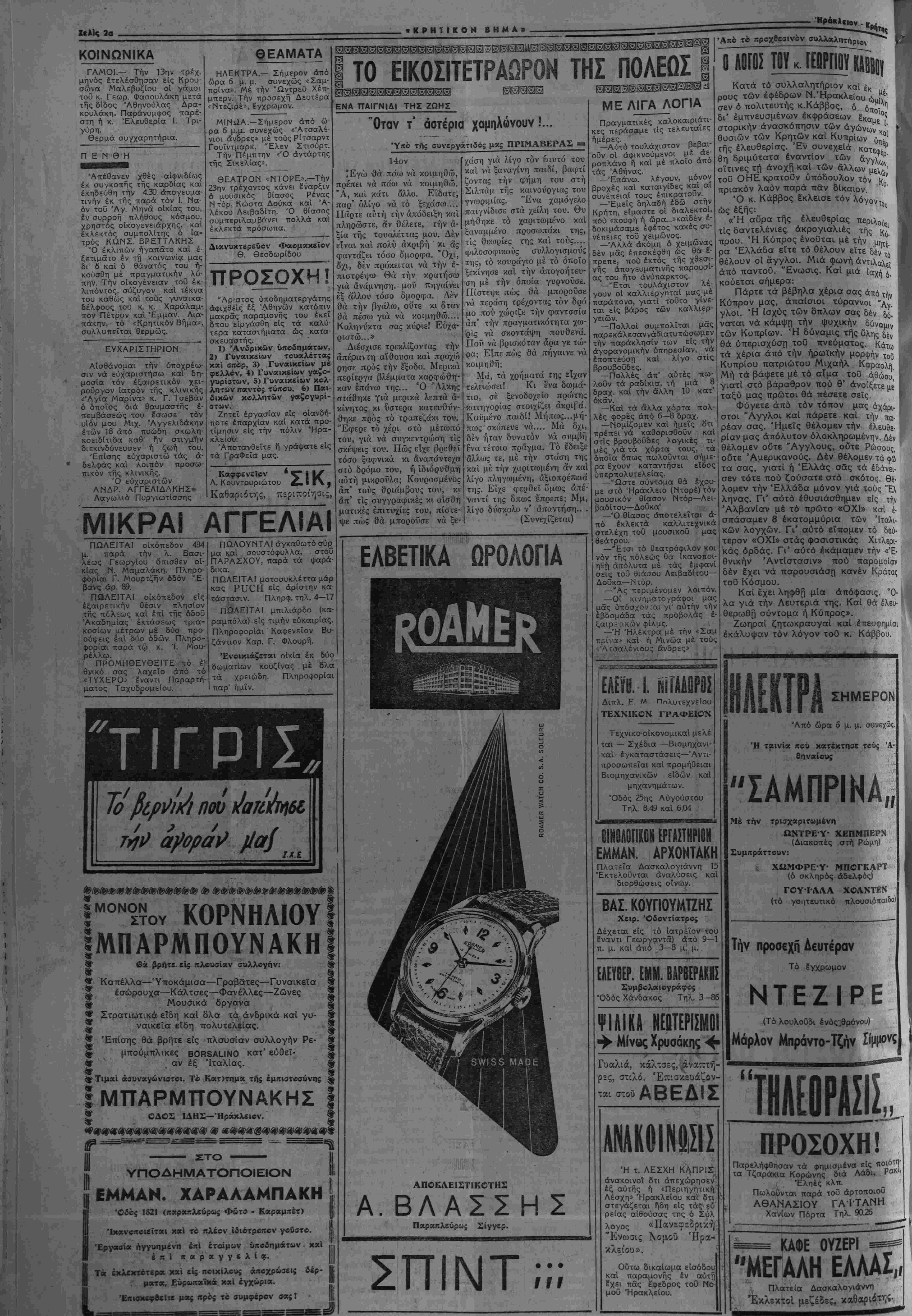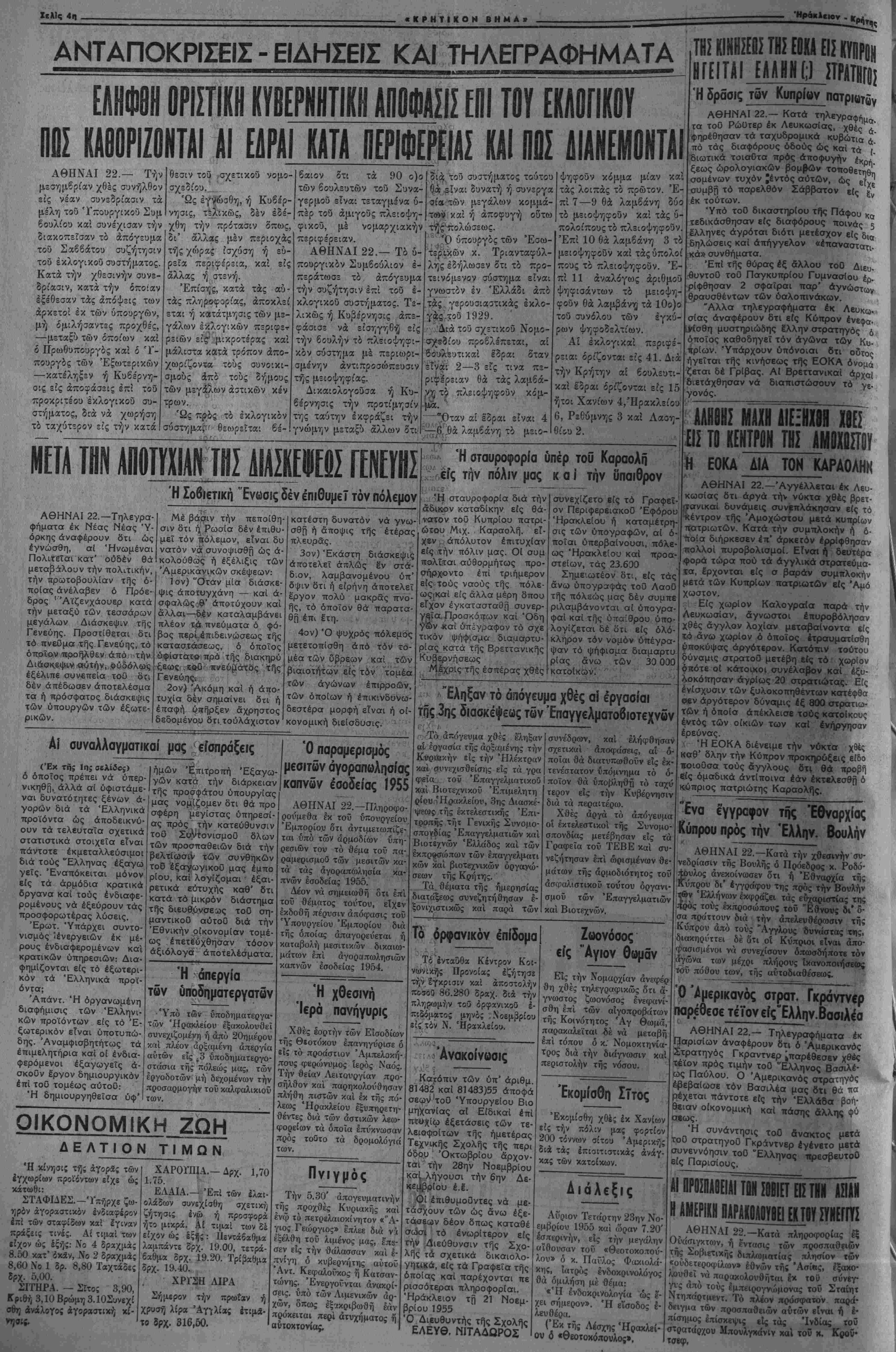 ΑΘΗΝΑΙ 22.— Κατά τηλεγραφήμα< τα τοθ Ρώυτερ έκ Λευκωσίας, χθές ώ" Φηρέθησαν τα ταχυδρομικά κυβώτΐα 0. πό τάς διαφόρους όδούς ώς καί τα {. διωτικά τοιαθτα πρός αποφυγήν £ΚρΑ ξεως ώρολογιακων βομβών τοποθετηθή σομένων τυχόν ^έντός αυτών, ώς ετχε' συμβή τό παρελθόν Σάββατον είς £ν έκ τούτων. Υπό τοθ δικαστηρίου τίς Πάφου κα τεδικάσθησαν είς διαφόρους τιοινάς 5 έλληνες αγρόται διότι μετέσχον είς δια δηλώσεις καί άπήγγελον «έπανασταχι- κά» συνθήματα. Επί τής θύρας έξ αλλου τοθ Διευ¬ θυντού* τοθ Παγκυπρίου Γυμνασίου έρ. ρίφθησαν 2 σφαίραι παρ' άγνώστων θραυσθέντων των ύαλοπινάκων. "Αλλα τηλεγραφήμστα έκ Λευκω¬ σίας άναφέρουν δτι είς Κυπρον ένεφα. ινίσθη μυστηριώδης £λλην στρατηγός 6 οποίος καθοδηγεϊ τόν άγωνα των Κυ· ιϊρίων. 'Υπάρχουν υπόνοιαι δτι οδτος ήγεΐται τής κινήσεως τής ΕΟΚΑ όνομά. ζετσι δέ Γρίβσς. Αί Βρεττανικαί αρχαί διετάχθησαν νά διαπιστώσουν τό γε· γονός. Άϊ ΤΟ ΚΕΝΤΡΟΝ ΤΗΣ ΑΜΟΧΟΣΤΟΥ ΕΟΚΑ ΔΙΑ ΤΟΝ ΚΑΡΑΟΛΗΝ ΑΘΗΝΑΙ 22.—Αγγέλλεται έκ Λευ- κωσίας δτι άργά την νύκτα χθές βρετ¬ τανικαί δυνάμεις συνβπλάκησαν είς τό •κέντρον τής Άμοχώστου μετά κυπρίων πατριωτών. Κατά την συμπλοκήν ή ό- ποία διήρκεσεν έπ' αρκετόν έρρίφθησαν κολλοί πυροβολισμοί. ΕΤνσι ή δευτέρα Φορά τώρα πού τα άγγλικά στρατεύμα- ΐα, ερχονται είς σ βαρότν συμπλοκήν μετά των Κυπρίων πατριωτών είς Άμό χωστον. Είς χωρίον Καλογραίσ παρά την Λευκωσίαν, άγνωστοι έπυροβόλησαν χθές αγγλον λοχίαν μεταβαίνοντα είς •ζό άνω χωρίον ό οποίος έτραυματίσθη ύττοκύψας αργότερον. Κατόπιν τούτου δύναμις στρατοθ μετέβη είς τό χωρίον όπότε οί κάτοι,κοι συνέλαβον καϊ έξο- λοκόπησαν άγρίως 20 στρατιώτας. Είς ενίσχυσιν των ξυλοκοπηθέντων κατέφθα «ν αργότερον δύναμις έξ 800 στρατιώ¬ την ή όποία απέκλεισε τούς κατοίκους έντός των οίκιών των καί ένήργησσν ερεύνας. Ή ΕΟΚΑ διένειμε την νόκτσ χθές καθ' δλην την Κύπρον προκηρύξεις είδο ϊοιοΰσα τούς άγγλους δτι θά προβή ίίς όμαδικά άντίποινα εάν έκτβλεσθπ ° κύπριος πατριώτης Καραολτ)ς. "ίνα έγγραφον τής Έθναρχίας Κύπρου πρός την Έλλην. Βουλήν ΑΘΗΝΑΙ 22.—Κατά την χθεσινήν συ¬ νεδρίασιν τής Βουλής ό Πρόεδρος κ. Ροδό- Λόυλος ανεκοίνωσεν δτι ή Έθναρχία τής Κύπρου δι* έγγράφου της πρός την Βουλήν Φν Έλλήνων έκφράζει τάς ευχαριστίας της ΐίρός τούς εκπροσώπουζ τοΰ 'Έθνους δι* δ- σα πράττουν διά την απελευθέρωσιν τής Κύπρου άπό τούς Άγγλους δυνάστας της, διακηρΰττει δέ δτι οί Κΰπριοι είναι άπο- φασισμένοι νά συνεχίσουν όπωσδηποτε τόν άγώνα των μέχρι πλήρους ικανοποιήσεως ίοϋ πόθου των, τής αύτοδιαθέσεως. Ό'/μερικανός στρατ. Γκράντνίρ παρέθεσε τέϊονείς'Έλλην.Βοσιλέο ΑΘΗΝΑΙ 22.— Τηλεγρσφήματσ έκ Παρισίων άναφέρουν δτι ό Άμερικανός Στρατηγός Γκραντνερ ^παρέθεσεν χ0ός χέίον πρός τιμήν τοθ "Ελληνος Βασιλέ¬ ως Παύλου. Ο Άμερικανός στρατηγός εβεβαίωσε τόν Βασιλέα μας δτι θά πά ρέχεται πάντοτε είς την Έλλάδα βοή¬ θειαν οίκονομική καί πάσης δλλης Φύ αβως. Ή συνάντησις τοΰ άνσκτος μβτά τοθ στρατηγοθ Γκραντνερ εγένετο μβτά συνεννόησιν τοθ Έλληνος πρεσβευτού είς Παρισίους. ΑΙ ΠΡΟΣΠΑΘΕΙΑΙ ΤΟΝ ΣΟΒΙΕΤ ΕΙ. ΤΗΝ ΑΣΙΑΝ Η ΑΜΕΡΙΚΗ ΠΑΡΑΚΟΑΟΥΒΕ» ΕΚ ΤΟΥ ΣΥΜΕΓΓΥΣ ΑΘΗΝΑΙ 22.-Κατά πληροφορίας έξ Ουάσιγκτων, ή εντασις των προσπαθειών τής Σοβιετ,ικής διπλωματίας πλησίον των «ούδετεροφίλων» εθνών τής Άσίβς, Ιξακο· λουθεΐ νά παρακολουθήται Ικ τοΰ σύνεγ- γνς άπό τούς έμπειρογνώμονας τοΰ Σταίητ Ντηπάρτμεντ. Τό πλέον πρόσφατον παρά· δειγμα των προσπαθειών αυτών είναι ή Ι* πίσημος επίσκεψις είς