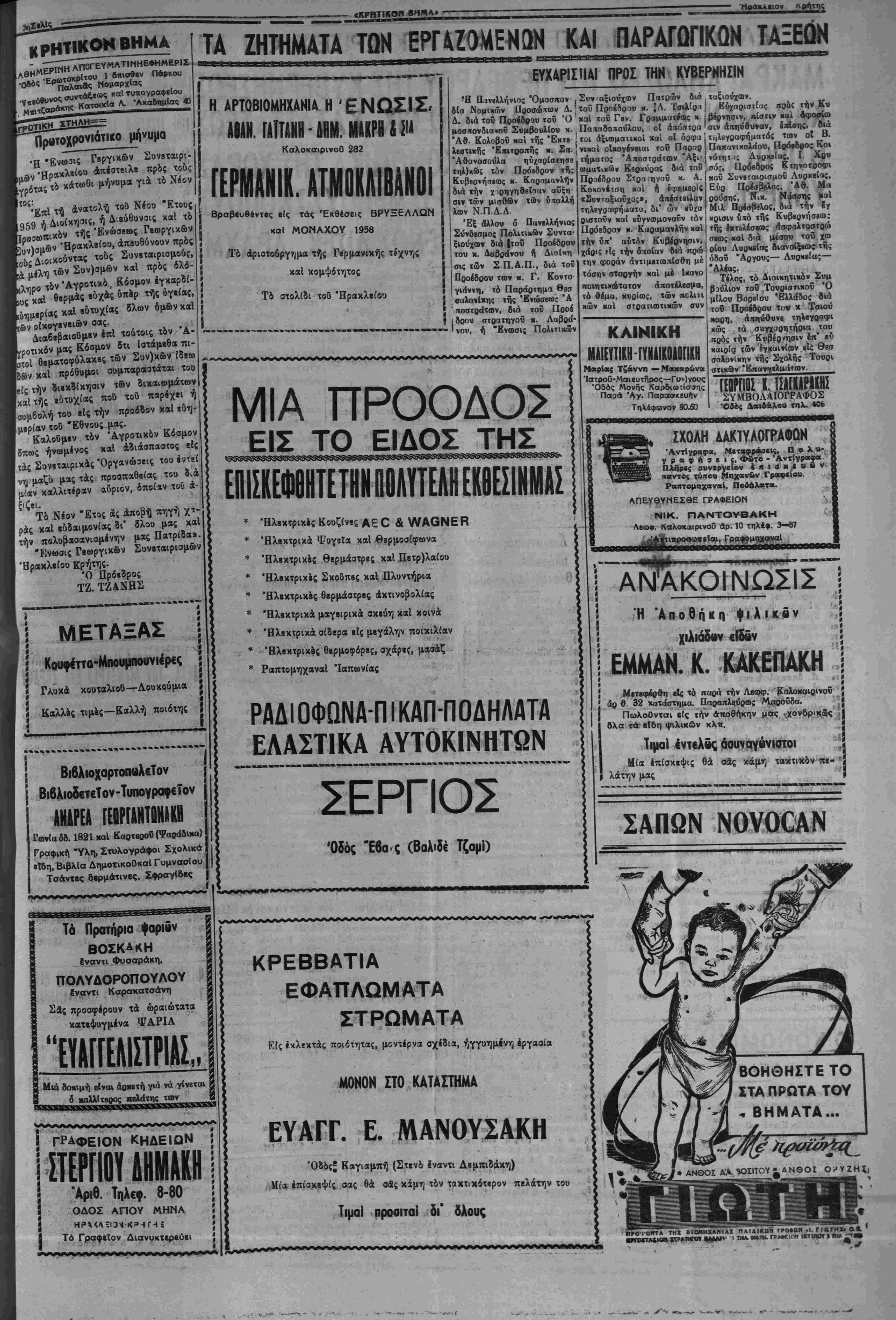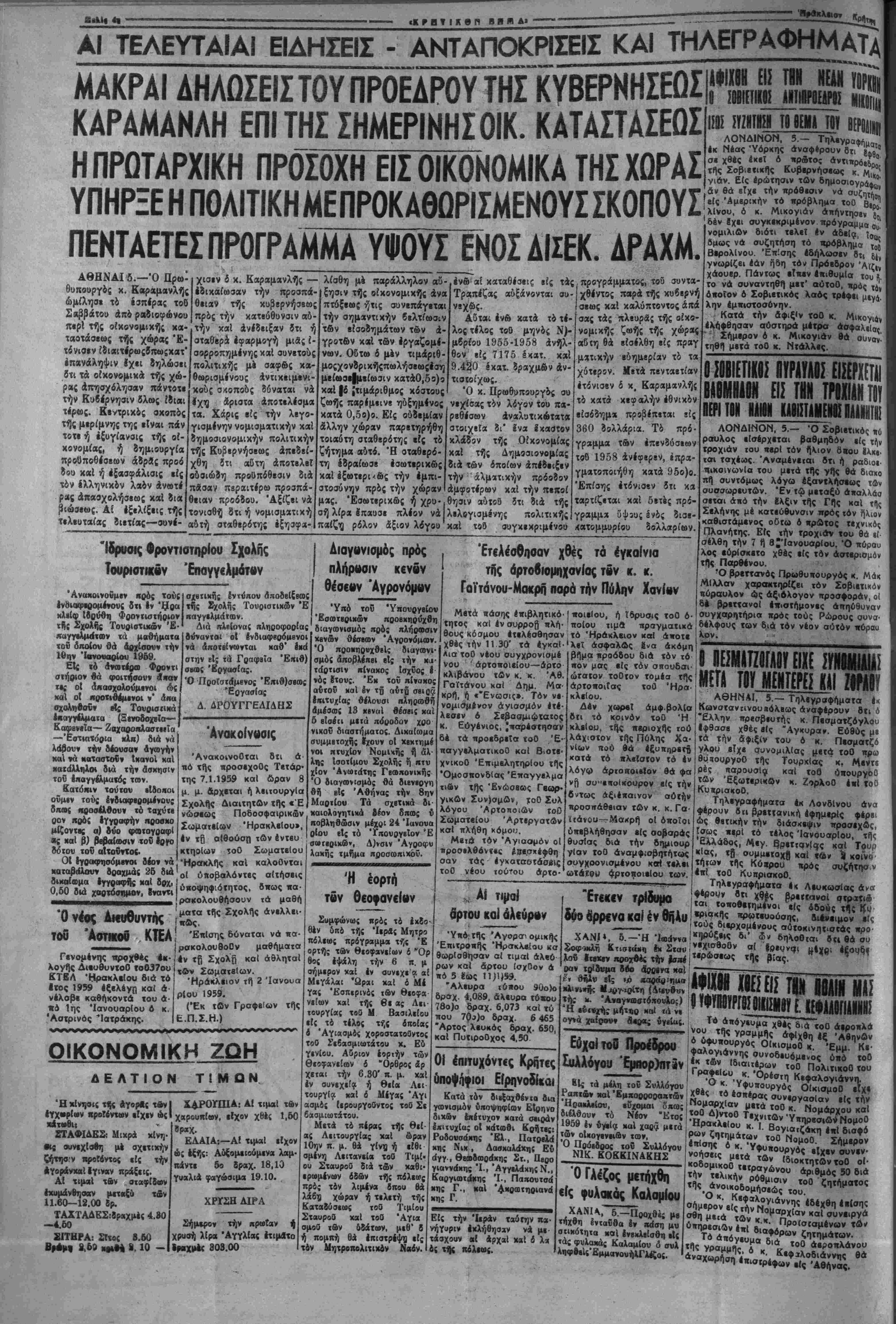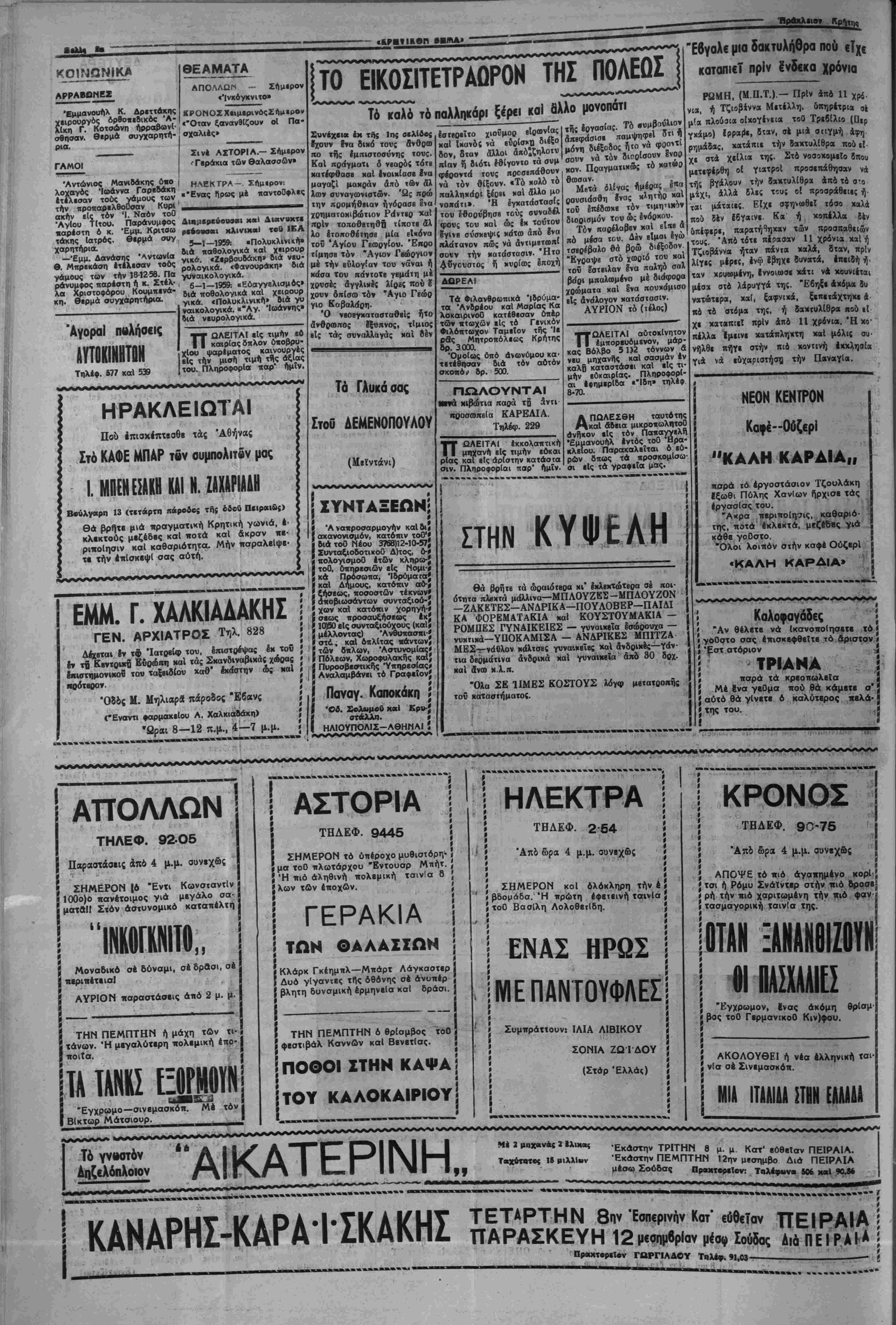 δρτου κοί άλ€ύρ<*ν Ύ*ό:Ττίς Άγορσ^ ομικής Έπιτροβής Ήρσκλβίου κσ θωρΐσθησαν αί τιμαί άλ«6 ρων καί άρτου ίσχθον ά πό 5 έως Π)1)$9. "Λλευρα 16 «ου 90ο )ο δρσχ. 4,089, άλευρα τό«ου 78ο)ο δραχ. 6,073 χαί τύ που 70ς»)ο δραχ. 6 465 'Αρτος λευκός δραχ. 650, καί Πυτιροθχος 4,50 ή ί?ς κα1 Τουρ , & ουμμβτοχβ «αί «β» ^1 κοΓνο· Ι ^ Κό*0°υ «Ρός σρζήτησ.ν τοθ ΚυπριακοΟ. Τηλινροτφήματα έκ Λιυκωσίας άνα ου βη χβές ^ «ο*οβ·ΐϊμένοι είς όδοός τίς ΟΙ έπιτυχόνκς Κρητβς όποψάψιοι Είρπνοβίκαι Κατά τόν διβξαχθέντα δια γωνισμόν ΰποψηφίων ΕΙρηνο διχων επέτυχον χατά σειράν έχΐτυχία; οί κάτωθι Κρήτες: Ροδονσάκης "Ελ·, Πατρελά κης Νικ , Δασκαλάκης Εΰ άγγ , θΗτθδωοάκης Στ., Πβρο γιάνναρης Ί·, Άγγιλάκης Ν., Καργιωτάκης Ί-, Παπουτσά κης Γ., καί 'Ακροοΐηριανβί κης Γ. Είς την Ιεράν ταύτην π*· νήγαριν εκλήθησαν νά με¬ τάσχουν αί αρχαί καΐ ό λ« ός τής πόλεως. ΧΛΝΙ», §οφοιΛή Κ λοΰ Ιτβχεν Ι ραν τρΐδνμα δύο «ϊορίνα καί Ι θήΐ εί; Ίαιίννα!^^ Ικ Στο« Ι νβχ1σθοβν τβΡώ «ά ου α|νοι έέουδε } ^γρΐ ( Τής κ. Άναγ»·α)σΐό«ουλος) *Η ·ίιι»χής ή άί ΕύχαΙτοΟ Πρόεδρον ΙιιλΑόγου Έμπορ)πτϊν τα μέλη χαί Έ *<Κ Υραμμής" αφ1χθη ΟΙκισμοΟ ύηό τοθ ΠολιτικοΟ τού η. Λ Ό ρρς ο ύλλο ΝΙΚ. ΚΟΚΚΙΝΑΚΙΣ Ό ΓΑέζος μετπχθη ΧΑΝΙΑ, 5— Προχθέ; μβ χ έντανβα έν πάση μυ στικότητα καί ένεκλεΐσθη είς *ας φυλακάς Καλαμίου ό συλ ληφθεΐβ ΕμμανονήλΓλέζος. Ό σβη κ. κ. Τό Τ0°