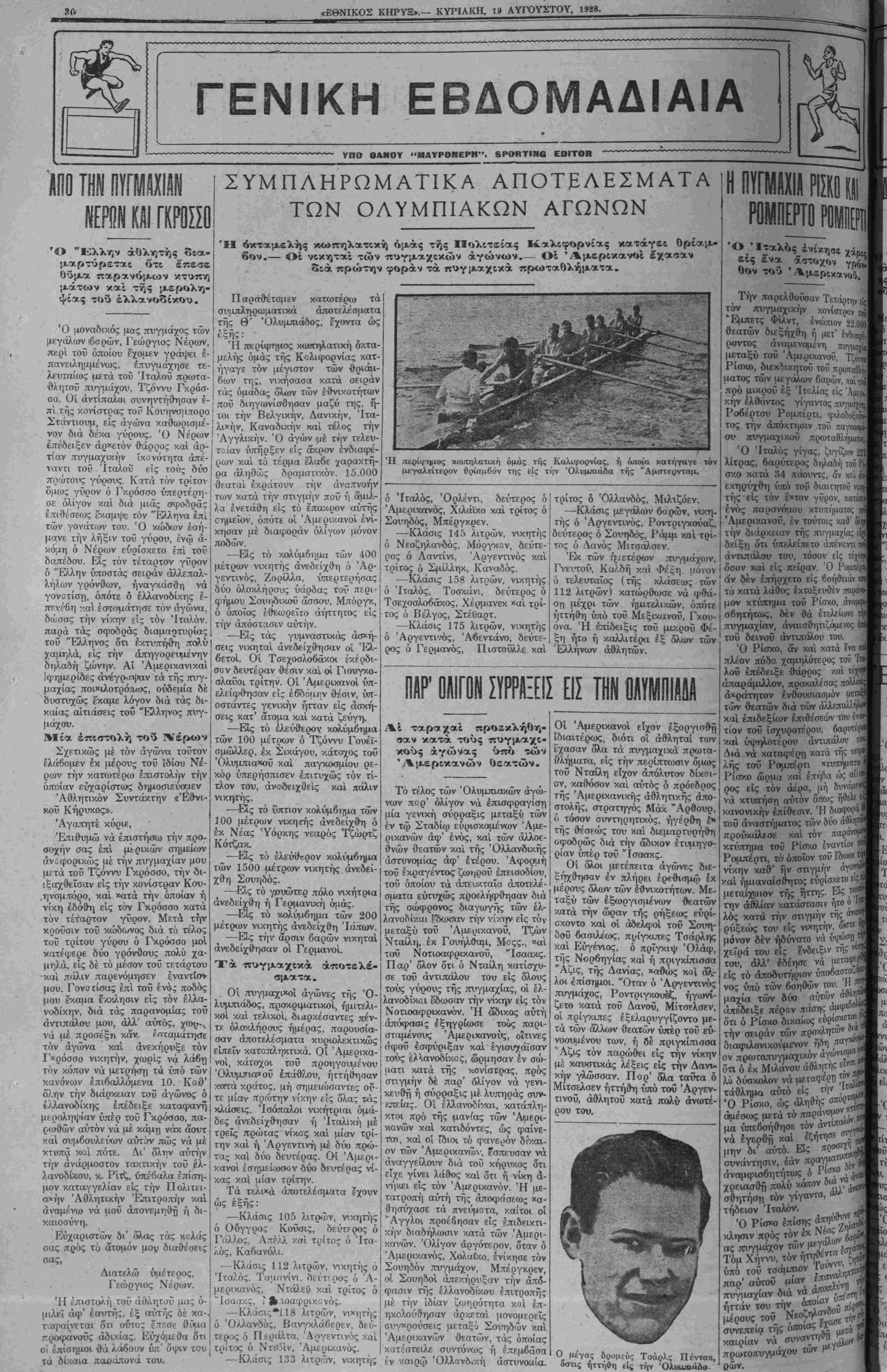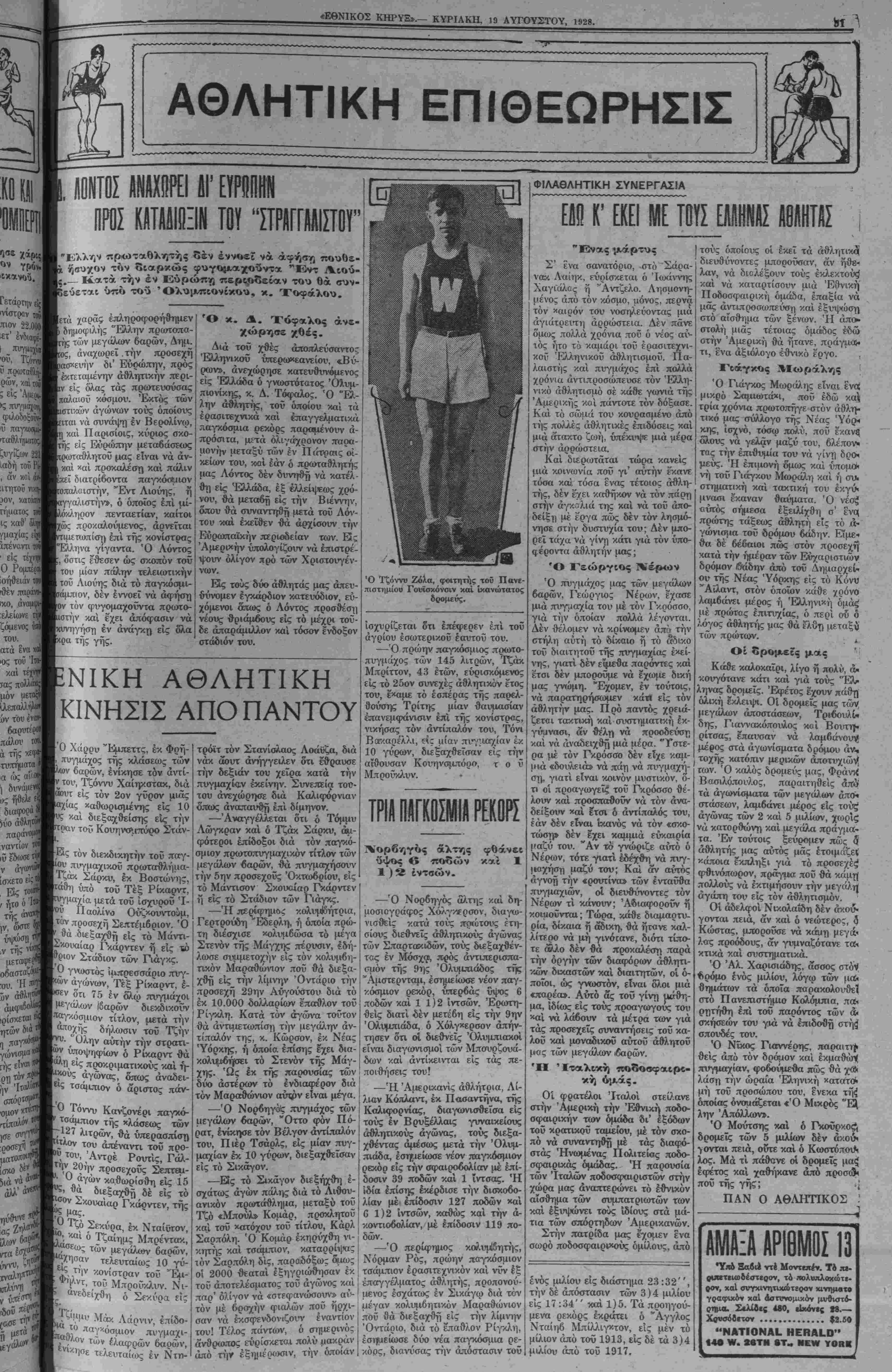 των Ίταλών ποδο<τφαιριστών στήν χώρα μας άναπτερώνει τό εθνικόν αΐσθημα των σνμπατριωτών των καί έξνψώνει τούς ίδίους στά μά- τια των σπόρτηδων Άμερικανών. Στήν πατρίδα μας εχομεν ενα σωρό ποδοσφαιρικοΰς όμίλους, άπό τούς όποίους οί §κεϊ τα άθλητΐ'»α' διευθύνοντες μποροΰσαν, άν ήθε» λάν, νά διολέξουν τούς έκλεκτοΰςί καί νά καταρτίσουν μιά ΈΟνική Ποδοσφαιρική όμαδα, επαξία νά μας αντιπροσωπεύση καί έξνψώση στό αΐσθημα των ξένων. Ή άπο» στολή μιάς τέτοιας όμοόδος έδώ στήν Άμερική θά ήτανε, πράγμα}» τι, ενα άξιόλογο έθνικό εργο. , Γιάγκθς Ό Γιάγκος Μωράλης είναι ενα! μικρό Σαμιωτά«ι, ποϋ έδώ καΐί τρία χρόνια πρωτοπηγε στόν άθλη- τικό μας σύλλογο τής Νέας Ύόρ< κης, ίσχνό, τόσω πολύ, ποΰ εκανς δλους νά γελαν μαζύ τού, βλεπον· τας την έπιθυμία τού νά γίντ] δρο< μεύς. Ή έπιμονή ιδμως καί υπομχ» νή τοϋ Γιάγκου Μωράλη καί ή συ« στηματική καί τακτική τον έκγύ» μνασι εκαναν θαΰματα. Ό νέσς" «ύτός σήμεοα έξειλίχθη σ' ενα, πρώτης τάξεως άθλητή είς τό ά· γώνισΐΐα τοΰ δρόμου βάδην. Εΐμε·» θα δέ βεβαιοί πώς στόν προσέχη κατά την ημέραν των Εΰχαριστιων δρόμον /&άδην άπό τοϋ Δημαρχεί¬ ον τής Νέας Υόρκης είς τό Κόνυ "Αϊλαντ, στόν οποίον κάθε χρόνο λαμβάνει μέρος ή 'Ελληνική όμά^ μέ πρώτσς επιτυχίας, ό περί οί ό λόγος άθλητής μας θά ελΰτ| μεταξύ των πρώτίον. ί ΟΕ ενός μιλίον είς διάιστημα 23:32", την δέ απόστασιν των 3)4 μιλίον είς 17 :34'' και 1)5. Τα προηγοΰ- μενα ρεκόρς έκράτει ό "Αγγλος Νταίηβ Μπίλλιγκτον, είς μέν τό μίλιον άπό τοϋ 1913, είς δέ τα 3)4 μιλίον άπό τοΰ 1917. μας Κάθε καλοκαϊρι, λίγο ή πολύ, ά· κουγότανε κάτι καί γιά τούς "Ελ¬ ληνας δρομεϊς. "Εφέτος εχονν πάθη όλική εκλειψι. Οί δρομείς μας των, μεγάλων άποστάσεων, ΤριΰουλΐΛ δης, Γιαννακόπουλος νχλ. Βουτη>>