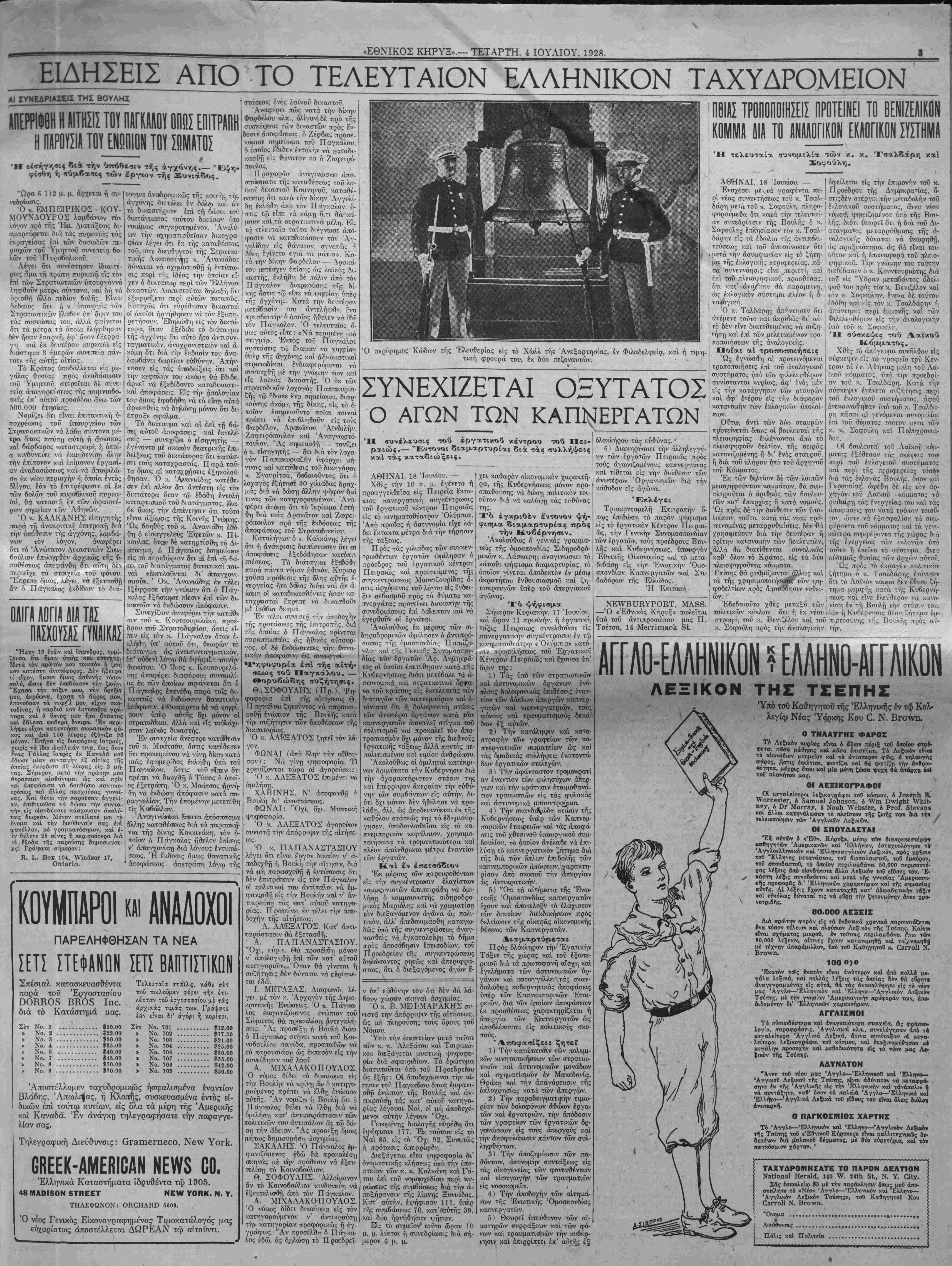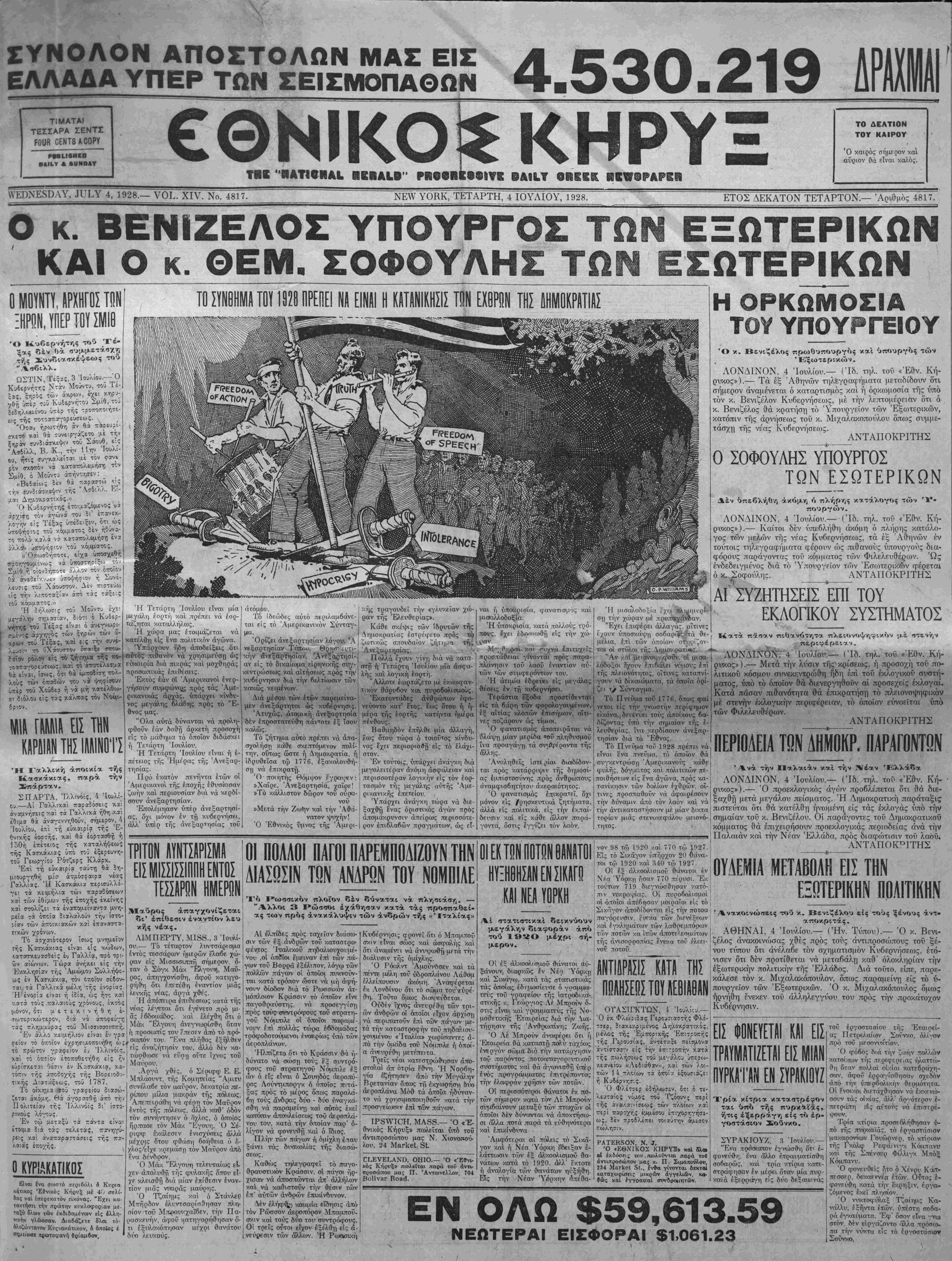 (.'.εΐα τα όττει<2 ϊιαλιαλούν την ίστο· •ΑΤ* των άπΌΐΥ.ιακών καί έπαναττϊ Γί/,ών χρονων. Τό άίχαιότερον ίσως μνημβ« :ής Κασν.άκιας είναι είς <.ατ*τκευασθείς έν Γαλλία, χρο τρ1.· ών αϊώνων. Τώρ1» άνηκει είς τή Έκικλησίχν τής Ά».Λωμο·ο Συλλήψο- ως έν Κατν,άκια, τόν οποίον σέδον- ται τα Γατλλι-Αα μ«λη τής ένορίας. Ή ένορία είναι ή ιδία. ώς ήτ: /.ο; ν.ατά τοΰς τϊαλαιοΰς χι·5&*;οΐϋ·ς, έι μόνον, δτ: μ ί τ ε κ ! ν ή θ η ιτωτίρικώτείον, διά νά άποφι τάς πλημμυρας τοΰ Μισσιιο'ϊθΊ'ππή "Έν ά'λλο κίΐμήλιον είναι εν γρ φείον το οποίον έχρη<Γ'.!ΑθποιηΊθ·η ώ τό πρώτον γραφείον έν Ίλλινόϊς, •λαΐ τό οποίον έτοπο'θετηθη είς ην εΰρίσκίταί θέσιν έν ΚςτΤΑάκιβί, ν.χ- τόπιν τής ΛπΌ'ίοχής τής Βοοειο-δ·1;- τικής Αιατάςεως, τοΰ 1787. Το οίκηςχα #οΰ γραφίί'ου δ ϊεται άκόμη. Θά άγορασθή άπό την Πολιτβίαν τής Ίλλινόϊς δι' ίττο- ριικι&ϋς λόγίυς. Έν τω μίταςϋ τα πάντα είναι ίτοιμα ξ'.α τάς τελετάς, ρεις κα! άναπζραττάτίΐς τής πα¬ λαιάς Ό κ. Βενιζέλος πρ-ωθυ«ουργός καί υπουργός των ' Εξωτερικών. ΛΟΝΔΙΝΟΝ. 4 Ιουλίου.— Πδ. τηλ. τού «'Ε8ν. Κή- ρυκος»).— Τα έξ Αθηνών τηλεγραφήματα μεταδίδουν ότι σήμερον άναμένεται ό καταρτισμος και ή όρκωμοσία της υπο τόν κ. Βενιζέλον Κυβερνήσεως, μέ την λεπτομέρειαν δτι ό . κ. Βενιζέλος θά κρατήση το Υπουργείον των Εξωτερικών, κατόπιν τής αρνήσεως τοΰ κ. Μιχαλακοπούλου όπως συμμε¬ τάσχη της νέας Κυβερνήσεως. ΑΝΤΑΠΟΚΡΙΤΗΣ Ή Τετάρτη Ιουλίου είναι μία μεγάλη έορτή καί πρέπει νά έορ- άζηται καταλλήλως. 'Η χώρα μας έτοιμάζεται νά κατέλθη είς ε'να πολιτικόν άγώνα. Ύπάρχσυν ηδη άποδείξεις δτι «υτός πιθανόν νά χρησιμεΰσ-η ώς {ικιαιρία διά πι/ράς καί μοχθηράς προσωπικάς έπιθεσεις. Έκτός εάν οί Άμερικανοί ένερ- γήσουν συμφώνΐ|νς; πρός τάς Άμε- ρικανιτοας αρχάς, ύπάρχει κίνδυ- νος μεγάλης 6λάΐ6ης πρός τό "Ε- θνος μας. "Ολα αύτά δύνανται νά προλη- φθοΰν εάν δοθή άρκετή προσοχή είς τό ιμάθημα τό οποίον διδάσκει ή Τετάρτη Ιούλιον. Ή Τετάρτη Ιουλίου είναι ή έ- πέτειος τής Ημέρας τή; Άνεξαρ- τησίας. Πρό εκατόν πενήντα έτών οί ΆμερικανοΙ τής έποχής έθυσύασαν ζωήν καί περιουσίαν διά νά κερδί- σουν ανεξαρτησίαν. Έπολέμηασν υπέρ άνεξαρτησί- ας, δχι μόνον έν τή κυβερνήσει, άλλ' υπέρ τής άνεξαρτησίας τοΰ άτόμόυ. Τό ίδρώόες αύτό περιλαμόάνε- ται είς τό Αμερικανικόν Σύνταγ- μα. Όρίζει ανεξαρτησίαν λόγου. Ά νεξαρτηισίαν Τύπου. θρηο~/εν*τ,ι- κήν άνεξάρ'τίησϊαν. Άνίξαρτησί-1 αν είς τό δικαίωμα είρηνικής συγ¬ κεντρώσεως καί α'ιτήσεως πρός την κυβέρνησιν διά την βελτίωσιν των κακώς κείμενον. Διά ιιέσου των έτών παρεμείνα- μεν άνεξάρτητοι ώς κυβέρνησις. Ατυχώς, άτσμική άνεξ;αρτησία δέν έπροστατεύθη πάντοτε έξ ϊσου καλώς. Τό ζήτημα αύτό πρέπει νά άπα- σχολήστ) κάθε σκεπτόμενον πολί¬ την, ούτως ωστε ή Δημοκρατία, ή ιδρυθείσα τψ 1776, έξακολουθή- σ-η νά επικρατή. Ό ποιητής Θόμψον Γγραι[ιε.ν: »Χαΐρε, 'Ανεξαρτησία, χαΐρε! »Τό κάλλιστον δώρον τοΰ ουρα¬ νόν »Μετά την Ζωην ·καί την Άθά- νατον ι^υχήν! Ό Έθνικός ΰμνος τής Αμερι¬ κήν τραγουδεΐ την «γλυκείαν χώ¬ ραν τής "Ελευθερίας». Κάθε σκέψις των ίδρυτών τής Δημοκρατίας έστρέφετο πρό; τή ζωτικώς σπουδαίον ζήτημα τή; Άνεξαρΐησίας. Πολλά εχουν γίνη διά νά κατα¬ στή ή Τετάρτη Ιουλίου μία άσ<ρα- λή; καί λογική έορτή. "Αλλοτε έωρτάζετο μέ Ικκωφαν- τικον θόρυβον κατ πυροβολισμοΰς. Έκατοντάδες άνθρώπων έφο- νεύοντο κατ' ετος, ε'ως δτου ή ή- μέρα τής εορτής κατήντα ήμέρα πένθους. Βαθμηδόν επήλθε μία άλλαγή, εως δτου τώρα ό τοιούτος κίνδυ- νος εχει περιορισθή είς τό ελάχι¬ στον. Έν τούτοις, ύπάρχε
