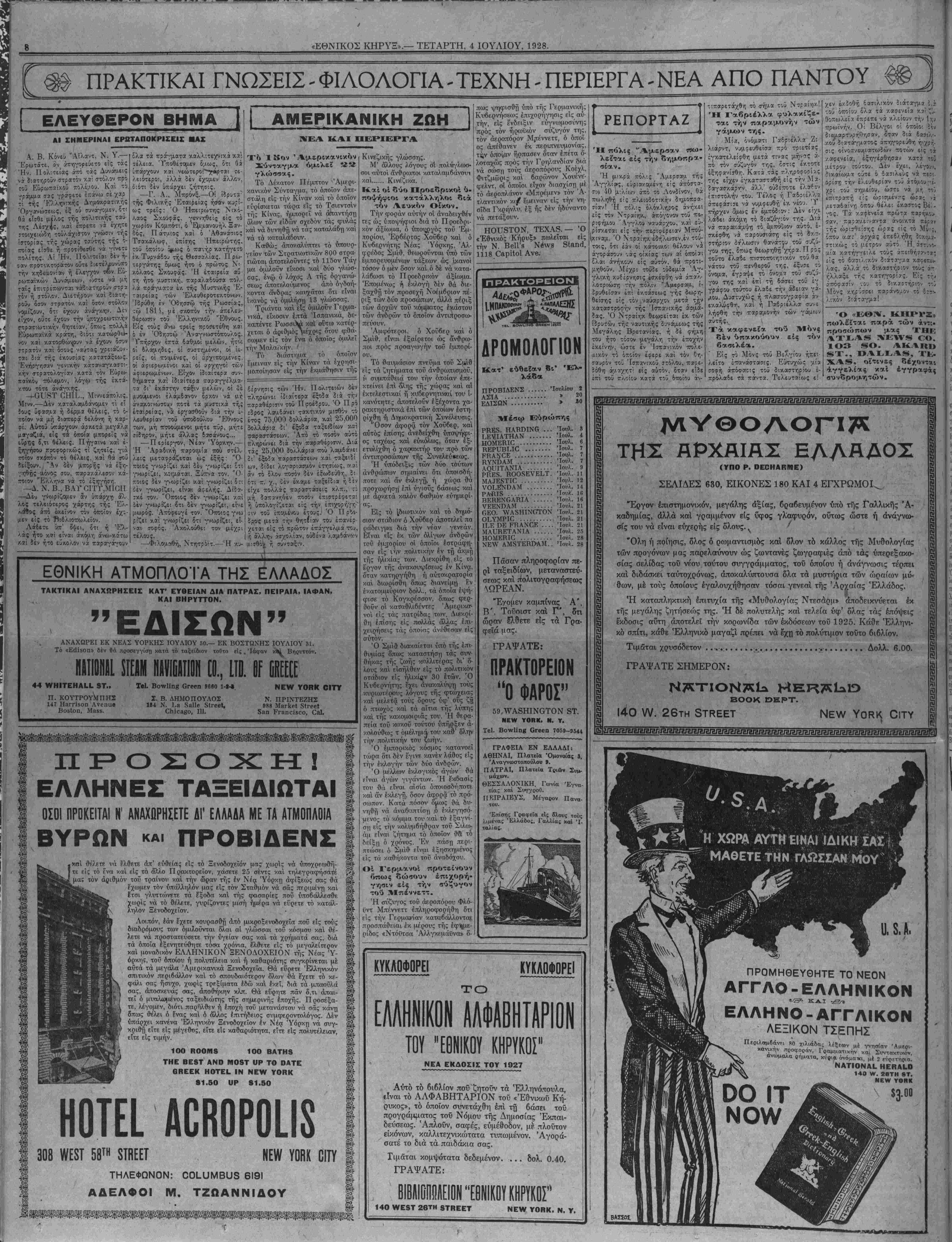 τής ώριτίείϊης ώρας ΐίς τό >!<,·;, ά έδή ήη ατι/.ώς τό μέτρ&ν αύτό Ή 'χ'.α •/.5'τήγγειλε τούς άπει ίίς τό δαίΐλ'.κον διάταγΛα φεΐ» λ.ας, άλλά τό δικαστήριον τοΰς λ- ςϊ; τίς καττγορίας. ^ Βίς -,~4 φί όν τό δ'/.ζστη-ριον τό} Μόνς κτ,ρότσε1. παράνο·;ον τό ί:·»-. 1 :·/Λν ϊ'.ά! Ό «ΕΘΛΙ. ΚΗΡΥ2.) «ωλδΐται «αρα των άντ:· προσώπων μας Τ II Γ: ΤΑ8 1Ο3 «Ο. ΑΚΑΚΟ 8Τ., ΟΑΙ^Ι^Αβ, Τ_. ΧΑ8, οΐτινες δέχοντ*·. άγγελίας καί έγγραφάς συνδρομητήν. ΗΓ2ΠΠπ/ΖΓΕΠΠίΐπΐ-ΐίΓΐυΒ1ΈΠΙίΠ)ΐ]^^ ΑΡΧΑΙΑΧ (ΥΠΟ Ρ. ΟΕΟΗΑΚΜΕ) ΣΕΛΙΔΕΣ 630, ΕΙΚΟΝΕΣ 180 ΚΑΙ 4 ΕΓΧΡΩΜΟΙ^ "Εργον έπιστημονικόν, μεγάλης άςίας, βραδευμένον υπό τής Γαλλικής Ά- καδημίας, άλλά καί γραμμένον είς ΰφος γλαφυρόν, ούτως ώστε ή άνάγνω- σίς τού νά είναι ευχερής είς δλους. ' "Ολη ή ποίησις, όλος ό ρωμαντισμός καί όλον τό κάλλος της Μυθολογίας των προγόνων μας παρελαύνουν ώς ζωντανές ζωγραφιές άπό τάς ύπερεξακο- σίας σελίδας τοϋ νεου τούτου συγγράμματος, τοϋ όποίου ή άνάγνωσις τέρπει καί διδάσκει ταυτοχρόνως, άποκαλύπτουσα δλα τα μυστήρια των ώραίων μύ- θων, μέ τούς όποίους έγαλουχήθησαν τόσαι γενεαί τής Άρχαίας Ελλάδος. Ή καταπληκτική έπιτυχία της «Μυθολογίσς Ντεσάρμ» άποδεικνύεται έκ τής μεγάλης ζητήσεώς της. Ή δέ πολυτελής καί τελεία υφ' όλας τάς έπόψεις έ'κδοσις αυτή αποτελεί την κορωνίδα των έκδόσεων τοϋ 1925. Κάθε Έλληνι- κό σπίτι, κάθε Έλληνικό μαγαζί πρέπει νά έχη τό πολύτιμον τουτο βιβλίον. Τιμδται χρυσόδετον . .■.....................-..........Δολλ. 6.00. ΓΡΑΨΑΤΕ ΣΗΜΕΡΟΝ: ΒΟΟΚ ΟΚΡΤ. 140 Λ/. 26τη 8ΤΡΕΕΤ ΝΕνν ΥθΡΚ ΟΐΤΥ ΜΑΘΕΤΕ ΤΗΝ ΓΑβΣΧΑΝ υ. 5. α. ΠΡΟΜΗΘΕΥΘΗΤΕ Τ0 ΝΕΟΝ ΑΓΓΛΟ - ΕΛΛΗΝΙΚΟΝ ΕΛΛΗιΝΟ-ΑΓΓΛΙΚΟΝ ΛΕΞΙΚΟΝ ΤΣΕΠΗΣ ΝΑΤΙΟΝΑί ΗΕΒΑίΟ 140 νν. 26ΤΗ 8Τ. 00 ΙΤ ΝΟνν ΝΕνν ΥΟΚΚ ΒΑΣ501
