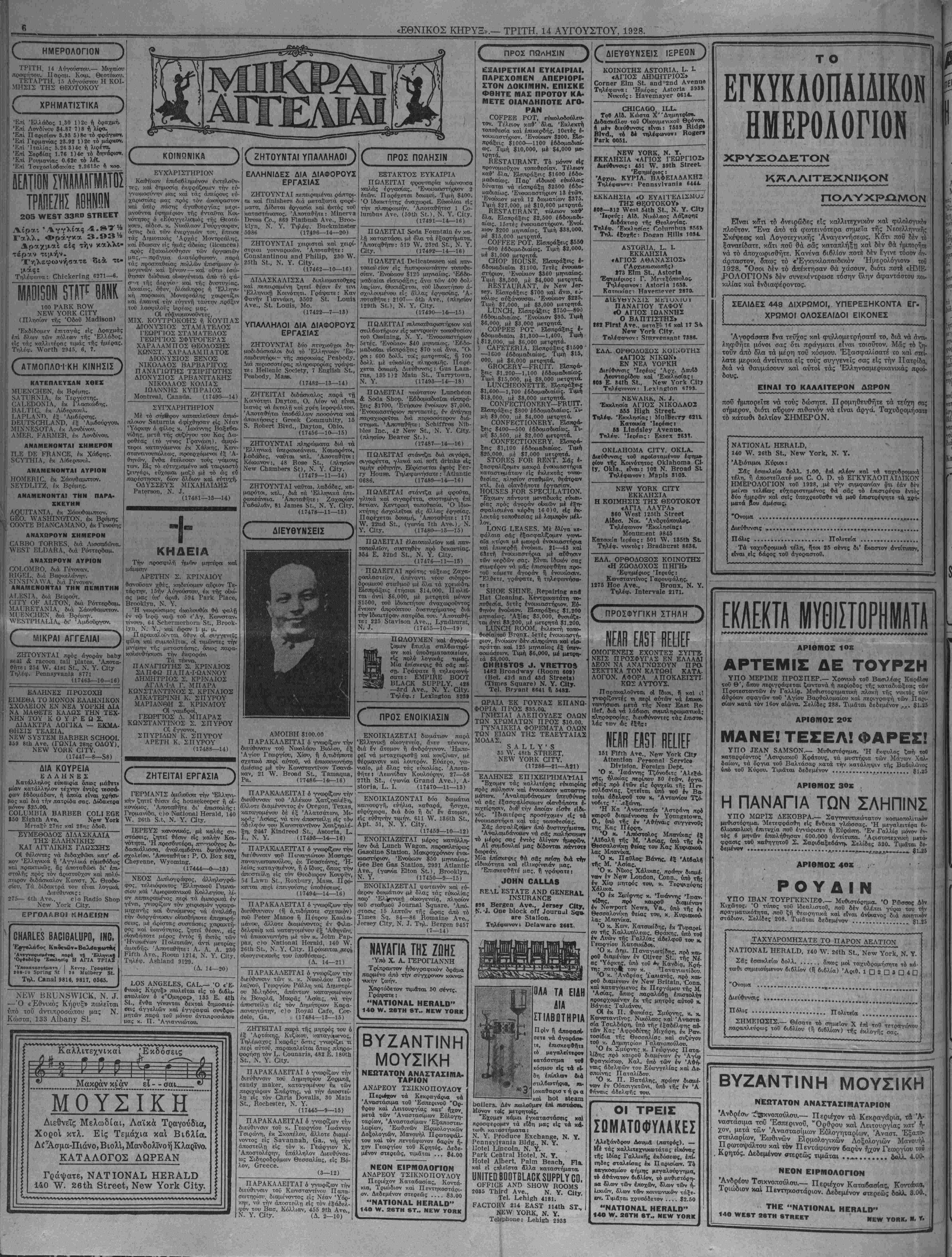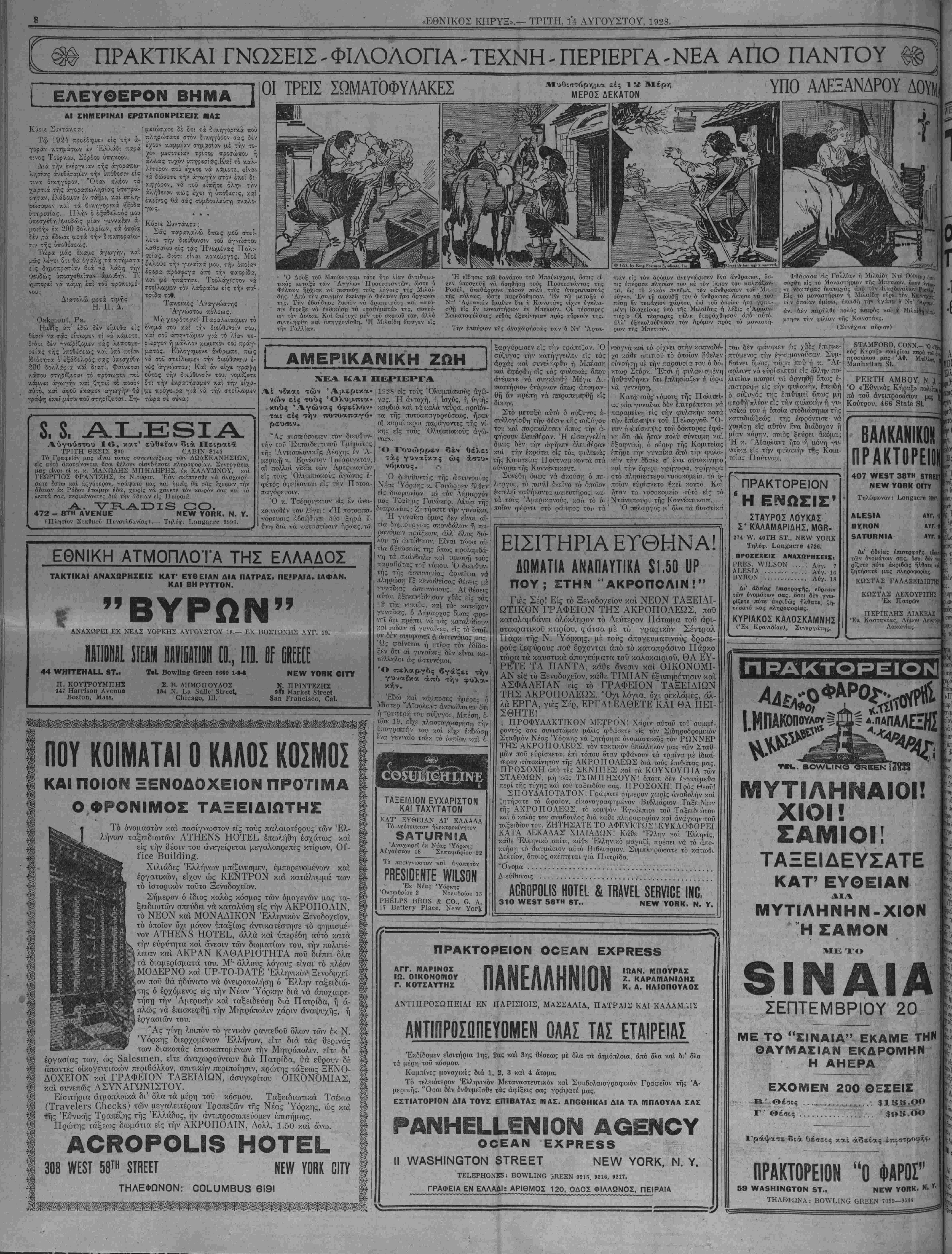 γυναικα άπό την" φυλ<α- κήν. ώ^καΙ κάμποσες ήμιίοιες ό Μίστερ 'Άϊαρλαντ «νικά/λνψεΛ' δτι ή_τρυφερή τοι; σΰζννος, Μπέο1η, έ των 19, είχε πλαστογραηρήπη την υπογραφήν τοι» καί εΐχε ΡκΙδίόση ή·α γενναΤο τσέκ τό οποίον κιαί έ- ΤΑΞΕΙΔΙΟΝ ΕΥΧΑΡΙΣΤΟΝ ΚΑΙ ΤΑΧΥΤΑΤΟΝ ΚΑΤ' ΕΥΘΕΙΑΝ ΔΓ ΕΛΛΑΔΑ Τό νεότευκτον ήλεκτροκίνητον Αναχωρεί έκ Νέας Υόρκης Αύγούστου 18 Σεπτέμβριον 22 Τό πασίγνωστον καί αγαπητόν ΡΗΕ8Ι0ΕΝΤΕ ΜδΟΝ Έκ Νεας Υόρκης Όκτωβρίου 2 Νοεμβριού 13 ΡΗΕΕΡ5 ΒΗΟ5 & 00., Ο. Α. 17 Β3116ΓΥ Ρ1306, Νβν ΕΙΣΙΤΗΡΙΑ ΕΤΘΗΝ Α! ΔΩΜΑΤΙΑ ΑΝΑΠΑΥΤΙΚΑ $1,50 ϋΡ ΠΟΥ; ΣΤΗΝ "ΑΚΡΟΠΟΛΙΝ!" Γιές Σέρ! Είς τό Ξενοδοχείον καί ΝΕΟΝ ΤΑΞΕΙΔΙ- ΩΤΙΚΟΝ ΓΡΑΦΕΙΟΝ ΤΗΣ ΑΚΡΟΠΟΛΕΩΣ, ποΰ καταλαμβάνει ολόκληρον τό Δεύτερον Πάτωμα τού άρι- στοκρατικοΰ κτιρίου, φάτσα [ΐέ τό γραφικόν Σέντραλ ΙΙάρκ τής Ν. Υόρκης, μέ τούς άόπογευματινούς δροσε- ρούς ζεφύρους ποϋ ερχονται άπό τό καταπράσινο Πάρκο τώοα τα καυστικά άπογεύματα τοΰ καλοκαιριοΰ, ΘΑ ΕΥ- ΡΚΓΕ ΤΑ ΠΑΝΤΑ, κάθε ανεσιν καί ΟΙΚΟΝΟΜΙ- ΑΝ είς τό Ξενοδοχείον, κάθε ΤΙΜΙ ΑΝ εξυπηρέτησιν καί ΑΣΦΑΛΕΙΑΝ είς τό ΓΡΑΦΕΙΟΝ "ΤΑΞΕΙΔΙΩΝ ΤΗΣ ΑΚΡΟΠΟΛΕΩΣ. "Οχι λόγια, δχι ρεκλάμες, άλ¬ λά ΕΡΓΑ, γιές Σέρ, ΕΡΓΑ! ΕΛΘΕΤΕ ΚΑΙ ΘΑ ΠΕΙ¬ ΣΘΗΤΕ! ΠΡΟΦΥΛΑΚΤΙΚΟΝ ΜΕΤΡΟΝ! Χάριν αυτού τού συμφέ¬ ροντας σας συνιστώμεν μόλις ορθάσετε είς τόν 5ιδ11(?οδρομικόν Σταθμόν Νέας Υόρκης νά ζητήσητρ όνομαστικώς τόν ΡΩΝΝΕΡ ΤΗΣ ΑΚΡΟΠΟΛΕΩΣ, τόν τακτικόν ύπάλληλόν μας των Σταθ- μών ποΰ ευρίσκεται επί τόπου δταν ψθάνουν τα τραϊνα μέ ιδιαί¬ τερον αυτοκίνητον τής ΑΚΡΟΠΟΛΕΩΣ διά τούς επιβάτας μας. ΠΡΟΣΟΧΗ άπό τές ΣΚΝΙΠΕΣ καί τα ΚΟΥΝΟΥΠΙΑ των ΣΤΑΘΜΩΝ, μήσάς ΤΣΙΜΠΗΣΟΥΝ! όπότε ί)έν έγγυώμεθα περί τής τύχης καί τοΰ ταξειδίου σας. ΠΡΟΣΟΧΗ! Ποός Θεοΰ! ΣΠΟΥΔΑΙΟΤΑΤΟΝ! Γράψατε σήμερον χωρίς άναβολήν καί ζητήσατε τό ωραίον, εικονογραφημένον Βι6λιάριο.ν Ταξειδίων τής ΑΚΡΟΠΟΛΕΩΣ, τό κομψόν Έγκόλπιον τοΰ Ταξειδιώτου καί ό καλός τού σΰμβονλος διά κάθε πληροφορίαν και ανάγκην τοΰ ταξειδίου τού. ΖΗΤΗΣΑΤΕ ΤΟ ΑΦΕΥΚΤΩΣ! ΚΥΚΛΟΦΟΡΕΙ ΚΑΤΑ ΔΕΚΑΔΑΣ ΧΙΛΙΑΔΩΝ! Κάθε "Ελλην καί Έλληνίς, κάθε Έλληνικό σπίτι, κάθε Έλληνικό μαγαζί, πρέπρι νά τό άπο- κτήσιι τό θαυμάσιον αΰτό Βιβλιάριον. Συμπληρώσατε τό κάτοοθι Δελτίον, δποιος σκέπτεται γιά Πατρίδα. "Ονομα............................................. Διεύθυνσις ...................... Α0γ10Ρ01Ι3 ΗΟΤΕί & ΤΒΑνΕί 3ΕΗνΐΟΕ ΙΝΟ, 310 νΥΕδΤ 58ΤΗ 8Τ., ΝΕνν ΥΟΙ1Κ, Ν. Υ. τού δέν φάνηκεν ώς χθές ίπιοΐκε- .πτόμενος την έγκυμονοΰσαν. Συιι- Ραΐίνει δμως, τώοα ποϋ ή κ. "ΑΤ- αρλ«ντ νά ευρίσκεται είς άλλην πθ- λιτείαν ιιπορεΐ νά άρνηιν>η δπιως έ-