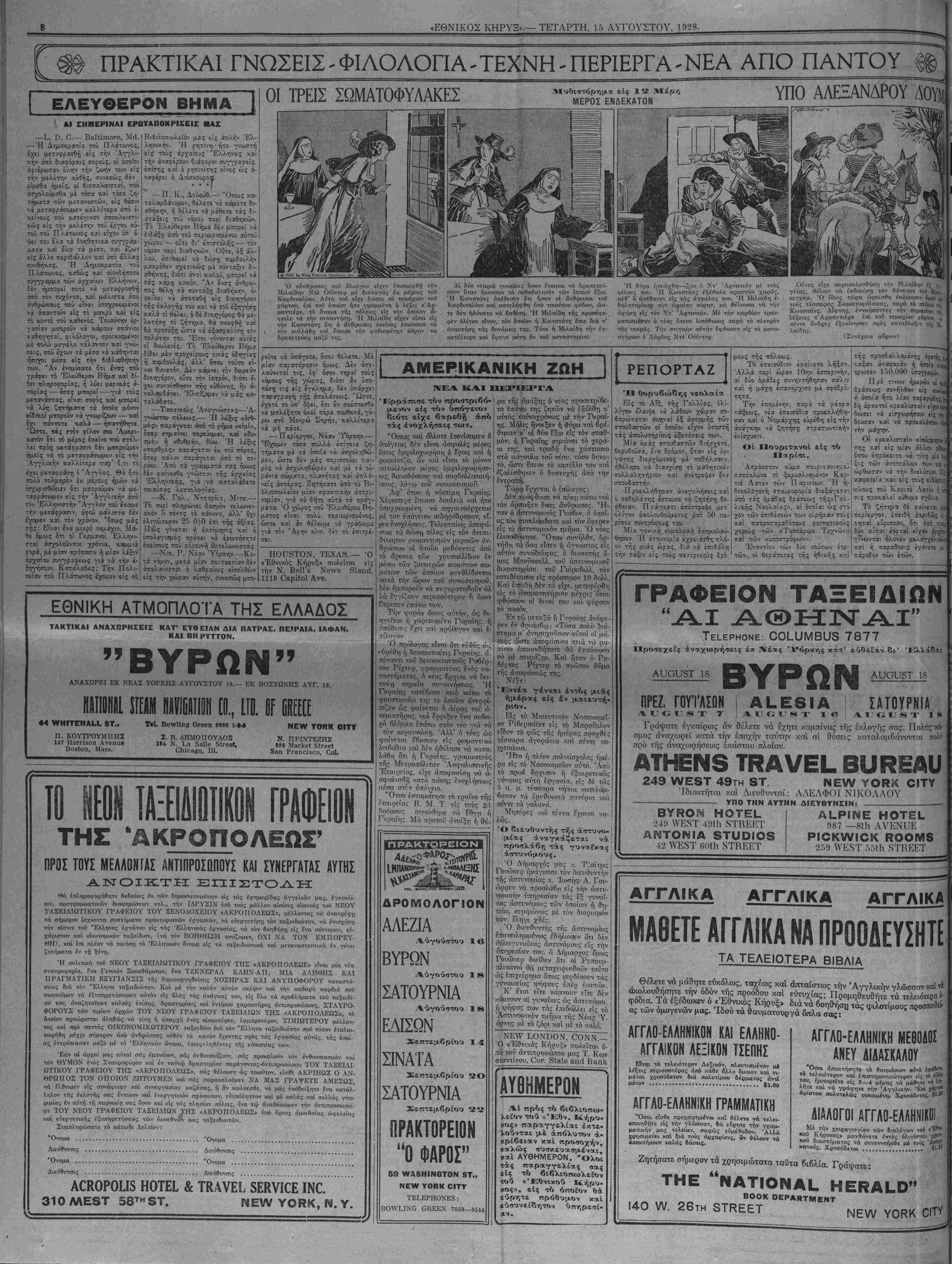 Προαεχεΐς άναχωρήβεις έκ Τ¥£ας Υόρκης κατ' ευθείαν 8ι' Ελλάδι: