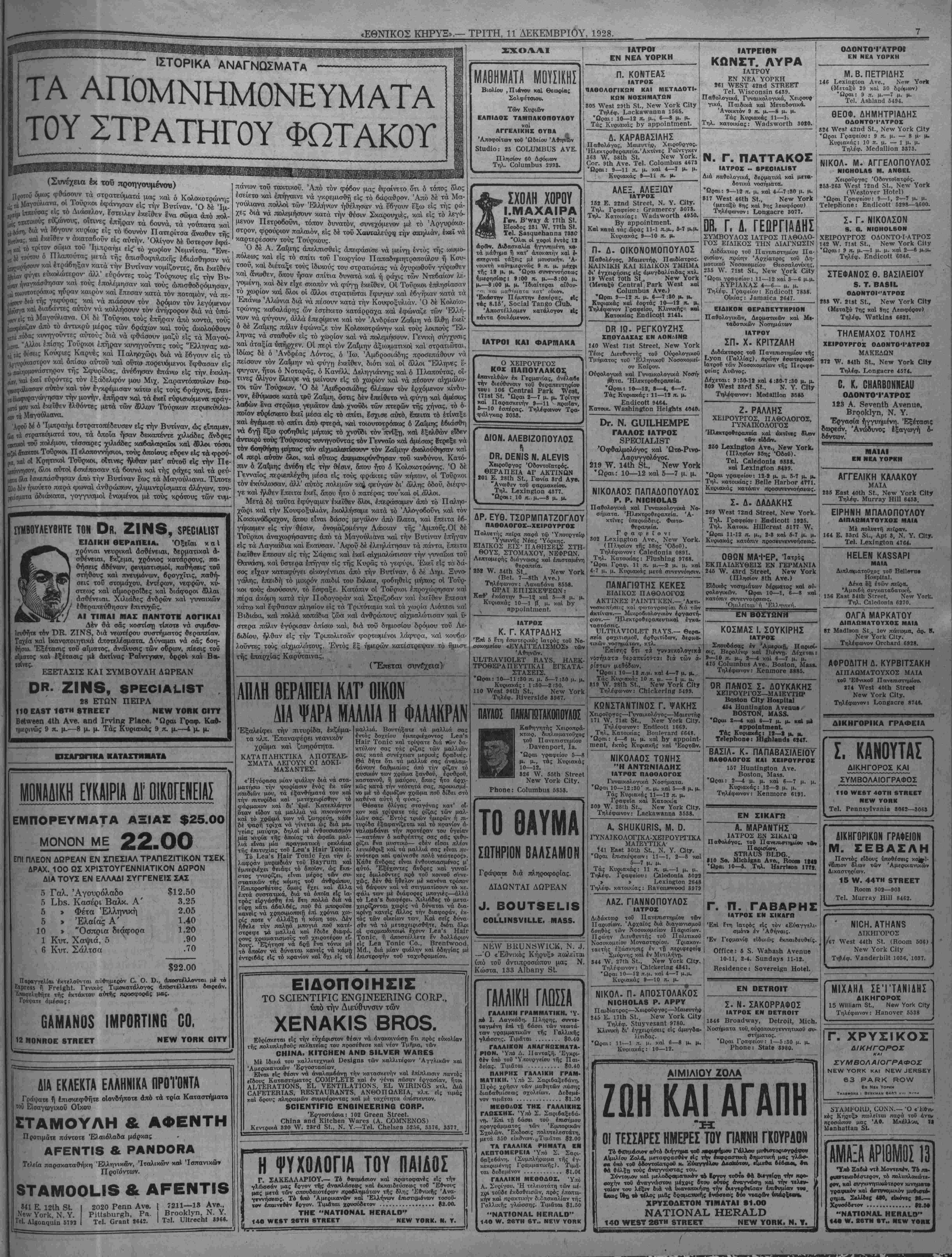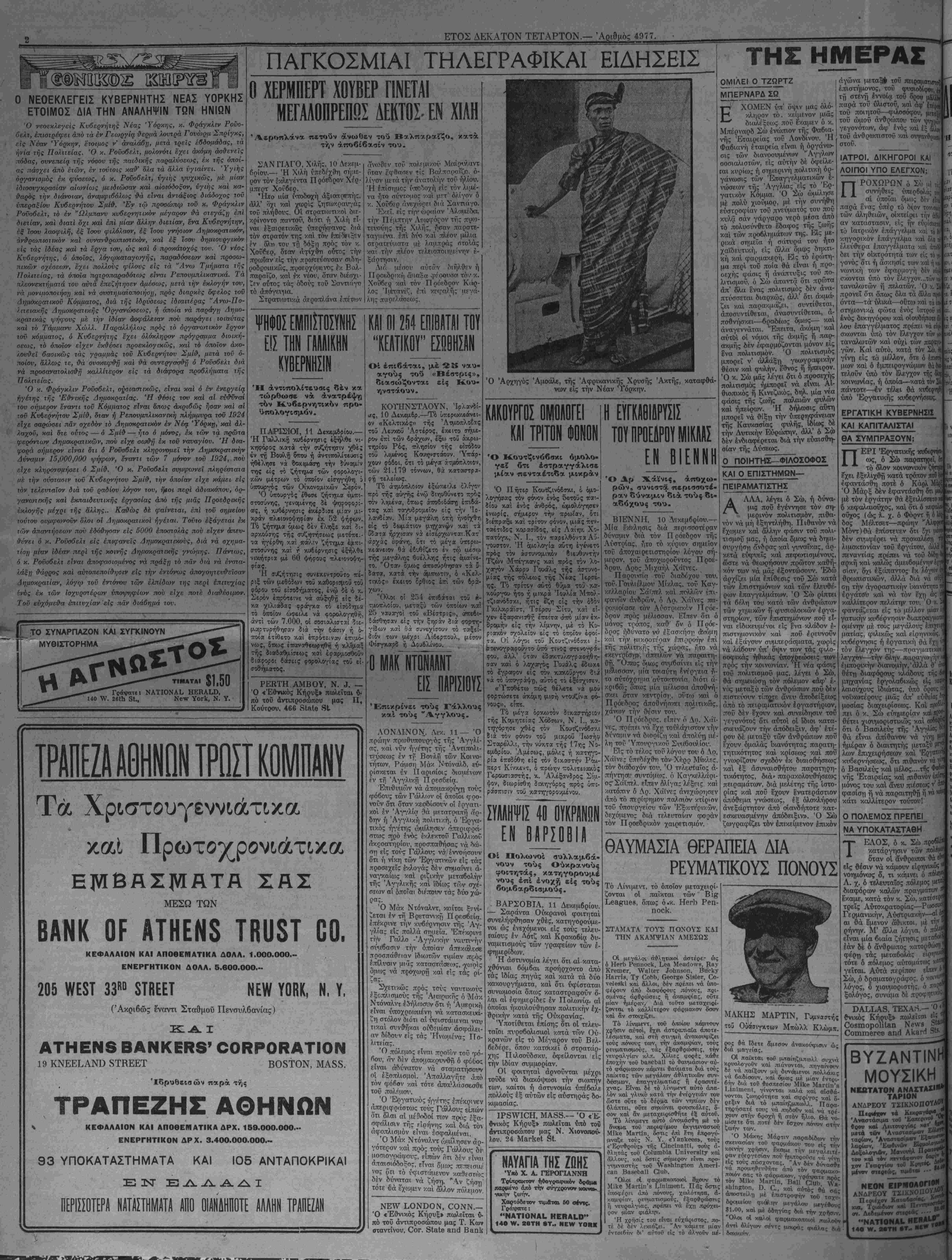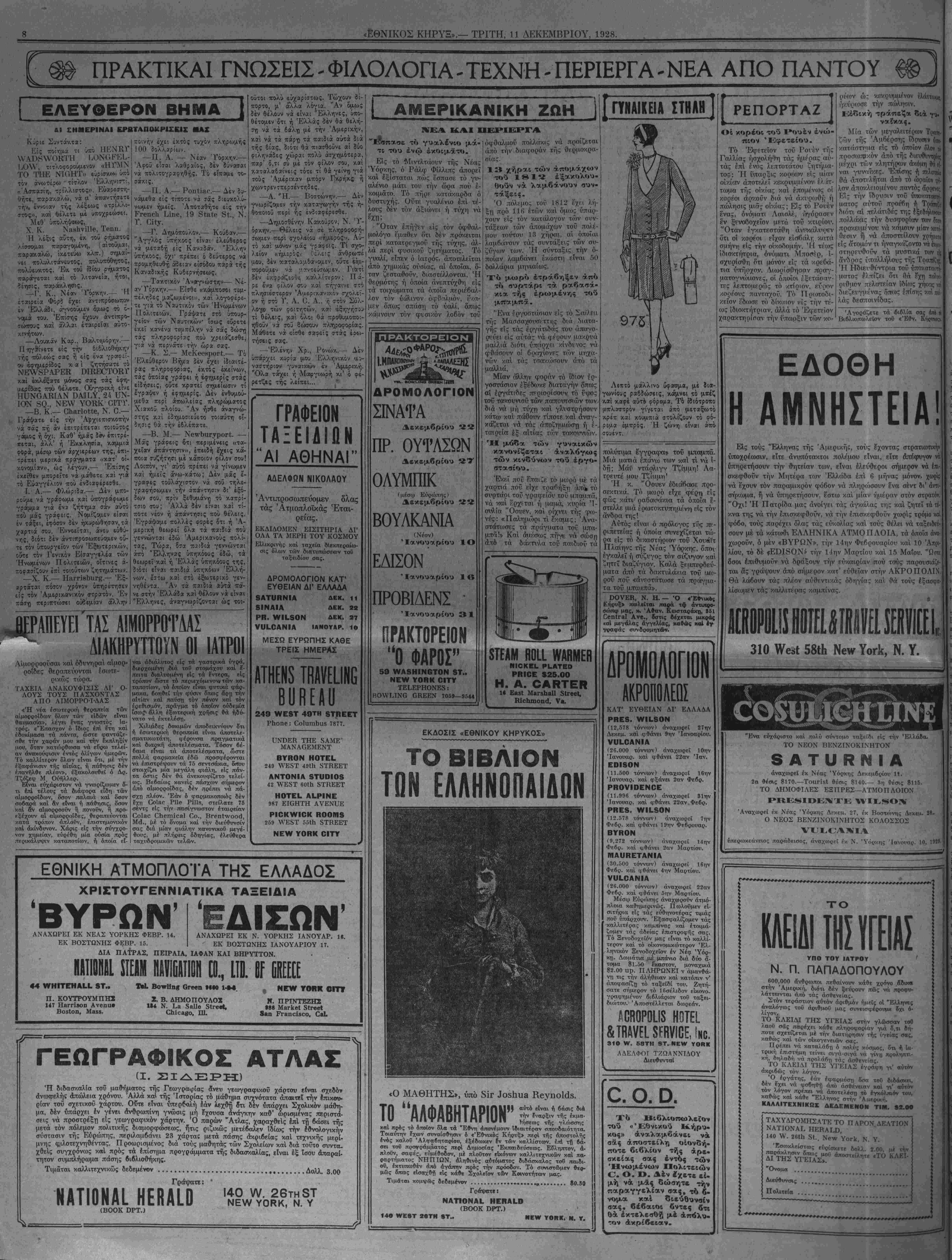 &λ> τοΰ <Έθν. Κ ΕΔΟΘΗ Η ΑΜΝΗΣΤΕΙΑ! Είς τούς "Ελληνας τής Άμερικής, τούς έχοντος στρατιωτικήν υποχρέωσιν, είτε άνυπότακτοι πολέμου είναι, είτε άπέφυγον νέ ύπηρετήσουν την θητείαν των, είναι έλεύθεροι σήμερον νά επι- σκεο^θοΰν την Μητέρα των Έλλάδα επί 6 μήνας μόνον, χωρίς νά εχουν τόν παραμικρόν φόβον νά πληρώσουν Ινα σέντ δι' άντι· σήκωμα, ή νά ύπηρετήσουν, έστω καί μίαν ημέραν στόν στρατόν "Οχι! Ή Πατρίδα μας άνοίγει τάς άγκάλας της καί ζητεί τα τέ¬ κνα, της νά την έπισκεφθοϋν, νά την επισκεφθούν χωρίς τρόμο καί φόβο, τούς παρέχει όλας τάς ευκολίας καί τούς θέλει νά ταξειδΕν- σουν μέ τα κάτωθι ΕΛΛΗΝΙΚΑ ΑΤΜΟΠΛΟΙΑ, τα δποϊα άνα χωροΰν, δ μέν «ΒΥΡΩΝ», την 14ην Φεβρουάριον καί 10 Απρι¬ λίου, τό δέ *ΕΌΙ8ΟΝ» την Ιΐην Μαρτίου καί 15 Μαΐου. "Ωστε δσοι έπιθυμούν νά δράξουν την ευκαιρίαν ποΰ τσύς παρουσιάζΕ- ται δς γράψουν άπό σν'ιμερον κατ' ευθείαν στήν ΑΚΡΟΠΟΛΙΝ Θά λάβουν τάς πλέον αύθεντικάς όδηγίας; καί θά τούς έξασφα λίσωμεν τάς καλλιτέρας καμπίνας. 310 !¥<** 581Η Νβνν ΥογΙ*, Ν. Υ. "Ενα εύχάριστο καί πολΰ σύντομο ταξεΐδι είς την Έλλάδα. ΤΟ ΝΕΟΝ ΒΕΝΖΙΝΟΚΙΝΗΤΟΝ 8ΑΤυβΝΙ Α αναχωρεί έκ Νέας Υόρκης Δεκεμβριού 11. 2α θέσις $170.—ΤοιιΗδΙ θέσις $140.— 3η θέσις $115. ΤΟ ΔΗΜΟΦΙΛΕΣ ΕΞΠΡΕΣ—ΑΤΜΟΠΛΟΙΟΝ Αναχωρεί ίχ Νέας Υόρκης Δεκεμ. 27, ίκ Βοστο')ντις Δεκεμ· 28- Ο ΝΕΟΣ ΒΕΝΖΙΝΟΚΙΝΗΤΟΣ ΚΟΛΟΣΣΟΣ ύπερωκεάνειος παράδεισος, αναχωρεί έκ Ν. Υόρκης Ίανουαρ. 10, 1329 ΚΛΕΙΔΙ ΤΗΣ ΥΓΕΙΑΣ ΥΠΟ ΤΟΥ ΙΛΤΡΟΥ Ν. Π. ΠΑΠΑΔΟΠΟΥΛΟΥ 600,000 «νθρωποι πεθαίνουν κάθε χρόνο αδικα στην Άμερική, διότι βέν |εύρουν πίδς νά προφυ- λαττωνται άπό τάς ασθενείας. > Στόν τεράστιον αυτόν αριθμόν ημείς οί "Ελληνες
