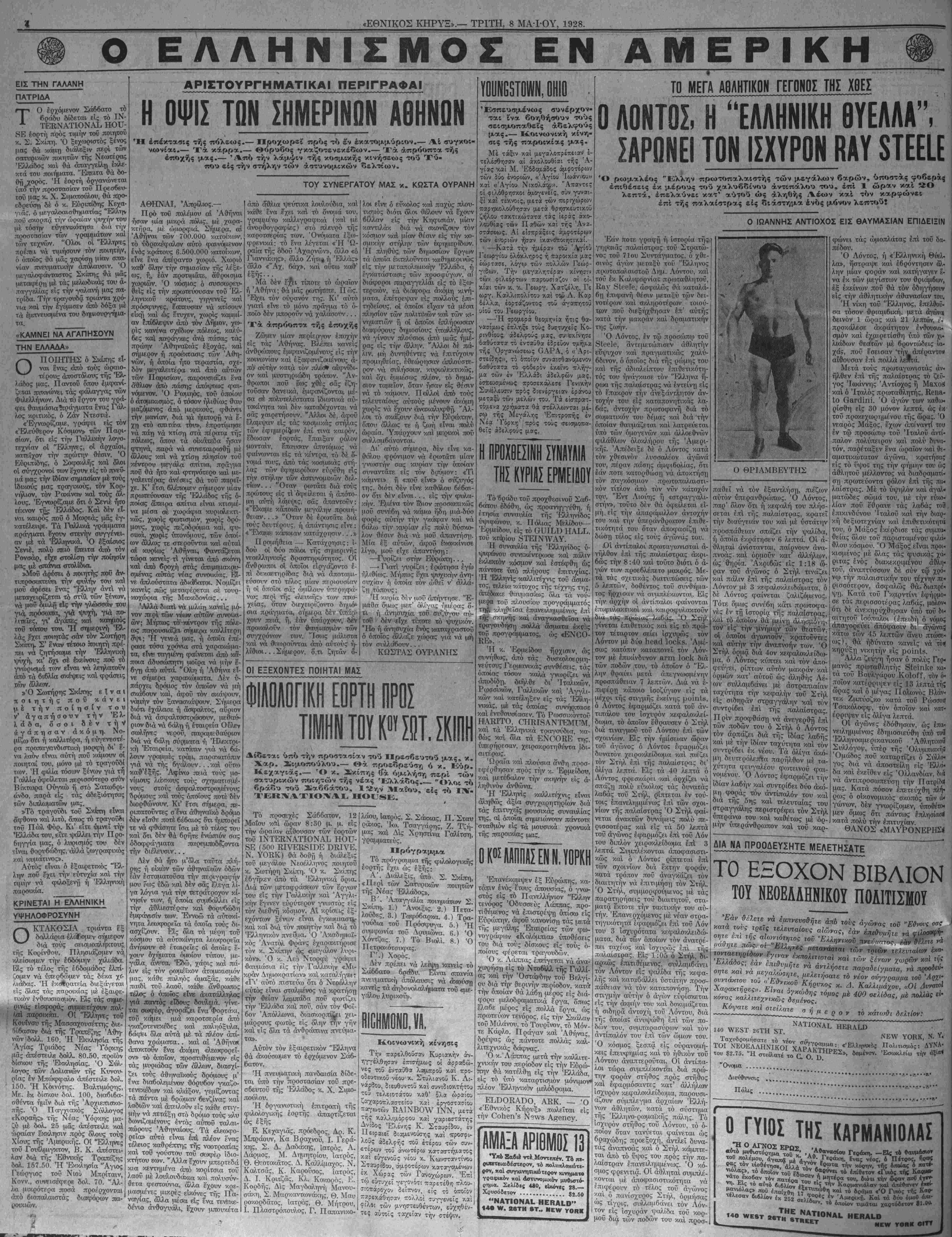 &-----<_Τ= ί ΜΟΥΣΙΚΗ Διεθνέΐς Μελωδίαι, Λαϊκά Τραγούδια, Χοροι κτλ. Είς Τεμάχια και Βιβλία. Δι'τΑσμα-Πιάνο, Βιολΐ, Μανδολϊνοτί ΚλαρΤνα ΚΑΤΑΛΟΓΟΣ ΔΩΡΕΑΝ Γράψατε, ΝΑΤI0ΝΑ^ ΗΕΕΑ^^ 140 "νν. 2 β Λ δίΓββί, Νθνν Υοΐ_ ΠΡΑΚΤΟΡΕΙΟΝ 4Η (ΕΝΩΣΙΣ9 ΣΤΑΥΡΟΣ ΛΟΥΚΑΣ Σ'ΚΑΛΑΜΑΡΙΔΗΣ. Μ6Β- 274 ν. 40ΤΗ 5Τ., ΝΕν ΥΟΗΚ Τηλέφ. ΕοηβαΰΓΟ 4726. ΠΡΟΣΕΧΕΙΧ ΑΝΑΧαΡΗΖΕΙΧι δ. 8. ΕΠΙ8ΟΝ .... Απριλίου 11 8. 8. ΡΠθνΐϋΕΝΟΕ Άπριλ. 17 8. δ. δΑΤϋΗΝΙΑ .... Μαίου δ Δι' αδείας έπιστροφής, εΰρεσιν των όνομάτων σας, δσοι δέν γνω- ρίζετε πότε ακριβώς η/ ατε, ζη- τήσατέ μας πληροφορίας. ΚΥΡΙΑΚΟΣ ΚΑΛΟΣΚΑΜΝΗΣ (Έκ Κρανιδίου), Συνεργάτης. νί λόγφ έννοεΐ νά άποκαλύιΙ·τ| πώ; επληροφορήιθη δτι ό θησαυριός ί κρύοη είς τό κτημα έκεϊνο καί ύτ τινος. Έπίσης έπιμένει νά μί) άπ καλύψη είς τόν Ι&ιοικτήτην ποΰ α¬ κριβώς ευρίσκεται ό θησαυρός μο¬ λονότι ό ίδισκτήτης προσέφερΐό'ν ηδη είς αυτόν τό ήμισυ. Τό κτήμα ί'χει έκτασιν 3.500 στρεμμάτων. Ό ■δνησαυρός ΰπολογίζεται ρ'ι; πολλά έκατοιμμύρΐα ά σών. ΤΑ ΘΑΥΠΙΑΤΑ ΤΗΣ ΠΑΝΑΓΙΑΣ Υπό Ήλία υΐκονομοποόλοο. ΠληοΐΜ ίξιστόρησις δλων των θανμάτονν τή( θεομήτορος Παναγίας, με 8αο; τά{ ευρισκόμεναι χαί σημερον (τι είς &·>
