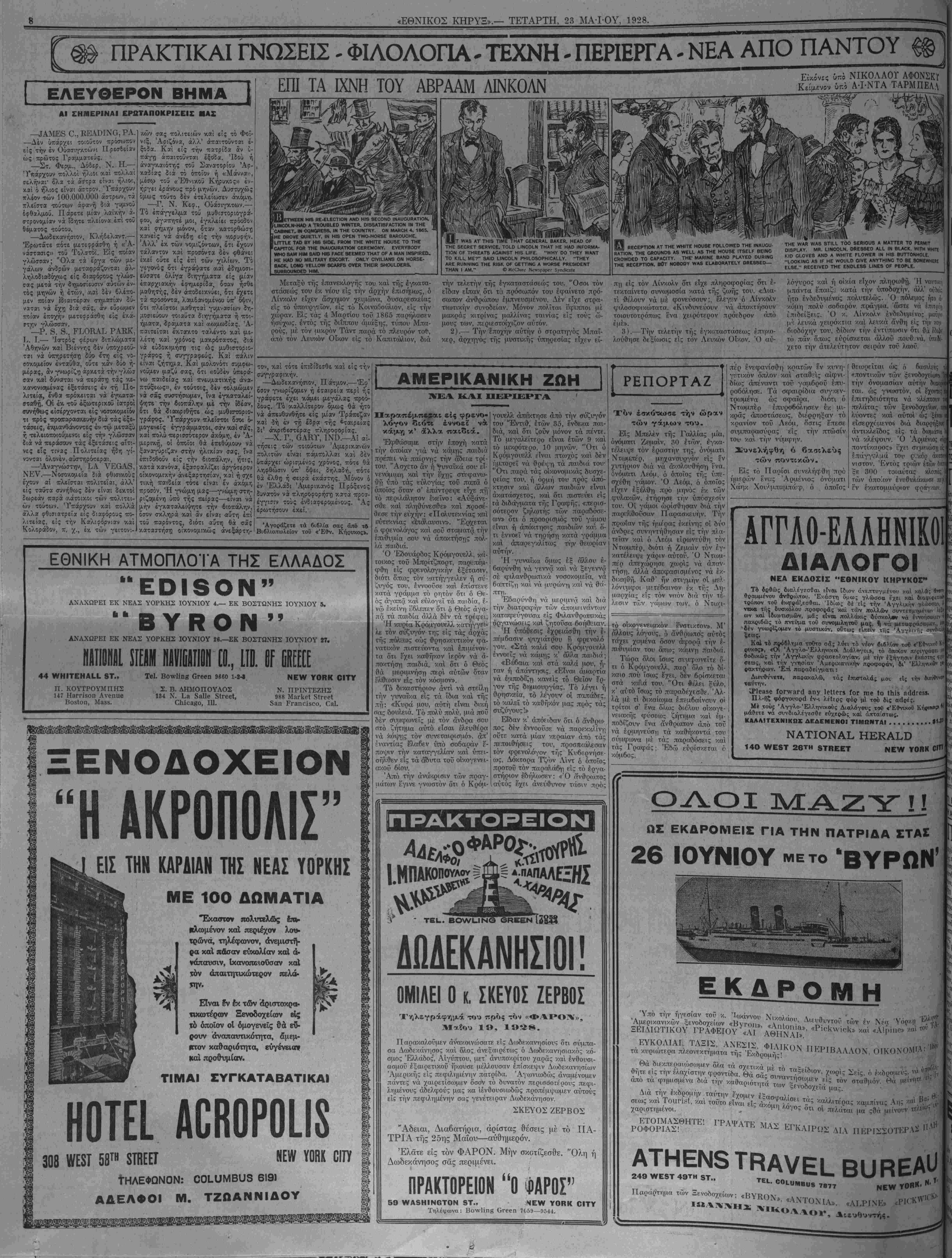 στήριον έδήλωοτν: Ο ο-'νθροιπο: αι'ιτός &χει άνείτυυνον τάσιν πρό; Π ΡΑΚΤΟΡΕΙΟΝ ΑΠΑΕΚΑΝΗΣΙΟΙ! ΟΜΙΛΕΙ Ο κ. ΣΚΕΥΟΣ ΖΕΡΒΟΣ Τηλεγράφημά τού πρός τόν «ΦΑΡΟΛ'», 1», 1988. Παρακαλούμεν άνακοινώσατε είς Δωδεκανιισίους ότι σύμπα¬ σα Δωοεκάνησο; καί δλο; άνεΗαιρέτω; ό Δ(οδεκανησιακός κό- σμος Ελλάδος*, Αιγυπτου, μετ1 άνυποκρίτον χαράς καί ενθουσι¬ ασμόν εξαιρετικόν ήκονσε μέλλονσαν επίσκεψιν Δοοοεκανησίων Άμερικής εί; πεφΛημένην πατρίοα. Άγωνιωδώς αναμένομεν πάντες νά χαιρετίσωμεν όσον τό δυνατόν περισσότερον; πεφι- λημένονς άδελο^ούς μας κα ίένθονσιωδώς προπέμψωμεν αντοΰς εί; την πεφιλημενην σα; γενέτειραν Λωδεκάνησον. ΣΚΕΥΟΣ ΖΕΡΒΟΣ "Αδειαι, Διαβατιίρια, άρίστας θεσεις μέ τό ΠΑ- ΤΡΙΑ τής 25ης Μαΐου—αυθημερόν. Έλατε είς τον ΦΑΡΟΝ. Μην σκοτίζεσθε. "Ολη ή Δωδεκάνησος σάς περιμένει. ΠΡΑΚΤΟΡΕΙΟΝ "Ο ΦΑΡΟΣ" 59 ννΑδΗΙΝΟΤΟΝ 5Τ., ΝΕνν ΥΟΗΚ ΟΙΤΥ Τηλεαωνα: Βοννΐιηβ ΟΓθεη 7059—Π544. ΡΕΠΟΡΤΑΖ Χον έβκότιωαε την ώραν των γάμων τού. Εί; Μπελέν τή; Γαλλία; μίΐα, όνόμ'αιτι ΖειμαΙν, 30 έτο>ν, έ'γν.α-