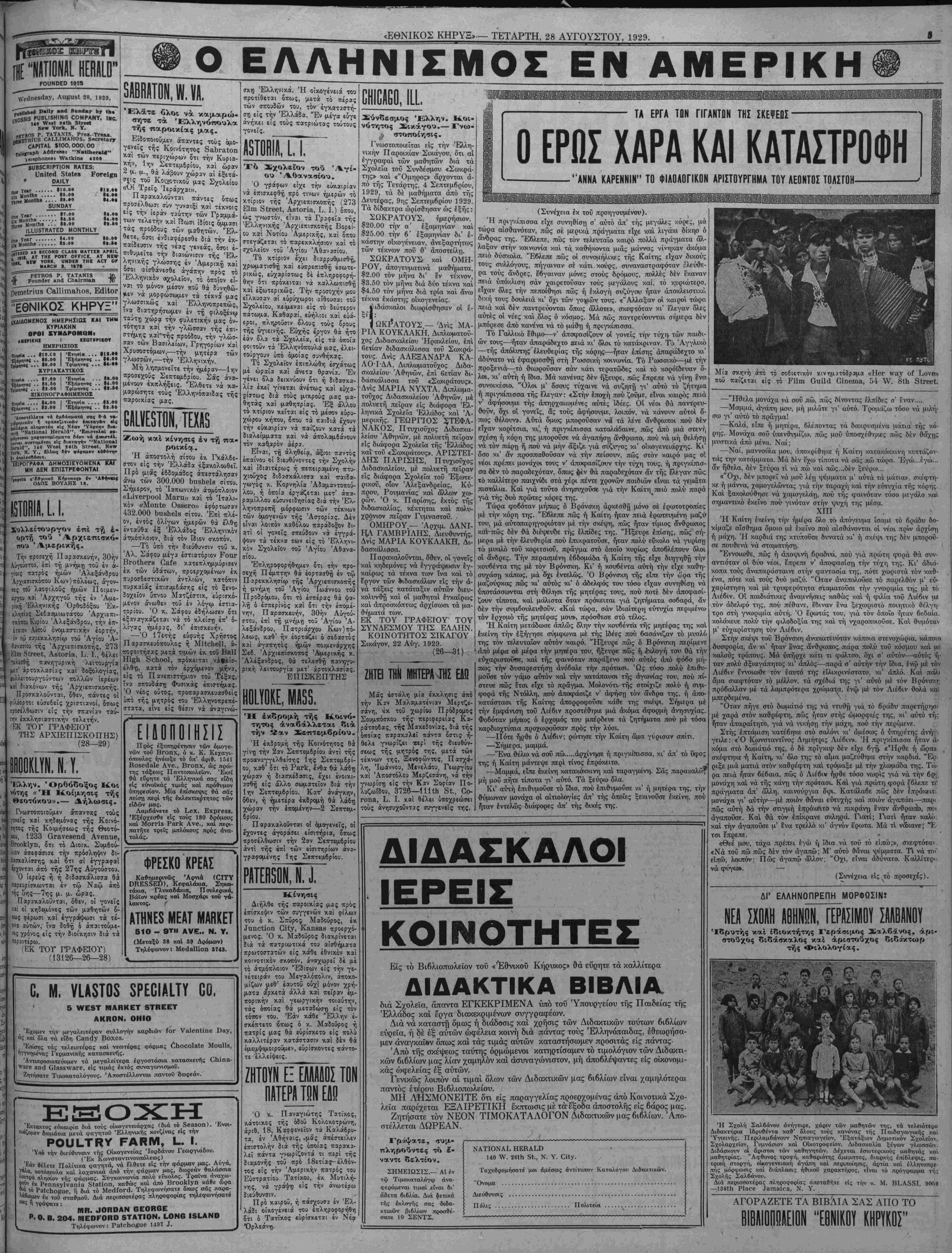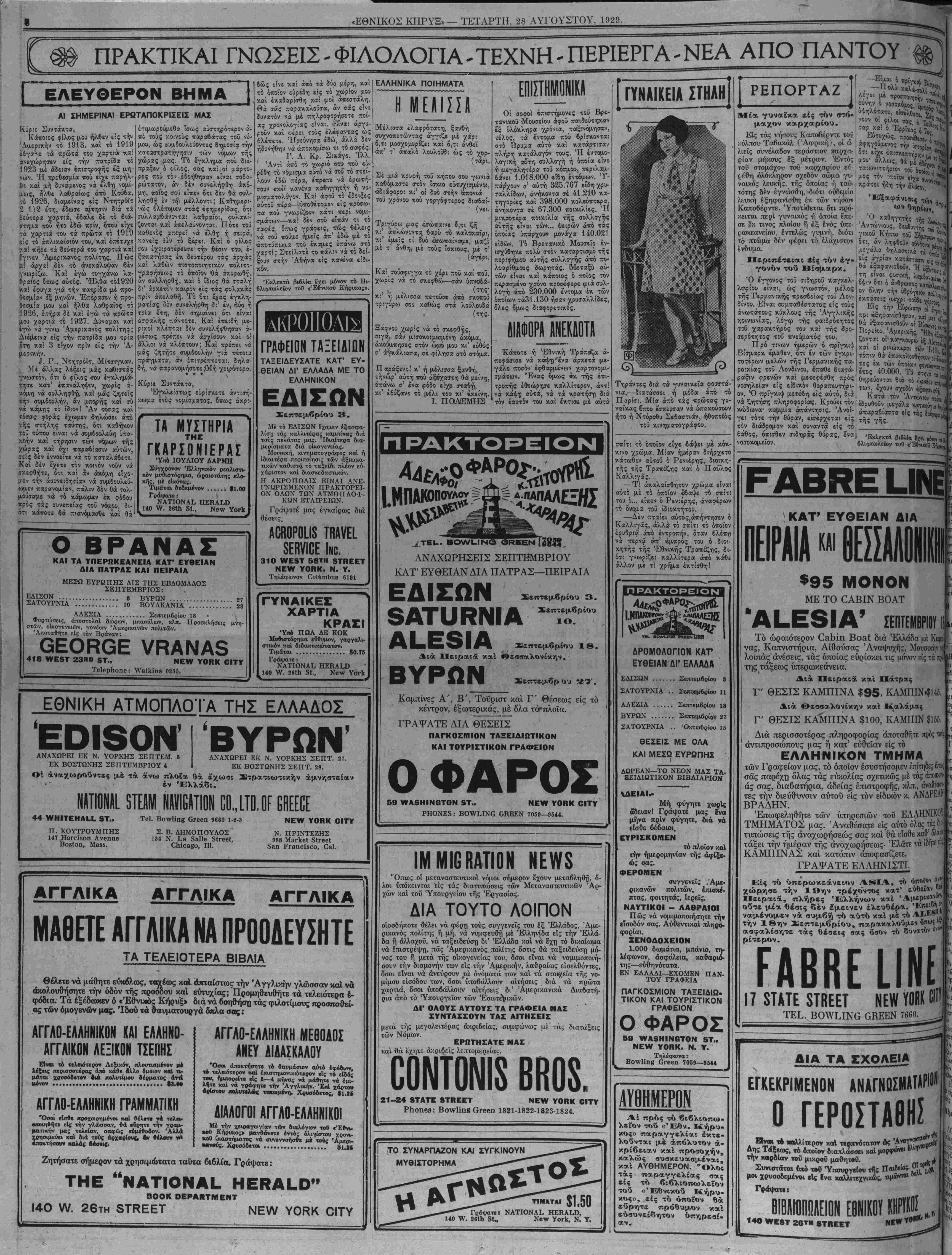ίιδριΛοΰν μεγάλα Χβτβφντυ <τ· άπαραδίαστα είς τάς ί,β^/, τής γής. Ι 'Εκλεκτά βι*Μα Ιχ* ,Α» ^ ^ ιοπωλεϊον τοϋ «Έ*νΐ)!οΒ % β βλιοπωλεϊον τοϋ ΚΑΤ' ΕΥΘΕΙΑΝ ΔΙΑ $95 ΜΟΝΟΝ ΜΕ ΤΟ ΟΑΒΙΝ ΒΟΑΤ ΣΕΠΤΕΜΒΡΙΟΥ Τό ώραιότερον Οδΐϊίη ΒοαΙ διά Έλλάδα με Καμ^ νας, Καπνιστήρια, Αιθούσας Άναψυχής, Μουσικήν) λοιπάς άνέσεις, τάς οποίας ευρίσκει τις μόνον είς τα ψ της τάξεως ύπερωκεάνεια. Δια Πειραια και Πάτρας Γ' ΘΕΣΙΣ ΚΑΜΠΙΝΑ $95, ΚΑΜΠΙΝ«$145, Διά «δ^εββαλονίκην καί Καλάμας Γ' ΘΕΣΙΣ ΚΑ'ΜΠΙΝΑ $100, ΚΑΜΠΙΝ $155, Διά περισσοτέρας πληροφορίας άποταθήτε πρός το« άντιπροσώπους μας ή κατ' ευθείαν είς τό ΕΛΛΗΝΙΚΟΝ ΤΜΗΙΫιΑ των Γραφείων μας, τό οποίον έσυστήσαμεν έπίτηδες ά σάς παρέχη όλας τάς ευκολίας σχετικώς μέτάςάποσχεν άς σας, διαβατήρια, αδείας έπιστροφής, χλπ., άναβίίβ» τες την διεύθυνσιν αυτού είς τόν ειδικόν κ. ΑΝΔΡΕΑΣ ΒΡΑΔΗΝ. 'Επωφεληθήτε των ύπηρεσιών τοΰ ΕΛΛΗΝΙΚΟϊ ΤΜΗΜΑΤΟΣ μας. Άναθέσατε είς αύτό όλας τας» τυπώσεις τής αναχωρήσεως σας καί θά είσθεκαθ'ολαο τάξει την ημέραν τής αναχωρήσεως· Έλάτε νά ίδητε $ ΚΑΜΠΙΝ ΑΣ καί κατόπιν άποφασίζετε. ΓΡΑΨΑΤΕ ΕΛΛΗΝΙΣΤΙ. Είς τί» ϋπ&ρ<οκ&άν*ιθν Α8ΙΑ, τί» οποίον χώρηβ* την 1»ην τρέχοντος κατ' εύθίί*ν οΰτβ μία Θέσις δέν έμεινεν ελευθέρα. ναμένομεν να αυμ6$ το αύτό και μέ τδ την Ιβην _επτεμβρίου, παρακαλούμεν 0«ωί;·ί ασφαλίοητε τας θέβεις βας δαον τ6 δυνατόν «ν ρίτερον. ΓΑΒΒΕ ίΙΝΕ 17 3ΤΑΤΕ 8ΤΒΕΕΤ ΝΕΗΥΟΒΚ ΤΕ^. ΟΚΕΕΝ 7660. ΔΙΑ ΤΑ ΣΧΟΛΕΙΑ ΕΓΚΕΚΡΙΜΕΝΟΝ ΑΝΑΓΝΩΣΜΑΤ Ο ΓΕΡΟΣΤΑΒΗΪ ΕΙι— το «αλλί—ρον κοΛ τβρπνότατοτ 45 Ανα Δης Τάξεοις, το οποίον διαπλασσει καί μορφ»»·» την καρδίαν τοΰ μικραί μαθητοϋ. ^ -υνιστδται *πδ τοϋ Ύηουργείου τής Π«8βΙε» 01**^ μοί χρυσοδεμένβι είς Ινα χαλλιτεχνικώς, τιμώντ» οβ* Γράψατε» 2βΤΗ 8ΤΒΕΕΤ