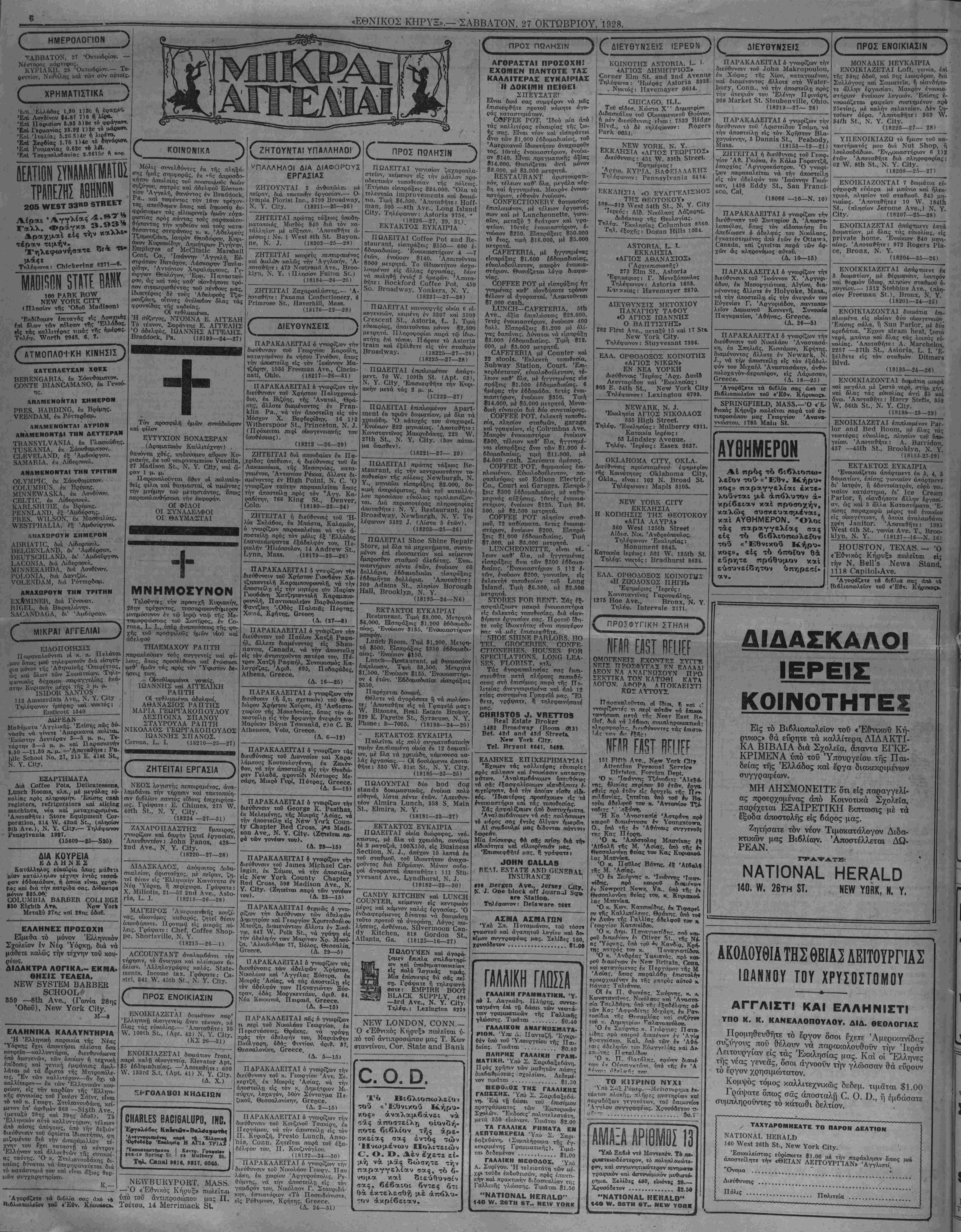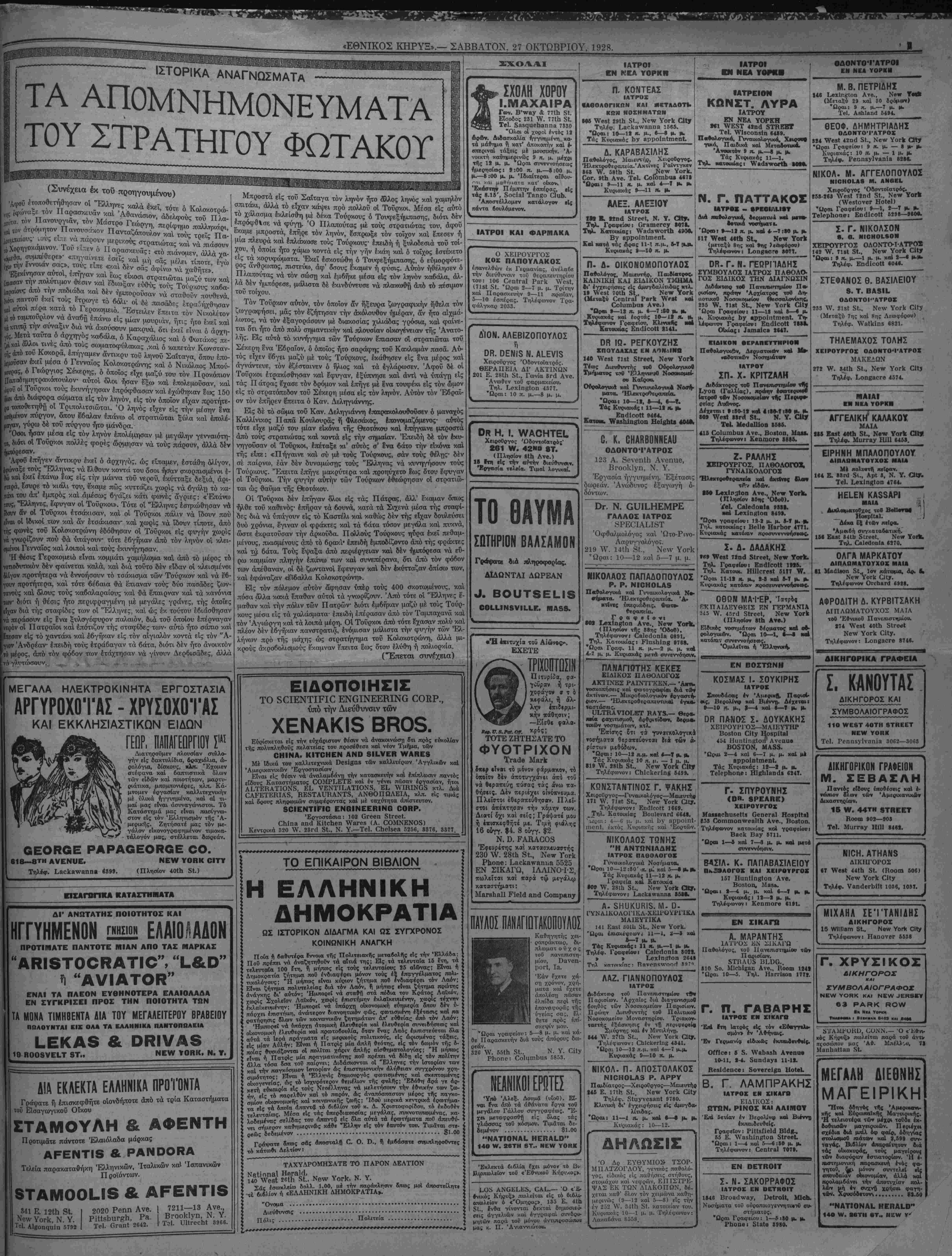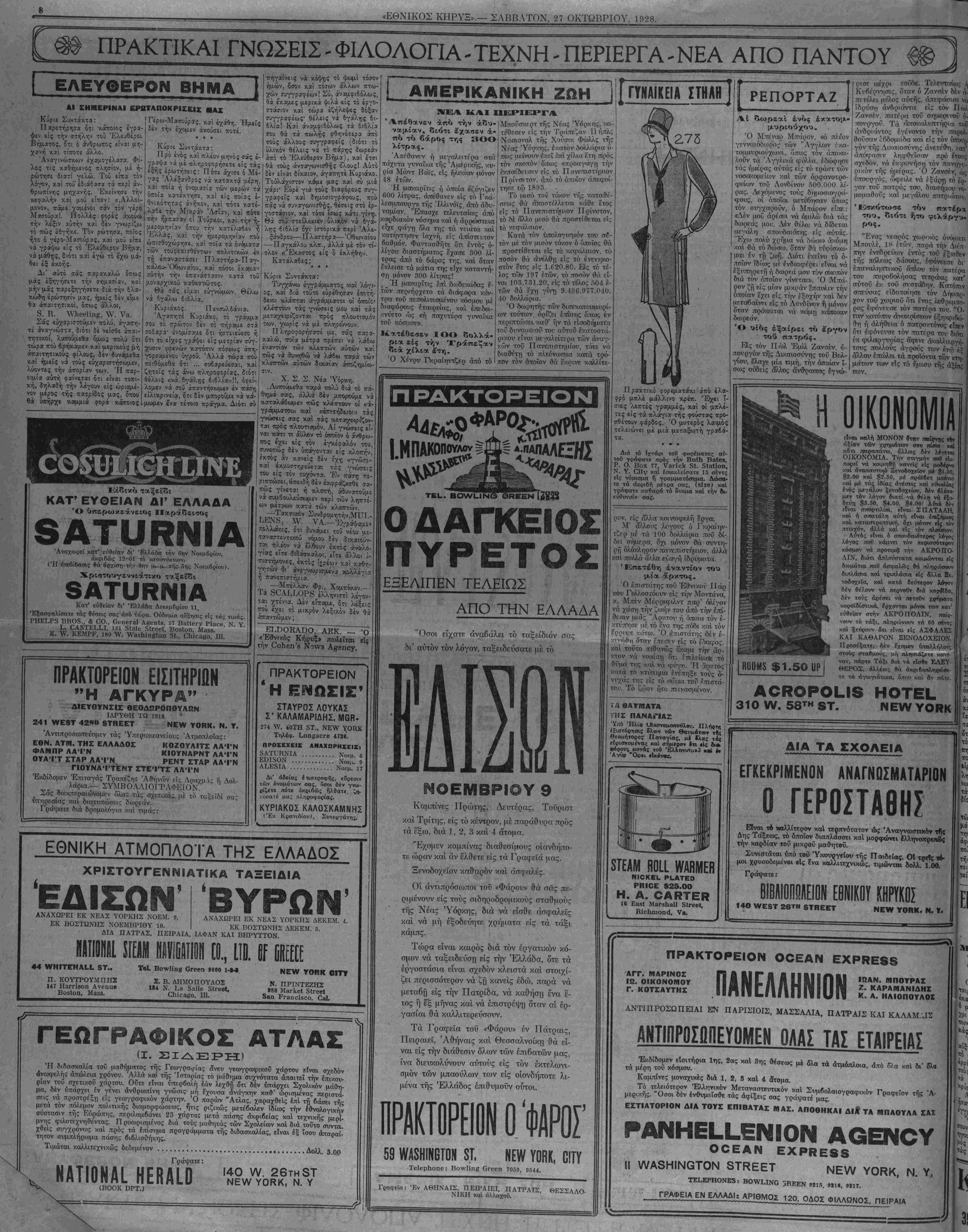 στούς σταθμούς, μή πλησιάζετε κα·<- ναν, πάρτε Τάξι διά ν* είσθε ΕΛΕΥ- ΘΕΡΟΣ, άλλέως θά άκοιβοπληρώσι- τε τα άγωγιάτικα, δπου καί αν πδτε. ΑΟΡΟΡΟίΙβ ΗΟΤΕί 310 νν. 58™ 8Τ. ΝΕνν ΥΟΝΚ 3ΤΕΑΜ ΗΟίί ννΑΗΜΕΒ ΝΙΟΚΕί ΡίΑΤΕΟ ΡΒΙΟΕ $25.00 Η. Α. ΟΑΡΤΕΡ 16 Εαβΐ ΜβΓδηβΙΙ διτεβι, Κίεηηιοηά, V». ΔΙΑ ΤΑ ΓΧΟΛΕΙΑ ΕΓΚΕΚΡΙΜΕΝΟΝ ΑΝΑΓΝΟΣΜΑΤΑΡΙΟΝ Ο ΓΕΡΟΣΤΑΘΗΣ Είναι τό καλλίτερον καί τερπνότατον ώς Αναγνωστικόν τής Αης Τάξεως, τό οποίον διαπλάσσει καί μορφώνει έλληνοπρβπόος την καρδίαν τοϋ μικροϋ μαθητοΰ. Συνιστάται υπό τοϋ Υπουργείον τής Παιδείας. ΟΙ τρείς το- μοί χρυσοδεμένοι είς ?νο καλλιτεχνικώς, τιμώνται δολλ. 1.00. Γράψατε: Σ 14Ο ννΕ5Τ 26ΤΗ 8ΤΗΕΕΤ ΥΟΙΙΚ. Ν. ¥. 59 ννΛδΗΙΝΟΓΟΝ 8Τ. ΝΕνν ΥΟΒΚ, ΟΙΤΥ Τεΐερήοηβ: ΒοννΗηβ ΟΓεεη 7059, 9544. Γραφεία: Έν ΑΘΗΝΑΙΣ, ΠΕΙΡΑΙΕΙ, ΠΑΤΡΑΙΣ, ΘΕΣΣΑΛΟ- ΝΙΚΗ καί αλλαχού. ΠΡΑΚΤΟΡΕΙΟΝ ΟΟΕΑΝ ΕΧΡΒΕ88 ΑΓΓ. ΜΑΡΙΝΟΣ ΙΩ. ΟΙΚΟΝΟΜΟΥ Γ. ΚΟΤΣΑΥΤΗΣ ΠΑΝΕΛΛΗΝΙΟΝ ΙίΙΑΝ. ΜΠΟΥΡΑΣ Ζ. ΚΑΡΑΜΑΝΙΔΗΣ Κ. Α. ΗΛΙΟΠΟΥΛΟΣ ΑΝΤΙΠΡΟΣΩΠΕΙΑΙ ΕΝ ΠΑΡΙΣΙΟΙΣ, ΜΑΣΣΑΛΙΑ, ΠΑΤΡΑΙΣ ΚΑΙ ΚΑΛΑΜΑΙΣ ΑΝΤΙΠΡΟΣΩΠΕΥΟΜΕΝ ΟΛΑΣ ΤΑΣ ΕΤΑΙΡΕΙΑΙ Έκδίδομεν είσιτήρια 1ης, 2ας καί 3ης θέοεως μέ δλα τα άτμόπλοια, άπό ο7.α καί δι' δλα τα μέρη τού κόσμον. Καμπίνες μοναχικές διά 1, 2, 8 καί 4 άτομα. Τό τελειότερον "Ελληνικόν Μεταναστευτικόν καί Συμβολαιογραφικόν Γραφείον της Ά· μερικης. Οσοι δέν ενθυμείσθε τας αφίξεις σας γράψατέ μας. ΕΣΤΙΑΤΟΡΙΟΝ ΔΙΑ ΤΟΥΣ ΕΠΙΒΑΤΑΣ ΜΑΣ. ΑΠΟΘΗΚΑΙ ΔΙ* ΤΑ ΜΠΑΟΥΛΛ ΣΑΣ ΡΑΝΗΕίί^ΝΙΟΝ ΑΟΕΝΟΥ ΟΟΕΑΝ ΕΧΡΡΕδδ II ννΑδΗΙΝΟΤΟΝ 3ΤΡΕΕΤ ΝΕνν ΥΟΚΚ, Ν. Υ, ^ΕΡΗΟΝ—: ΒΟVV^IΝΟ 5ΗΕΕΝ «215. 91ΐε. 9217. ΓΡΑΦΕΙΑ ΕΝ ΕΛΛΑΔΙ; ΑΡ1ΘΜΟΣ 120. ΟΔΟΣ ΦΙΛΛΠΝΟΣ, ΠΕΙΡΑΙΑ