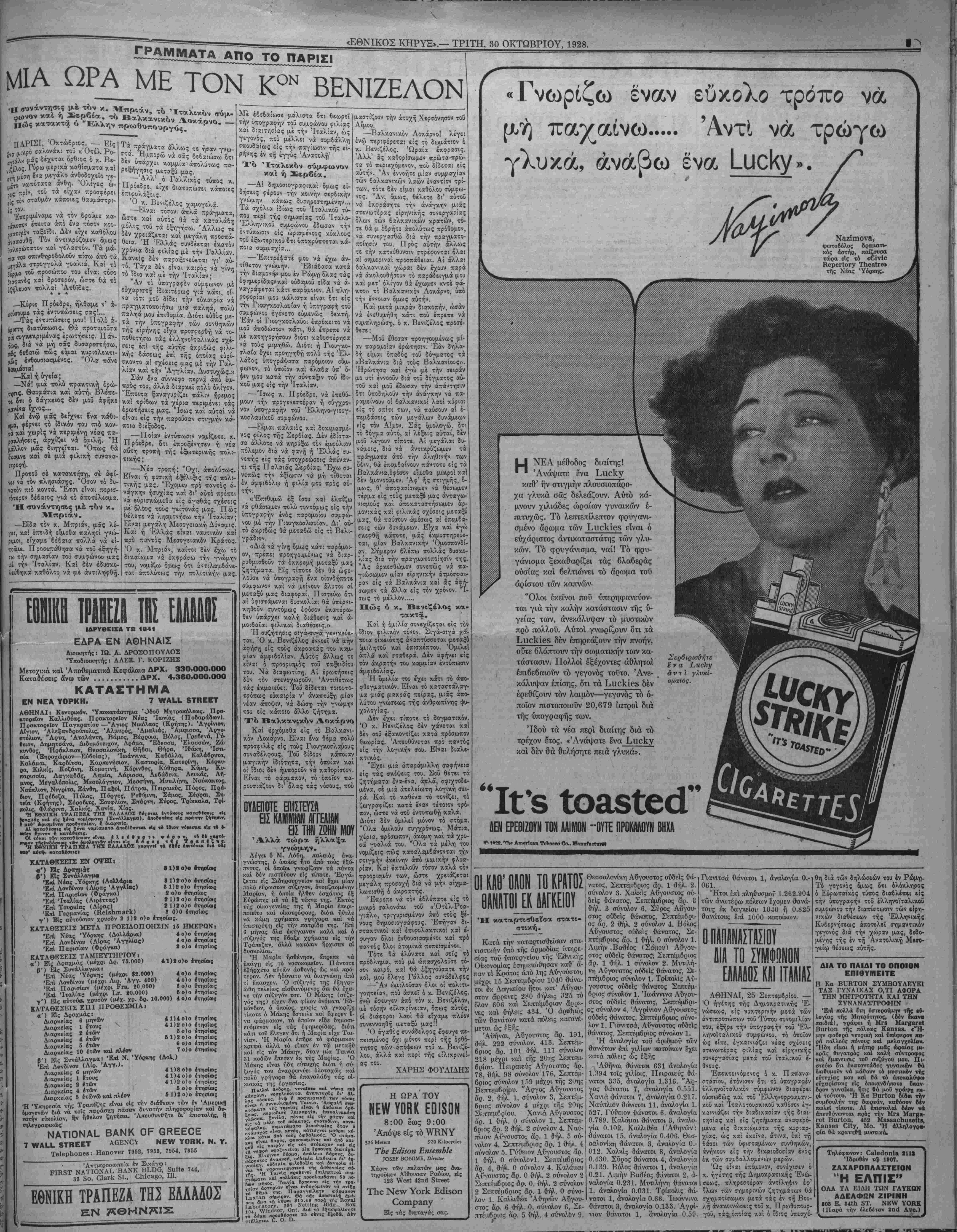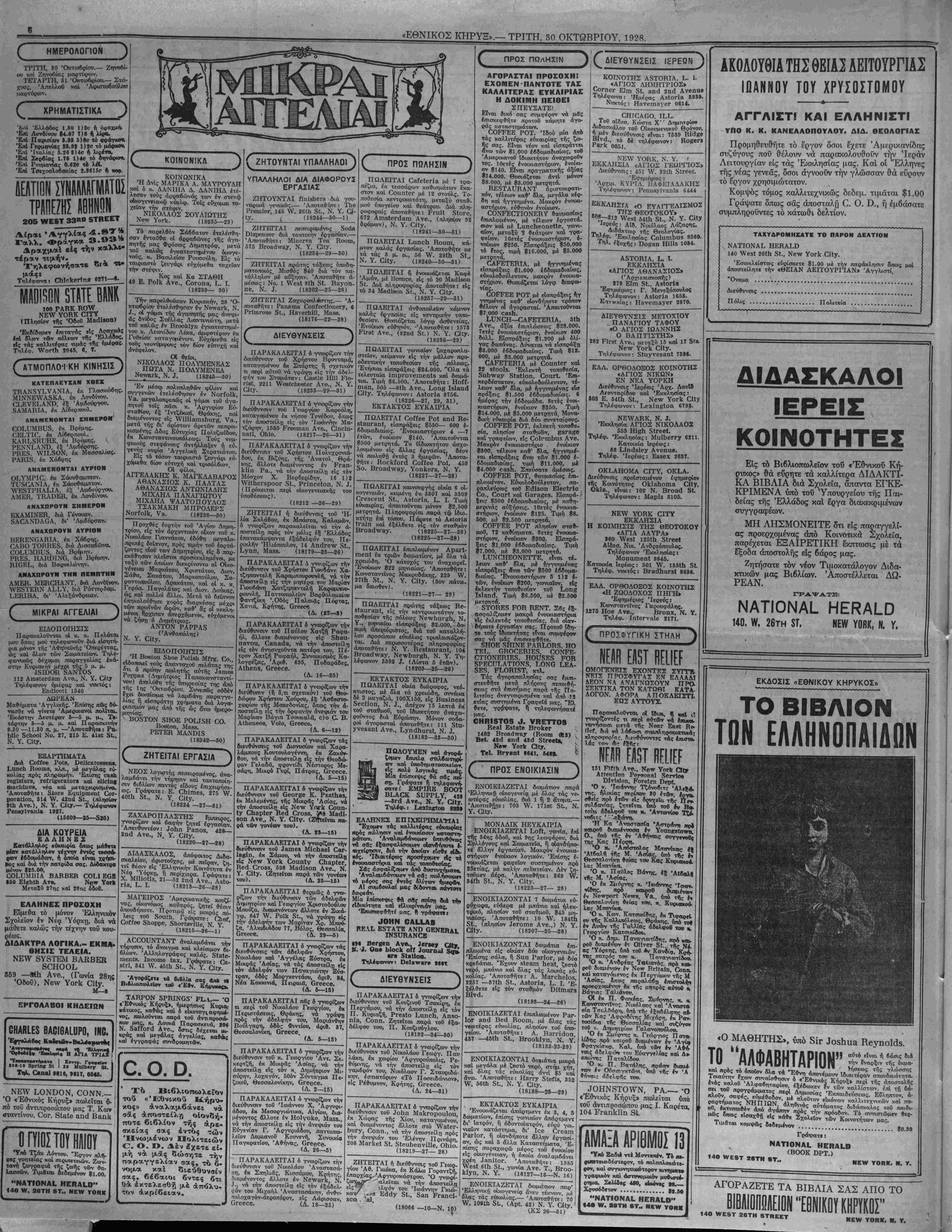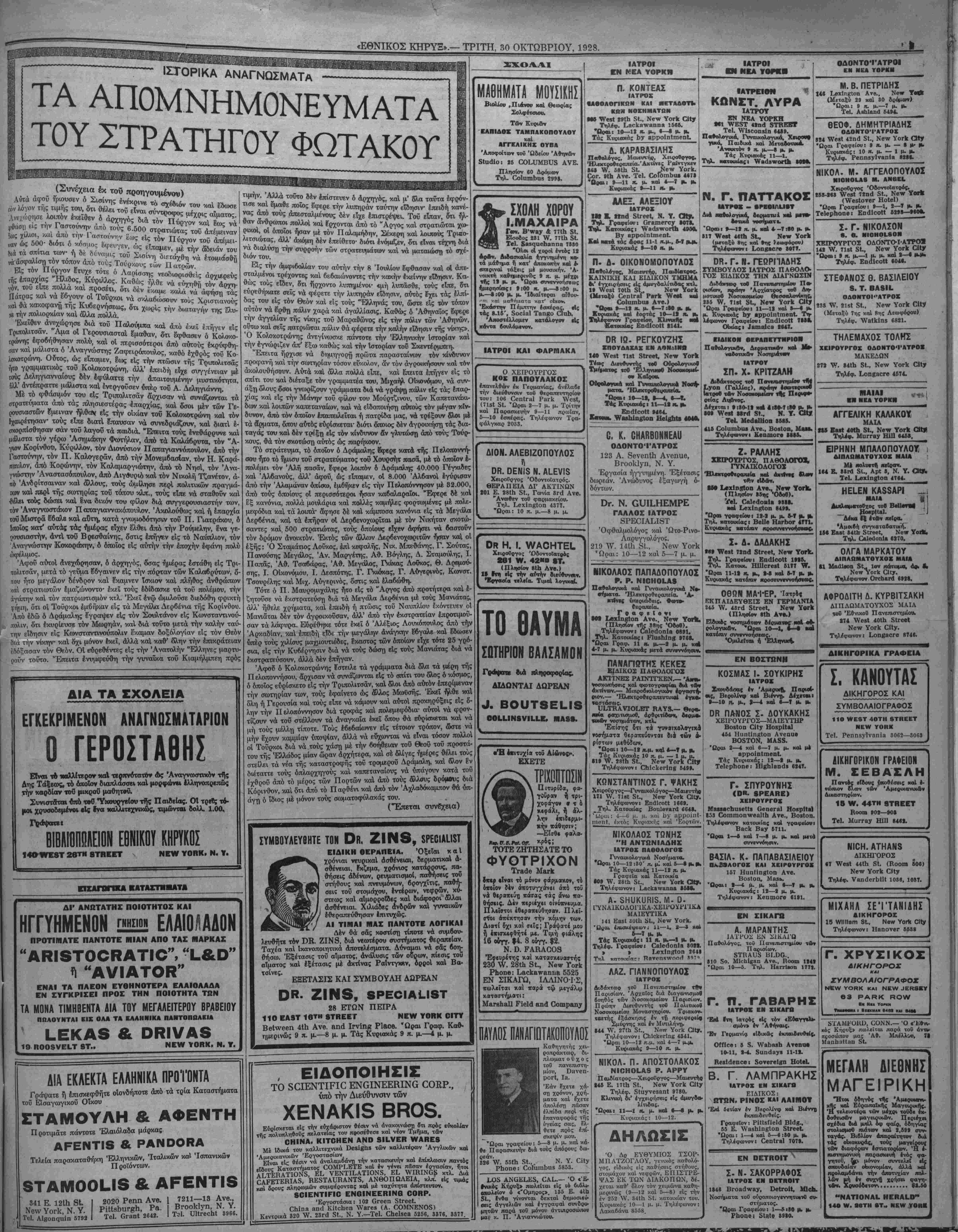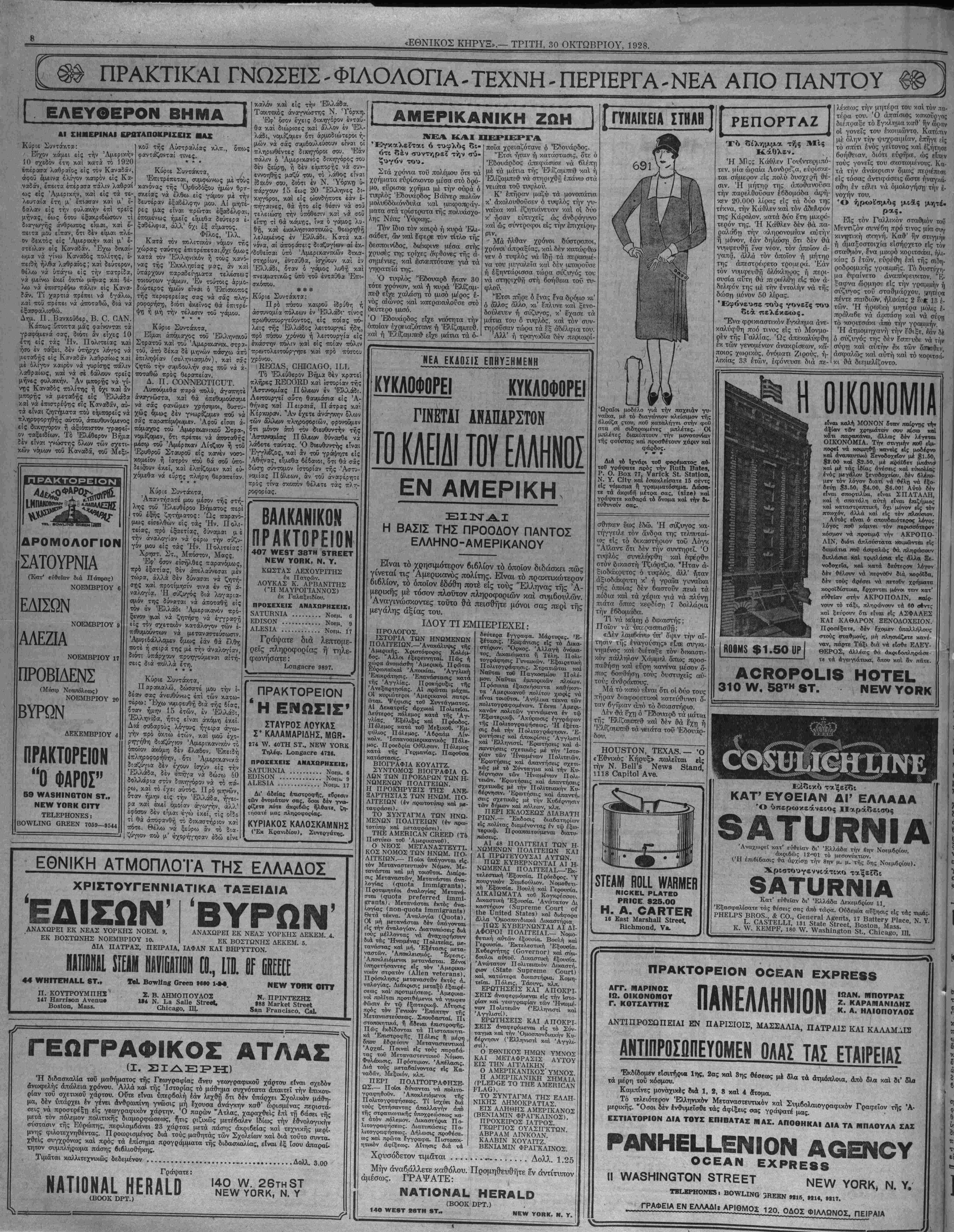 <'Εθνικός Κηρυξ» πωλεϊται είς την Ν. ΒβΐΓδ Νβννβ Θίίΐηιΐ 1118 Οβρϊίοΐ Ανθ. ΡΕΠΟΡΤΑΖ Τδ δίλημυμ* τί,ς λέκεως την μητίρα τού καί τόν πα- τέρα τού. Ό άπαίσιθς κακοΰργος ϋιεπραξε τό Εγκλημα καθ' ήν ώραν οί γονεϊς τον έκοιαώντο. Κατόπιν μέ όλην την ψυχραιμίαν, επήγε είς τό σπίτι ενός γείτονος καίέζήτησε δοήθ'ειαν, διότι ευρήκε, ώς εΙπΕν τοΰς γονεϊς τού σκοτωμένους. Κα¬ τά την ανάκρισιν δμως περιέπεσε είς τόσας άντιφάσεις (οστε ηναγκά¬ σθη έν τέλει νά ομολογήση την |- νοχήν τού. Ό ήρωϊσμός μιθίς μήτε· Είς τόν Γαλλικόν σταθμόν τοΰ Μΐντιζόν συνέβη πρό τινος μία συγ κινητική (Τκηνή. Καθ1 ην στιγμήν ή άμαξοστοιχίαι εΐσήρχετοεΐζ τόν <~α·θμόν. Ινα μιικρό κοριτσάκι, ήλι- κίας 5 έτών, ευρέθη επί τής σιδη- ροδρομικής γραιαμΐης. Τό συστύχη- μα Εφαίνετο αναπόφευκτον. "Ε¬ ξαφνα ώρμησε είς την γραμαήν ή σΐ'ζυγος τοϋ στα8μάρχου, μητέρα πέλτε πω&ϋίν, ήλιΐκίας 2 εο*; 13 |- τών. Ή ήρωϊκή αητέρα μόλις Ι- πρόλαβε νά άρντάστ) καί νά σνοη τό ·κοοιτσάκι ιΐπο την γραμμήν. Ή άτμομηχανή την εθιξε, έΐάν δέ δ σύζυγός της δέν εΌττ^υοιε να την σί'ρτ) καί αιιτηγ έκ των δπισθεν, ασφαλώς καί αυτή καί τό κοριτσά- κι θ·ά διεμελίζοντο. Β00Μ5 $1.50 ϋΡ 310 «ν. 58™ 8Τ. •Ιναι καλή ΜΟΝΟΝ δταν παι'ονη.ς την αξίαν τΛν χοηματαίν σου πίσω καί κατι παραΛάντο, άλλως δέν λέγβται ΟΙΚΌΝΟΜΙΑ. Την στιγμήν —<0 εΐμ- ποο€( νά κοιμηθή κανείς είς μοδέρνο καί άναπαυτικό Ξενοδοχβΐον μέ $1.60, $8.00 καί $2.50, μέ «οάϊβετ μΛβνισ· καί μέ τάς Ιδίας άνέσβις καί ευκολίας ενός μεγάλον ξενοΛοχείόυ, δέν βλέπο¬ μεν τόν λόγον διατί νά θέλη νά έξο- δεύπ $β.6Ο, $4.00, $6.00! Αύτό βέν είναι σπορτιλΐοα, είναι ΣΠΑΤΑΛΗ, καί ή σπατάλη αυτή είναι έπιζήμιος καί καταστρεπτική, δχι μόνον είς; τόν πτωχόν, άλλά καί είς τόν πλούσιον. Αύτός είναι ό σπουβαιότβρος λόγος λόγος π»0 κάμνβι τόν πβρισσότβρον κόσμον νά προτιμ$ την ΑΚΡΟΠΟ¬ ΛΙΝ, διότι άπλούστατα κοιμωνται βίς βωμάτια ποθ ασφαλώς θά πληροίκΐονν οιπλάσια καί τριπλάσια είς άλλα Ξε- νοβοχεία, καί κατά δεύτερον λόγον δέν θίλουν νά "πβρνσθν διά κορόΐθα, δέν τούς άρέσ« νά πβτσθν χρήματα κοροΐβίστικα, ίρχονται μόνοι των κατ' ευθείαν στήν ΑΚΡΟΠΟΛΙΝ, ιιαίρ- νουν τό τάξι, πληρώνουν τα βθ σέντς καί ξευρουν δτι είναι βίς ΑΣΦΑΛΕΣ ΚΑΙ* ΚΑΘΑΡΟΝ ΞΕΝΟΔΟΧΕΙΟΝ. Προσέξατβ, οέν έχομεν ΰπαλλήλους στούς σταθμους-, μή πλησιάζβτε κανέ- ναν, πάρτβ Τάξι διά νά είσθε ΕΛΕΥ¬ ΘΕΡΟΥΣ, άλλέιτς θά άκοιβοπληρώσε- τε τα άγωγιάττχα, ίπου καί βν πάτε. ΗΟΤΕΙ. ΝΕννΥΟΝΚ 3ΤΕΑΜ ΗΟίί ννΑΗΜΕΗ ΝΙΟΚΕί ΡίΑΤΕϋ ΡΒΙΟΕ 825.00 Η. Α. ΟΑΚΤΕΝ 16 Ηιεηηιοηά', Υβ. ΚΑΤ' ΕΥΘΕΙΑΝ ΔΙ' ΕΛΛΑΔΑ Ό ύ«&ρα»?βάν£ΐθς ΙΙαράοΊισθς δΑΤυΚΝΙΑ Αναχωρεί κατ' ευθείαν βι' 'Ελλάδα την 6ην Νοεμβρίου, ακριβώς 12<-01 τό μεσονύκτιον. (Ή έπιβίβασις θά άρχίστι την 8ην μ. μ. τής 5ης Νοεμβρίου). δΑΤυΚΝΙΑ Κατ' ευθείαν δι' 'Ελλάδα Δεκεμβριού 11. Έξασφαλίσατε τάς θέσεις σας άπό τώρα. Ούδεμία αδξησις είς τάς τιμάς. ΡΗΕίΡδ ΒΚΟ5., & αθ., ΟεποΓΗΐ Αβεηίδ, 17 ΒαΙΙβΓν Ρΐβοβ, Ν. Υ. Ι,. ^Α5ΤΕ^^I, 131 51αΙε δΐΓβεΙ, ΒθδΙοη, Μα58. Κ. νν. ΚΕΜΡΡ, 180 νν. νναδήίηβΐοη 51., Οιϊοαβο, 111. ΠΡΑΚΤΟΡΕΙΟΝ ΟΟΕΑΝ ΕΧΡΚΕ88 ΑΓΓ. !ίΙΑΡΙΝΟΓ ΙΩ. ΟΙΚΟΝΟΜΟΥ Γ. ΚΟΤΣΑΥΤΗΣ ΠΑΝΕΛΛΗΝΙΟΝ ΙΩΑΝ. ΙτΙΠΟΥΡΑΙ Ζ. ΚΑΡΑΜΑΝ1ΔΗΖ Κ. Α. ΗΛΙΟΠΟΥΛΟΧ ΑΝΤΙΠΡΟΣΩΠΕΙΑΙ ΕΝ ΠΑΡΙΣΙΟΙΣ, ΜΑΣΣΑΛΙΑ, ΠΑΤΡΑΙΣ ΚΑΙ ΚΑΛΑΜΑΙΣ ΑΝΤΙΠΡΟΣΩΠΕΥΟΜΕΝ ΟΛΑΣ ΤΑΣ ΕΤΑΙΡΕΙΑΙ Έκδίδομβν βΐσιτήρια 1ης, 2ας καί 3ης θέσεα>ς μέ βλα τα άτμόπλοια, άπό βλα καί 8Γ δλο