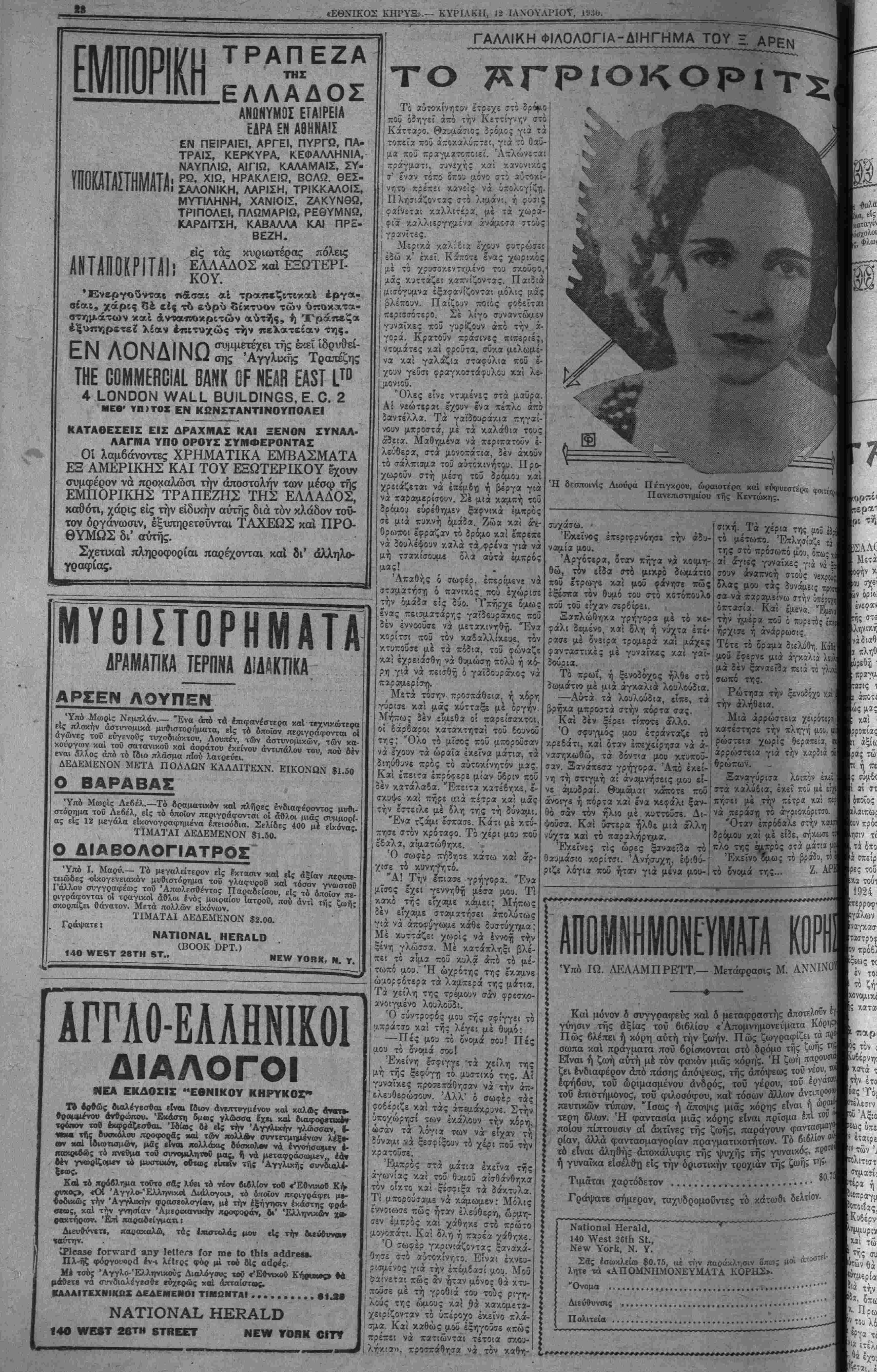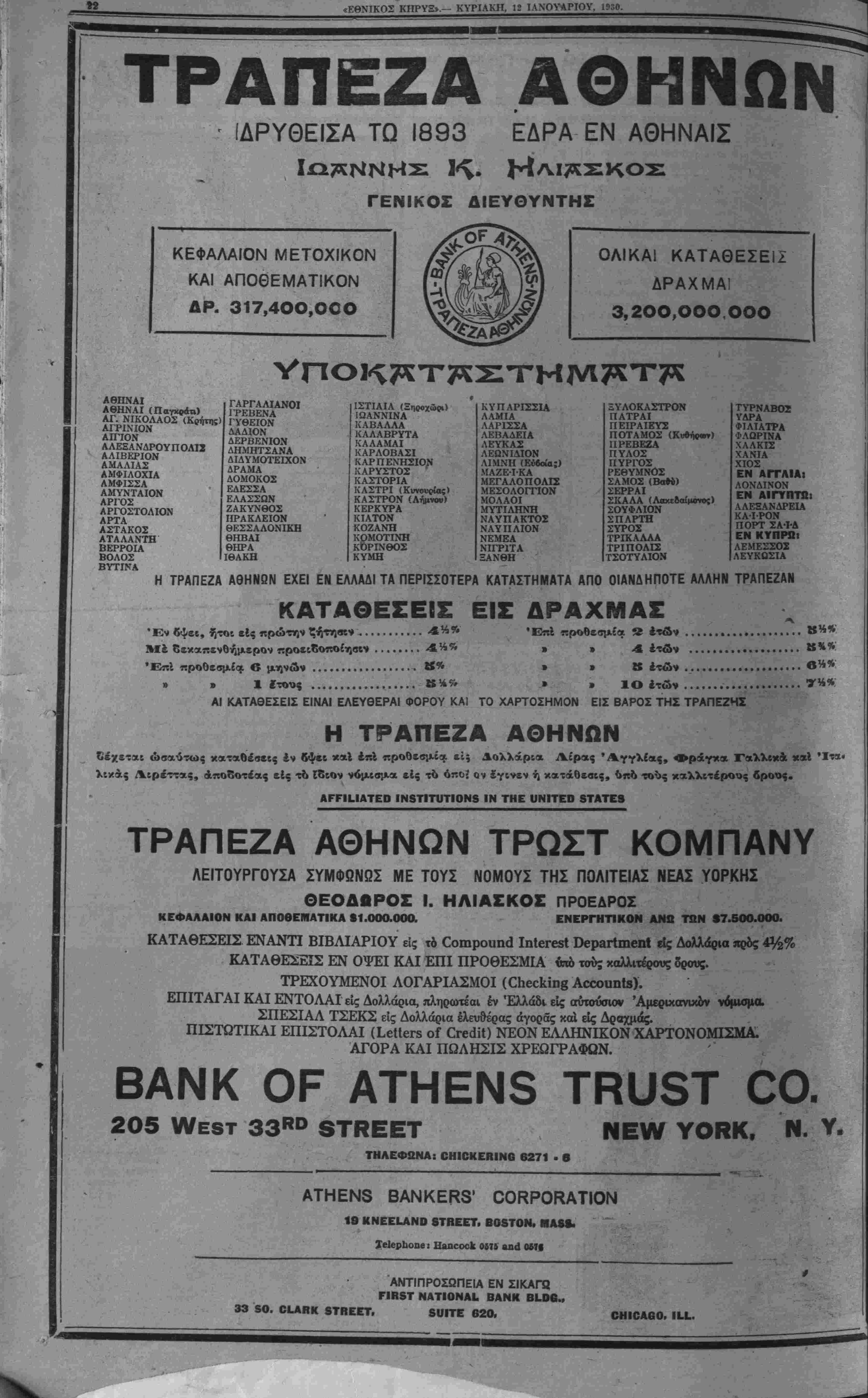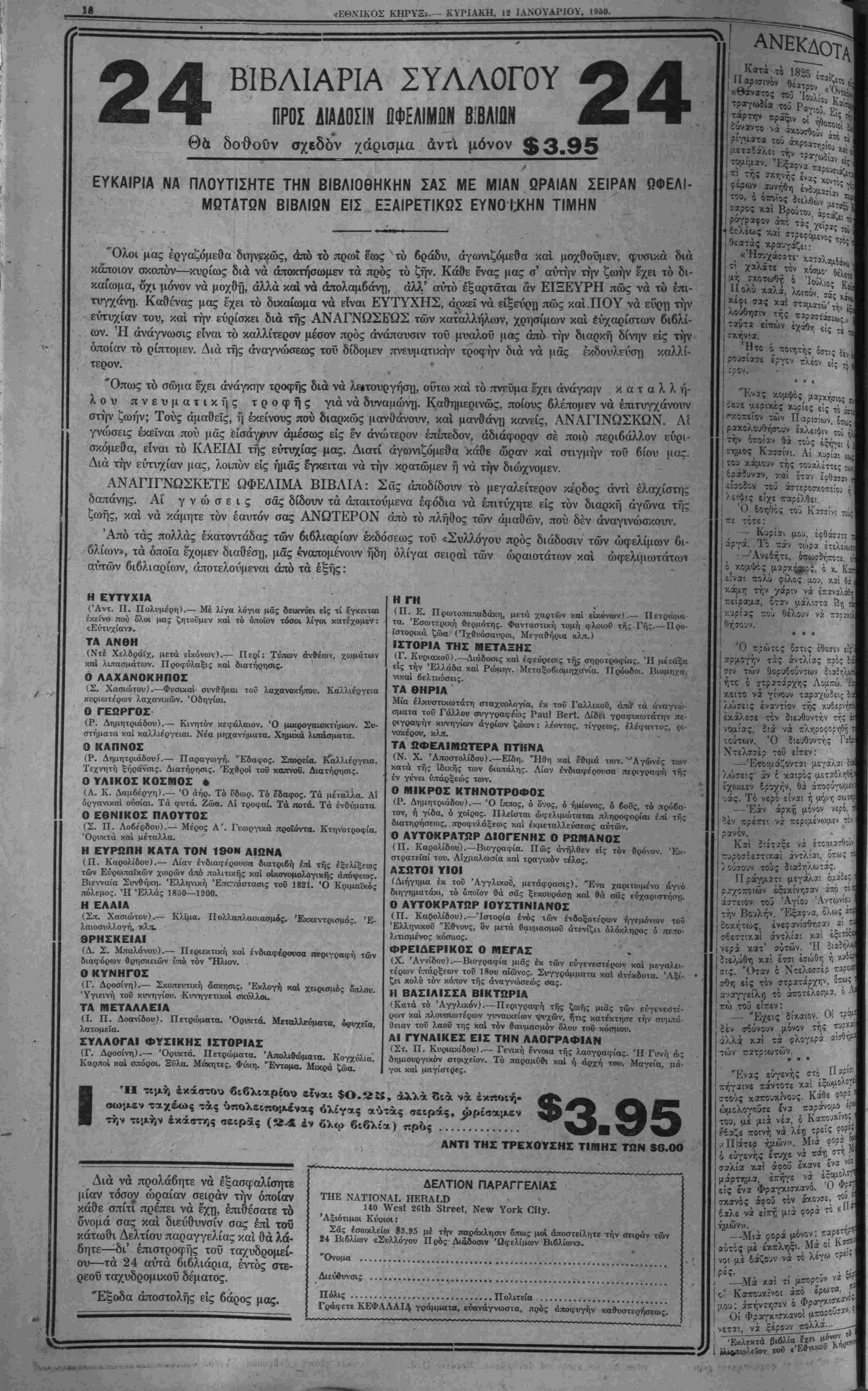 τ<*» σος. Δέν κηλιδώνει την χκραλήν 1 τα ροδ-.α. Μεγάλη ψιάλη 1.00 δολλ. μέ την άγγιλΐαν ταύτη». ΟΕΝΕΠΑΙ. ΡΒ00ΙΙ0Τ5 ίΑΒΟΗΑΤΟΗΙΕ5, Ν. Η. 703 — 5ι1ι δι-, Ν. ν/. ν35ΐιίη§ΐοη, ϋ. Ο. 'ΕπΜΓτρέ?εται ΐ(; την 'ΕλλάΟα ντε Αμερικανικόν θ«ραικντήο«·)ν Κ. ΛΙΝΑΡΔΟΥ Μό; Σανκοάτοΐίς &οι». II Άθήν* ΰ ασφαλώς χαΐ άναιον- ά λ Ευμ νχκτημβτα. Μέθοδθΐ νε-^τάτι». ΦΥΟΤΡΙΧΟΝ ΤΟ ΜΟΝΟΝ ΦΑΡΜΑΚΟΝ ΠΑ ΤΑ ΙΗΑΛΛΙΑ ΣΑΣ Κατά την βοτανι- κήν είναι «ΚΑΘΕ ΡΙΖΑ διά ΚΛΘΕ ΠΑΘΗΣΙΝ» έ- τομένως τό ΦΥ- ΤΡΙΧΟΝ τό ό- παράγεται ρους είναι τό μό¬ νον άντίδοτον διά άπό ρίζας καί βπό τα μαλλιά σας. Κβ8· ϋ.δ.Ρβι. ΟΗ.'Εξαλείφει την Ν. Ο. ΡΑΒΑΚΟ5 πι,ιυρίόα, σταμα- 'ΕνΕυβέτης χαΐ τή χήν φαγούραν καιοσχΐυαατής. χ<χΐ τρΐχόπχωβΐν 136 νν*. 42ηα δΐ,καί θεραπεΰει ά Νβ— Υογ^ ΟΚν. λανθάστως έκξέ- ΜβιΙ&ΙΙϊοη 3814 ματα και τρΐχο- φάγον, δέν περιέ- χει Ο1ΝΟΠΝΕΥΜΑ ή άλλας χη- ιαχάς, η λιπώδεις θυσίας, διατη- ρεί τό κχένισιια όλην την ημέραν χαί έπαναφέρει τό φυσιχόν χρώμα Ηΐς τα μαλλιά σας. Άξίζει μί/ δο- κιμή διά νά πεισθήτε. Γράψατε την κατάστασιν σας διά νό^ ταρασχενά- οω τό φάρμακον αναλόγως. Πω- λεϊται είς 8 καί 16 ούγγιών φιά- λας, πρός $2.00 καί $4.00. Στέλ- Αεται παντοϋ προπληοωτέον ή & Ο. Ώ. Έν αηϊ-αβο, 111. πωλεϊται είς τό ΜαΓδήβΙΙ Ρΐβΐιΐ δΐθΓβ. ΑΓΓΛΙΚΗ ΣΧΟΛΗΤΒΙΟΗ Α Μόνον $5.00 μηνιαίως. Διδασκα-λία άτομική, Άγγλιστί—'ΕλληΛ-ι- στί, παρ' Άμίρικανίδος, κατόχοΰτής Έλληνικής. 'Ανοικτή οπό 10 .τ- μ. εως 10 μ. μ. % 5Β4 - 7ΤΗ ΑνΕ. (Μεταξύ 40—41ης 'ΟδΛ) ΝΕ¥Τ ΥΟΒΚ