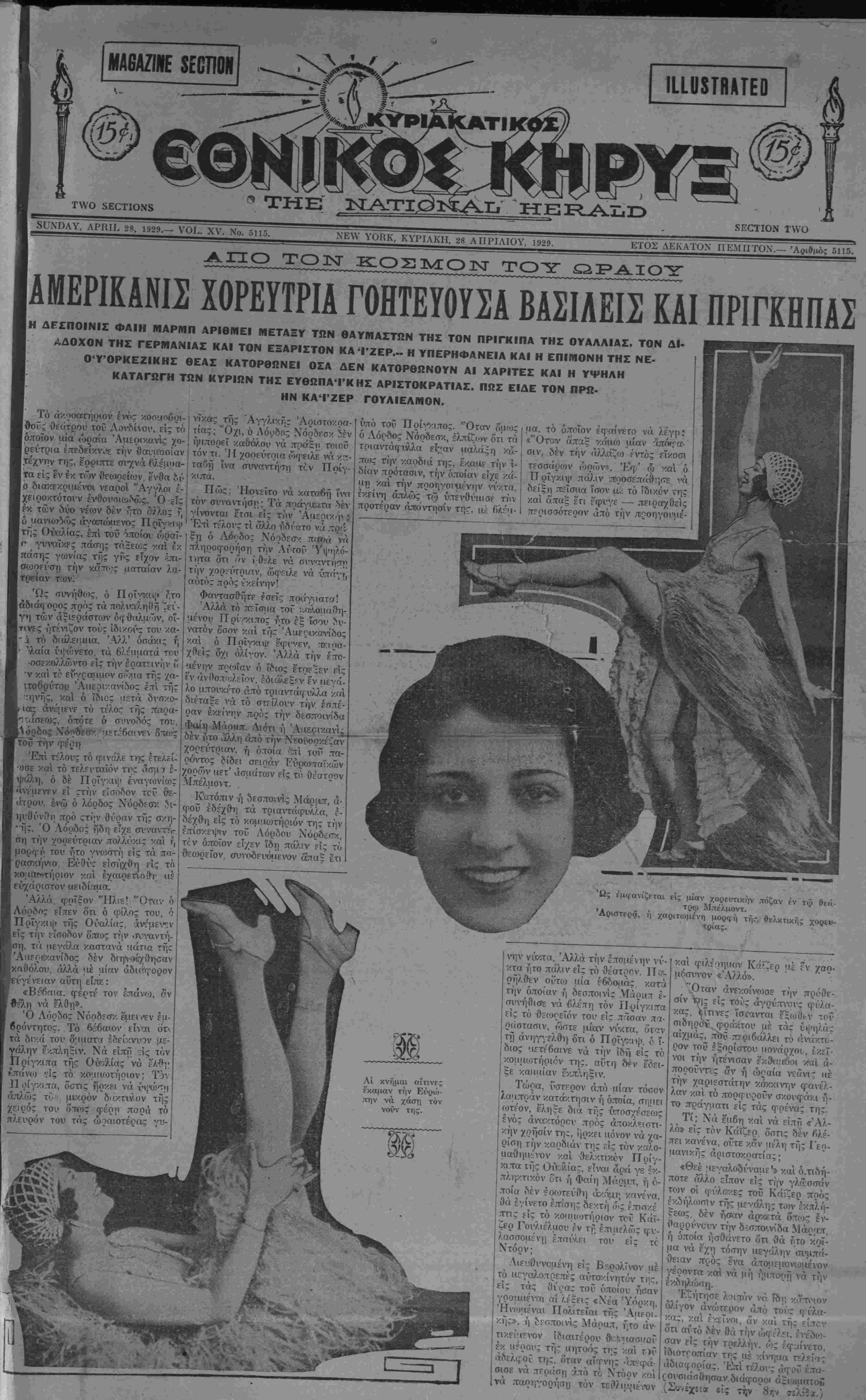 Α±±<-3 ΤΟΤΝΓ ΚΟΣΜΟΝ /^Ρ"^" -^-^^ΡΙΓ ΑΜΕΡΙΚΑΝΙ2 ΧΟΡΕΪΤΡΙΑ ΓΟΗΤΕΥ0Υ2Α ΒΑΣΙΛΕΙΣ ΚΑΙ ΠΡΙΓΚΗΠΑ. Η ΔΡΣΠΟΙΝΙΣ ΦΑΙΗ ΜΑΡΜΠ ΑΡΙΘΜΕΙ ΜΕΤΑΞΥ ΤΩΝ ΟΑΥΜΑΣΤΩΝ ΤΗΣ ΤΟΝ ΠΡΙΓΚΙΠΑ ΤΗΣ ΟΥΑΛΛΙΑΣ, ΤΟΝ ΔΙ¬ ΑΔΟΧΟΝ ΤΗΣ ΓΕΡΜΑΝΙΑΣ ΚΑΙ ΤΟΝ ΕΞΑΡΙΣΤΟΝ ΚΑΊ'ΖΕΡ.-- Η ΥΠΕΡΗΦΑΝΕΙΑ ΚΑΙ Η ΕΠΙΜΟΝΗ ΤΗΣ ΝΕ- Ο'ΥΌΡΚΕΖΙΚΗΣ ΟΕΑΣ ΚΑΤΟΡΘΩΝΕΙ ΟΣΑ ΔΕΝ ΚΑΤΟΡΘΩΝΟΥΝ ΑΙ ΧΑΡΙΤΕΣ ΚΑΙ Η ΥΨΗΛΗ ΚΑΤΑΓΩΓΗ ΤΩΝ ΚΥΡΙΩΝ ΤΗΣ ΕΥΘΩΠΑ'ΓΚΗΣ ΑΡΙΣΤΟΚΡΑΤΙΑΣ. ΠΩΣ ΕΙΔΕ ΤΟΝ ΠΡΩ- ΗΝ ΚΑΊ'ΖΕΡ ΓΟΥΛΙΕΛΜΟΝ. Τό άκοαατηίκον ενός κοσιιοβρι- θοΓς Όεάτρου τοϋ Λονδίνον, είς τό οποίον μία <·)ρο:ία Άιιεοικανίς χο- ρεντρια Ιπεδείκνι,Έ την θανμ'ασίαν τέχνην τι).-, έρριπτε σΐ'/νά Ρλέμκα- τ ί β ί>ί ^