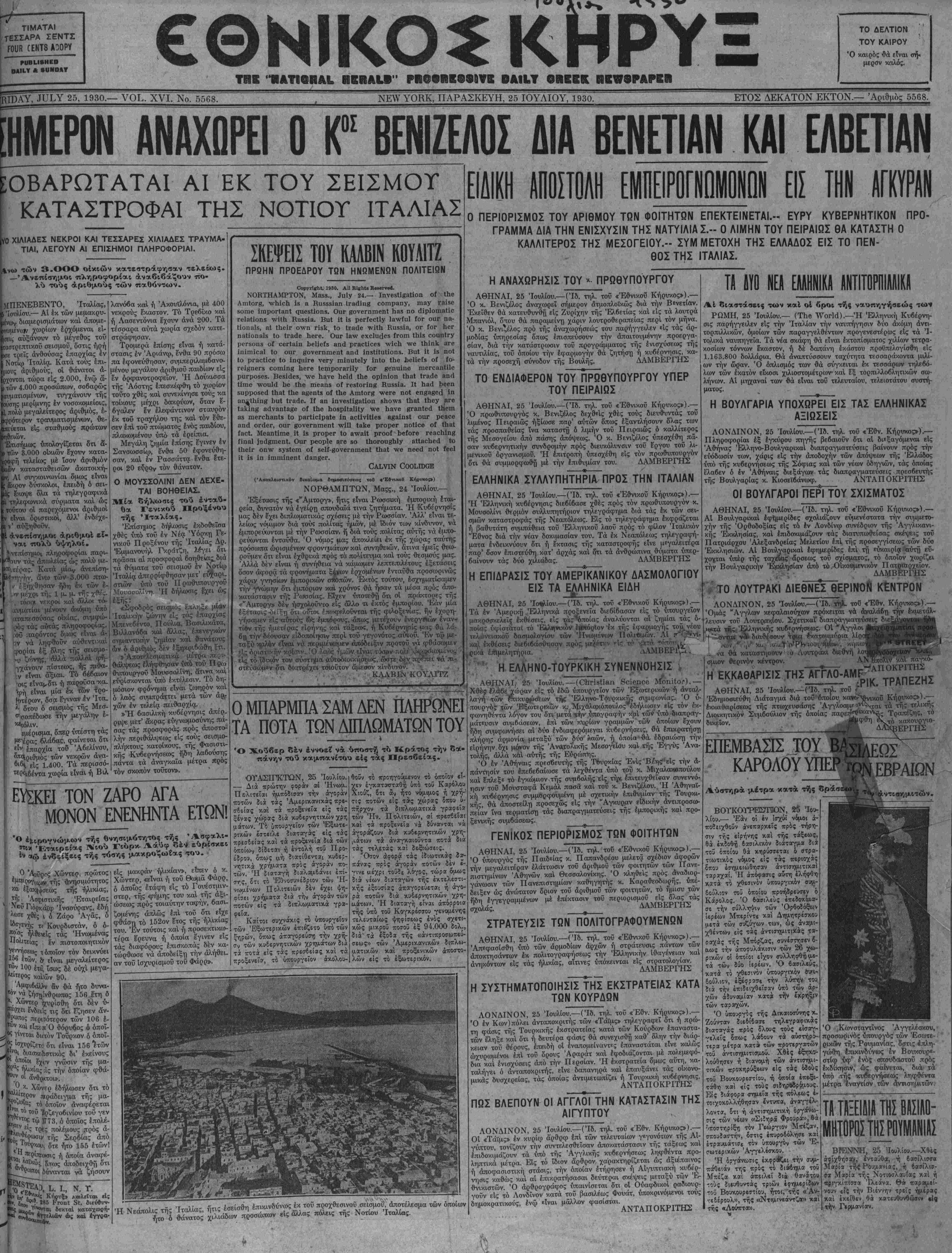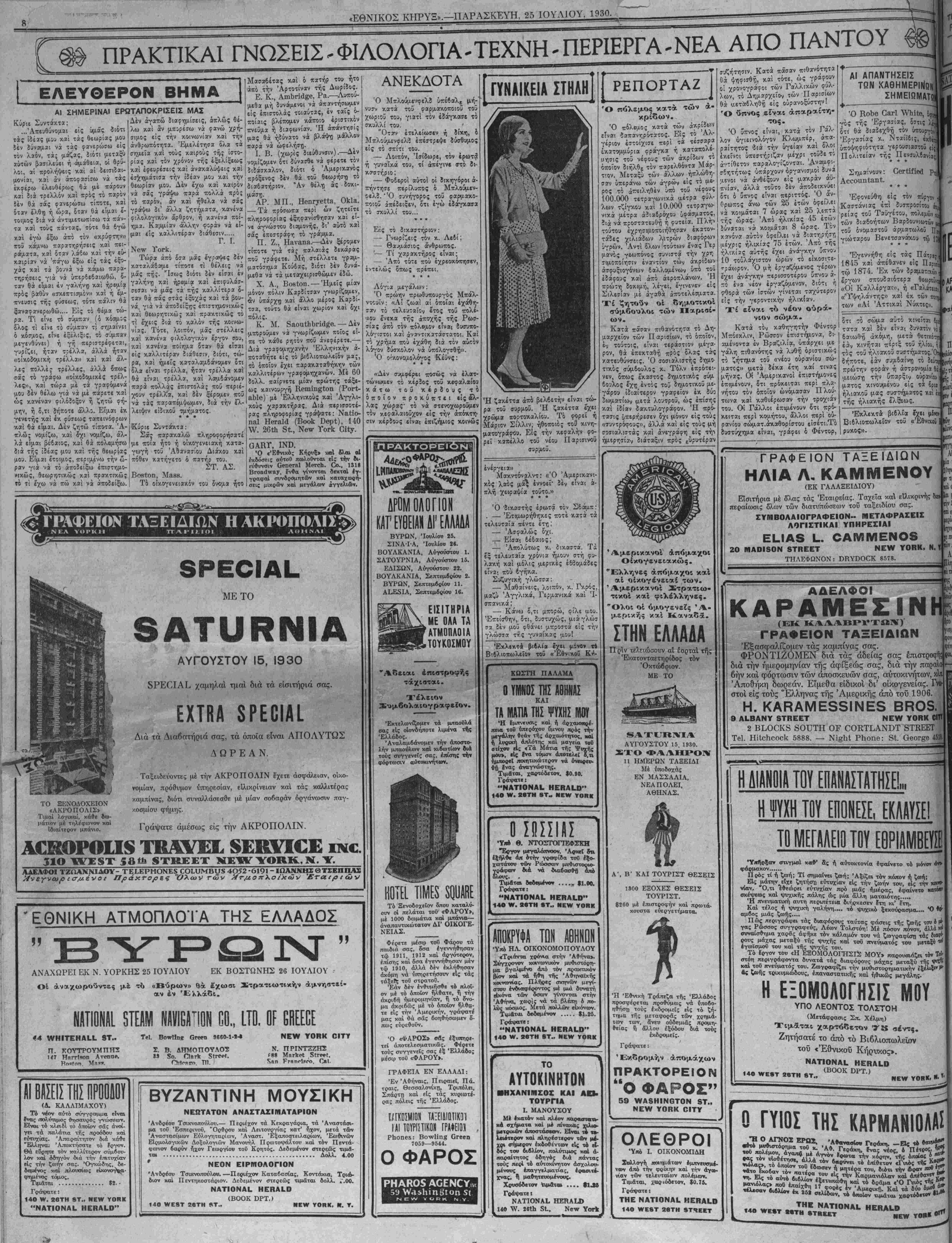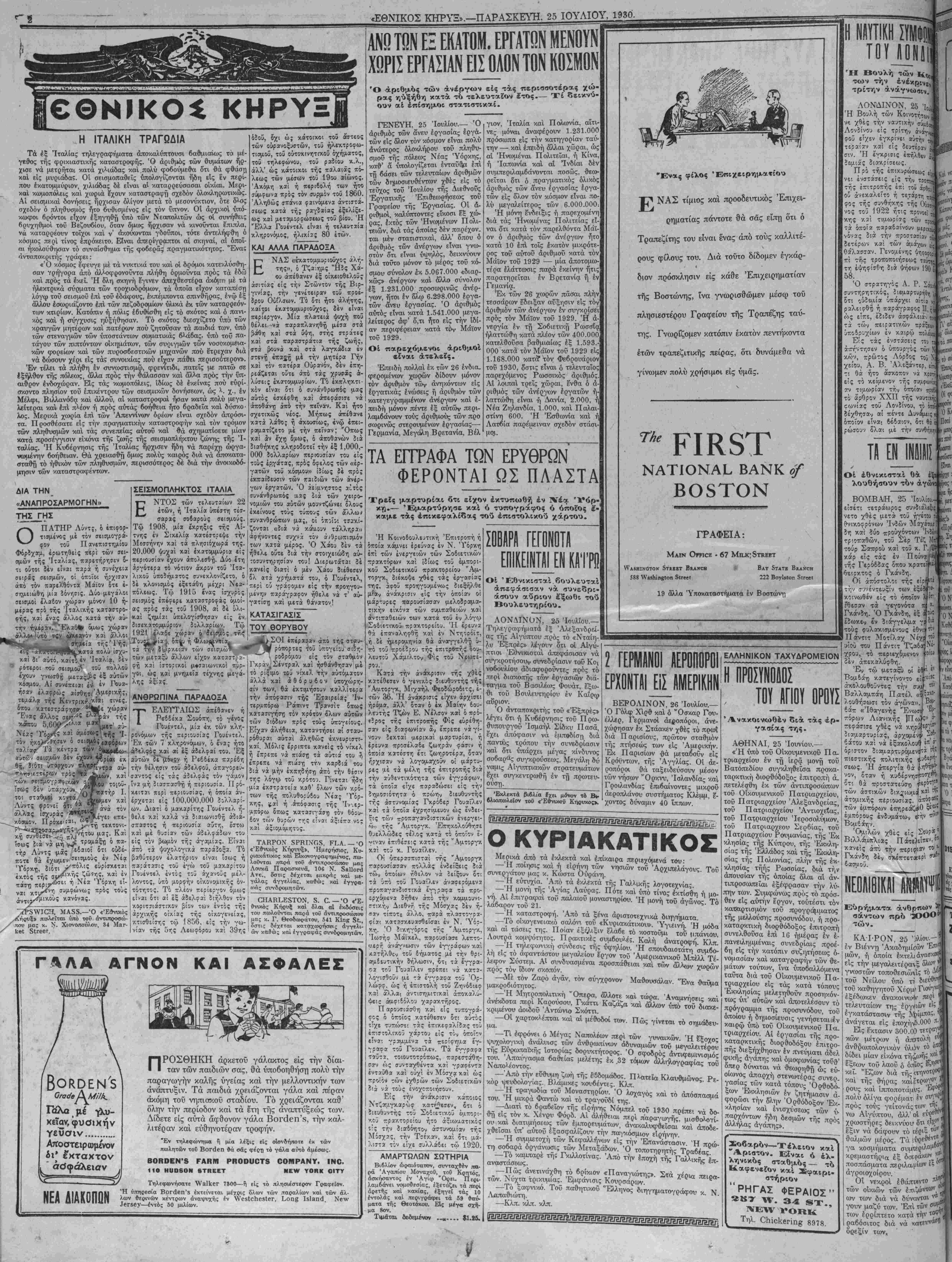 μανός γ«οπόνος σ.»νιστά την ς<ρη τιμοποίησιν εναντίον των άκριϊων άσφοξιογόνων ίαλλομένων^ Μ τοά έϊάφο'ος καί άπο άεροπλάνων. Ή πρώτη ϊοκιμή, λέγει, έγινενεν είς Σιλεσίαν μέ άγαθά άποτελέσματα. Τί ζητοΰν οί δημοτικοί σύμβουλοι των ΙΙαριβί- ων. Κατά πάσαν πΐ'θανότητα το Δη¬ μαρχείον των Π αρισίων, τό οποίον, έ·; τούτοις, είναι τεράστιον μέγα¬ ρον, βά έπεκταθη πρός όλας τάς χατευθύνσεις. Ό σοσιαλιστής ϊημο- τικός συμβουλάς κ. Τόλν έπρότε;- νεν, δπως έκαστος ϊημοτικος συμ. δο.'λος έχη έντός τοΰ ίηυ.οτικοΰ με- γάροϊ ΐϊιαίτερον γραφείον έκ δύο 2ωυ.ατίων μετά λοντροδ, ώς έπίσης καί ιδίαν οΌ-λτΛογράφον. Ή πρό¬ τασις ΰπερήρεσεν δχι μόνον είς τοΰς «συντρόφους», άλλά καί είς τοίις μή σοσιαλιστάς καί ανεγράφη εις την ήμ.ϊρησίαν διάταξιν πρός εύροτέραν ΤΟ ΑΥΤΟΚΙΝΗΤΟΝ Ί ■ΗΧΑΝ1ΜΣΟΣ ΚΑΙ ΑΒ. ΤΟΥΡΓΙΑ Ι. ΜΑΝΟΥΣΟΥ Μέ εκατόν χαί πλέον ποο«ιγ~—» κα βχήματα καί μέ πίναχας χιλκκ μ«τριχ4η ά~στάσε»ν. Είναι τ* —- λειόηρσν χαί πληρέστερον των μέ- χοι σήμβοον έχοοθέντον είς τό Λ- 6ός τον βιβλίον, πολύτιμος καί ά- παόαΐτητος ό6·ηγός διά πάντας τούς περί τό αυτοκίνητον άσχολον- μένους έπαγγιλματίας, έοαοιτΐ- χνας, τ μαθητευομένους. Χουσόοετον τιμάται .... §1.*β ΝΑΤIΟΝΑ^ ΗΕΗΑΙΛ 140 νν. 2β11ι 51., Νέ— ΥοΛ ΑμερικαινοΙ άπόμαχοι ίώ Ελληνες άπόμαχοι κ<αΙ αί οίκογίνεκχί των. Αμερικανοί Στρατιω- τικοΐ καί φιλέλληνες. Ολοι οί όμογενεΖς 'Α- μερικής καί ΣΤΗΝ ΕΛΛΑΑΑ Π ρίν τελειώσουν αί έορταί της Έκατονταετηρίδος τόν Όκτώβριον. ΜΕ ΤΟ ΑΥΓΟΥΣΤΟΥ 15, 1930. ΪΤΟ ΦΑΛΙΙΡΟΛί Π ΗΜΕΡΩΝ ΤΑΞΕΙΔΙ Μέ ύποδοχάς ΕΝ ΜΑΣΣΑΛΙΑ, ΝΕΑΠΟΛΕΙ, ΑΘΗΝΑΣ. σ^ττησιν. Κατά πάσαν ΐΓη Οά ψηφισθή, καί τότε, ώς γραφουν οί χρονογράφοι των Γαλλικών φι>λ-
