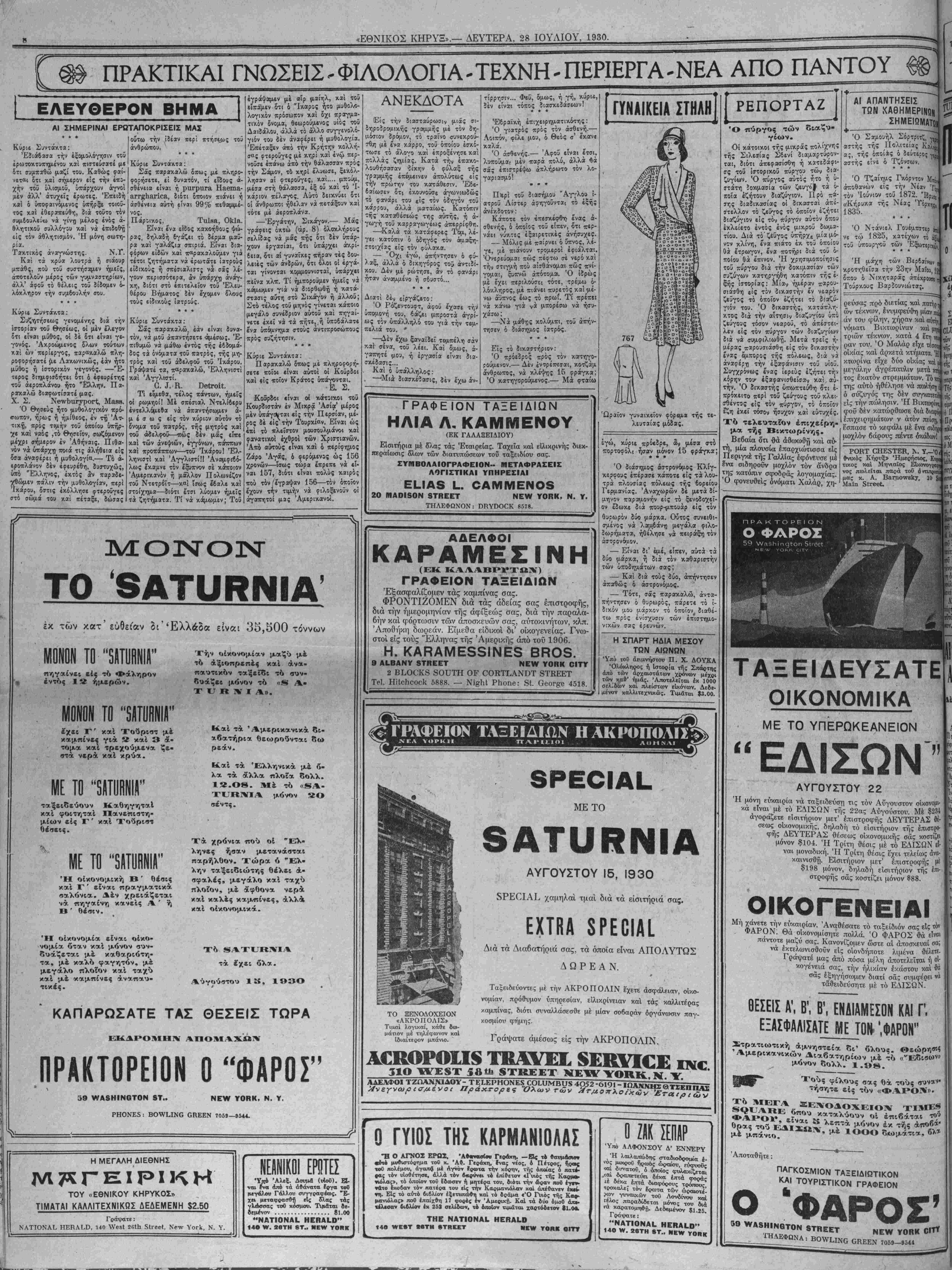 ΡΟΚΤ ΟΗΕ5ΤΈΒ, Ν. Υ.-Ό< θνικός Κηρυξ» Ημερησίας, Κυηκ τικος καΐ Μην»αϊος Ε1κογογρβφΐ| νος πωλεΐται πα^ά τοΰ άντιποοΐΜ μας κ. Α. Ββπιοντ8ΐ£7, 10 $ο ιννε Μαΐη ~ ΤΑΞΕΙΔΕΥΣΑΤΕΙΑ ΟΙΚΟΝΟΜΙΚΑ ΜΕ ΤΟ ΥΠΕΡΟΚΕΑΝΕΙΟΝ "ΕΔΙΣΩΝ ΑΥΓΟΥΣΤΟΥ 22 Ή μόνη εύκαιρία νά ταξειδειόστ| τις τόν Αυγουστον οίκονομι· κα είναι μέ τό ΕΔΙΣΩΝ τής 22ας Αυγουστον. Μέ $231 άγοράζετε εισιτήριον μετ1 έπιστροφής ΔΕΥΊΈΡΑΣ ίέ· σεανς οίκονομικής, δηλαδή τό εισιτήριον τής έπιστρθ- φής ΔΕΥΤΕΡΑΣ θέσεως οίκονομικής σάς κοστίζΜ μόνον $104. Ή Τρίτη θέσις μέ τό ΕΔΙΣΩΝ ε^ ναι μοναδική. Ή Τρίτη θέσις Ι'χει τελείως άνα- καινισθη. Εισιτήριον μετ1 έπιστροφής με $198 μόνον, δηλαδή εισιτήριον τής έπι¬ στροφής σάς κοστίζει μόνον $88. ΟΙΚΟΓΕΝΕΙΑΙ Α^ρ· Αναθέσατε τό ταξείδιον σας είς τόν Θα οίκονομίσητε πολλά. Ό ΦΑΡΟΣ θά είναι παντοτε μαζύ σας. Κανονίζομεν ώστε αί άποσκευαί σα; να έκτελωνισθοΰν είς οιονδήποτε λιμένα θέλετε. Ι ραψατέ μας άπό πάσα μέλη άποτελεΐται ή οΐ- κογένειά σας,^ την ηλικίαν εκάστου καί θά σάς εξηγήσωμεν διατί σας συμφέρει νά ταθειδεύσητε μέ τό ΕΔΙΣΩΝ. ΘΕΣΕΙΣ Α1, Β', Β1, ΕΝΔΙΑΜΕΣΟΝ ΚΑΙ Γ. ΕΞΑΣΦΑΑΙΣΑΤΕ ΜΕ ΤΟΝ> ',ΦΑΡΟΝ"