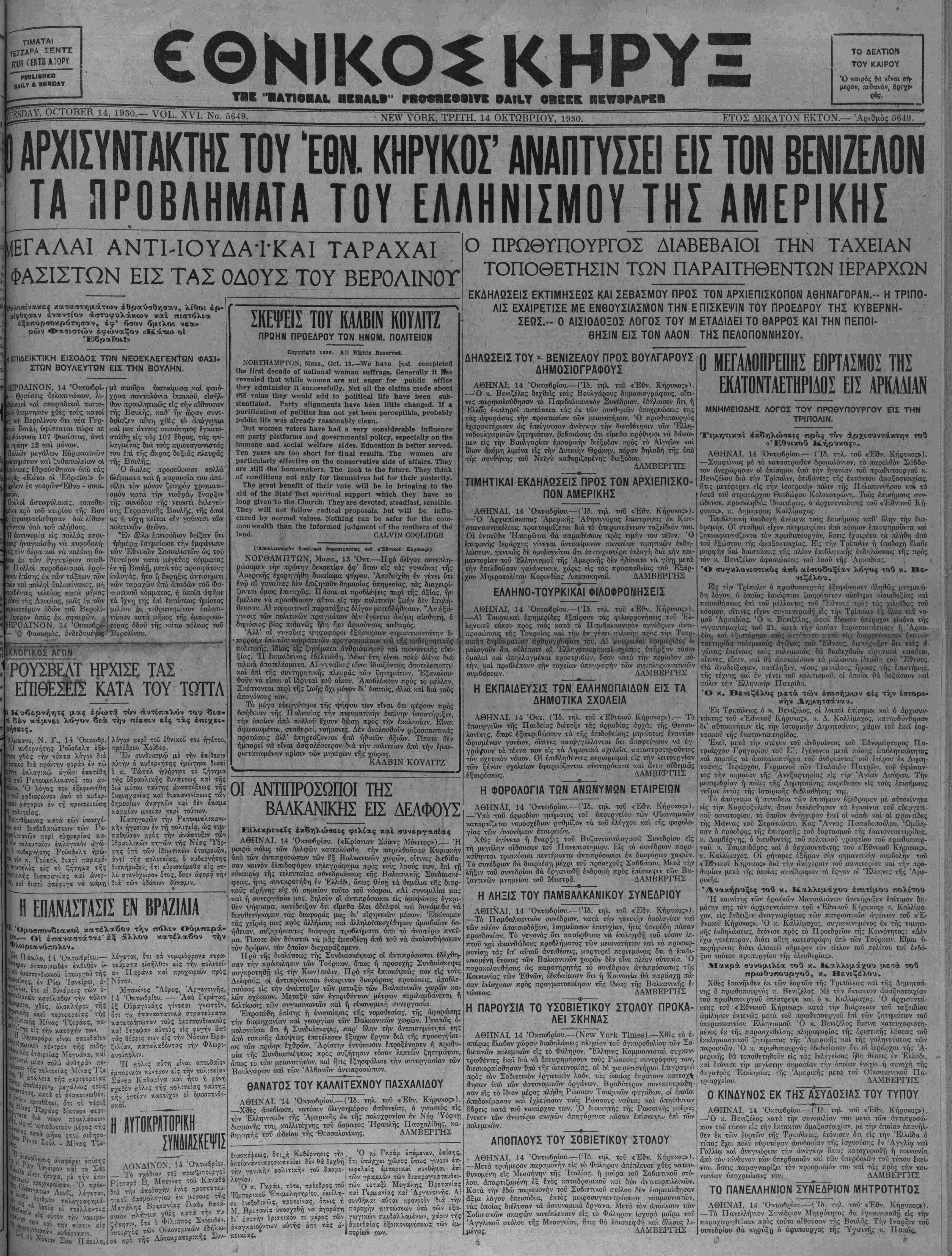 ΙΑΡΧΙΣΥΝΤΑΚΤΗΣ ΤΟΥ 'ΕΘΝ. ΚΗΡΥΚΟΣ' ΑΝΑΠΤΥΣΣΕΙ ΕΙΣ ΤΟΝ ΒΕΝΙΖΕΛΟΝ