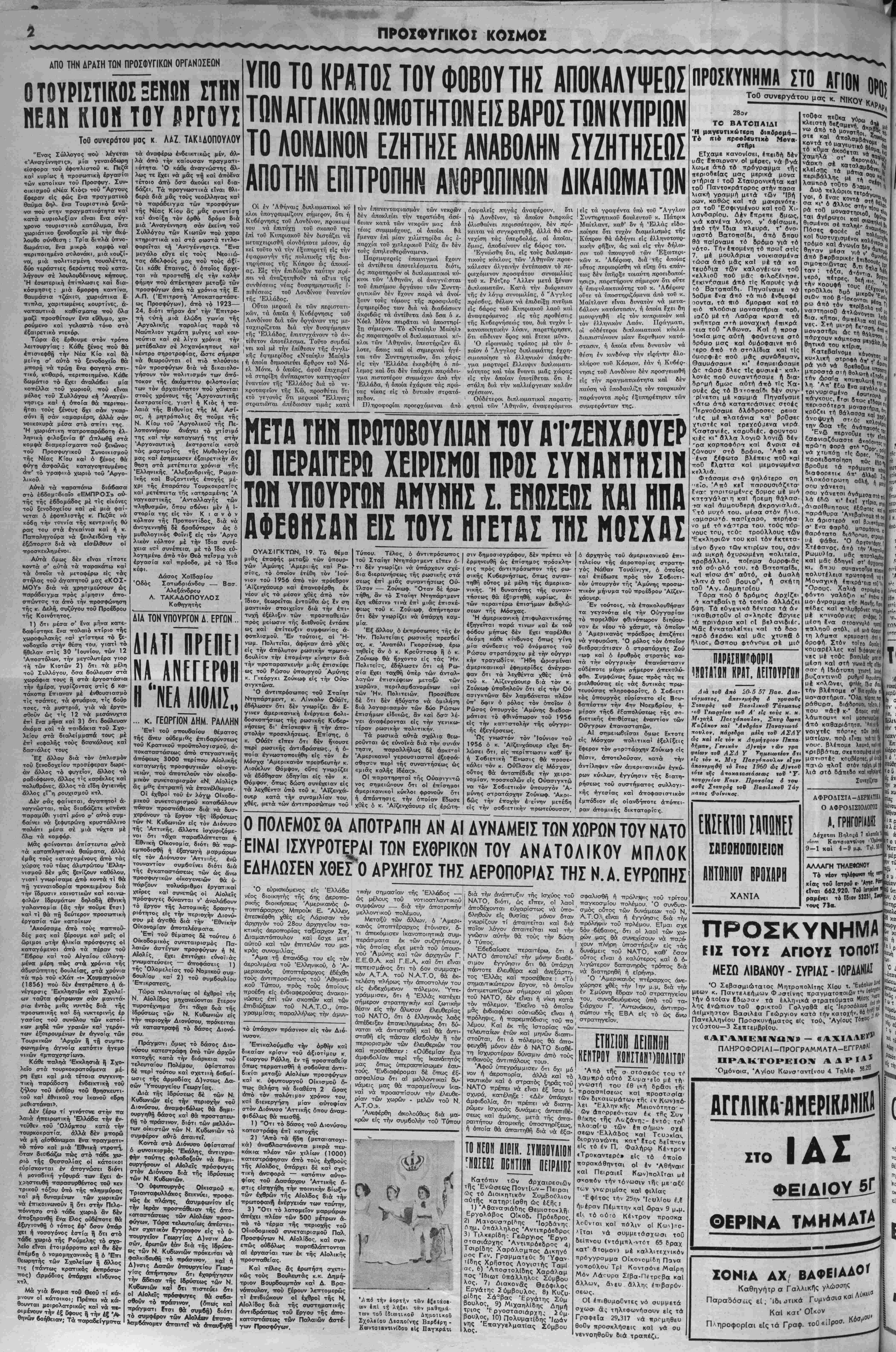 »<Ό1«Ο,( ίουΐΐοι όλυτα κ «Ι ©ΚΛΗΣΙΝ ΤΗΣ ΠΑΤΡΙΔΟΣ ΜΟΥ· Τάς ακέψεις αύτάς διετύπωσεν αρμοδίως ό έπιφανής ήγέτης τοΰ αγώνος, β Μ«κάριος, μετά τού έπβίβυ, ώς εικός, εύρέβημεν α π έ λ υ τ α σύμφ&Λ'βι οί ένταΰβα έθναρχικβί συμβουλαί, κα- τά την πρό τίνων ημερών υπο την προεδρίαν τού συνεδρίασιν». ΚαΛ τό άπβτέλεσμα αύτβ. τής 'πλήρβυς δηλο¬ νότι επικρατήσεως των άπόψεων τής Κυπρια- κής Έίναρχίας επετεύχθη παρά την Λ Υ 2- Σ Α Λ Ε Α Ν έν προκειμένω αντίδρασιν τβΰ ΑΡΧΙΔΟΛΙΟΦβΟΡΕΩ Σ} — έπανα- λαμ6άνω τβν χαρακτηρισμόν — ΐτρβοδει/τοΰ των Ήνωμένων Πολιτειών κ. "Αλλεν, β 6- ιτβΐος ούδ' επί στιγμήν έπαυοβ τάς παρασκη- νιακάς ένεργβίας χαί τάς άφ©ρήτ©υς πιέσεις τού, έΛΪτών αρμοδίων Έλληνικων ««ραγάντων είς έκτέλεοιν φυοΐκά των έντολων τβθ μ ι ο έ λ λ η ν β ς προΐσταμένου τού Άμερικανοΰ 'Υηονρ γοΰ των Εξωτερικών κ· Τζών Φοοτερ Ντάλ- λβς Ο&τε δέ πράκειται νά οτ,Λβγοητβύση τβν κ. " Αλλεν καΐ τβΰς λοιηούς τροφΐμβυς τοΰ Λευ- κοϋ Οίκευ και ιβΰ ΖτοάηΓΤ Ντη«άρτμεντ ή έιπικράτησΐς αντιθέτων, πρός τάς συμβουλάς των, ά.π6ψεων. κ«τά την κοττάθεσιν τής πρβα- ςρυγής διά τβ Κυιτριακόν. ΕΙνΐαι άπβλύτω^ 6 έ 6 α ι β ν ότι Θά συνεχίσβυν Α Ν Ε Ν Δ Ο- Τ Ω Σ την ψ*νεράν καί την παρασκηνιακήν βκστραΤΒίαν των, τάί μέχρι φορτικότητβς πιέ σεις των, επί παντός δυναμένου νά έχη γνώ¬ μην επί τβΰ Κυπριακβΰ, διά νά επιτύχουν δύβ τινά, ή την ©ύσιαστικήν τής πρβσςρυγής εγκατάλειψιν, τ ά α θ ε ν ή και χ λ ι α ρ ά ν ύ ποοτήριξιν αυτής, έκ μέρβυς τής 'Ελ άντιπροοωπείας, έν καιρώ τω δέοντι "Ετέθη ήδη. ώς πρβανάκρβυβμα, είς κυκλοφο¬ ρίαν καί εδημοσιεύθη είς τάς εφημερίδας ή -ληροφβρία. βτι ή Κυβέρνησις Άΐζενχάβυερ έπιμένει είς την αντίληψίν της, δττως ή 'Ελ- ού;, IV! 1 ΟΤίΒΐΙ σχαΐΜΐ ΚαΜ σ.ΐι ΤΙΟΤΕΡΟ1 Ι0Ι)(ι 1 :Ι ΙβΙΙ ουνομιλίαν μεθ' ενός έκ των ιέντΜνδιαχίΐριστΟν τ«ΰ Κυπριακοΰ ζητήματβς - έλλά γ.αϊ έκ τβΰ δημοσιευθέντος είς «τ ό Βήμ»» της 13ης Ιούλιον β· έ- αρθρον τοΰ ιιλαιμάχβυ καί άκατ«δ>λήτ©υ