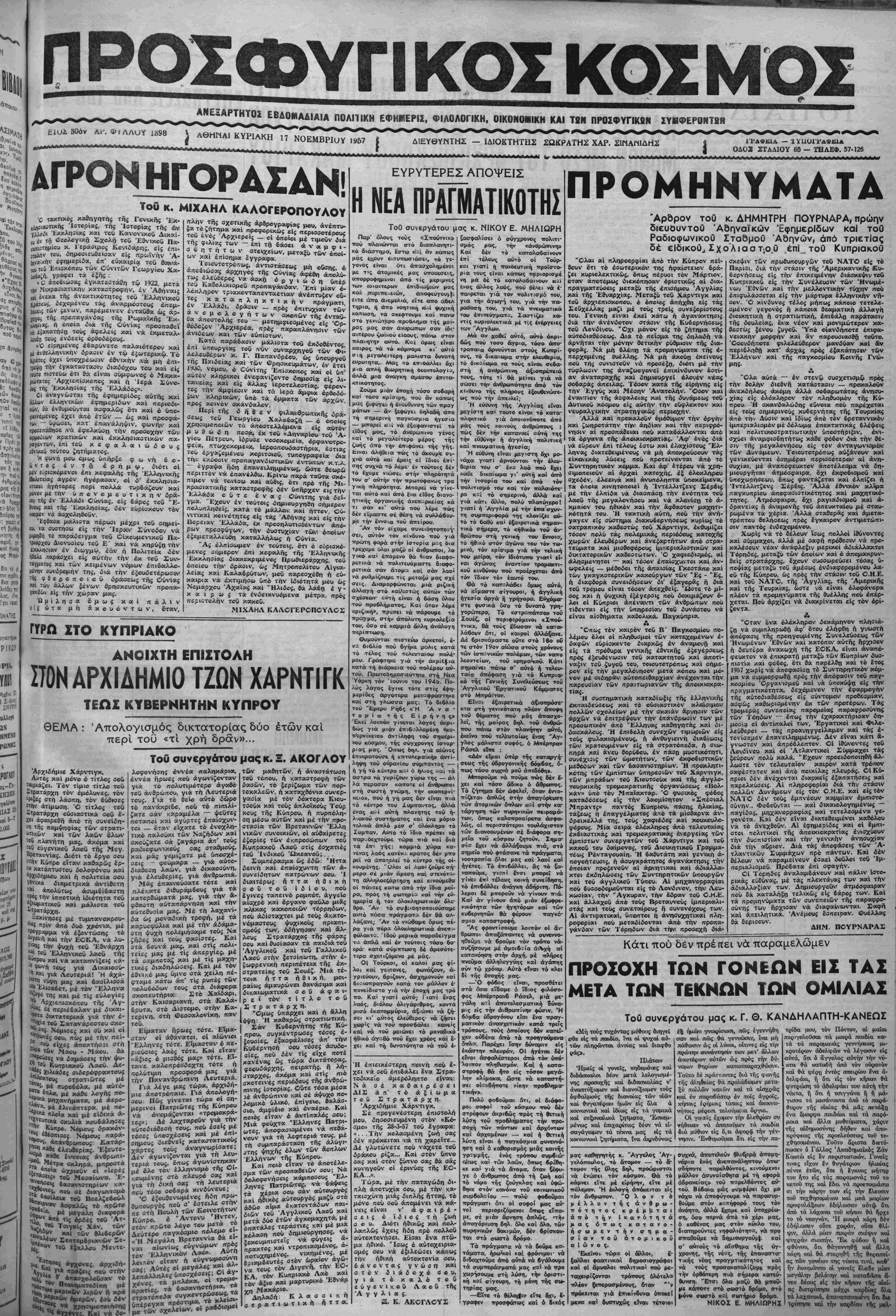 τββΛΐει«ς κ<χί είς «λλα« ίβροτελεοτίοιτ; | την οςμφίεαιν καί τα ίερά &μφ£. κληρικών, ϋπβ τα φμ«τ« των 5 κοίνον σκάνδαλον. Περί τήζ δ ή 8 € ν φιλβκνθρωπιικίίς 5 τ«ΰ Γεωργίου Χ«Αα«α{ί| _ 6 θπο^ς χρηοΐιμβποιων τα άποστελλφενα είς ούτον μ υ β ω «5 η ίΐοσά, έκ τού «Δηναρ,ου τού Ά- γι©υ Πέτρου», ϊδρυσε νοσβκβμεια, άρφκνιοτρ©- φει*. πτωχβκβμεΐΛ, ίεροσιπουδιοτστήρια, έατιας τ<ρυ εργαςομενβυ κοριτοιοϋ, τυπ©γρ«φεϊα 45«« τηιν, εκώβοιν Γτροποογανδιοτιοιώιν εντυπων κτλ εγραψα ήδη έπαινειληιμμένωί, ώστε θεω,οώ περιττον νά έποονέλθω. Κρινω π<χρά ταυτα σκβ- ηιμβν ν« το,ντιαω κ«. αύθις, ότι προ τής Μι- κραβιατικήί καταστρβφής δέν υπήρχεν εις την ^Λλαδχ οΰτε ένα$ Οώνιτηί γιά δεί- ΥμΓ' ι Γυν έν τβύΤβ1δ δημιουργηθή «ήμερβν «βλώΓτληβεις, κ»τα τβ ^ιοτλλον, και ήττον ού- ητικχΐ κβινοτητες είς τάς Αθήνας κ«ί είς την «βρειαν ΕλΛκδκ, έκ πρβσηλυτιοθε,ντων αφο¬ ρών ττ,ρΰσφΰγων, την δυστυχίαν τώΐνι οποίων είε,με,ταλλεύθη κΛτοτλλήλως ή Ούνίος. "Ας έλπίαωμεν βν τούτοις, ότι β ευρισκό¬ μενος οιιμερον επί κεφαλής τής Ελληνικήν Έκκλησις διακεκριμένον Ι1ρωθιεράρχη5, τβϋ όποίου τηιν δρασιν, ώς Μητροπολιτου Αίγια- λείας καί Καλαβρύτων, μ©ΰ παρεοχέθη ή εΰ- καιρια να έκτιμήοω υπό την Ιδιοτητά μου ώς Νομάρχου 'Αχαϊοος καί "Ηλιδος, θά λάδξΐ ε γ - κ α ι ρ ω ς τα ενδεικνυόμενα μέτρχ, ηρος περι&τολήν τοΰ κακοΰ. ΜΙΧΑΗΛ ΚΑΛΟΓΕΡΟΠΟΥΛΟ2 ΓίΡΩ ΖΤΟ ΚΥΠΡΙΑΚΟ ΑΝΟΙΧΤΗ ΕΠΙΣΤΟΛΗ ΣΤΟΝ ΑΡΧΙΛΗΜΙΟ ΤΖΩΝ ΧΑΡΝΤΙΓΚ ΤΕΩΣ ΚΥΒΕΡΝΗΤΗΝ ΚΥΠΡΟΥ ΘΕΜΑ : Άτΐολογισμός δικτατορίας δύο έτών καί περί τού «τί χρή δραν»... 'Αρχιδήμκε Χάρντιγκ, Αυτος καΐ μόν© ό τίτλ©$ σβΰ «ιριάζει. Τόν τίμιβ τίτλο τβϋ ϊάρχη τβν εμόλυνες, τον στή λάαπη>, τβν δύθκΐες