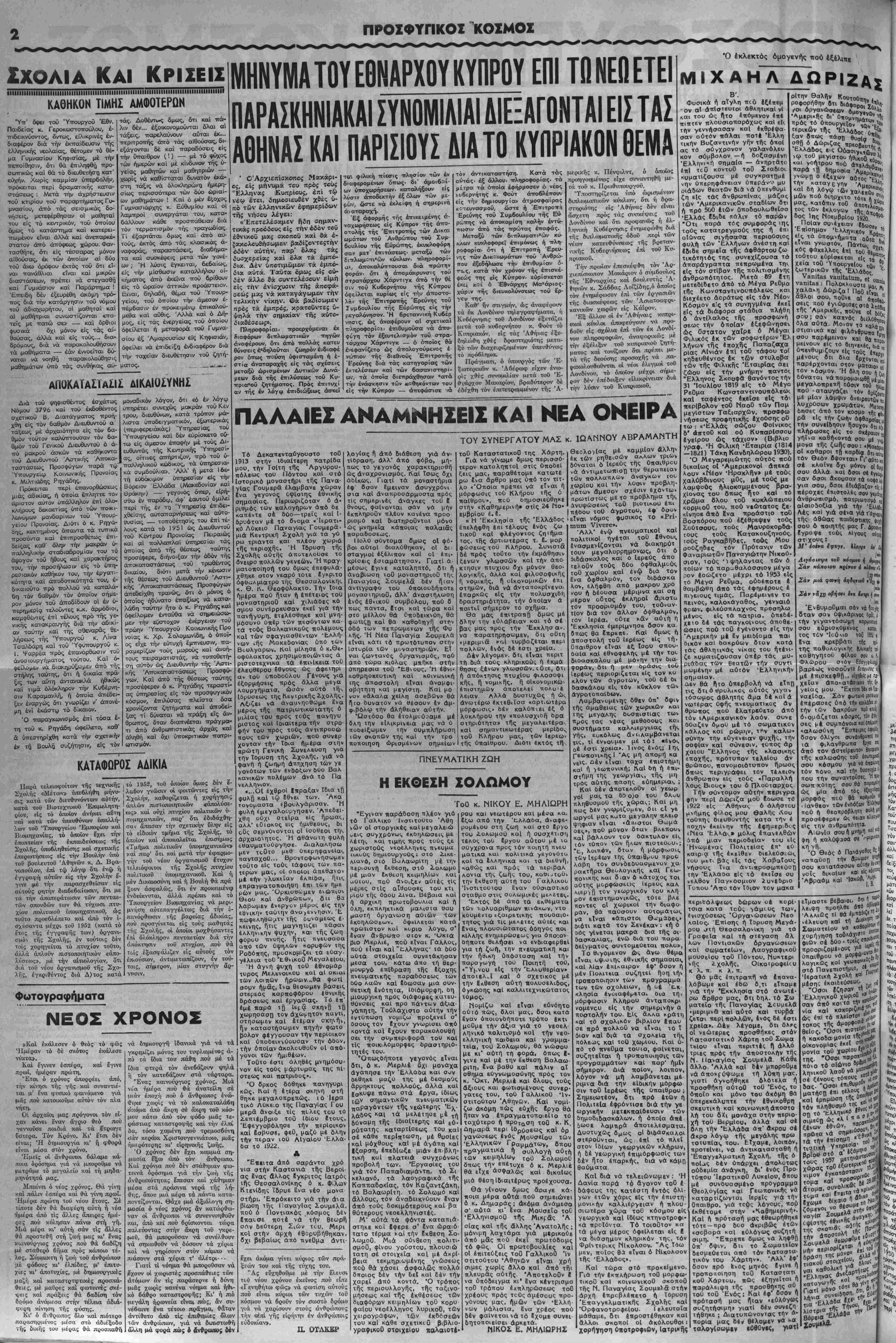 χε<ο δέ τάς παγκοΐνους άποθε- ώσεις τιού τοΰ εγένοντο είς την Αμερικήν μέ εν μειδίαμα τιαι οικον καί δακρύων οταν κατά τάς άθλητικάς νίκας τού ήτένι· ζε κυματΐζουσαν υπέρ τάς μυ· ριάδας των θεατών την συντι μωμένην μέ αυτόν "Ειλληνικήν σημαίαν. ϋεν θά ήτο ύπερβολή νά είπη τις δτι ό ϋρυλικος αύτός γιγαν τόσωμος άθλητής άμα δέ κοΐ ά νωτέρας ύφής ττνευματΐκος άν θρωπος πού έλατρεύετο άπό τόν ιΑμερικανικόν λαόν. συνε όθαζεν ομού μέ τό σωματικον κάλλος καί ρώμΐ|ν, τι^ν καλω· σύνην την ευγένειαν ψυχή(,. την σοφίαν καί σύνεσιν, τυπος άρ χαΐου Έλληνος τής κλασικης ίτιοχή'ς, πρότυπον τελεΐου άν θρώπου, πανομοιότυπον ήρωος δπως περιγράφει τόν τέλειθν άνθρωπον είς τούς «Παραλλή λους Βιους» τού ό Πλούταρχος Την σύντομον αυτήν περιγρα φήν περϊ Δοριζα μου Εοωσε τό 1922 είς Αθήναι, ό άλήστου μνήμης φίλος μου θαλής Λου τούτιης οιευθυντής κατα την έ ποχην εκείνην τής εφημερίδας <Μεα ΊελΚθΛ» μόλις επανελθών από μίαν περιοδείαν τού είς Ηνωμένας ΠολιτεΙας έπ' εϋ καιρια τής εκείθεν διελεύσεως, τού μ^τι. βάς είς τάς Χαβαΐοθς νήσους ϊνα άντιπροσωττεύοτι την Έλλάοα είς τό έκεϊσε ου νελθόν ΓΙαγκθομιον ίυνέθριο Τυπου Άπο τόν ΐθιον τον μακα ;γζβ όν όρΐζΐϊ μέ μίαν λάμψιν δνειρευτων ,ο λυχρύσων χρωμάτΰν. Μϊ όησες άτιό τον κοσμο τΒς ρά είς την ζωήν άφθαρόΐα!Ι την συνείδησιν ήσυχον ίτι,(, πλήρωοβς ιΐς το Οκίραιον., γήϊνα καθήηοντά σου μί 1 μονα τής ζωής σου : Μ οί καθαροι χ§ καρβΐ τόν θίόν βψονται.Γι'αθτο," σέ κλαΐνε δχι μόνον οΙί|(1ι σου άλλά καί δσοι οί ί οί ίγνώ., σαν βσοι άκουσαν τα οο·6)ϋ για σου, δσοι έδιάβαζαν ,|ςί πέροχες έτιιστολές σου γ«μβΙ!( άνθρωπισμό, παχριωΐιΟμ4 ,, αΐσιοδοξΐα γιά την 'Ελ Λές καί γιά σένα γιά τής άθώας παιδΐστικης ψμντ σου ό ποιητής μας Γ. Δροο™ Εγροψβ τούι. Μγοος αύΛ στ'χους: Μ9 έσένα Ιφυγι, Ιλ*·ν>ε ά»1 (,