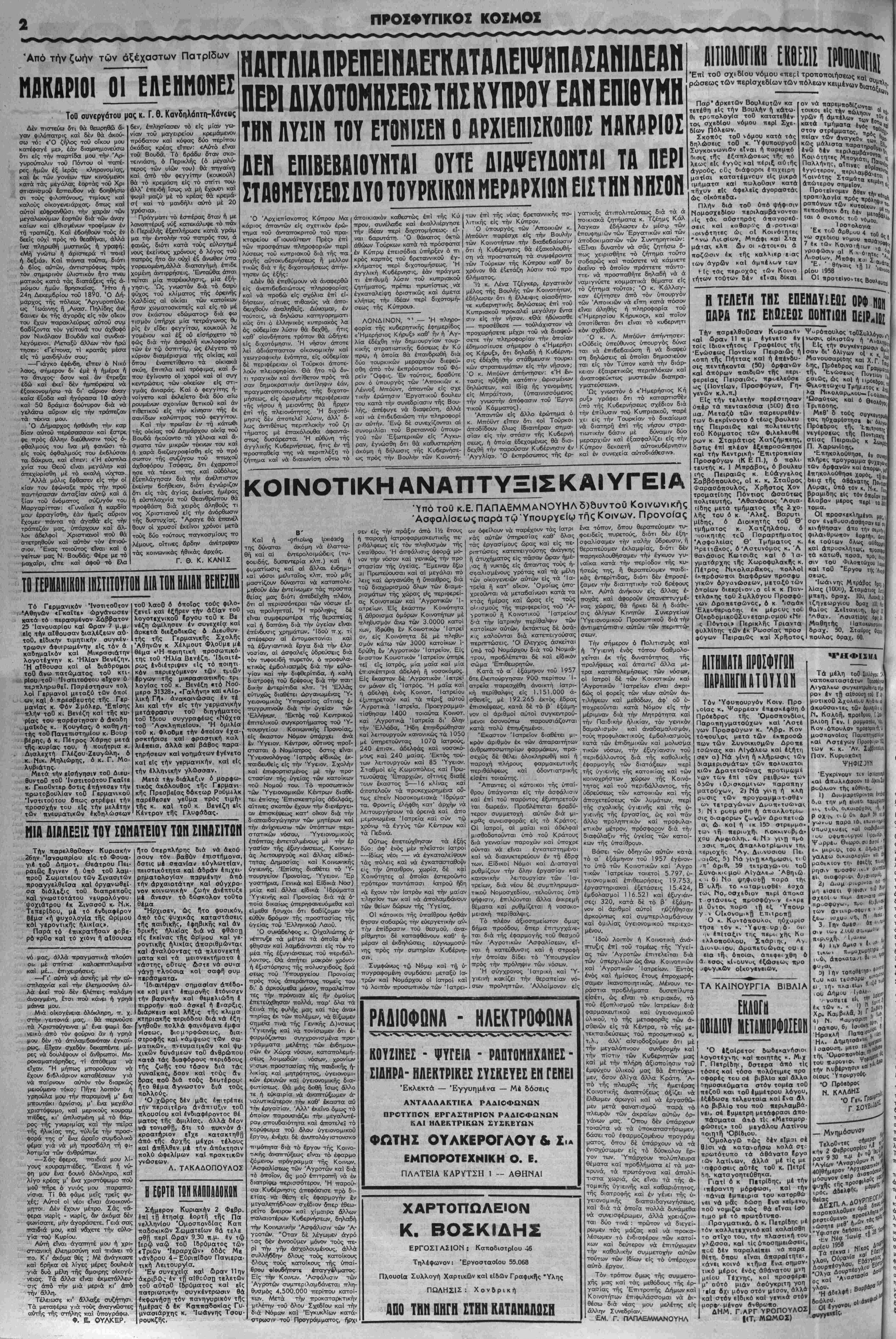 ;ον άχρ««<ν πρβμαχωνα τβΰ Έλληνικβϋ Νό- τ«λ έφήρμβ««ν και εξακολβυθβΰν νά έφαρμό- ;βυν μ«ΧΡ« κ«Ρ«»«5 τα έγκληματικά των σχέ- ίΜ· . , ,, Ήρχισαν την εκτέλεσιν τού μ α κ ι α - ΙιΠικβϊ των «ρβγράμματβς την 6ην ϊίπτβμβρίβυ 1955, είς την Κωνσταντινούπο- λιν χ«ί την ϊμύρνην, βπβυ, ή π ε ρ ι £ ό η· Τ β { διά την σατανικήν δράσιν λλ;εν "ερι εξή Τ β { ή δράσιν της 1ντ£λλ·ντ;ενς "ερβις εξήγειρε τα αγρια Τβΰ μ\χχ οτίφη τβΰ Μεντερές, εναντίον τού ©μβ- γ£ν«ύ; μ*ς στβιχείβυ, τό όπβΐβν υπέστη τότε τάοτβ« εκτάσε ά ύ ~τΓ ρς τού τβυς κατά της χώρας μας συνωμοτβϋνταί άναφανδβν Αννλβ- 3™υ.Ι%Τ,κρίνετΛι * -τύκη ήμίσεος έκατομ- μυριβυ ΙΟληνων, οί έηοΐβι καταδικάζβνται ν« εςακβλβυθησβυν παραμέν©ντες, έ π' α π β ι - ο ν ύπόδβυλβι των "Αγγλων άπβικιβκρα- ων, ερμαιβν είς την διάθεσιν των όρδών τού των, Κιοοταούκ. Έν τφ μετιχξύ, κατόπιν έπιταγής τβϋ Ιδίου καταχ&ονιβυ πρβΐσταμένβυ τβΰ Εταίητ Ντη- παρτμεντ, ©ι ευρισκόμενοι έπι κεφαλής τβΰ ^λληνικβΰ Κράτβυς έλ έ ρμι έπι κεφα Κράτβυς έκλειοαν έ ο μ τομα καί 5έ λΰ'"ΰ τ ι - Τα· τ ά σ τ 2 υ εκτάσεως κατασΓρ^Γύ: ?Λ* τό "^ "*1 ώεν ^λμοΰν οϋτε απλήν ί,τ* όμματα καί τή υποκινήσει των Τ^υοκΝ 1* ύ'*™ωσβυν διαμαρτυρίαν, διά τα είς 6*. ι» τα όμματα καί τή υποκινήσει των Τουρκι¬ αν άρχών. Ή κι*6ερνώσα την Μεγάλην Βρεταννίαν των συντηρητικών, άπογόνων των ίδρυτών τής Αύτβκρα πσε τό απαίσιον ρος τήί Πατρίδος μας τεκταινόμενα. «ν ι **ντ«°δήτε βτι κα'ι ό έκπρόσωπος άκόμη *ν Ι τβυ Πακιστάν, είς την διάσκεψιν τοϋ Σ,υμφώ- ων , ν«ι τή, η*·-^"" έχει τβ δικαίωμα νά άποφα τής δημιουργίας τεχνητής Τουρκικήί ■'■-- επί τοϋ τιμιωτέρβυ των διεθνβϋς ένΐδιαφέρβντβς, ζητημά- αιν,'τής άπαλλαγής 430.000 άκραιφνών Έλλήνων—μέ τρισχιλιετή ένδ©ξ©ν Ιστορίαν__ («τόν £υγόν άίιστάκτου τυράννου. Μίαν άπό τάς πβλλάς πτυχάς τβϋ Κυπρια- χβΰ ίράματβς άπβτελβΰν αί έγκοςινιασθεΐσαι 4ηβ διετίας καί έπαναλαμ&ανόμεναι καθ" ώρι- βμχ χρονικά διαστήματα, τρβμβκρατικαί δια ίπλωσ ε ι ς καί έπιδρβμαί των ληστρικών 'φ&,μανικών όρδών τής Κύπρου — ύποκινβυμέ ν»ν ά ν α μ φ ι 6 β λ ω ς υπό των "Αγγλων _ εναντίον των 'Ελλήνων της Μεγαλβνήσβυ. Άλλά χαί ©Ι μύδροι καί αί απειλαί τάς ο¬ ποίας έκτβξεύβυν, κατά καιρβϋς έναντίβν μας, «3 Μεντερές καί ό Ζορλβϋ, καθώς καί τό ϋβρε- ίλβγιβν τβΰ ϊελίμ Εάρπερ, είς τόν ΟΗΕ, κα- τ* της χώρας μας, όφείλβνται ά ν α μ φ· ι- ί ν π τ η τ ω ς είς ύπβκινησεις των "Αγ¬ γλων, ένισχυβμένων είς τό ά ν © α ι β ν ερ- |βν των, ύιτό τήί ές ω ν η μ έ ν η ς σπεί- μς των 'Αμερικανών Ρεπβυμπλικάνων, τύ- «βν Ντϊ«υϊ - Ντάλλες, πβϋ κυΰερνοϋν την Με >άλην 'Υιτερατλαντικην Συμπολιτειαν καί δι