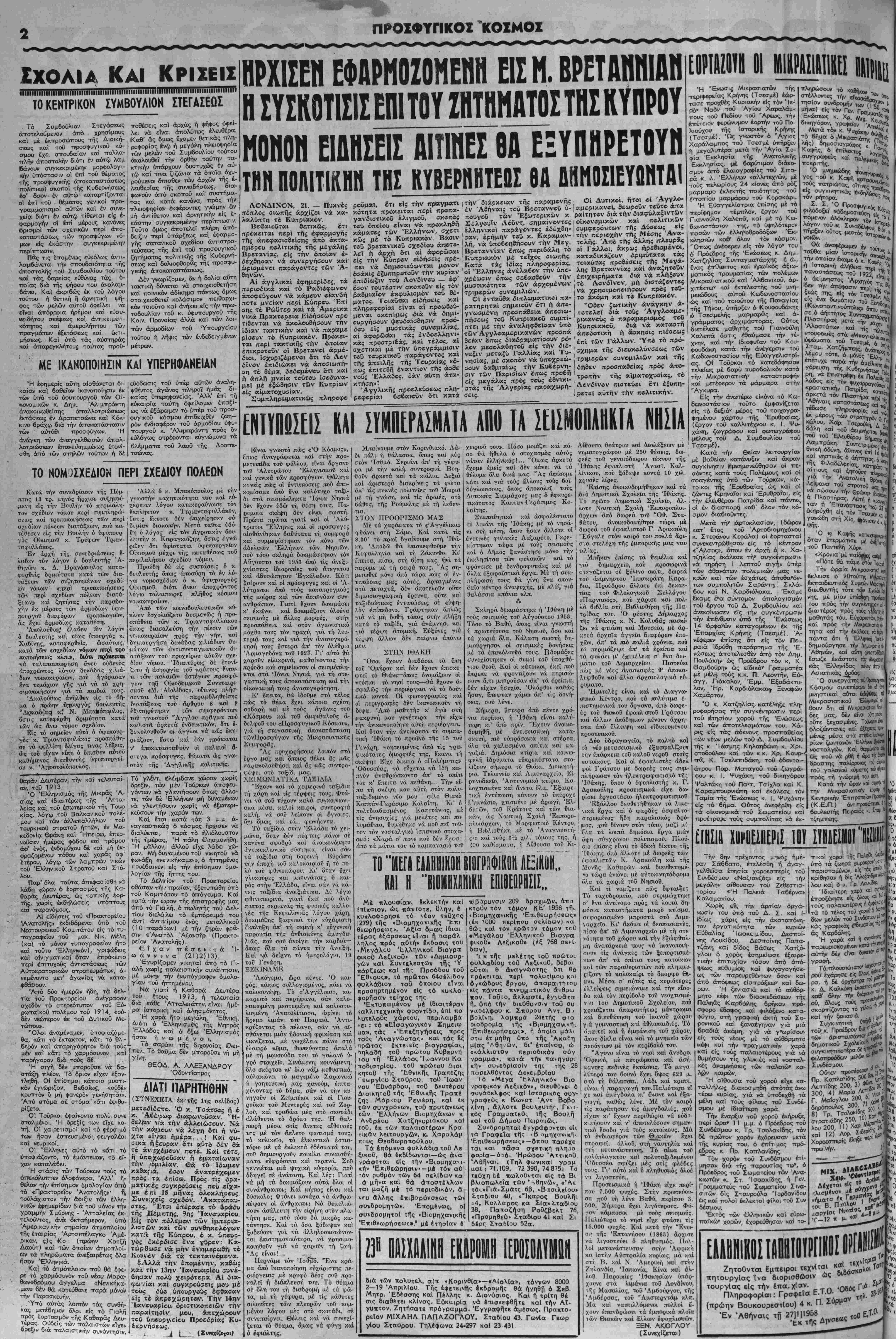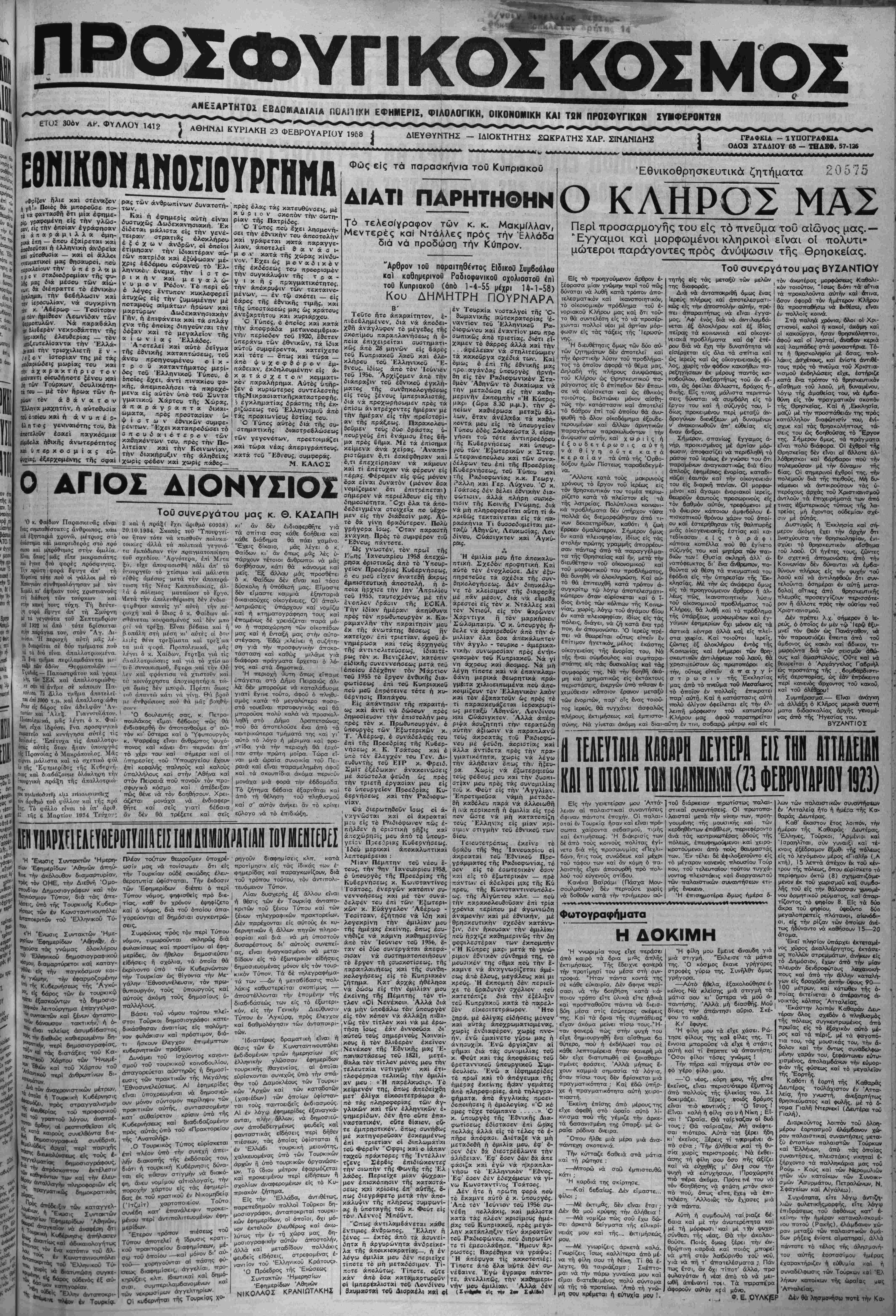 <να τής έπβί/ας 6»ηγ©ΰνΓ«ι την δόξαν καί τό μεγαλείον τής α ϊ ω ν ί α ς Ελλάδος. Άτοτελεΐ καί αύτβ δείγμα τής έθνικής κατατττώοεως, τοΰ «ν«υ προηγούμενον β Ι κ - τ ρ ο ΰ καταντήματος μερί¬ δος τοΰ "Ελληνικόν Τύπον/, β έίΐβϊβς ε,χει, άντΐ ηινακίβυ φ«- κής, άπεμπβλήσει τα ηαρβχό- μενα είς αυτόν υπό τοΰ Συντα ϋ Χά ΰ Συντα γμχ-ικοϋ Χάρτου τής Χώρας, άπαράγρα δ άπαράγραπτα ωματα,, πρός πρβατασίαιν ψ ί α τ ω ν έθνικών συ^τ- ρένιτων. "ιΕχεΊ καταπροδώσει τό σπουδαιότερον των καδηκβντων τού, πρός τη*" Πο- λιτείαν καί την Κοινωνίαν, την διακήρυιξιν τής αληθείας χωρίς φόβον καί χωρίς πάθβς— χ ς τής εκδόσεως τού προορισμόν την συγκάλυψιν τής τ ο α - γ ι κ η $ πρχγματικότητος, την άπόκρυψιν των τεκταινβ- μένων έ ρψ ν τκτα μένων, — έν τω σκότει — ά ή έ είς ί μ, τω σκότει — είς βάρος τής έθνικής τιμής, καί τής ύποστοτοεώς μας ώς κράτους ανεξαρτήτου και κυριάρχβυ. Ό Τύπος, β ©πβϊο; καϊ κατά την άποφράδα μετοονοεμδρια- νην περίοδον τβϋ 1920, έθετεν υπεράνω των έβνικών, τα "ιδία αύτοΰ ουμφέρβντα, κατείχετβ καί τότε — όπως κα'ι τώρα — άπβ ψυχβφθόρον έ-μ- πάδειαν, εκδηλουμένην είς ά- κοττάβχετοινι κομματι- κό' παρλή Αύό ύ παραλήρημα. Αύτός ___τ ξεν β κυριώτερος συντελεστης τήςΜικρααιατικήςκαταοτρβφής. '- έγκληματίας δράβτης τή" ' Φώς είς τα πσρασκήνια τοΰ Κυπριακού ΔΙΑΤΙ ΠΑΡΗΤΗΘΗΝ τελεσίγραφον των κ. κ. Μακμίλλαν, Μεντερές καί Ντάλλες πρός την 'Ελλάδα διά νά προδώσΓ) την Κύπρον. Αρθρον ιοθ παραιτηθέντος ΕΐδικοΟ Συμβοόλου καί καθπμερινοθ ΡαδιοφωνικοΟ οχολιαοτοθ επ) τού ΚυπριακοΟ (όηό 1-4-55 υεχρι 14-1-58) Κου ΔΗΜΗΤΡΗ ΠΟΥΡΝΑΡΑ έν Τβυρκία νοσταλγβϊ τής Ό- Βωμανικής ΐκΰτοκρατβρίας 'β- - ριζώσεως τβΰ 'Ελληνισμοΰάπό ύ- τάς προαιωνίους έστίας τβυ. .«- Ι "ι*·) Π-,', —λ^ —,',-,Ι.. ι.,-. _- . διά της συ- ατηματικής διαβτρεβλώσεως των γεγονβτων, κ*' τώρα νέ*ς Β' Τβΰτ© ήτο απαραίτητον, ε¬ πιβεβλημένον,, διά νά άποδει- χδή άνάγλυφον τό μέγεββς τής σκοπίμου παραπλανήσεως ή β- πβία έπιχειρεϊται συστηματι- κώς άπό 28 μηνών είς δάρος τβΰ Κυπριακβϋ λ|αβϋ καί ολο¬ κλήρου τοΰ 'Ελληνιικοϋ "Ε- βνους, ιδίως άπό τόν Ιούνιον τού 1956. Άρχίζβμεν άπό την διάπραξιν τοΰ εθνικον έγκλιι- ματος τής συνθηκολογήΰεως είς τούς ξένους ίμπεριαλ,ιατάς, διά νά προχωρήσωμεν κρός τα βπίοω άν ατρέχβντες ημέραν μέ την ημέραν είς την πρβϊΌτορί- αν τής πράξεως. Πχρακολβυ- Θοΰμεν τβύς δύο δράοτας ύ- πουργούς επί ένάμισυ έτβς 6ή- ,,»__ί.. λ=..- *«ι —-- =.-!------- Γ μ προετοΐμοβζει μα πρές £ήμα. Μέ τα έηιΟιγμχ κείμενα Αν» χείρας. Άν«η*χ- ριστώμεν β,τι έσκέςρθησαν κ<κί "Εθνους, συμφοράς. Μ. καλοε '^'τι ίρησαν νά κάμουν ά έ ί 0 ΑΓΙΟΣ ΔΙΟΝΥΣΙΟΣ χρη κάμο καί τί έπέτυχαν νά φέρβυν είς πέρ/ας. Φέρομεν είς φως μόνον δσα είναι δυνατόν (μόνον ©σα νομίζομεν ότι έπιτρέπεται) σήμερον νά περιέλθουν είς την δημ<Μΐότητα. "Οχι βλα τα άπβ- δεδειγμένα στοι,χείά πβ ύέχβ- ΤθΟ συνεργάτου μας Κ. Θ. ΚΑΣΑΠΗ Μβν^είς την διάθεσιν μας._Αύ- ίγα;συμΛαθϊο·τατι.ς ανίίρωπος, καω 20.10.1&34, Σκοπός τού 'Τπουργεί- τα σττίτια σας κάθι ιΐιέ έξηνταρΐά χρονώ, ιμέτριος στό οιι ήταν τότε νά κτισθοΰν πολυκα- κάθε διάβημα θά «νίοτημα κάί μαυρειδερό; στό πρό ΐοικιες άλλά τα πολιτικά γεγονό- ' "Έχιεις δίκαιο. υά ι " ~ τό βά νίνη βραδύτερον. Πολύ Ό χ. Φαίδων Παρασ*ει·δς είναι 2 καί ή πράξ( Ιχει άριθμό 60938) κι' αν δέν ένδιαφερθήτε γιά γρηγβρα ϊσως. "Οταν παραοτή ίνα;συμ.'ταθ£<ττατι.ς άνθρωπος, καω 20.10.1&34, Σκοπός τοΰ 'Τπουργεί- τα σττίτια σας κάθε βοηθεία καΐ χνάγκη. Πρός τό συμφέρον τοϋ ιιοτρ ν» ντιιτΛ·ί>Γ>%ί ,τ<%λ,η/,.- **&*■ κ.χβ------ θο; παει Χαμένο. "Εδνβ