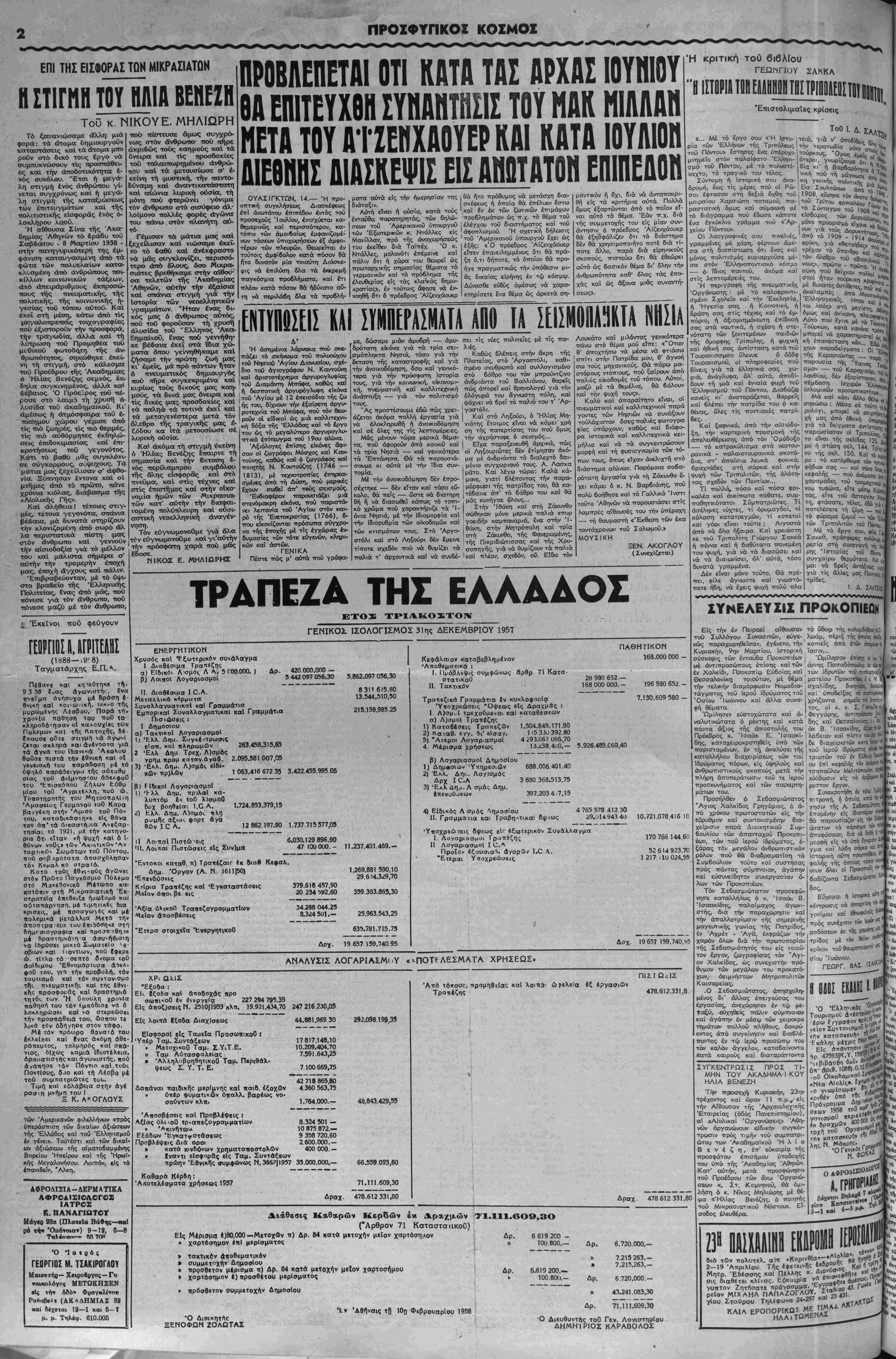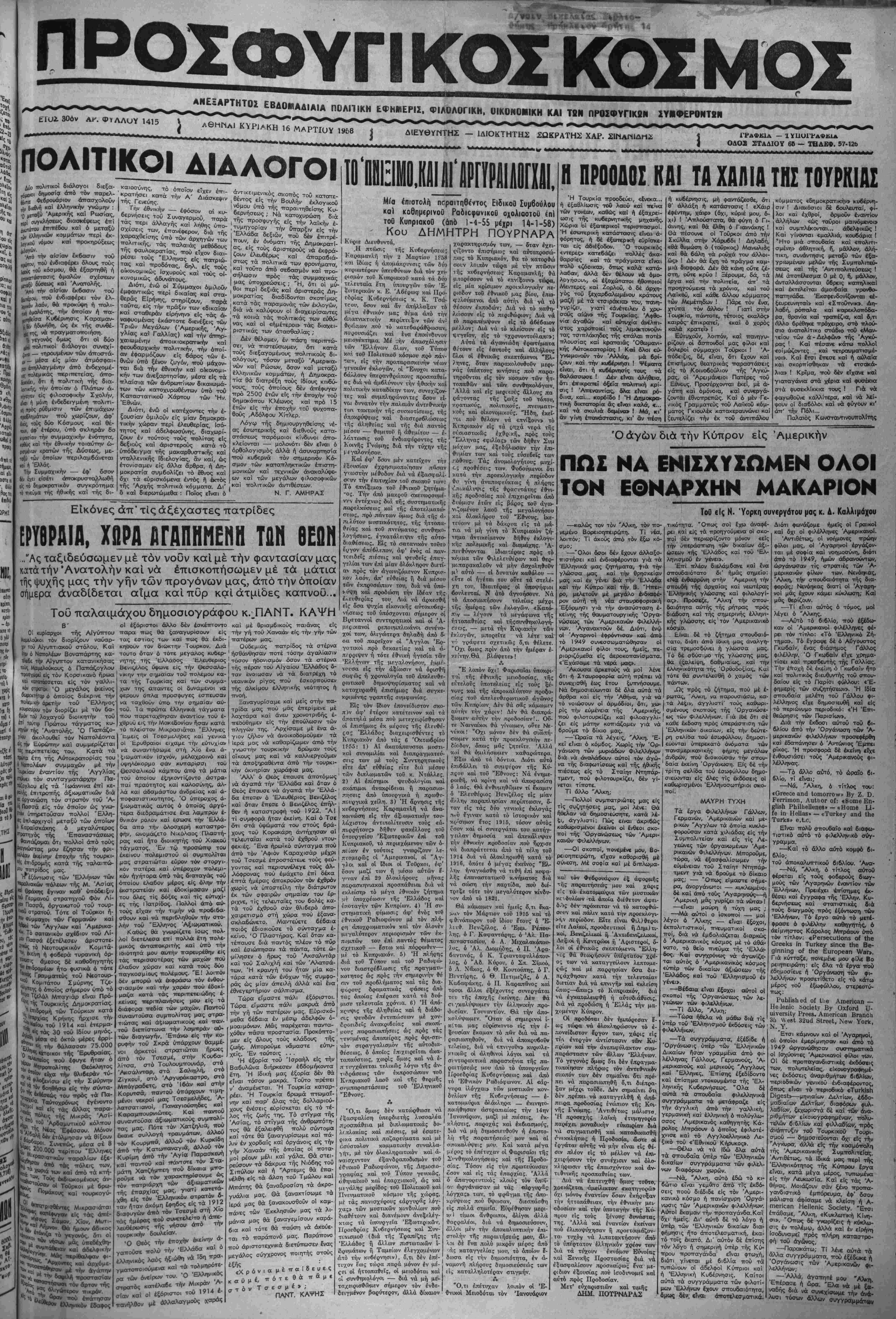 της ττοοο-ώιινήρ ί-ι^ ,ο... _- < , σχεσεις των, εττανέφερον, διά της χαραχθείσης υπό των άρχηγών των ττολιτικής, τάς παλαιάς μεθόδους τής φαυλοκρατίας, ττού είχον διαι- ρέσει τούς "Ελληνας είς πατριώ¬ τας καΐ προδότας, δηλ. είς τούς οϊκονομικώς ίσχυρούς καί τούς οί- κονομικώς άδκνάτους. Διότι, ένώ οΊ Σύμμαχοι όμιλοθν έμφαντικώς ττερΐ δικαίας καΐ στα¬ θεράς Είρήνης, στηρίζουν, τταρά ταύτα, είς την πράξιν των «δικαίαν καΐ σταθεράν ειρήνην» είς τάς ά- ναφυομένας εκάστοτε διενέξεις των Τριών Μεγάλων (Άμερικής, Αγ¬ γλίας κα? Γαλλίας) καΐ την άττηρ- χαιωμένην άττοικιοκρατικήν καί φεουδαρχικήν ττολιτικήν, τήν όττοί¬ αν έφαρμόζουν είς βάρος των ε¬ θνών ύττό ξένον ζυγόν, ττού μάχσν- ται διά την εθνικήν καί οικονομι¬ κήν των ανεξαρτησίαν, μέσα είς τα ττλαίσια των ανθρωπίνον δΐκαιωμά- των των κατοχυρωθέντων υπό τοΰ Καταστατικοΰ Χάρτου των Ήν. Εθνών. Διότι, ένώ οί κατέχοντες τήν ε¬ ξουσίαν όμιλοΰν είς μίαν δημοκρα¬ τικήν χώραν ττερΐ ελευθερίας, Ισό- τητος καί άδελφωσύνης, διαχωρί- ζουν έν τούτοις τούς ττολίτας είς δεξιούς καΐ άριστερούς κοτά τό ύττόδειγμα τής μακαρθυστικής καί ντσλλενικής Ιδιελογίας, αν καί, ώς ετονίσαμεν είς άλλα άρθρα, ή Δη- μοκρατία ονμβολίζει τό έθνος καί δχι τά ευρισκόμενα έντός ή έκτός της Άρχής πολιτικά κόμματα. Δι' δ καί διερωτώμεθα : Ποίος είναι ό την ύπαρξιν είς τήν Έλλάδα δεξιών, πού δέν έτπτρέ- ττουν, έν ονόματι τής Δημοκρατί¬ ας, είς τούς άριστερούς νά έκφρά- ζουν έλευθέρως καΐ άτταραβιά- στως τα πολιτικά των φρονήματα, καί τουτο άττό σεβασμόν καΐ ττρο- σήλωσιν πρός τάς συμμαχικάς μας ύποχρεώσεις ; "Η, ότι οί μύ- θοι περί δεξιάς καΐ άριστεράς Δη¬ μοκρατίας διαδίδονται σκοπίμως κατά τάς παραμονάς των έκλογών, διά νά καλύψουν οί διαχειρίσαντες τά κοινά τάς πολιτικάς των ευθύ¬ νας καΐ οί «ήμέτεροι» τάς διαχει- ριστικάς των άτασθαλίας ; Δέν θέλομεν, έν ττάο-τι τηεριτττώ- σει, νά πιστεύσωμεν, δτι κατά τούς διεξαγομένους ττολιτικούς δι- σλόγους, τόσον μεταξύ Άμερικα¬ νών καΐ Ρώσων, δσον καί μεταξύ έλληνικών κομμάτων, ή Δημοκρα- τία θά διατρέξη τούς ίδίους κινδύ- νους, τούς όττοίους δέν άττέφυγεν ττρό 2500 έτών είς την εποχήν τοΰ δημοκόπου Κλέωνος καΐ πρό 15 έτών είς τήν εποχήν τοΰ ψυχοττα- θοΰς ,Αδόλφου Χίτλερ. Λόγω τής δημιουργηθείσης νέ- ας έσωτερικης καΐ διεθνοΰς κατα¬ στάσεως παρόμοιοι κίνδυνοι άττο- κλείονται — μολονότι δέν είναι ό όρθολογισμός άλλά ή άσυναρτησία ττού κυβερνά τόν σημερινόν Κό¬ σμον των καταπληκτικών έτπστη- μονικών καΐ τεχνικών άνακαλύψ&- ων καΐ των μεγάλων φιλοσοφικών καΐ πολιτικών άντιθέσεων. Ν. Γ. ΑΜΗΡΑΣ Μία έπιστολή π^ραιτηθέντος ΕΐδικοΟ Συμβούλου κα) κοθημερινοΰ Ραδιεφωνικοϋ οχολιαστοθ επί τού Κυπριακοΰ (άπό 1-4-55 μέχρι 14-1-58) Κου ΔΗΜΗΤΡΗ ΠθΥΡιΊΑΡΑ Είκόνες άπ' τίς άξέχαστες πατριδες ΕΡΥΘΡΑΙΑ, ΧΩΡΑ ΒΓΑΠΗπΕΗΒ ΤΔΝ ΘΕΟΝ ..Άς ταξιδεύσωμεν μέ τόν νούν καί μέ τήν φαντασίαν μας κατά τήν Ανατολήν καί νά έπισκοπήσωμεν μέ τα μάτια τής ψυχής μας την γήν των προγόνων μας, άπό τήν όποιαν σήμερα αναδίδεται αΐμα καίπθρ καίάτμίδες καπνου... Τοΰ παλαιμάχου δημοσιογράφου κ.^ΠΑΝΤ. ΚΑΨΗ , Β 0, κυρβρχο. της>