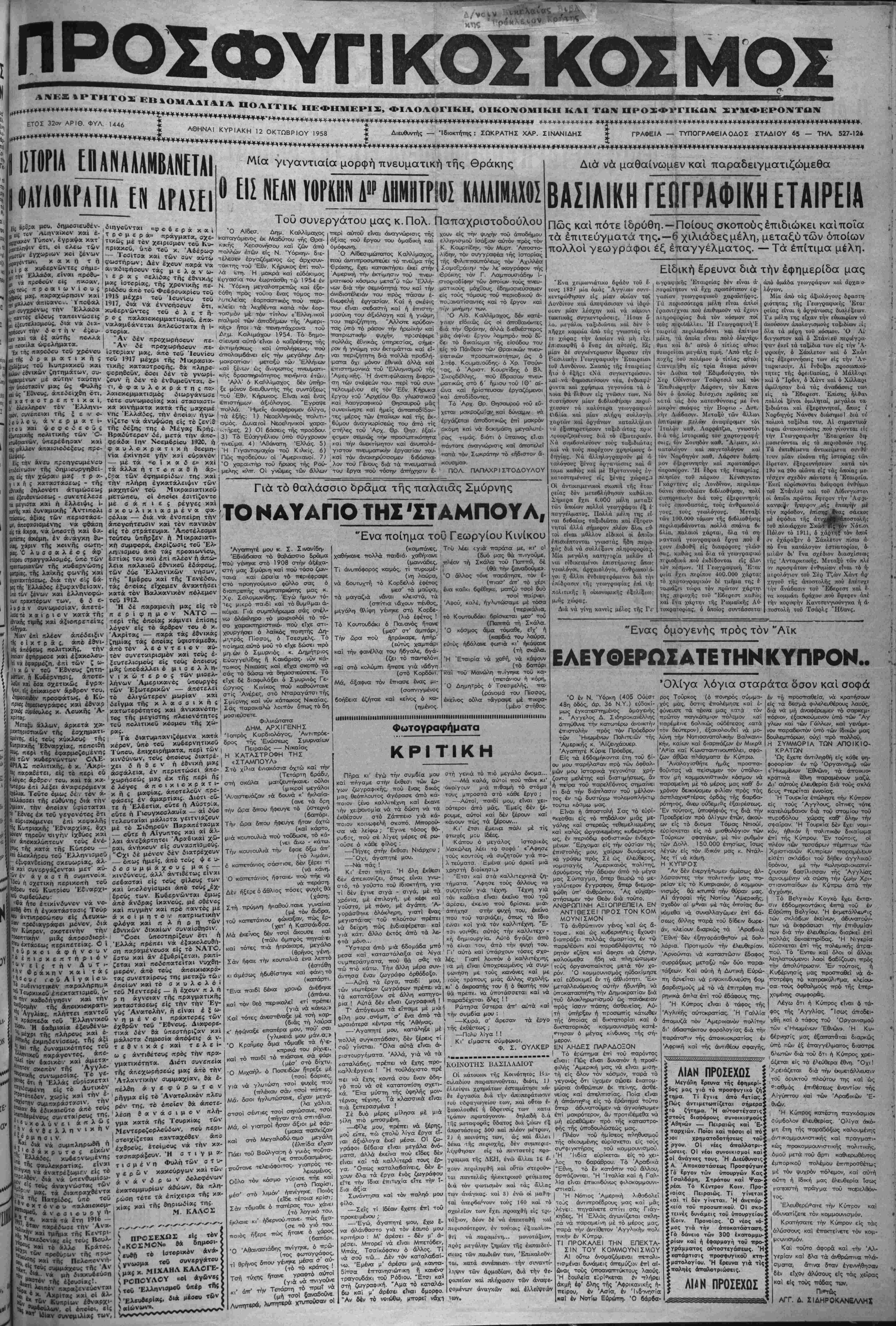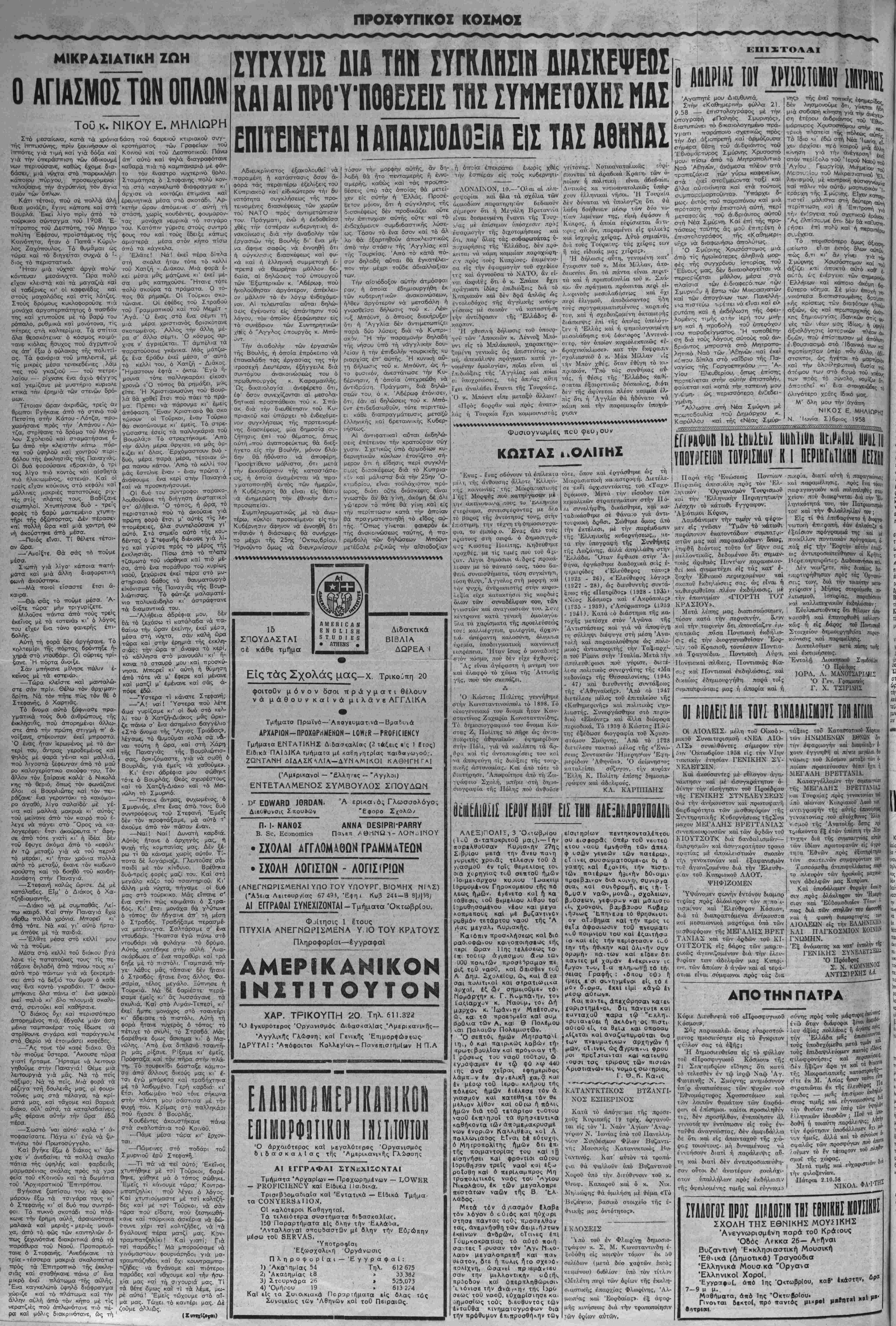 μικοΰ Συναιτερισμοή. <ΝΒΑ ΑΙΟ- ΛΙΣ» συνελθόντες σημείον την :·ιι Όκτωβρίου 1958 είς την νΐιιν τ<χ*ακήν ετησίαν ΓΕΝΙΚΗΝ ΣΥ- ΝΕΛΒΤΣΙ-Ν. Καιί άκοΛκταντες μέ εθλογον άγα.- νάκτησιν καί μέ άσνγκράττ(τον ό- δι'νην την είσήγηιθτν τού Προ«δςου τής ΓΕΛΊΚΗΣ ΣΤΝΕΛΕΥΣΚΏ^ Ο'ύ την άνή»ον<στον καί πιρωτοφανή δαοιβα,ρότητα των μισθτκρόριων τής ( Συντηρητικίίς Κυβε'ρνήσεως τήςΣυμ ι μαχου ΜΕΓΑΛ/ΗΣ ΒΡΕΤΤΑΝΙΑΣ συνε.τ.ικο«ροι,·σών καί των όρδών τοΰ ΚΙΟΥΤΣΟΤΚ διά δανδαλισ,μών— | έμΛρησμών καΐ άσυγκρατήτου τροιιο κςιατύας μέ αποκλειστικόν σκοπόν τί,-ν γενοκτονίαν καί έξαφανισμόν τι,ϋ άγωνιζομένου διά την Έλευθΐ- ρ αν τοΰ Κυπριοκοΰ ΛΑΟΤ. ΨΗΦΙΖΟΜΕιΝ 'Υψώνομιεν φωνήν έντόνου διαμαρ τυςίας Λρός όλάκιλτ|ιριον τόν μ ,το ι- ιισα^νον καί Ελεύθερον Κόσμον, διά τα διαπραττάμενα άνήκουσςα κσί μεσαιωνικά μαρτύρια ύ.τό των! μισθοφόρων τής ΜΕΓΑΛΗΣ ΒΡΕΤ | ΤΑΝΙΑΣ κα·ί των ορδών τοΰ ΚΙ-1 ΟΐΤΣΟΤΚ είς βό,ρος των μαρι:υ- ρικώς άγωνιζομένων διά την έλ«ι- Τΐίθίαν των άιδελφών μας Κυπ.31- ον, των οποίων ό αγών καί αί τερά¬ στιαι είναι σΰμφωνοι πρός τάς δια -ιάξεΐις τοΰ Καταοτατι«>0 Χάρ/ΐαυ