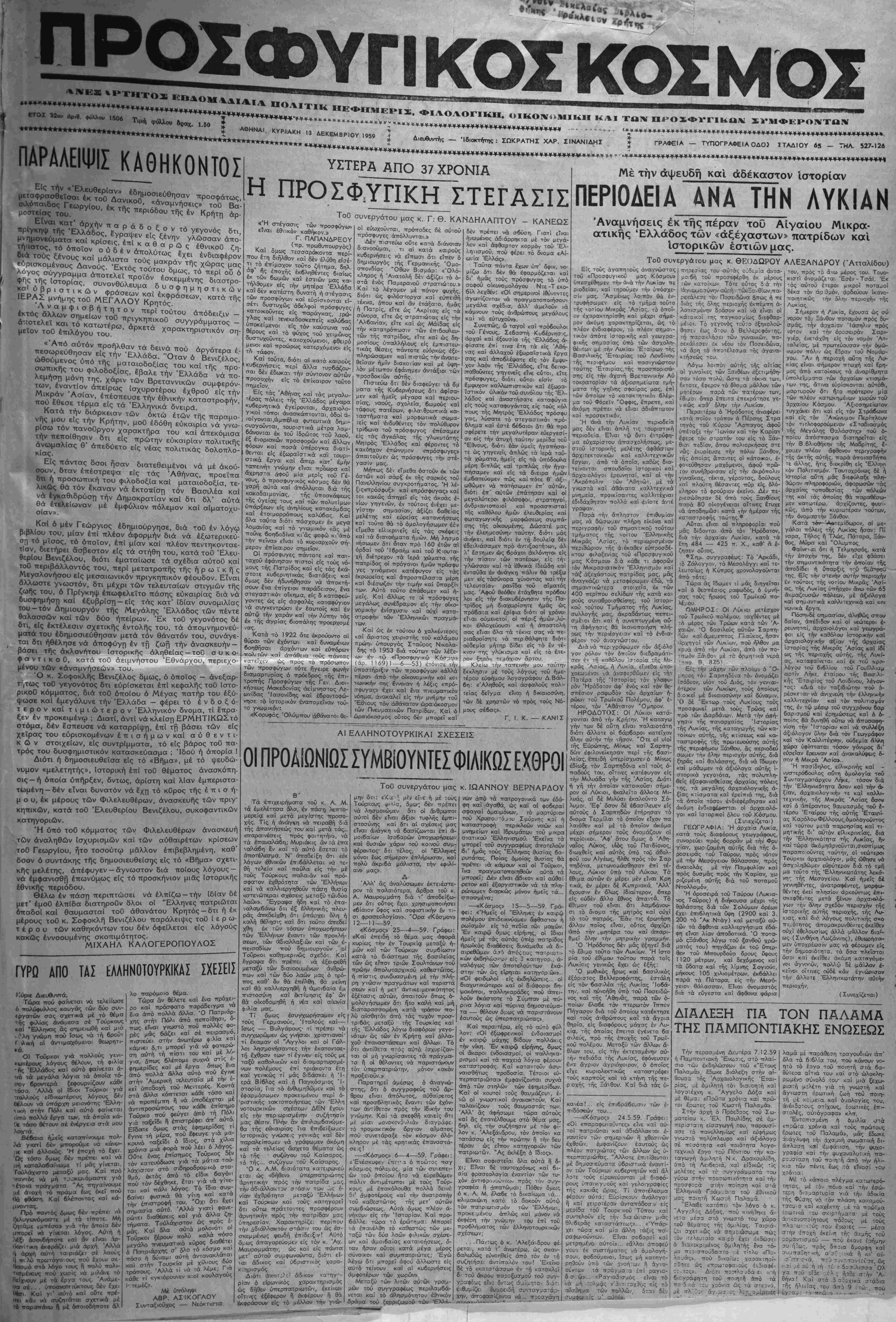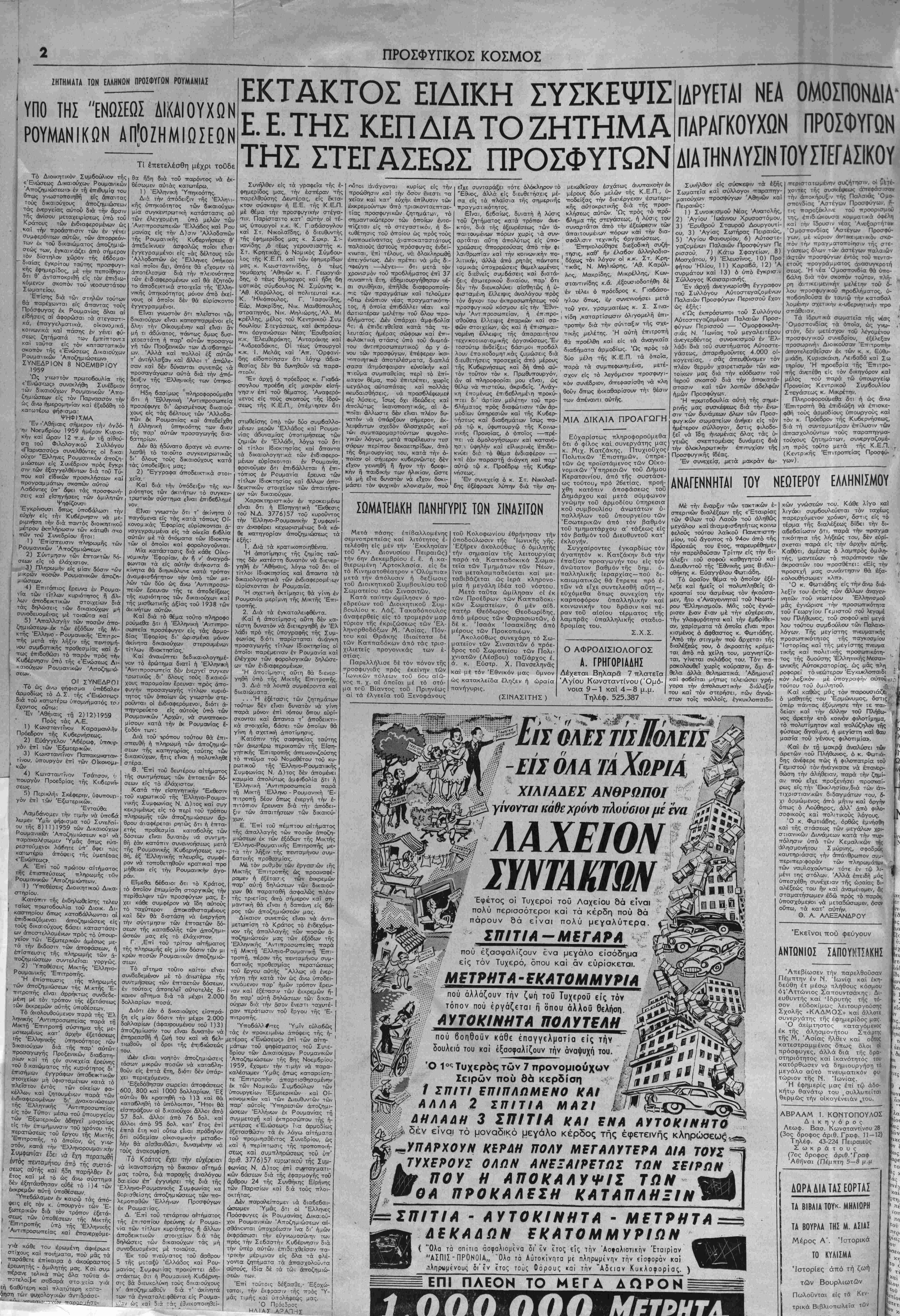 ναν καΐ έξετασν των έ<κρ€,μών ή- | δή παρ' αύτη δηλώσεων των δΐκαι- ούχων διά την όσον ένεστι ταχυτέ- Ι ραν ττεράτωσιν τού έργου τής Έ- πιτροττής. 'ΥτΓθβάλλ^τες 'ΥαΤν ευλαβώς τάς έν ττροχειμέινω άττόψεις τής ή- η ΰπσθέσεων. Ύττεβάλαμεν έν καιρώ τάς άττό- ψεις είς τόν κ. υπουργόν των Ε¬ ξωτερικών διά τόν τρόπον έξετά¬ σεως των ΰποθέσεων τής Μικτης ' ΈτΓπτροπης υπό τής 'Ελληνικής , Άντιπροσωττείας καί έττανερχ» :ομε- γιά κάθε τού ιέρωμένη ιάφιέρωνΕ στιχους καΐ ποιήματσ, πού μάς τα ( τταραθετε ιέπίκαιρα ό άκού,ραστος έρευνητής - όμιλητής μας. Καΐ συμ περανε τβλικά ττώς δλα τοΰτα ά- % ^'τελο^ί* ισο!δοτρά στο χςΐα γιά τή 6αιθύτε.οη καί πλα,τύτερη <οτα- οσηών ψυχολογιχών άντιδΊράσί- ώ αί δροι τής έπιβιώσεώς | μάτων τού ψηφίσματος τού Συε- δρίου των Δικαιούχων Ρουμανικών Άζ ώ έπηρεασθή ή ζωή τού καΐ νά 6ελ- μετέρας «Ενώσεως» έπΐ των αίτη- τιω9ούν ~' ""- --" —■«-'-—'-- ' - - - τού. Δέν είναι νοητόν άττοζημιώσεις τόσων μιικρών ποσών νά καταβλη- Θού^ είς έπτά ετη, διότι δέν ΰπάρ- χει περιεχόμενον. Έξιεδό&τρ·αν σωρείαι αποφάσεως 600, 800 καΐ 1000 δολλαρίων. Έξ αυτών θά κρατπΐθή το 1)3 καΐ θά κατα)6λη9ή τό υπόλοιπον. "Ητοι θά είστηράξουι'οί δκαιούχοι άλλοι άπό 57 δολ. άλλοι άττό 76 δολ. καΐ άλλοι αττό 95 δολ. κατ' έτος έτπ έπτά ετη καΐ ούτω είι^αι πρόδηλον δτι ουδεμίαν οικονομικήν μεταβο¬ λήν θά αίσθανθώσι, δυναμένην νά τοΰς άνσ<ου<ρίση. Τό Κράτος έχ,ει ηψ ευχέρειαν νά ίκανοποιήση τό δίκαιον αΤτημά μας τούτο, διά παραχής ανάλογον δα.'ϊίου ιέπ' έγγυησει τής διά τής Έλληινο-Ρουμανικής Συμφωνίας κα ©ορσθείσης αποζημιώσεως των ττο- λεμοπαθών Έλλήνων Προσφύγων έ< Ρουμαν ίας. Δ 'Εττΐ τού τετάρτου α'Γτήματος τής έττιτοπίου ερεύνης <ίν Ρουμα- ία των τίτλων κυριότηιτος ή άλλων άποδεικτΐι<ών στοι·ε!»ν δ ά τάς δηλώσεις των δικαιούχων τάς μή συνοδευομένας μέ τοιαΰτα. τού πνεύκατος τού άοθρου 5 τής μ'εταξΰ "Ελλάδος καΐ Ρου¬ μανίας Συμφωνίας προ<ύπτει άδι- στάχτως δτι ή Ρουαα/ΐ<ή Κυβέρνη¬ σις 3ά διιευ<ολύ»η τοΰς δκαιούχους ■' άποζημ ωθοΰν διά τ' ιάκίνητά ών τα έγκαταλΕ.φθέντα είς Ρουμα- _χν ώς <αΐ 5 ά -άς έ3«Ί·<οττοιη3ϊί- χ μ Άποζημ ιώσεων τής 8ης Νοεμβριού 1959, έχομεν την τιμήν νά παρα¬ καλέσωμεν Υμάς δπως κατσρΐίση- τε Επιτροπήν άπαρτισθησομένην έκ των Ναμικών Συμβούλων των υπουργείων Εξωτερικών καί Οι¬ κονομ κων <οά των Διευθυντών των παρ' αυτοίς Ύπηρ-ισιών άποζημ ι¬ ώσεων Έλλήνων έ< Ρουμανίας τή συμμετοχή καί έ<προσώττου τή,ς ή- μετέρας «Έ,ώσεως» ϊα αρμοδίως έξετοασθώσΊν τα έν λόγω αϊτή,ματα τού προ,μνησ3έντος Συνεδρίου, ώς καί ή ττερίτττωσΐς τής τροποποιή¬ σεως καΐ συμπληιοώσεως τοϋ ΰπ' αριθ. 3776)57 χυρωπχού τής Συμ¬ φωνίας Ν. Δ)τος έπτΐ συνταγματι- «ών βάσεων διά τής έφαρμογής τού άρθρου 24 τής Συνθήχης Εί'θήνης των Παιριισίων καϊ δ ά τούς πλοι- ο<τήτας. Δέν παραιλείπομεν νά διαβεβαι- ώσωμεν Υμάς δτι αί °Ελλη·νες Πρόσφυγες έκ Ρουμανίας Δικα οΰ- χοι Ρουμανικών Άποζημ ιώσεων αί- σθάνονται υποχρέωσιν ίνα δι' ήαών έκφράσωσι την ευγνωμοσύνην τ^ν}^ πρός την Σεβαστήν Κυβέρνησιν διά την ϋττέρ αυτών έπιδε'χθεΐσαν ττα- τρκήν μέρι,μναν είς δλα τα φλέ- γον*τα ζητήματα τα άπασχολού^τα αύτούς, ιδία δέ τα τώ άττοζημιώ- σεών των Επί τούτοις δέξασθε,· Έξοχώ- τατοι, την έ<φοα3·ιν τής πΐός Υ¬ μάς τιμής καϊ ύτολήψεφς μας. Ό Πρόί5οος *_ ΗΛ Ι ΑΓ %ΙΙ ΟΛΕΣΤΙΣΙΙΟΛΕΙΪ ΕΪΣΟΛΑΤΑΧαΡΐΑ ΧΙΛίΑΔΕΣΑΝΘΡΩΠΟί γίνονται κάθεχρόνϋ ττλοόΰιοι μέ 'ινα ΑΑΧΕΙΟΝ ΙΥΝΤΑΚΤίίΝ Εφέτος οί Τυχεροί τού Λαχείου 9ά είναι ίθλϋ περισσότεροι καΐ τα κέρδη πού θά πάρουν δα είναι πολύ με
