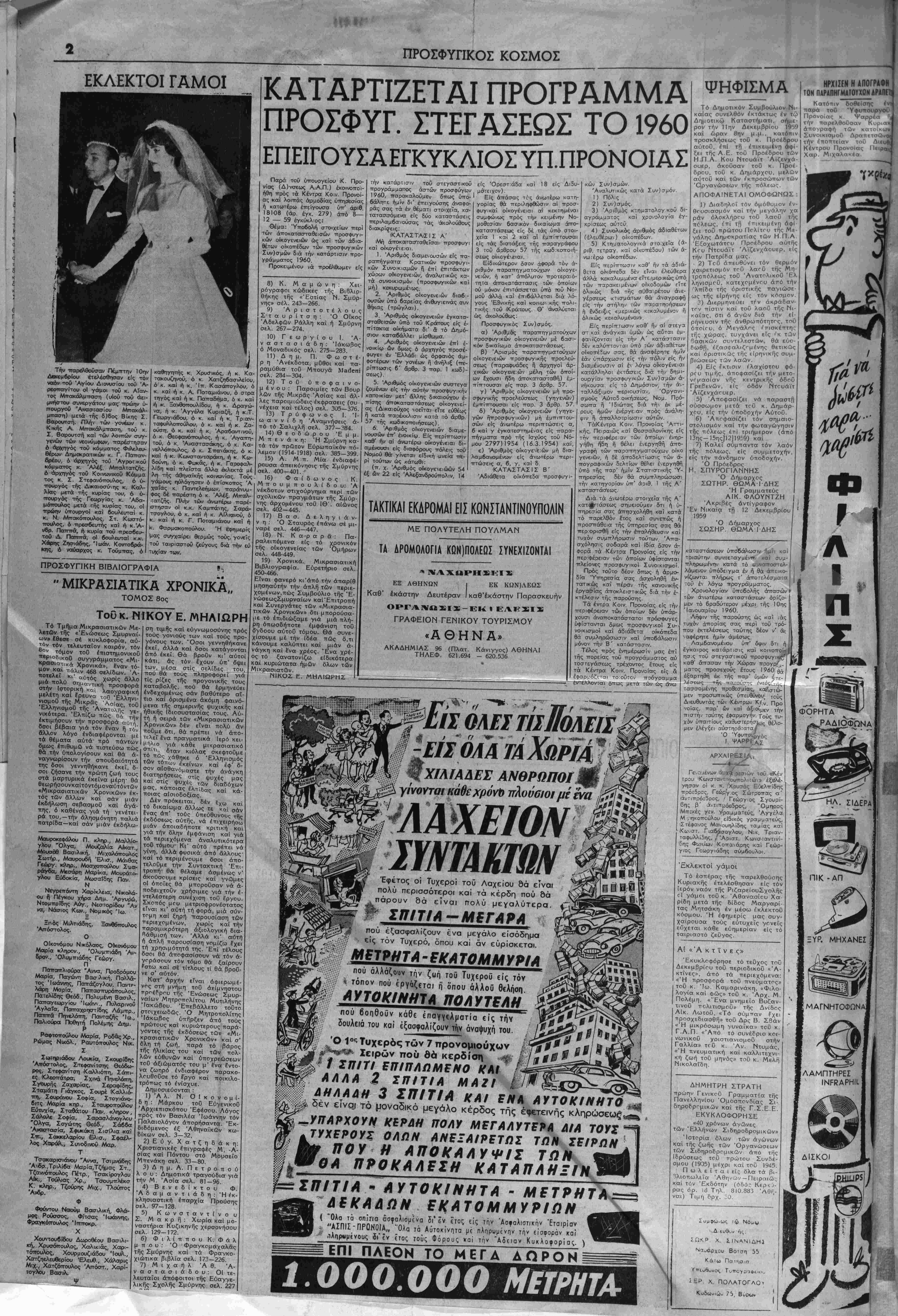ή ένδειξις «μερικώς '<ςκαλυμένςιν ή άλικώς κεκαλυμένον» Είς περίπτωσιν ,καθ' ήν αί στεγα στ καΐ άνάγχαι υμών ώς αθται έμ- φθΓί'ζονται είς την Α' κατάστασιν δέν καλύτΓΤονται υπό των άδιαθέτων οίκοττέϊων σας, θά άναφέρητ'ε θΜΪ'ν έά/ ύττάρ'χωσιν είς τήν πόλιν είς ην διαμένουσιν αί έν λόγω οικογένειαι κατάλληλοι έ<τάσεις διά τή; δημι¬ ουργίαν προσφυγικόν Συν)σ,αών ά- νήκουσα είς τό Δημόσιον, την αν¬ ταλλάξιμον περιουσίαν, Όργανι- σμούς Αύτο5 οικήσεως, Νομ. Πρό- σωττα ή Ιδιώτας διά τήν έκ μέ- ρους ημών ένέργε,αν ποός ανάλη¬ ψιν ή ατταλλοτρίωσιν αυτών. ΤάιΚέντρα Κοιν Προνοίας Άττι- κής, Πειραιώς καΐ Θεσσαλονίκης είς τήν περιφέρε αν των οποίων ένηρ- γήθη ίηιδτ-ν ή θέλει ενεργηθή άπο- γραφή των τταροπτηγιματούχων οίκο γενειών, ή δέ άττοδελτίωσις των ά- ττογραφιχών δελτίων θέίλεΐ ενεργηθή υπό τής παρ' ημίν Στατισπκής Υ¬ πηρεσίας δέν θά συμπληρώσωσ τήν κατηγορίαν ΰττ' άοιθ. 1 τής Α καταστάσεως. Διά τα ανωτέρω στοιχεΐα τής Α' κατφτάσεως σηυειούμεν δτι ή ύ- πηρεσία σας άτΓΓΐσχολήθη καΐ κατά τό παρελθόν ετος καΐ συνεπώς ή προοττάθεια τής υπηρεσίας σας θά περ ορισθή είς τήν έττσλήθευσιν και τυχόν συμπλήρωσιν τούτων Άττα- σχόλησις σοβαρά καΐ ιδία όσον ά¬ φορά τα Κέντοα Προνοίας είς τήν ττερ φέρειαν τώ οποίων ΰφίο"τανται πλείονιες προσ-φυγικοΐ Συνοικισμοί Πρός τουτο δέον δττως ή αρμο¬ δία Ύπηρεισία σας άσχοληθή έν- τατικώς κσί ττέραν τής κανονικής εργασίας (τποκλειστικώς διά την ε¬ κτέλεσιν τής παρούσης Τα έντρα Κοιν. Προνοίας είς την περιφέρειαν των οποίων δέν υπάρ¬ χουσι άναποκατάστατοι πρόσφυγες ΰφίστανται δμως προσφυγικοΐ Συ- νοικισμοΐ καΐ άδιάΒετα οί'κόπεδα θά συμληοώσωσιν καΐ ύττοιβάλωσιν μόνχ3 την Β' κατάστασιν. _ Τέλος πρός ένημέρωσίν μας επι τής πορείας τού προγράμμστος αύ τοστεγάσεως τρέχοντος ετους είς τα Κέντρα Κοιν. Προνοίας είς α έφαρΐ'όί^ται το ούτον ποόγοαμμα εντέλλονται δπως μετά των ώς άνω ΨΗΦΙΣΜΑ Τό Δημοτικόν Συμβούλιον Νι- καίας συνελθόν έκτάκτως Ιν τω Δημοτικώ Καταστήματι, σήμε¬ ρον τήν Ίΐην Δεκεμβριού 1959 καί ώραν 8ην μ.μ., κατόπιν προσκλήσεως τοθ κ. Προέδρου αύτοΰ, επί τή έτιικειμίνη αφί¬ ξει τής Α.Ε. τοΰ Προέδρου των Η Π Α. Κου Ντουάιτ Άιζενχά- ουερ, άκοϋσαν τοϋ κ. Προέ¬ δρου, τοΰ κ. Δημάρχου, μελων αύτοΰ καί των Εκπροσωπών των Όργανώσεων τής πόλεως. ΑΠΟΦΑΙΝΕΤΑΙ ΟΜΟΦΩΝΩΣ : 1) ΔιαδηλοΓ τόν ομόθυμον έν- θΓυσιασμόν καί τήν μεγάλην χά ράν ολοκλήρου τοΰ λαοΰ τής πόλεως, ι'ττί τή εΊτικειμένη άφί ξει τοΰ τιρώτου ΙΐΓλίττυ τής Με- γάλης Δημοκρατίας των Η ΠΆ 'ΕζοχωτάτΓυ Προέδρου αυτής Κου Ντουάιτ 'Λιζενχάουερ, είς τήν Πατρίδα μας. 2) Τοϋ άπευθόνει τόν τσμόν τγΟ λαοϋ θερμόν χαιρετισμόν τοϋ λαοΰ τής Μη¬ τροπόλεως τοΰ Άνατολικοΰ Έλ ληνισμοϋ, κατεχομένου άπό τήν 'λπίδα τής όριστικής παγιώσε- ως τής είρήνης 4ίς τόν κόσμον ?) Διερμηνεύει ΤΓν ακράδαν¬ τον ττίστιν καί τοθ λαοΰ τής Νι- καίας, ότι ό αγών διά τήν εί- ρηνευσιν τής ανθρωπότητος, τοΰ όποίτυ, ό Μεγάλος ί'πισκέπτης τή;· χώρας, τυγχάνει εΤς >'κ των