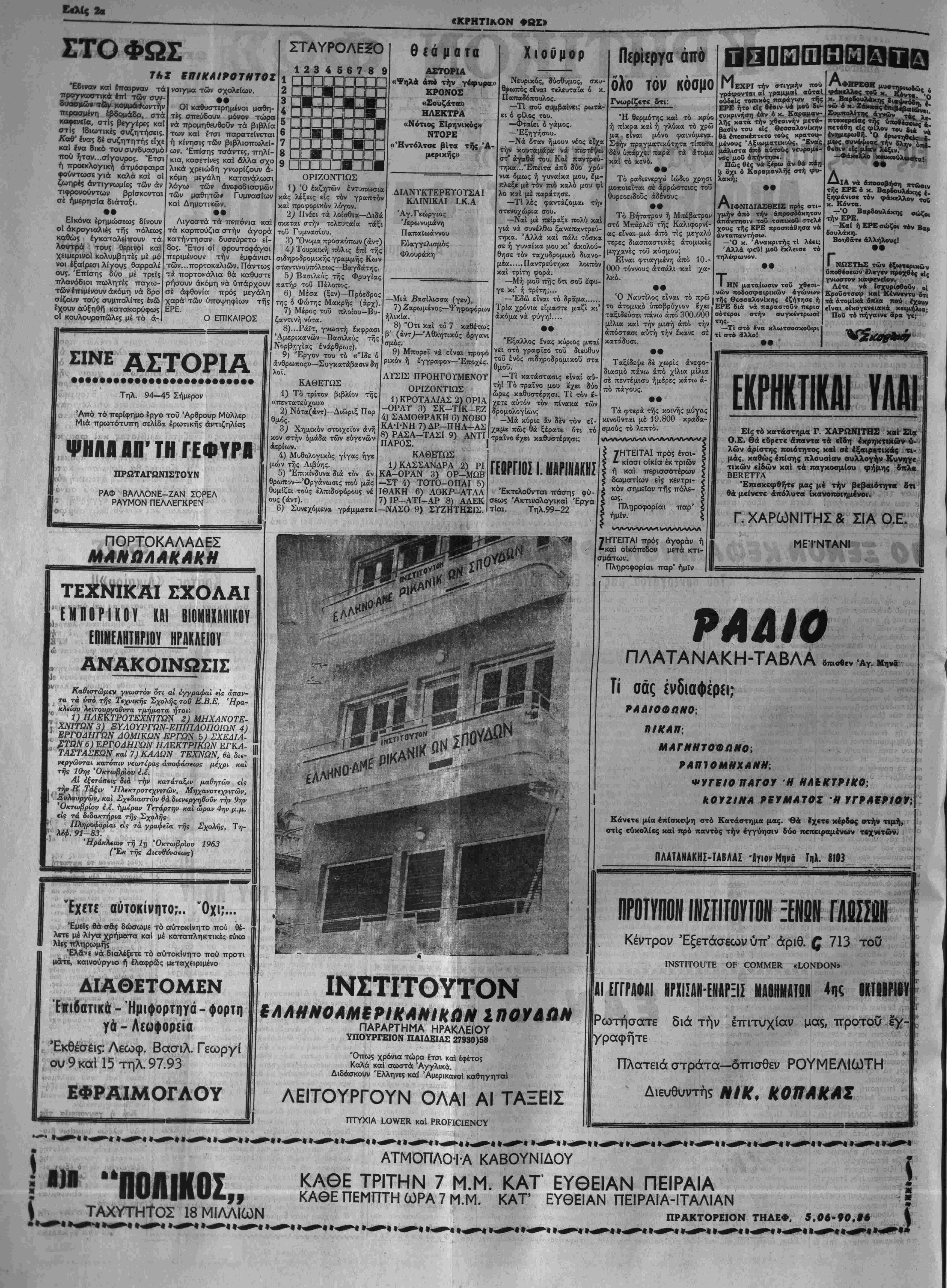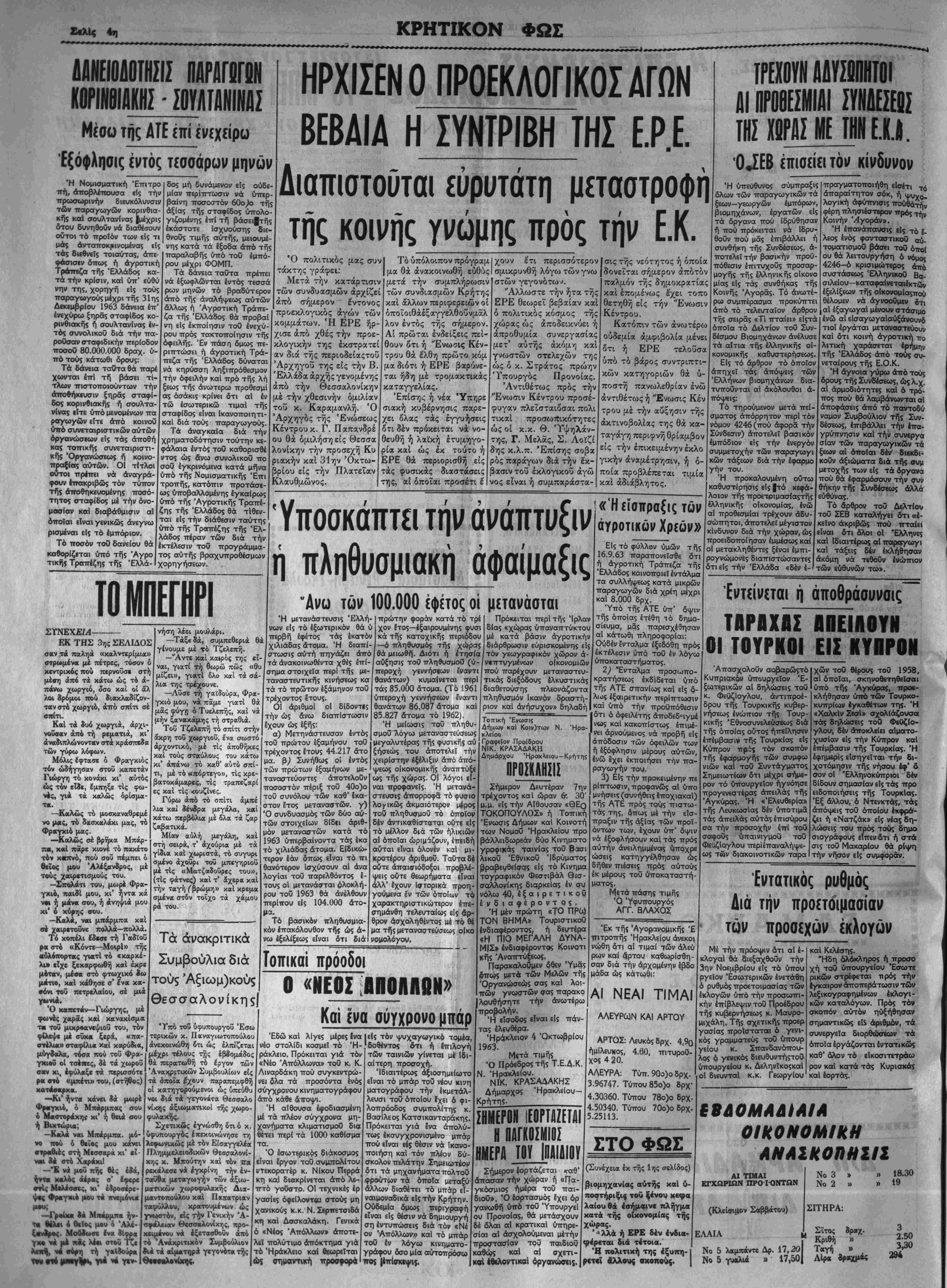 ξετν4β«<. Μοδοωσε ίνα δίφρα γκ· ν« ΐλέ πίς λέει ότου Τζι νΑ «ύ·η τή γοιϊδούρα. 4 ^ ^ γ«ν- 'Τπό τοθ ύφυπουργοΰ Έσω τερικών κ. Παναγιωτοπούλου ανεκοινώθη δτι ώς έλπϊζεται ιέχρι τέλους της εβδομάδος θά περατωθή τό έργον των 'Ανακριτικών Συμβουλίων είς τα όποϊα Ιχουν παραπεμφθή οί κατηγορούμενοι ώς ύπεύθυ νοι διά τα γεγονάτα Θεσσαλο νίχηί άξιωματικοί τ% -χωρο- φυλακης. Σχετικώς εγνώσθη δτι ό κ. υφυπουργός έπεκοινώνησε τη λώ έ ό Εΐέ Καί ίνα ουγχρονΌ μπάρ | λίγες μέρεςίναΐεΐς τόν ψυχαγωγικό τομέα, κοσμεΐ τό Ή-' δοθέντος δτι ή έπιλογή μετά των Μελών τής "Οργανώσεως σας καί λοι- ΤΓών γνωστών σας παρακο |λ©υθήσητε την ανωτέρω Είς τό φύλλον υμών τής 16.9.63 παραπονεϊσθε ότι ή άγροτική Τραπέζα τής Ελλάδος κοινοποιεΐ έντάλμα τα συλλήψεως κατά μικρών παραγωγών διά χρέη μέχρι καί 8.ΟΟΟ δρχ. Υπό τής ΑΤΕ ύπ' όψιν τής οποίας ετέθη ι ό δημα- σίευμα, μής παρεσχέθησαν αί κάτωθι πληροφορίαι: Ουδέν ενταλμα εξεδόθη πρός εκτέλεσιν υπό τοθ έν λόγ ύποκαταστήματος. 2) Ένταλμα προσωπο- κρατήσεως έκδίδεται ύτπ: τής ΑΤΕ σπανίως καί. είς ό λιος εξαιρετικήν περίπτωσιν καί υπό την προϋπόθεσιν ότι ό όφειλέτης άποδεδηγμέ νως καί κακοπΐστως έπιμέ- 'νει άρνούμενος νά προβή εί, απόδοσιν των όφειλών των ή εξόφλησιν μέρους αυτών, ένώ εχει έκποιήσει την πα¬ ραγωγήν τού.. 3) Είς την προκειμένην πε ρίπτωσιν, π ροφανώς αί υπο μνήσεις (συνήθεις έποχιακαί) τής ΑΤΕ πρός ταΰ,ς πιστω- τάς της, όπως μέ την είσ¬ πραξιν τής άξίας των προϊ- όντων των, έχουν ύπ' όψιν νά έξοφλήσουν καί τάς πρός αυτήν άνειλημμένας ήποχρε ώσεις κατηγγέλθησαν ώς δήθεν πιέσεις ττρός αύτούς έκ μέρους τοθ ύποκο-ταστή- ματοξ. Μετά πάσης τιμής Ό Ύφυπουργός ΑΓΓ. ΘΛΑΧΟΣ τής σειράς «Τί πταίει» είςτι όποϊα τό Δελτίον τοθ Συν δέσμου Βιομηχάνων άνέλυσι τα αϊτια τής έλληνικής οί· κονομικής καθυστερήσεως Είς τό άρθρον τό όποϊο άπηχεΐ τάς άπόψεις των Έλλήνων βιομηχάνων δια τυπουνται αί άκόλουθοι ά- πόψεις: Τό τηρούμενον μετά πεί- σματος άπόρρητον περί τόν νόμον 4246 (πού άφορά την Σύνδεσιν) αποτελεί βασικόν έμπόδιον είς την ένεργόν συμμετοχήν των παραγωγι κων τάξεων διά την έφαρμο γήν τού. Ή προκαλουμένη ούτω καθυστέρησις είς §τό κεφά¬ λαιον τής προετοιμασΐαςτής έλληνικής οίκονομίας, ένώ αί προθεσμίαι τρέχουν άδυ- σώπητοι, αποτελεί μέγιστον κίνδυνον διά την χώραν, ώς προειδοποίησαν έμμεσως καί οί μετακληθέντες ξένοι έμπι- ρογνώμονες διαττιστώσαντες δτιείςτήν Έλλάδα «δέν έ- ένώ αί είσαγωγαίαύξάνουνό τιοί εργάται μεταναστεΰουν καΐ δτι κοινή άγροτική -0 λιτΐκή χαράσεται Ιρήμην τής Ελλάδος άπό τού$ συ- νεταίρους τής Ε.Ο.Κ. Ή άγνοια γύρω άπό τούς δρους τής Συνδέσεως, ώς λ.χ. αί άρμοδιότητες καί 6 τρό- πος πού θά λαμβάνωνται αί άποφάσεις άπό τό παντοδύ ναμον Συμβούλιον τής Συν¬ δέσεως, επιβάλλει την έπα- γρύπνησιν καί την συνεργα σίαν των παραγωγικών τα ξεων αί οποίαι δέν διεκδι- κοϋν άξιώματα διά τής συμ ή των είς τα δργανα η χ ργ πού θά έφαρμόσουν την συν θήκηντής Συνδέσεως άλλά ευθύνας. Τό άρθρον τοΰ Δελτίον τοθ ΣΕΒ καταλήγει δτι «έ- κεϊνο ακριβώς πού πταίει Ιναι δτι δλοι οί "Ελληνες :αί ιδιαιτέρως αί παραγωγι αί τάξεις δϊν εκλήθησαν άκόμη νά τεθοΰν ενώπιον ων «ύθυνών τω». ή αποθρασυν/σις λεφωνικώς μέ τόν Εΐσαγγελέα Πλημμελειοδικών θεσσαλονί¬ κης κ. Μπούτην καί τόν πα¬ ρεκάλεσε νά έγκρίνη την εν¬ ταύθα μεταγωγήν των αξιω¬ ματικών χωροφυλακήν Δια- μαντοπούλου καί Π«ι-ατριαν ταφύλλον, κρατουμένων ώς γνωστόν, είς την Γενικήν Α¬ σφάλειαν Θεσσαλονίκης, π