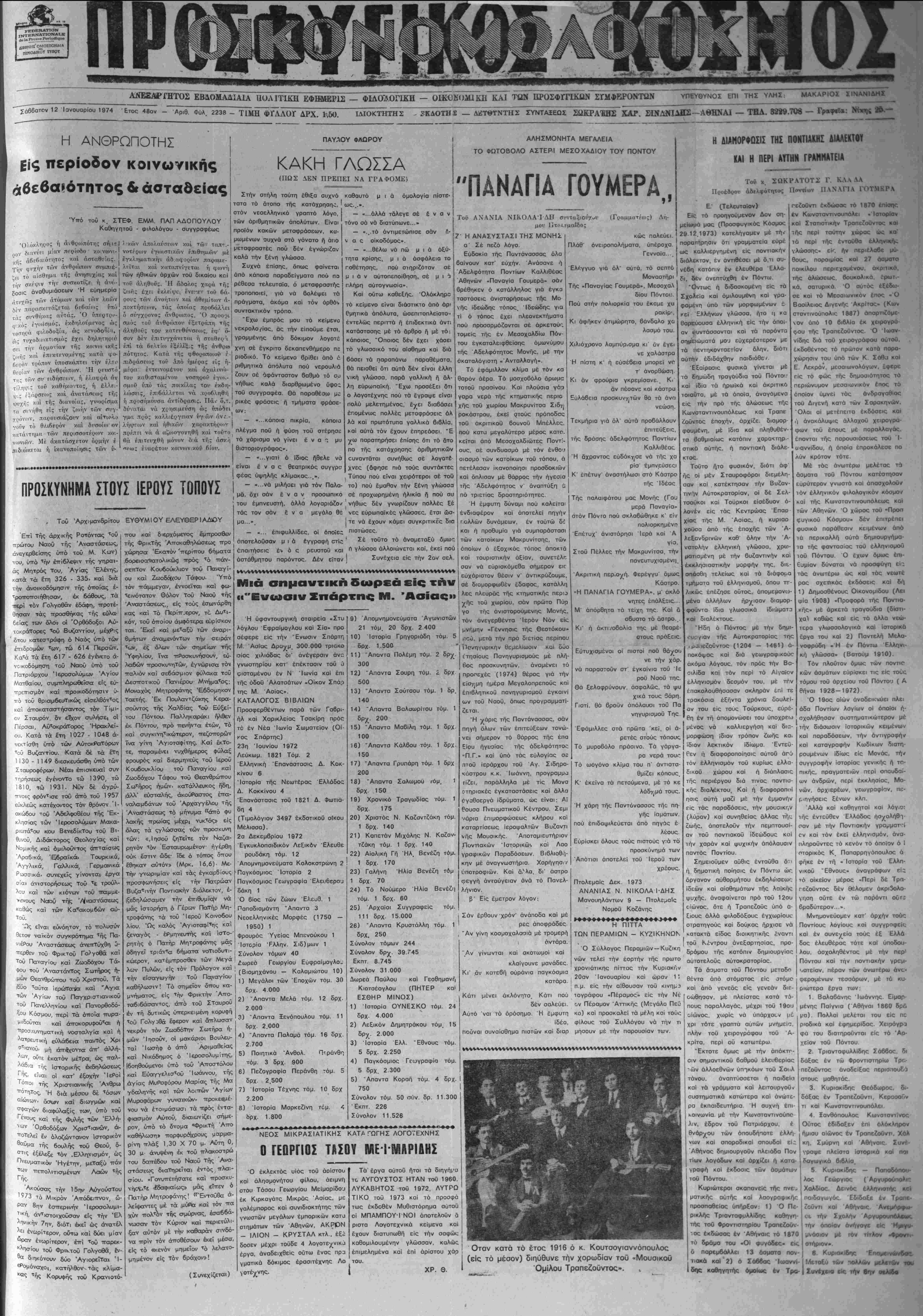 Σάββατον 12 Ίονουοριου 1974 ' Ετος 48ον - Αριθ. Φύλ. 2238 - Τ1ΜΗ ΦΓΛΛΟΓ ΔΡχ. 1=60. ΙΔΙΟΚΤΗΤΗΣ - 3ΚΔΟΤΗΣ — Δ2ΤΘΤΝΤΗΣ ΣΥΝΤΑΞΕΩΣ ΣΩΚΡΑΈΒ- ΧΑΡ. ΣΠίΔΝΙΔ_Γ-ΑΘΗΝΑΙ — ΤΗΛ. 3Μ9.708 — Γβ·?εΛ·: Ν***)« »>—
