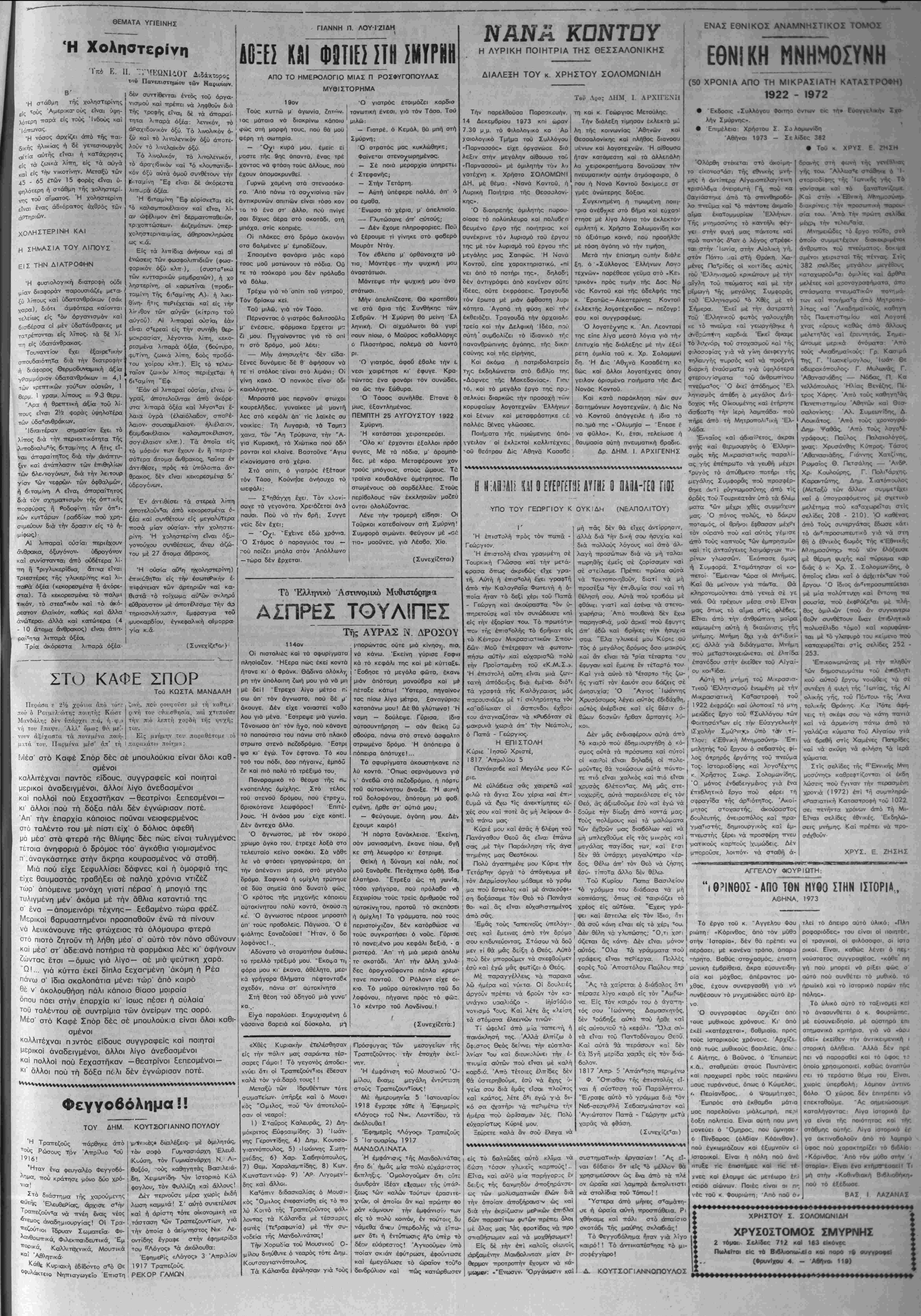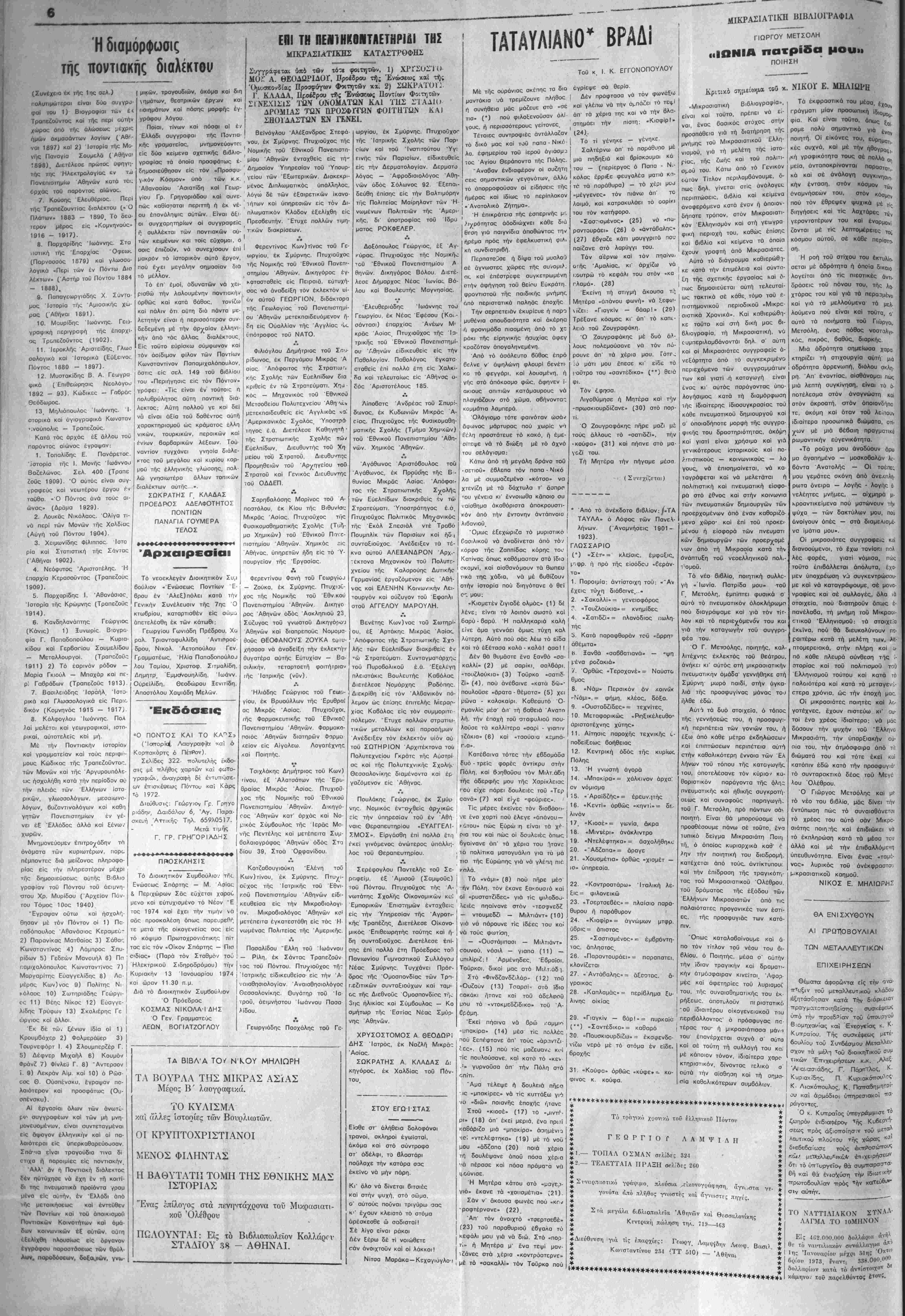 ,,ον ήιανΰρι μί«ν πΐρίοδο κονιβνι-Ι νοτέρων έγωιστικών έπιθι<μιών μέ κης ά6ε6αιότητο: κηί ασταθείας, εγκληματικήν άδ τκτορίην πά -"- άνθρώπιον σνμπιέ- '.είται καί κιιταπνίγεται ή ;π τό αίσθημα τή; ανησυχίας καί την σκέψιν την σΐ'σκοτίζε, ή άν«- δοσις άναθυμιάσεων "Η εύημερία Γιΐΐ'χί)" τ(ΐ'ν 'ΐτόμων καί τον λαόν 6ίν παοασκενάζεται βεβαίος ί'πό τάς σι·νθηκ«ς αύτάς. Ό ΰπεοτρο- (Ι λόζ ίγο)ϊσαό:, έκδηλοτμρνο; ώς νοπηοά φιλοδοξίι», ώς κ-Γνοδοξ-ί'ΐ, οί: τι-χοδιοκτισμός έχει δηλητηριό πή την (Ίομονΐαν τής κοΐνο «κης "ι.ιής καί έπεκτενοιιενη; κατά φο- ίΐροόν τρόπον ύ.ιοσκάπτει την έλϊι' Βριιί.ιν την άνθρωπον. Ή ρευστ,ό τ,ι; τΛν στ1 ειδήσΓίιιν, ή έλαφρά άν τιΜ,ι,-ς τού κ(ΐθήκοτος, ή έλλε.- ; καί άνατάαεως τής (ι ; ρς ι,ιι/ι]: καί τής διανοίας, γνιοοίσμα ■Ίί συνήθη είς την ζωήν των <τυγ· φή των ήθικών άρχών τού δικαίου καί τού άληθοϋς. Ή α,&ο/.ος χαρά τή; ΐοίίς έχει εκλείψη ?νε:·εν τού 6ά- οους των άνοήτον καί άθεμίτιον <Ί- ποκτήσεον, τάς οποίας ποοβάλλει ό σύγχρονος άνθρωπος. Ό προ-οοι σιιος τού άγθρώπου έξετράπη τής άληθοϋς τον κατετθΰνσίως, έφ' ό¬ σον δέν επιτυγχάνρται ή σταθεο-'ι επί τα ίίελτίο) εξέλιξις τής άνθρω πότητος. Κατά τής ψθοροποιοϋ ε¬ πιδράσεως τού Λπό ημέρας είς ή- μίρ<Γ έντίΐνομένου καί άχαλινώ- του καθισταμένου νοσηρόν· έγοκ- σμοΰ υπό τάς ,-ΐοικίλας τού έκδη- λ.ώσεις, έ.Ίΐβάλλεται νά ποοίιλ.ηθή ή ποοσήκουσα αντίδρασις. Πά»· ο,τ. ΠΑΥΑΟΥ ΦΛΩΡΟΥ ΚΑΚΗ ΓΛΩΣΣΑ (ΙΙΩΣ ΔΕΝ ΠΡΕΠΕΙ ΝΑ ΓΡΑΦΟΜΕ) Στήν στήλη τούτη έθιξα συχνό καθαυτό μ ι ά όμολογία πίστε- τατα τό άτοπο τής κατάχρησης, ' ως...·. δύναται νά χοησιμεΰση ώς ύπάδει ων. στόν νεοελληνικό γραπτό λόγο, των άριθμητικών άπολύτων. Είναι προϊόν κακών μετοφράσεων, κο- μωμένων ουχνά οτό γόνατο ή άπο μεταφραστές πού δέν εγνώριζον καλά την ξένη γλώσσα. Συχνά έπίσης, όπως φαίνεται όπό κάποια παραδείγματι^ πού πό ρέθεσα τελευταία, ό μεταφραστής τροποποιεϊ, γιά νά βολέψει τα πράγμοτα, άκόμα κα'ι τόν ορθόν συντακτικόν τρόπο. "Εχω έμπρός μου τό κείμενο νεκρολο/ίας, άς την είποϋμε έτσι, γραμμένης άπό δόκιμον λογοιέ χνη οέ έγκριτο δεκαπενθήμερο πε ριοδικό. Τό κείμενο βρίθει άπό ό ριθμητικά άπόλυτα πού νερουλια Ζουν σέ αφάνταστον θαθμό τό ου νήθως καλά διαρθρωμένο ϋφος τού ουγγραφέα. θά παραθέσω με ρικές φράσεις ή τμήματα φράοε- νούνον, παοονσιάξουν καί αίτιολο γμα πρός καλλιέργειαν ΰγ ών άν.--. _ τό θλιβερόν κ«ί δυσοίο)· όν | λήψεων καί ήθικών χαρακτήροιν γοΐ'ν «...καποια πικρία, κάποιο νατάτημα των περισσότερον κοι- νιηνιών. Μέ ακατάσχετον ορμήν έ πρέπη νά ά αζιοογονη&ή καί τοϋ^ο, πλέγμα που ή φύση τού στέρησε «ά επιτευχθή μόνον διά τής ασκή Τ° χόρισμο νά γίνει ε νο- ,ιιδιώ/ρτω ή ίκανοποίηοις των ύ- «πος ενάρετοι· κοίνον κου ίιίου. μυ Θιστοριογράφος». — -...γιατί ό ϊδιος ήθελε νά ·«.....··>.' είναι έ ν α ς θεατρικός συγγρα