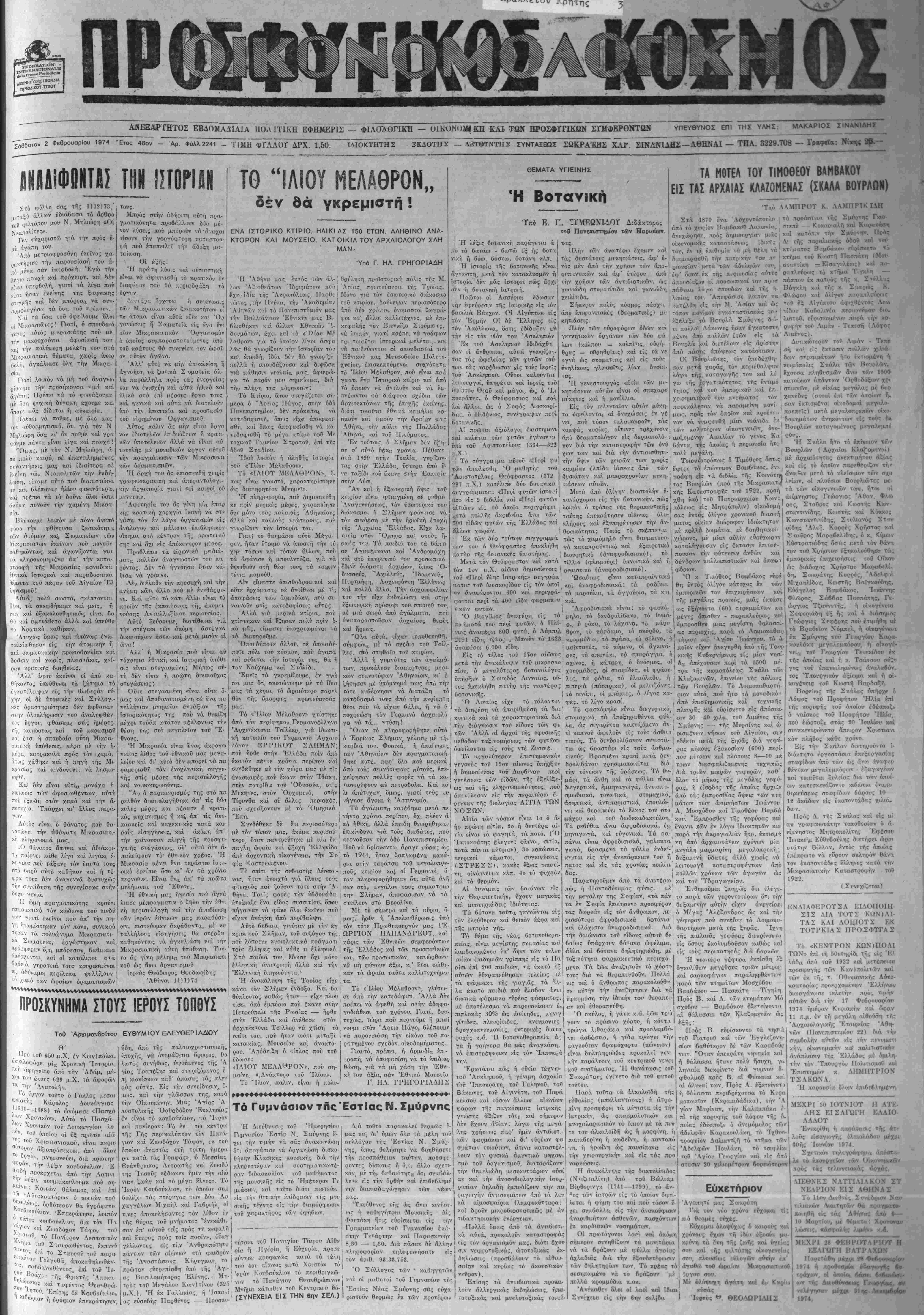 Σάββατον 2 Φεβρουορίου 1974 "Ετος 48ον - Αρ. Φύλλ.2241 - ΠΜ1Ι ΦΥΛΛΟΥ ΔΡΧ. 1,50. ΙΛΙΟΚΤΙΠΉΣ 3ΚΔΟΤΗΣ — Δί2ΤΘΤΝΤΉΣ ΣΥΝΤΑΞΒΩΣ ΣΩΚΡΑΈΗΣ ΧΑ7. ΣΙΝΔΙίΙΙΕΣ—ΑΘΗΝΑΙ — ΤΗΛ. 3229.Τ08 — ΓραφεΙα: ΙΚχης 8^.—